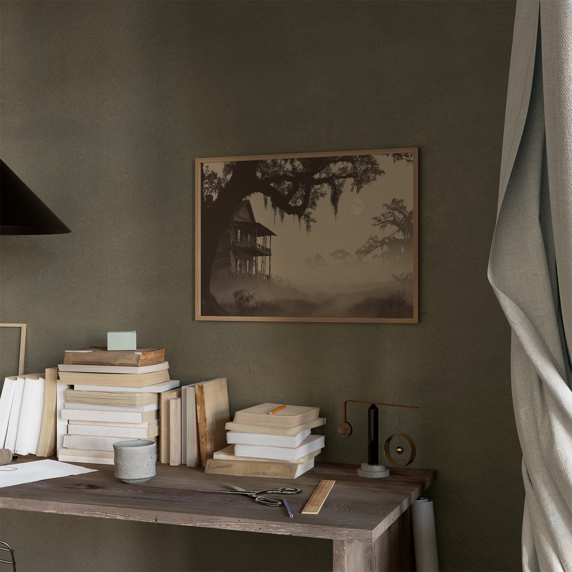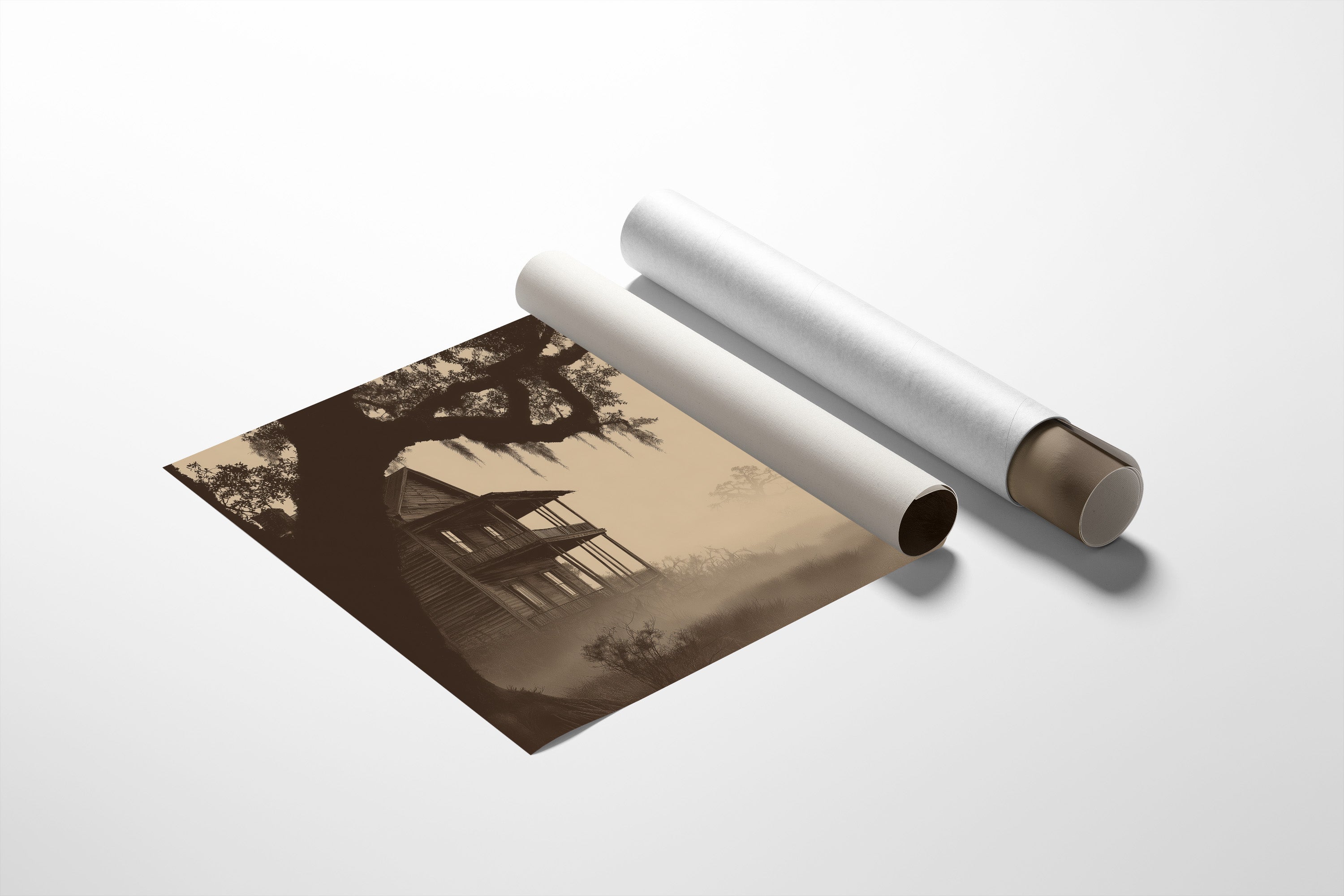 Morning fog weaves through moss-draped oaks, shrouding the weathered plantation house in ethereal mystery. The sepia-toned photograph captures a moment suspended between reality and memory, where Spanish moss dangles like ghostly curtains against the hazy southern landscape. This contemplative piece finds its perfect home in a study or reading nook, creating a thoughtful focal point among collected volumes and cherished objects.