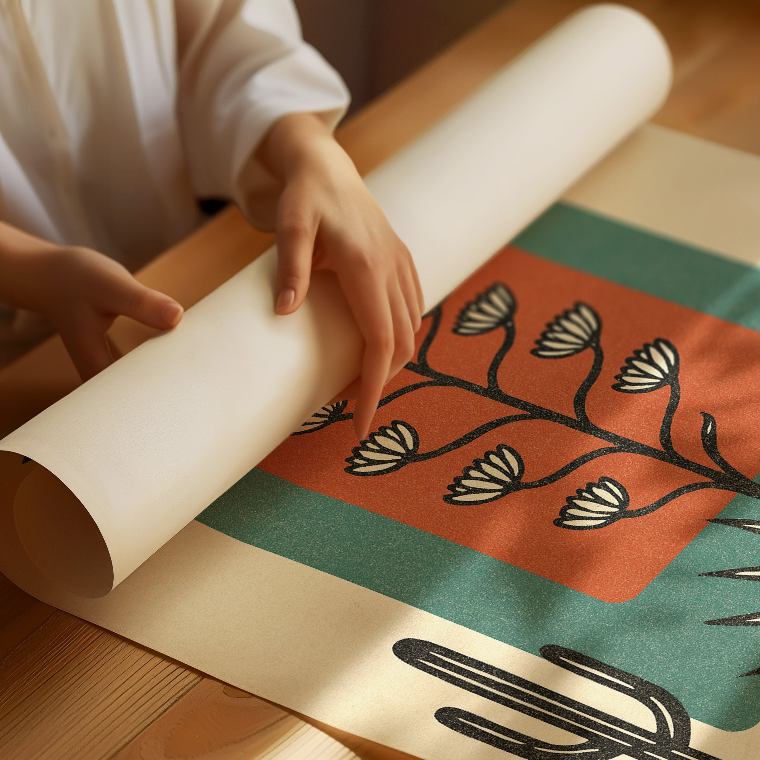 Warm terracotta and teal breathe life into this stylized desert scene, creating a moment of unexpected beauty in arid terrain. The bold graphic illustration captures the striking silhouette of a flowering agave against geometric color blocks, celebrating the resilience of desert flora with mid-century modern flair. This piece brings southwestern charm to any space while complementing natural textures and earthy elements.