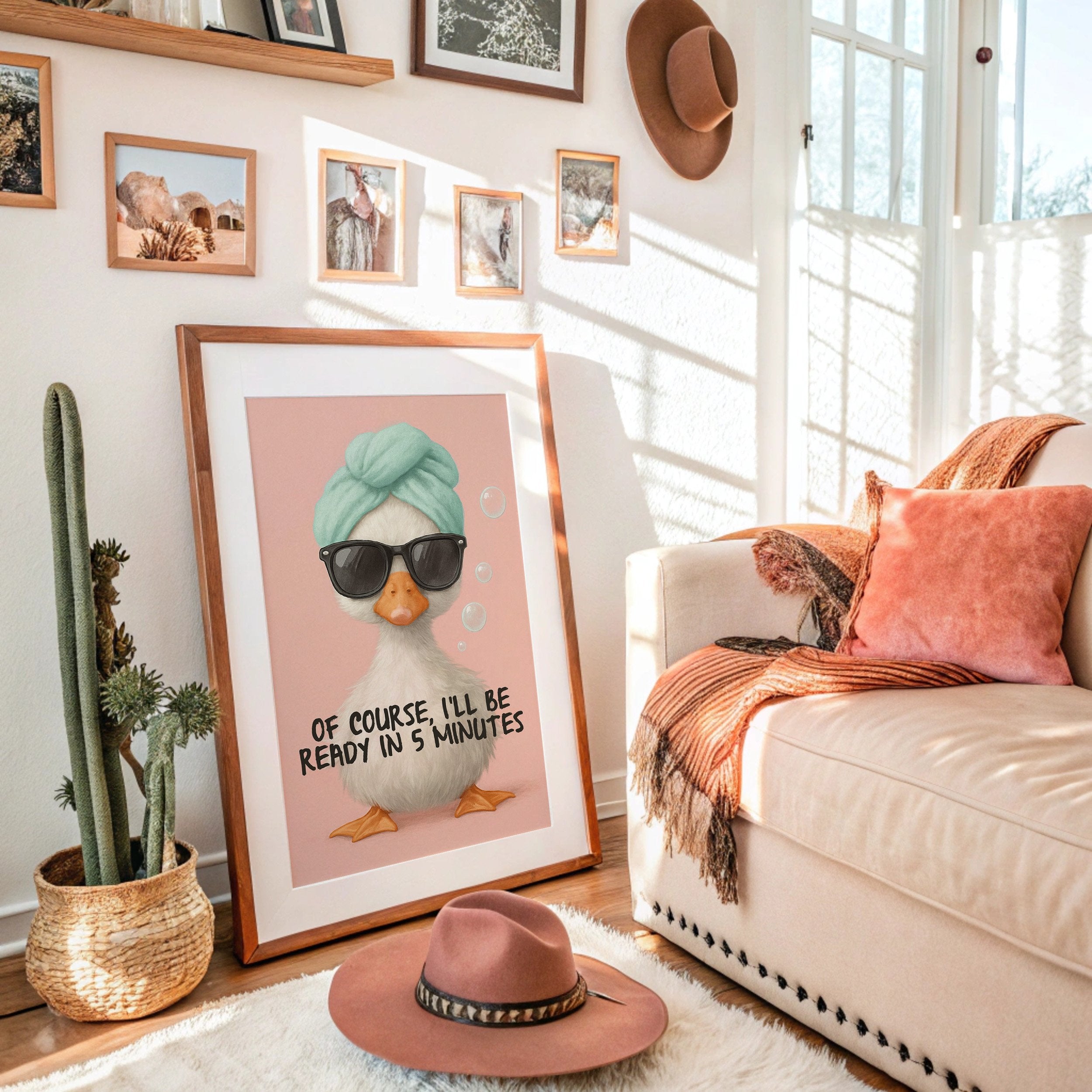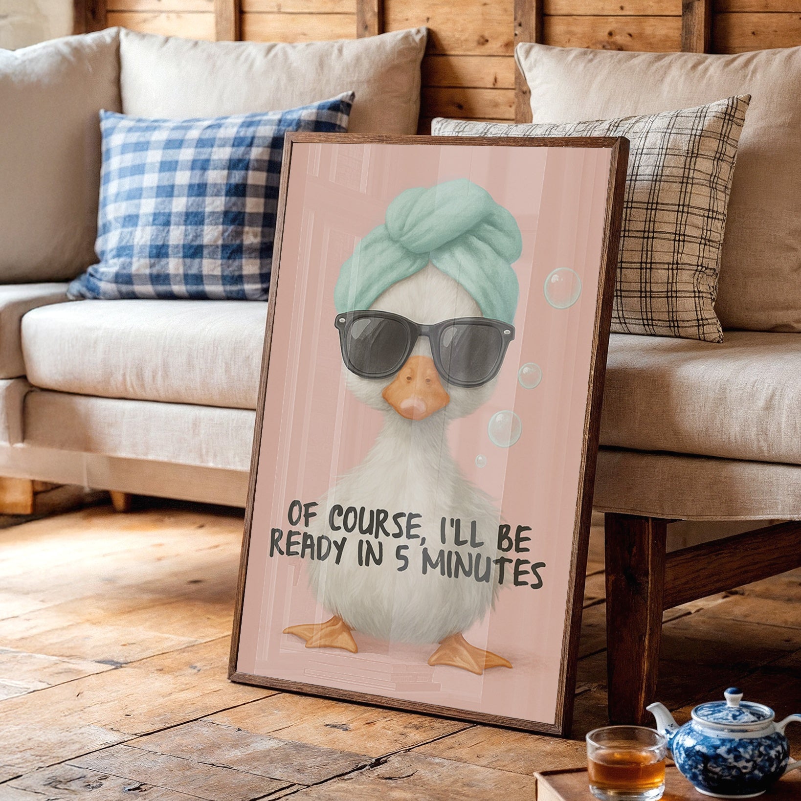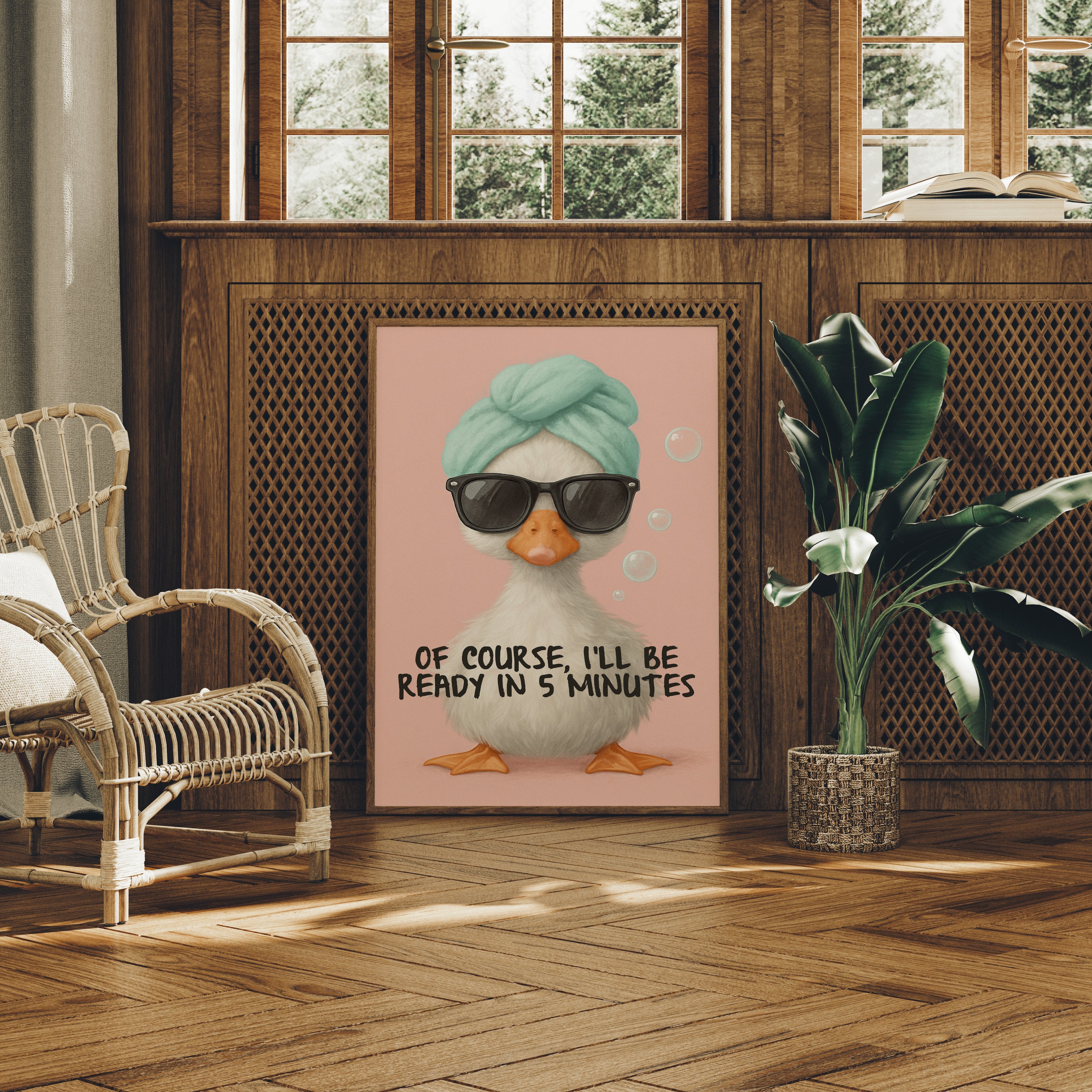 A fluffy white duckling dons oversized sunglasses and a mint green towel wrapped elegantly around its head, exuding spa-day confidence against a soft coral background. Delicate bubbles float beside the pampered waterfowl, adding a touch of bathtime whimsy to the scene. The humorous caption below perfectly captures that friend who's always fashionably late but impossibly stylish.
