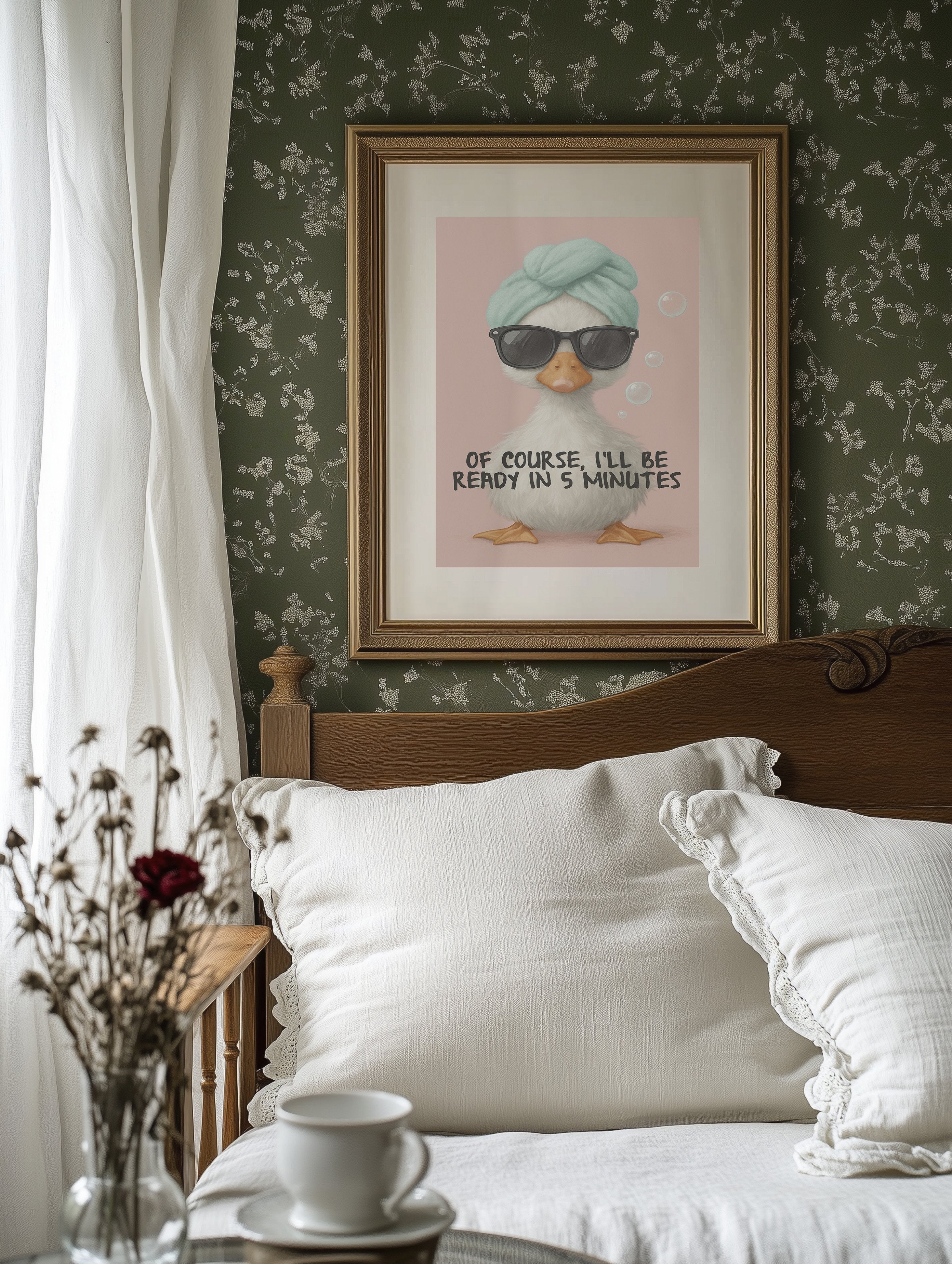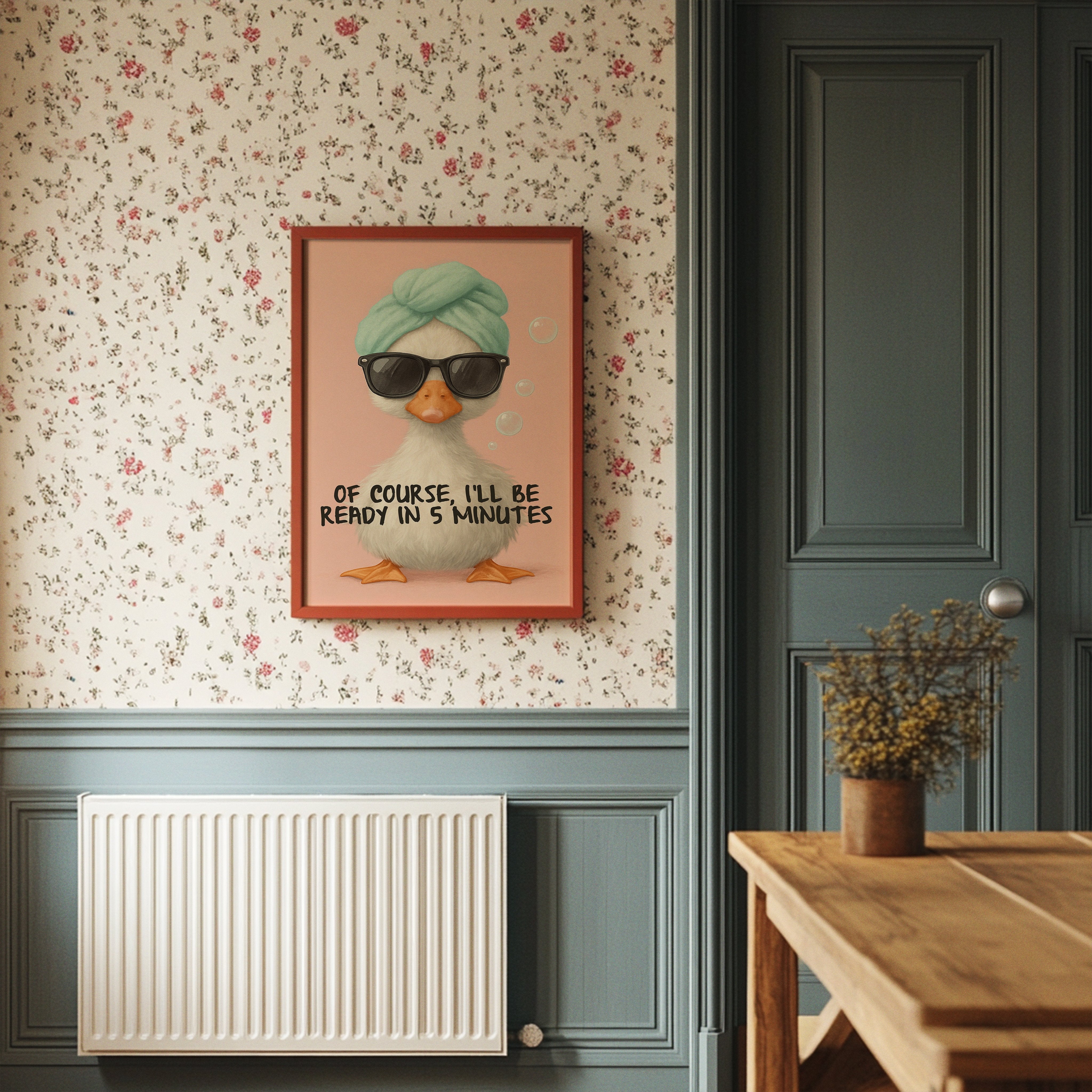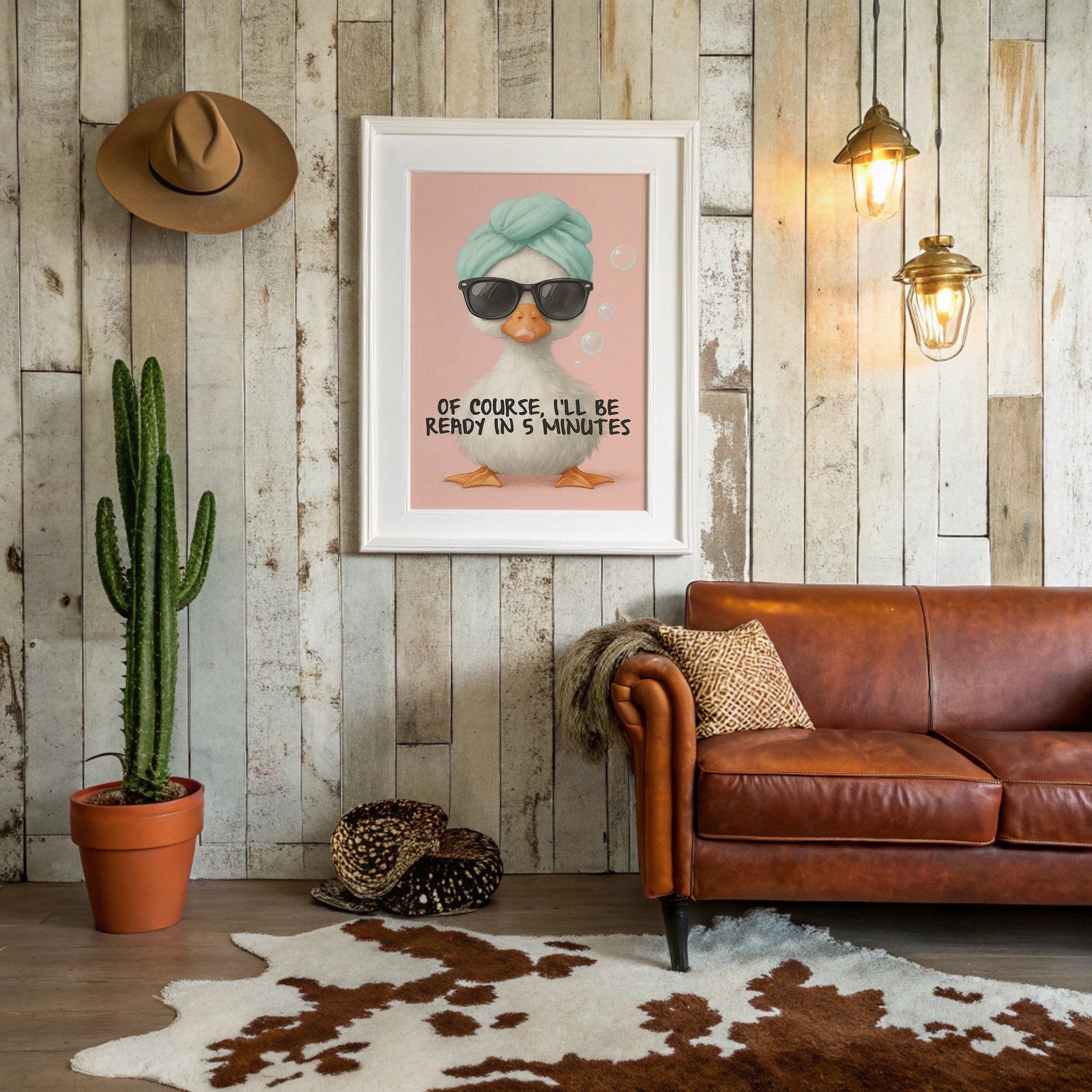 A fluffy white duckling dons oversized sunglasses and a mint green towel wrapped elegantly around its head, exuding spa-day confidence against a soft coral background. Delicate bubbles float beside the pampered waterfowl, adding a touch of bathtime whimsy to the scene. The humorous caption below perfectly captures that friend who's always fashionably late but impossibly stylish.