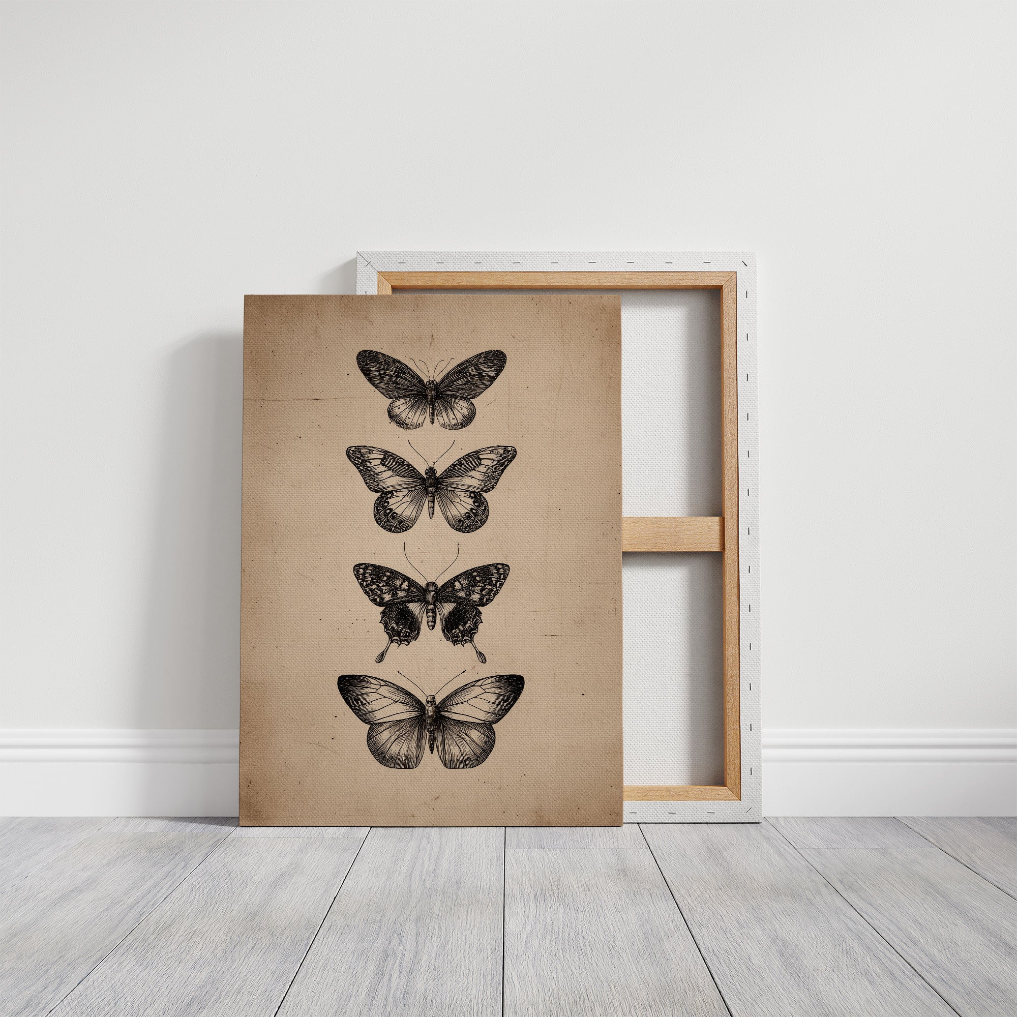 Morning light crawls across herringbone floors, illuminating delicate wings frozen in time. Four distinct butterflies are captured in meticulous black ink detail against aged parchment, their scientific precision contrasting with the dramatic darkness of the ornate wall behind. The wooden frame houses these fragile creatures like precious memories, creating a dialogue between natural history and contemporary elegance.