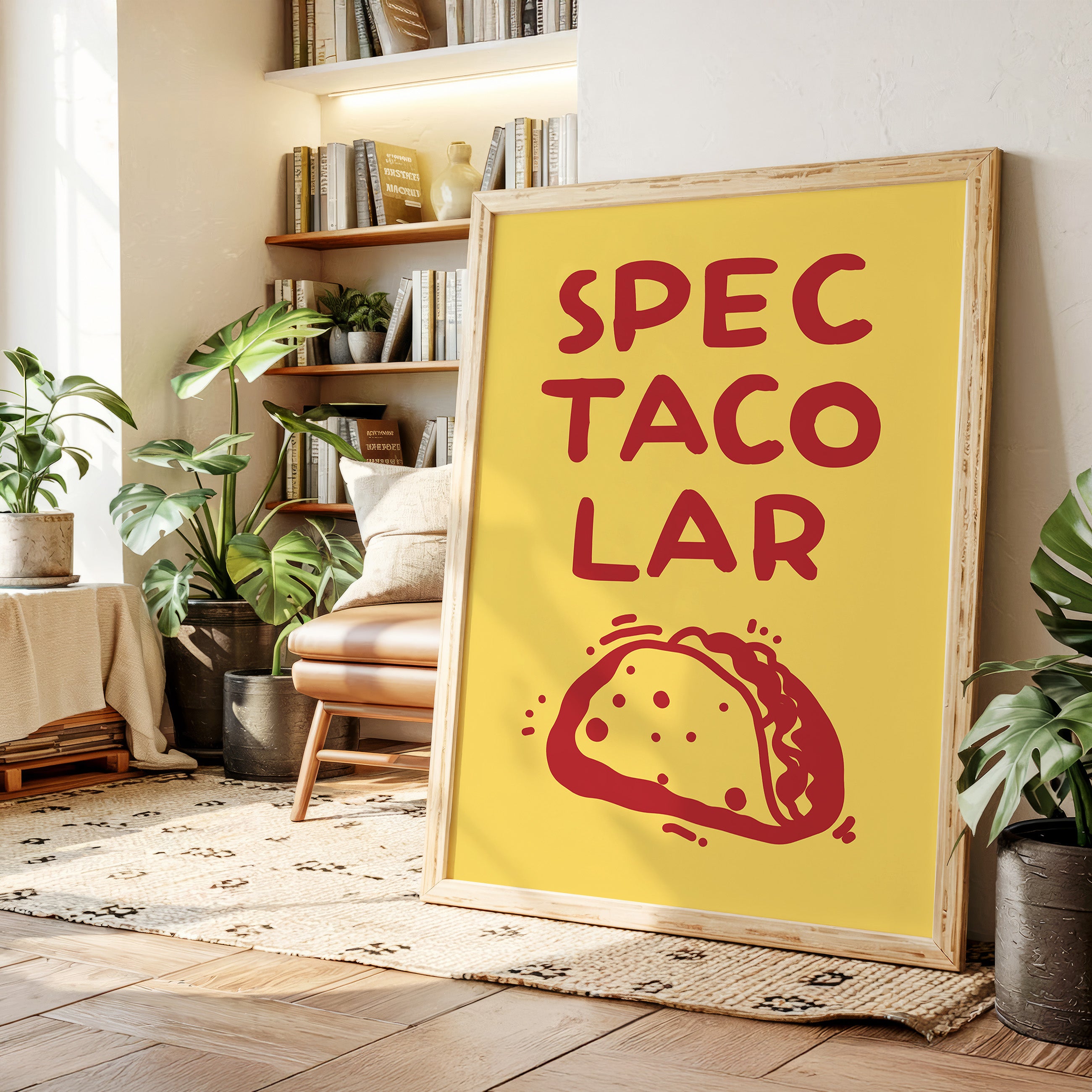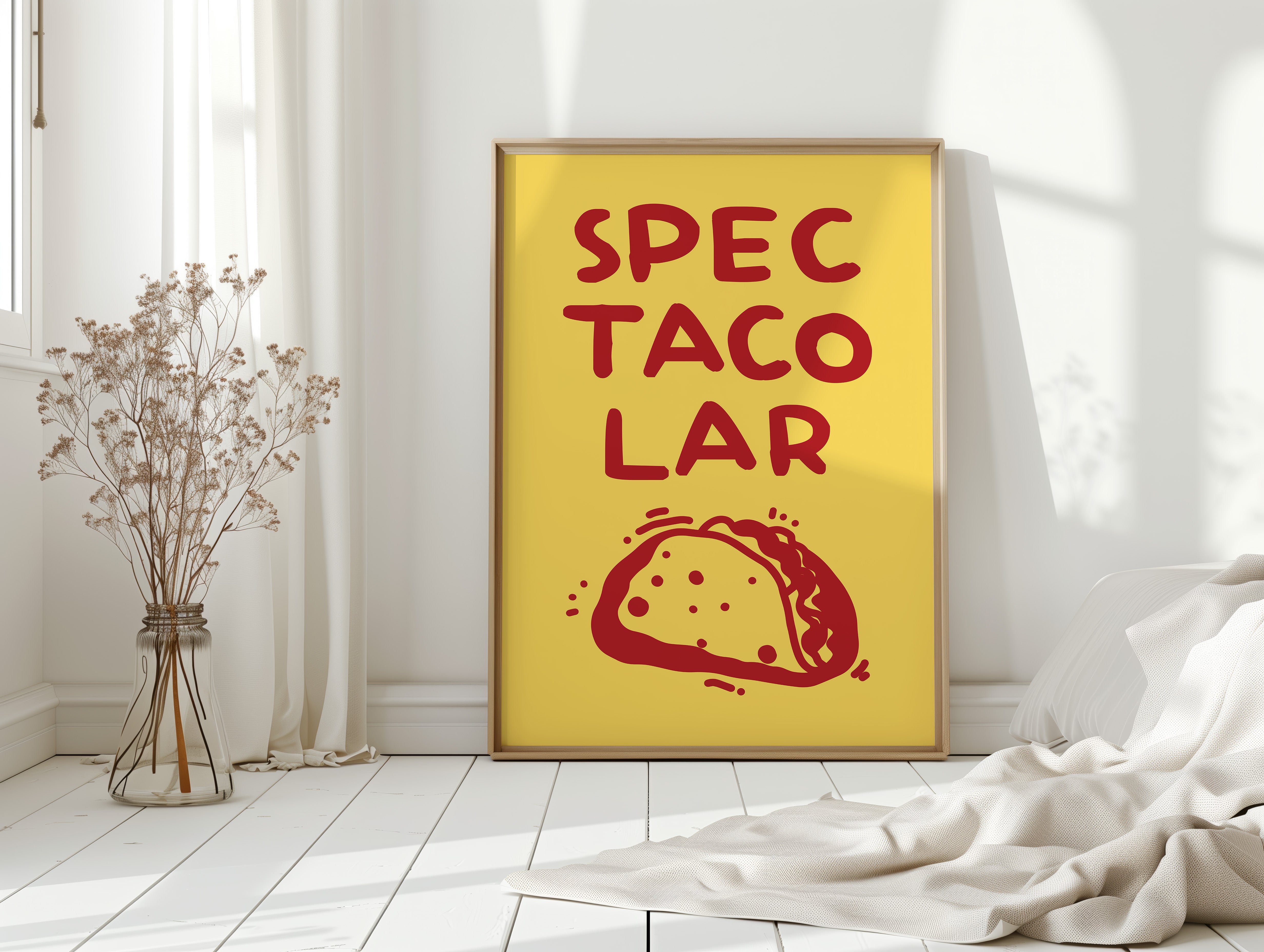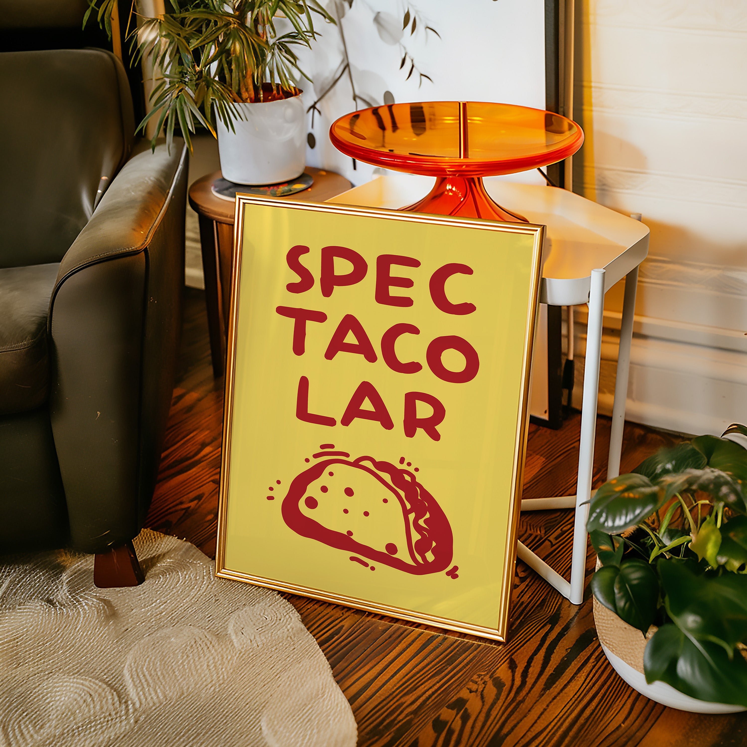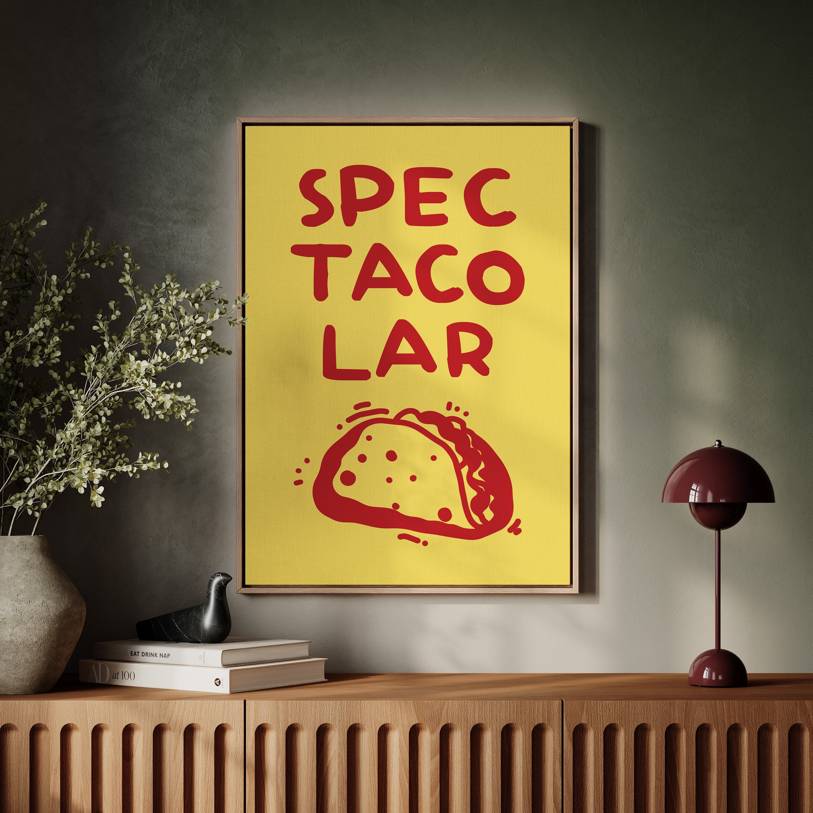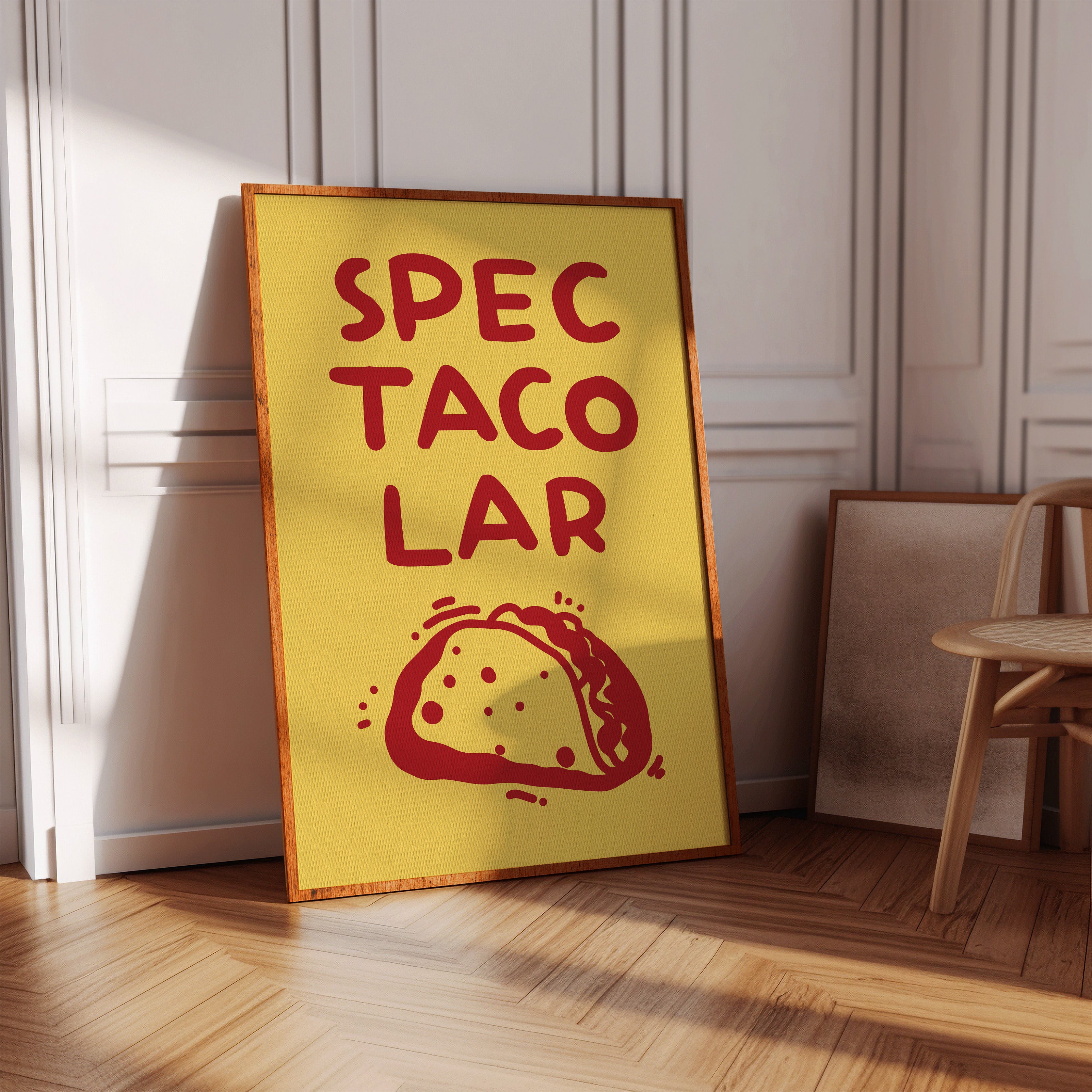 The neon glow of late-night taco runs and endless summer evenings comes alive in vibrant red against sunshine yellow. Part of our Contemporary Typography collection, this piece captures the playful spirit of casual dining culture. Bold letterforms dance with a whimsical taco illustration, creating a perfect balance of modern design and nostalgic comfort food charm. The minimalist two-color palette makes a striking statement while maintaining an approachable, friendly vibe. This piece brings personality to kitchen spaces, dining rooms, or restaurant-inspired home bars, infusing spaces with a dash of foodie fun and urban energy. The design celebrates those memorable moments when simple food becomes the centerpiece of lasting memories.