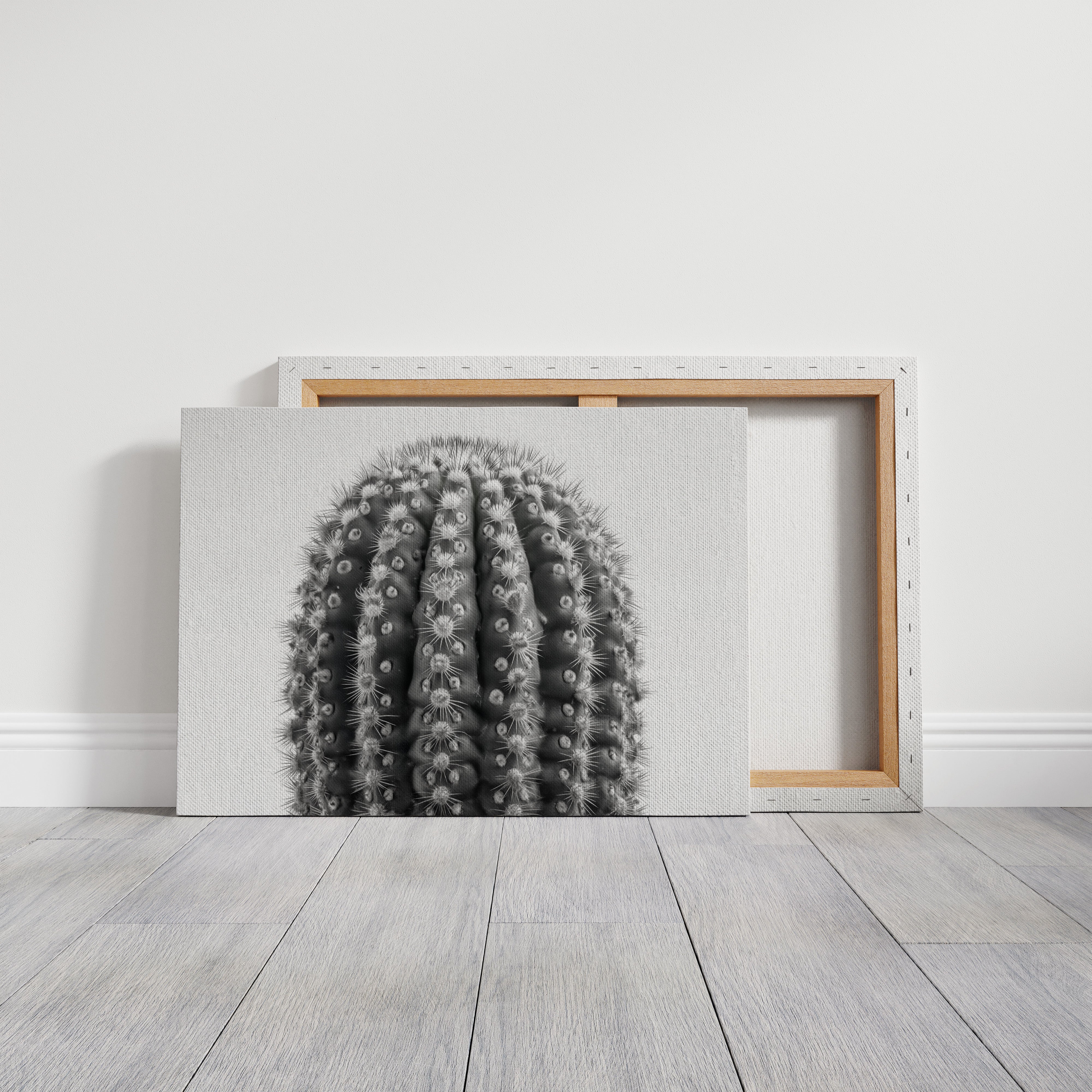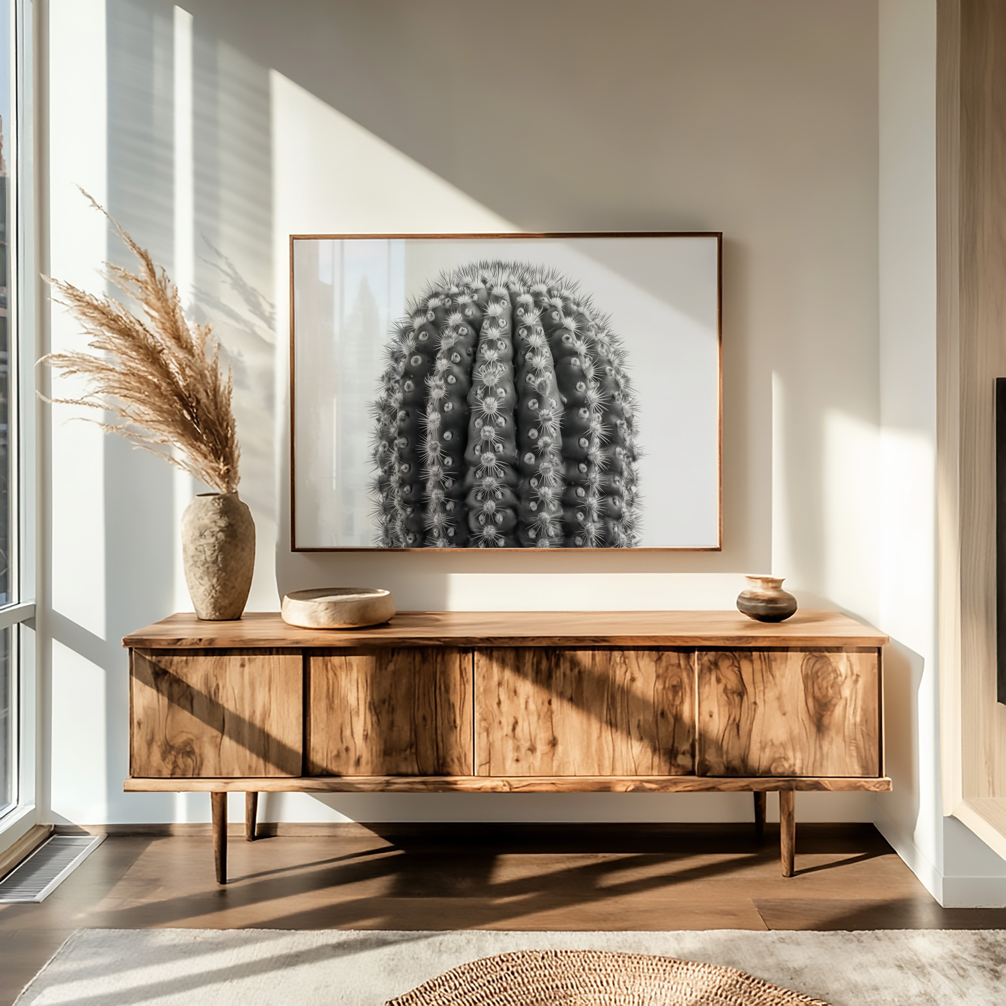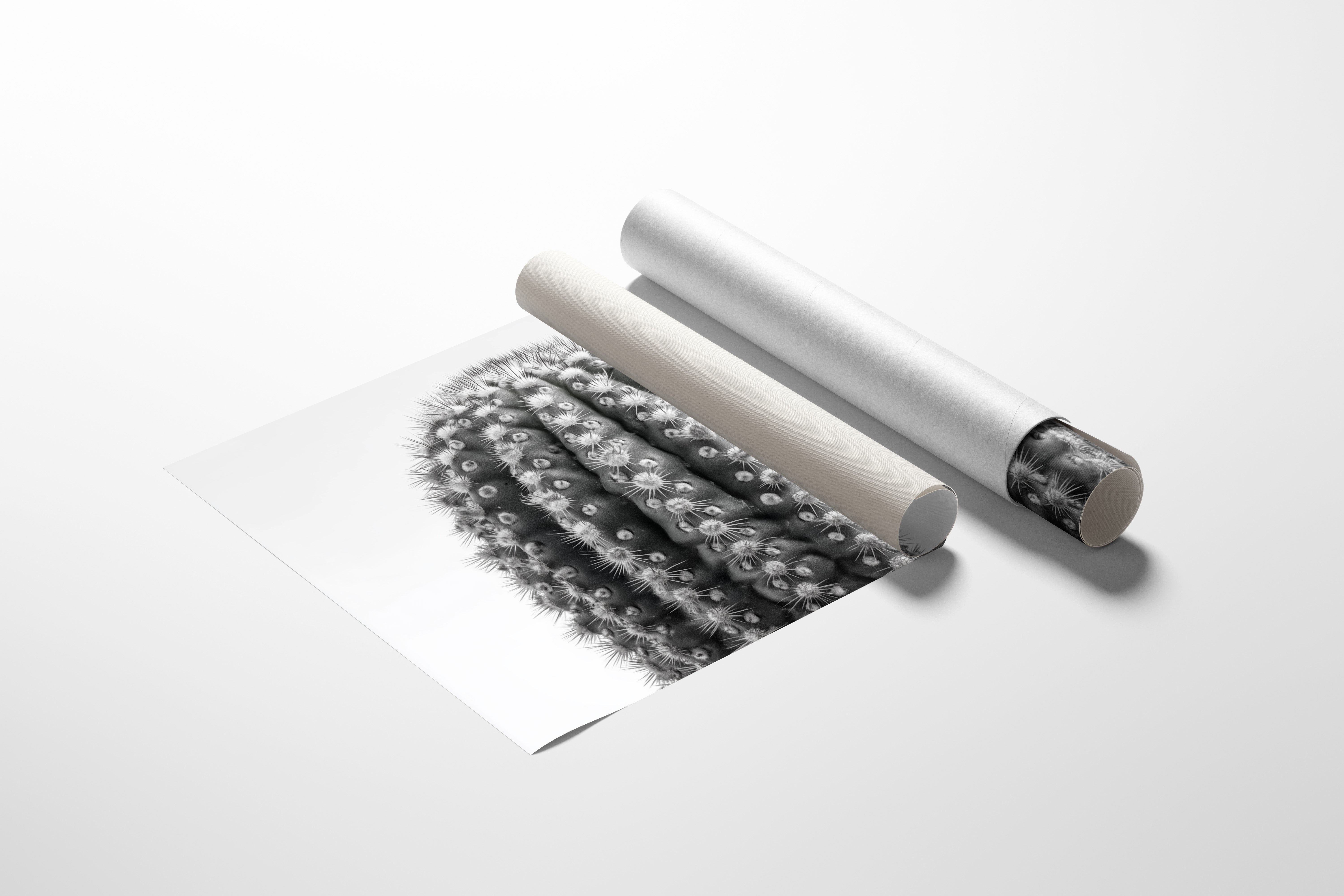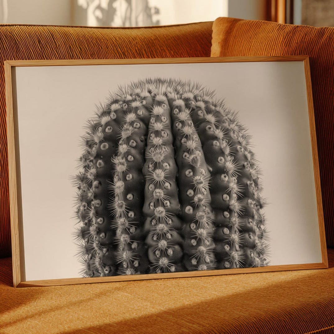 Delicate thorns catch the light like stars scattered across a desert night, each spine a crystalline beacon against velvet shadows. This striking contemporary botanical study captures nature's geometric precision in stark monochrome. The barrel cactus reveals its intricate armor in intimate detail, where each ridge and spine tells a story of survival and adaptation. Mesmerizing patterns ripple across the surface, creating a hypnotic rhythm of light and shadow that draws the eye deeper into its mysterious landscape. This piece brings sophisticated desert minimalism to modern spaces, perfect for creating a dramatic focal point in a sleek living room or adding organic texture to a minimalist office.