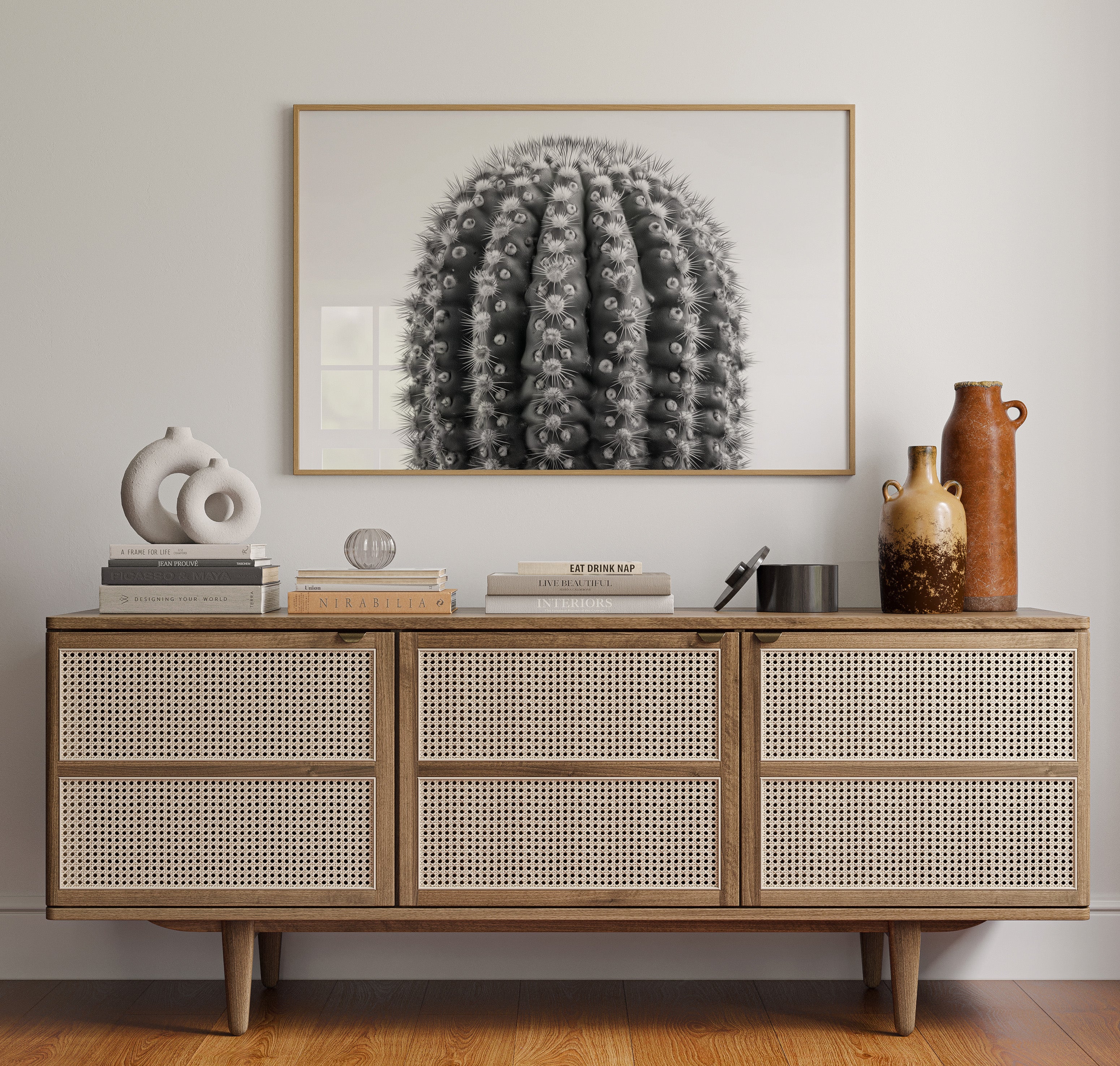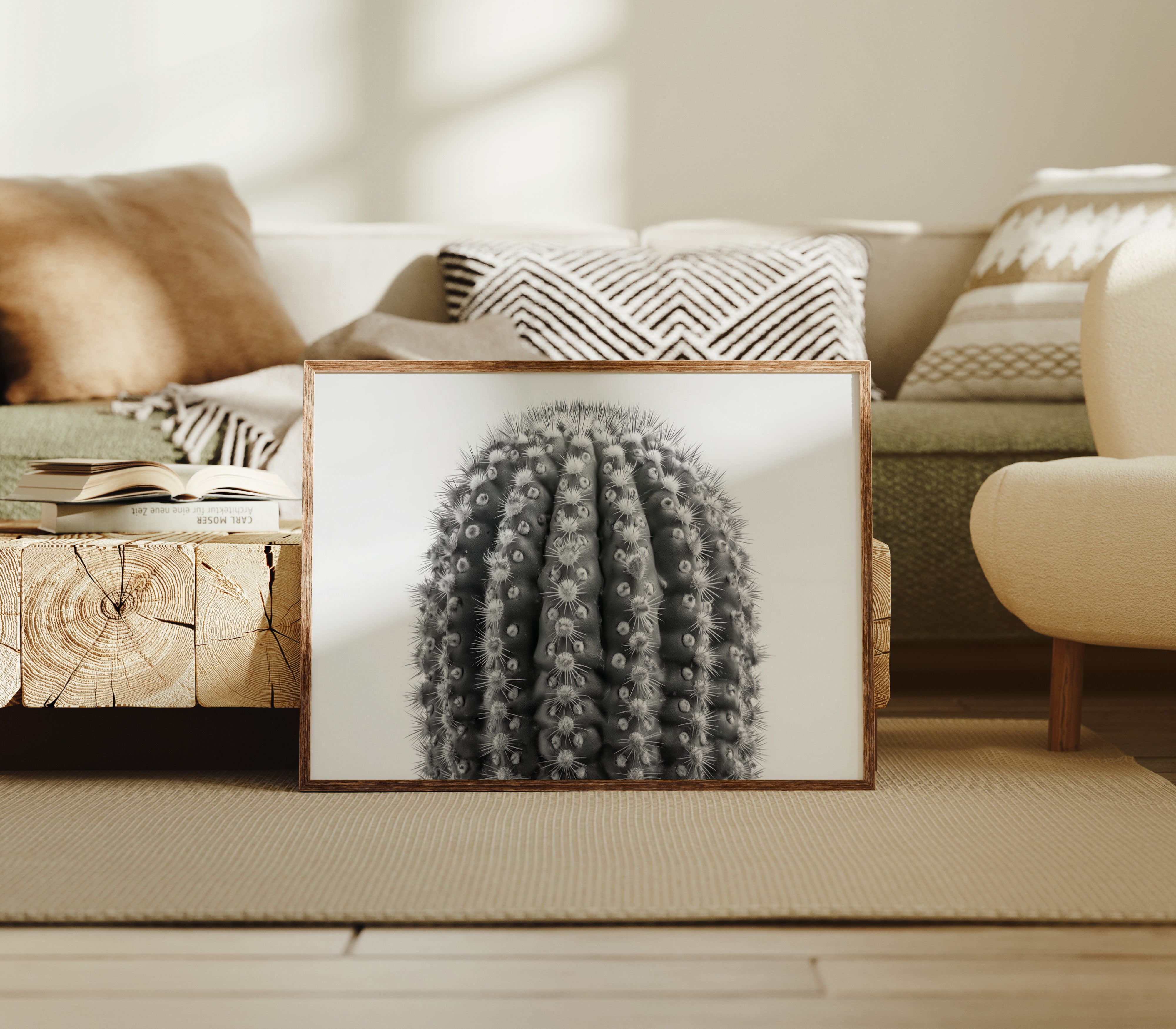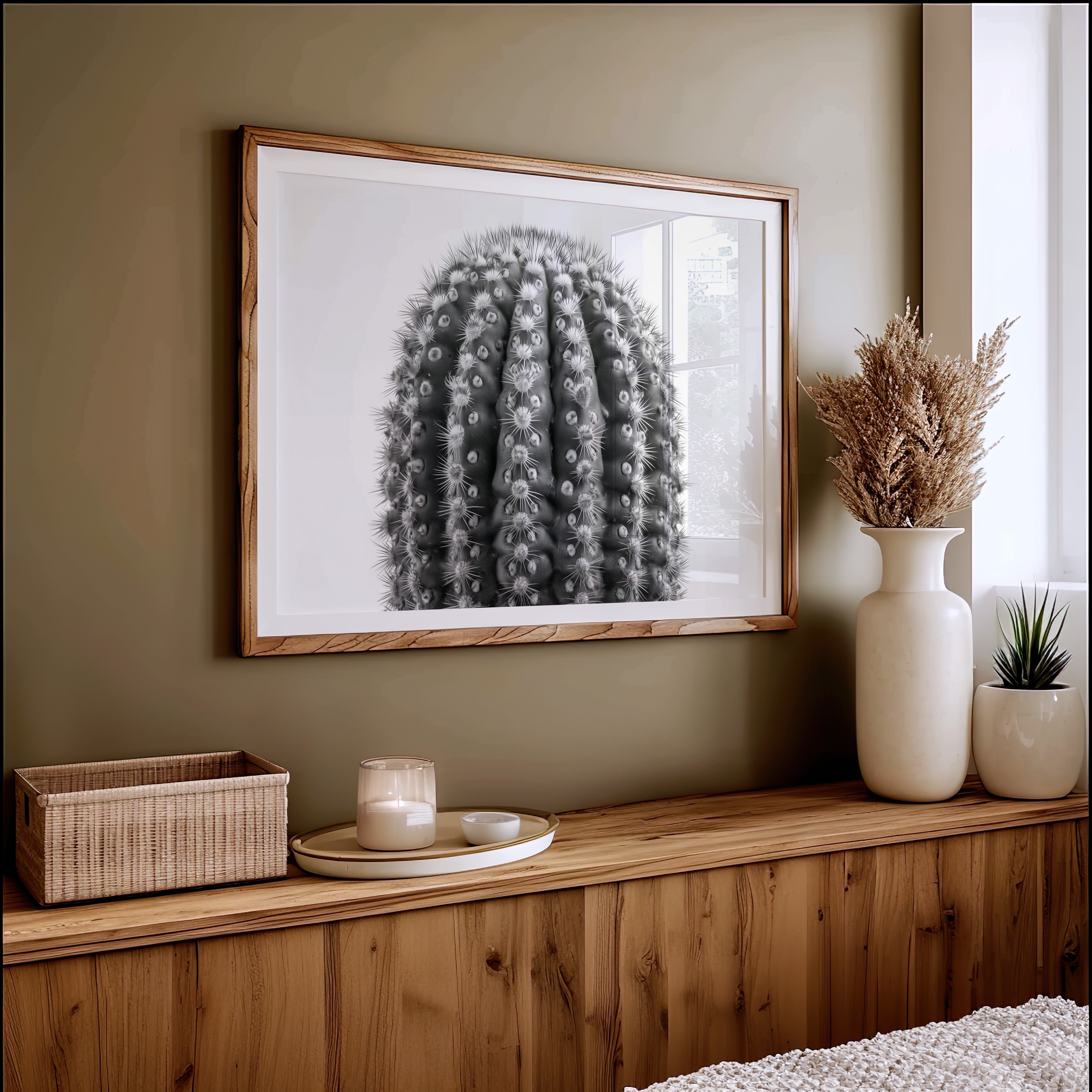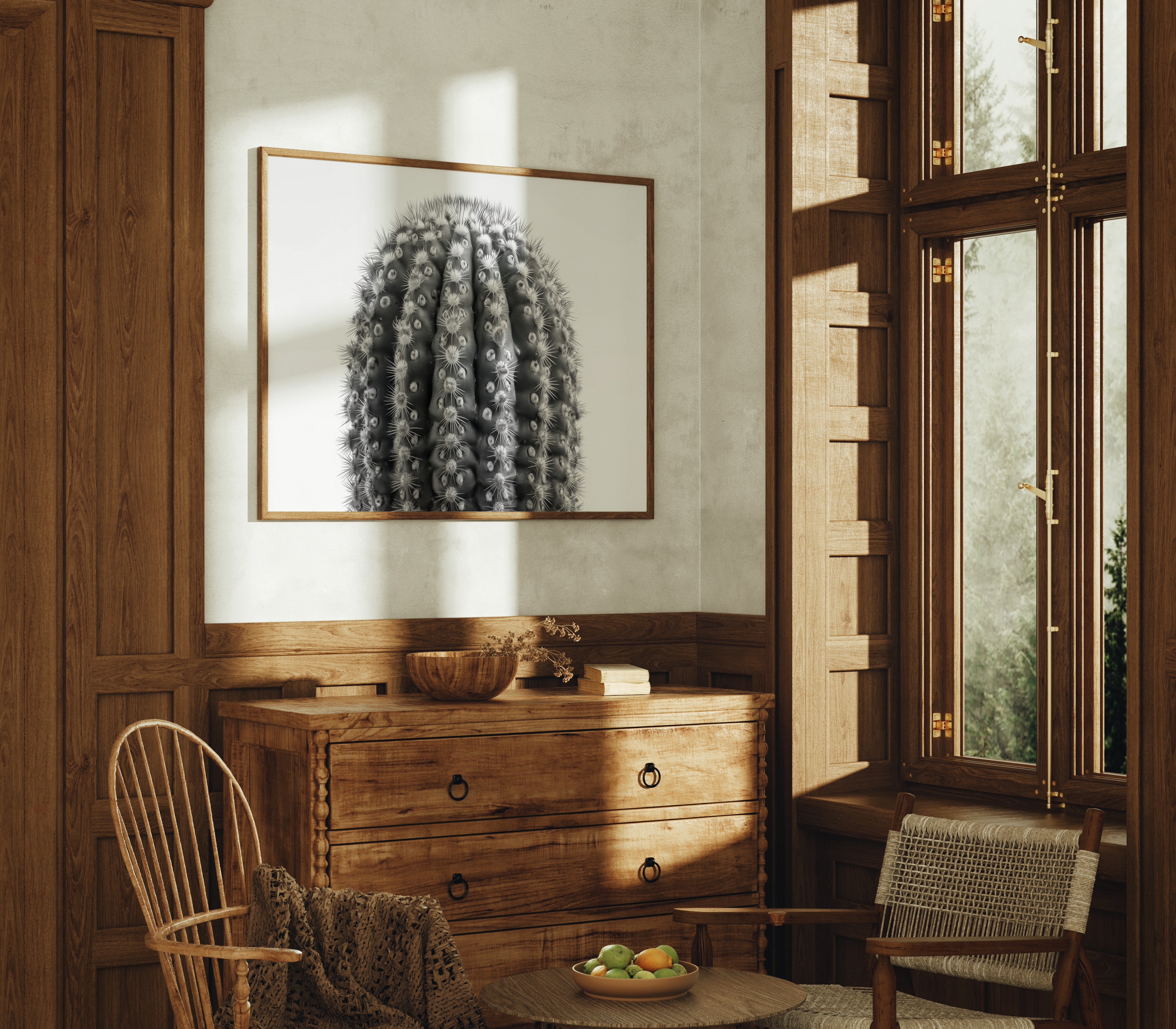 Delicate thorns catch the light like stars scattered across a desert night, each spine a crystalline beacon against velvet shadows. This striking contemporary botanical study captures nature's geometric precision in stark monochrome. The barrel cactus reveals its intricate armor in intimate detail, where each ridge and spine tells a story of survival and adaptation. Mesmerizing patterns ripple across the surface, creating a hypnotic rhythm of light and shadow that draws the eye deeper into its mysterious landscape. This piece brings sophisticated desert minimalism to modern spaces, perfect for creating a dramatic focal point in a sleek living room or adding organic texture to a minimalist office.