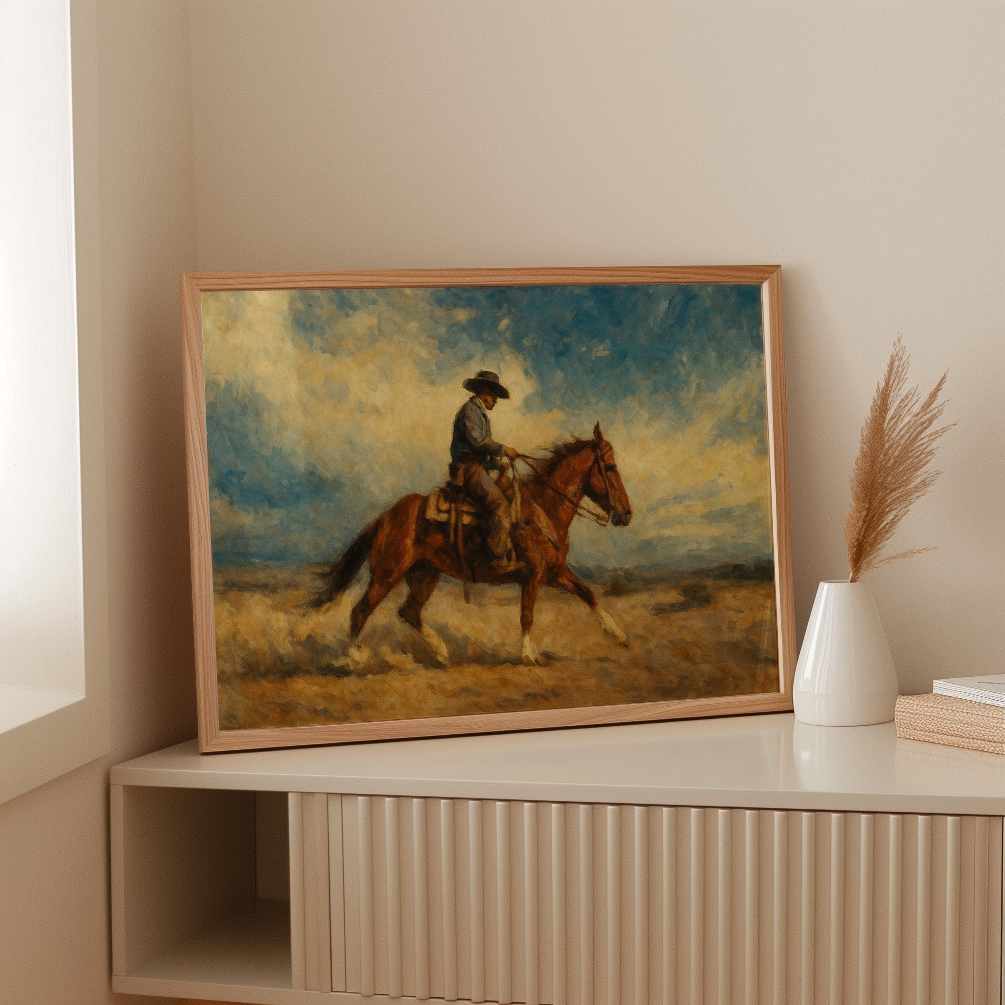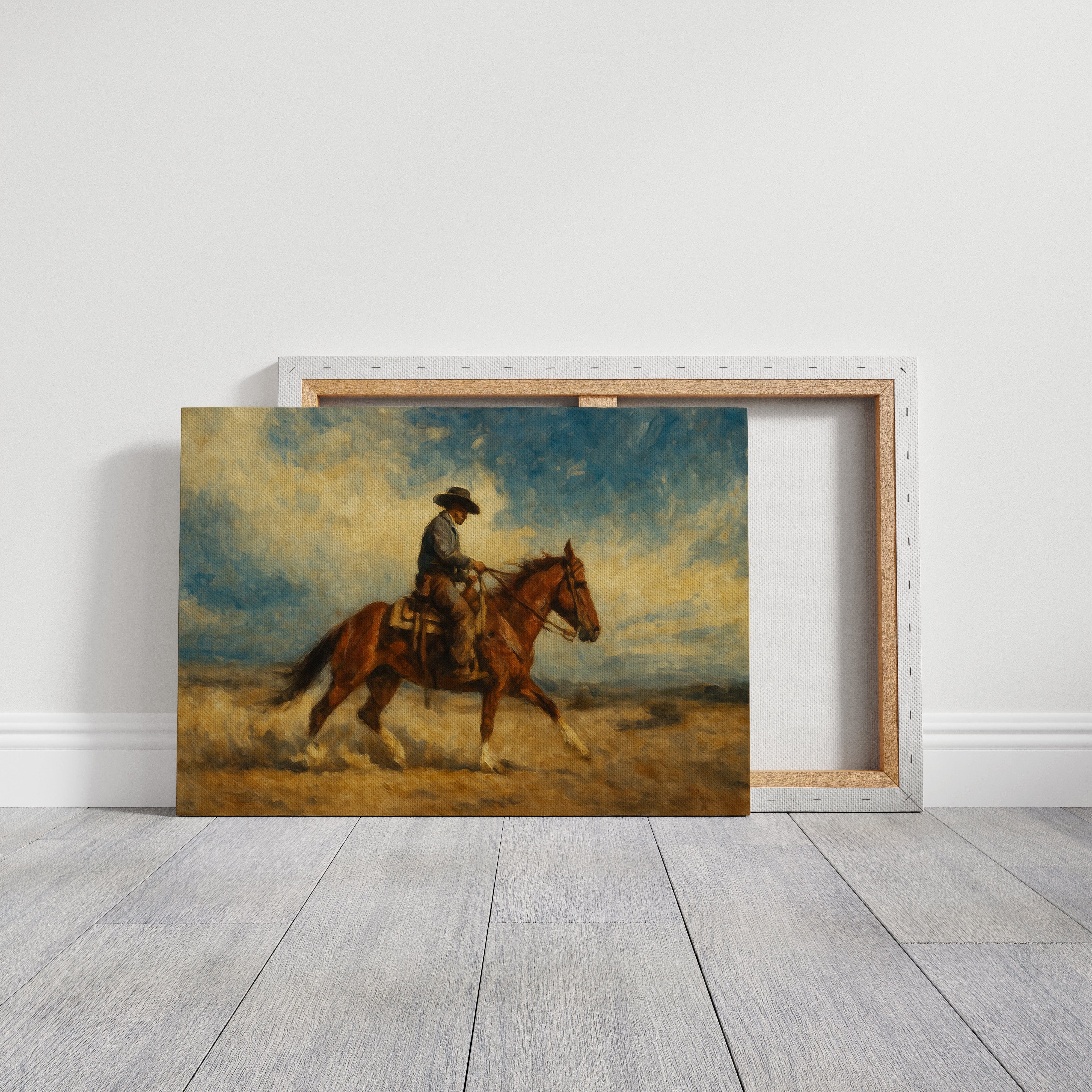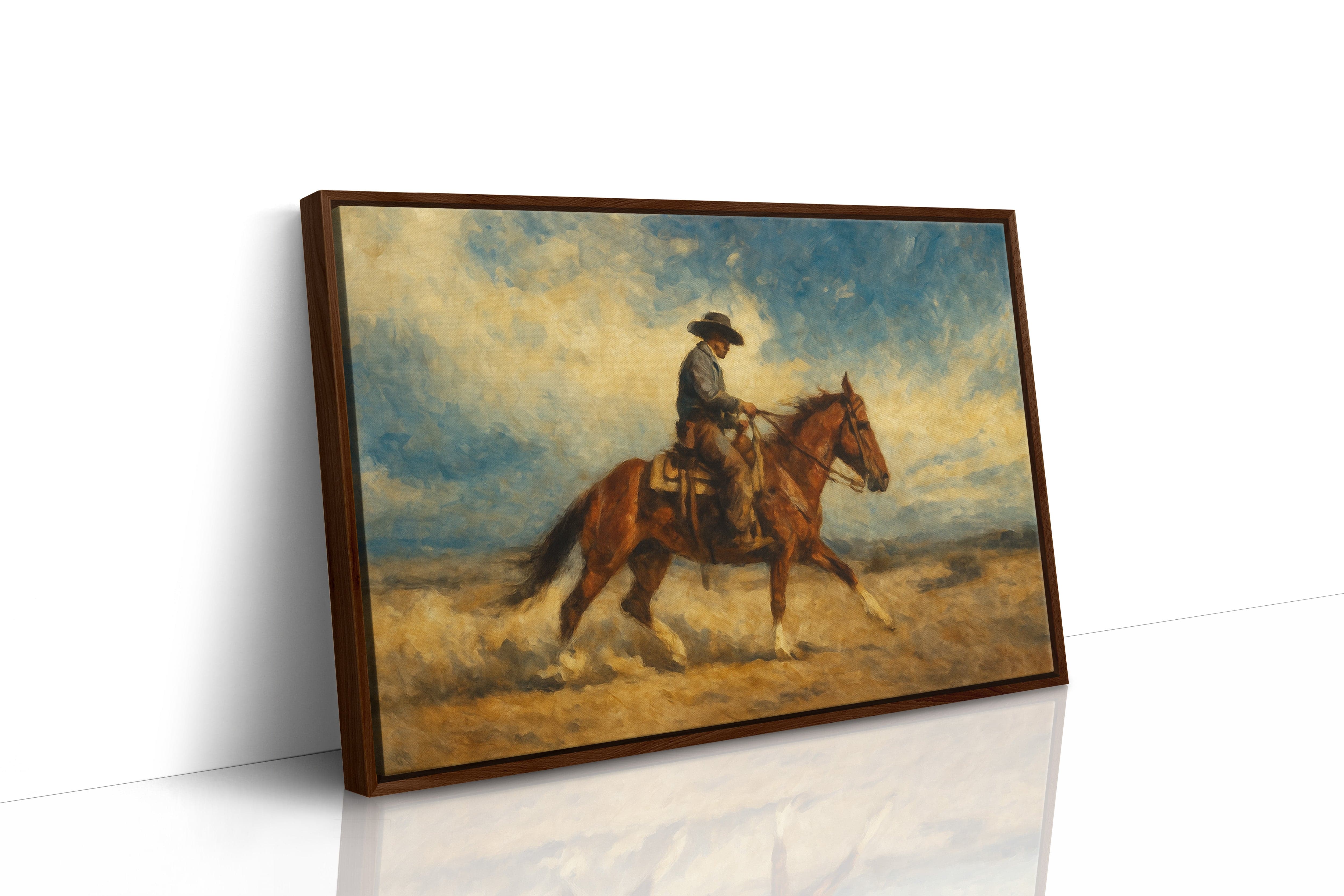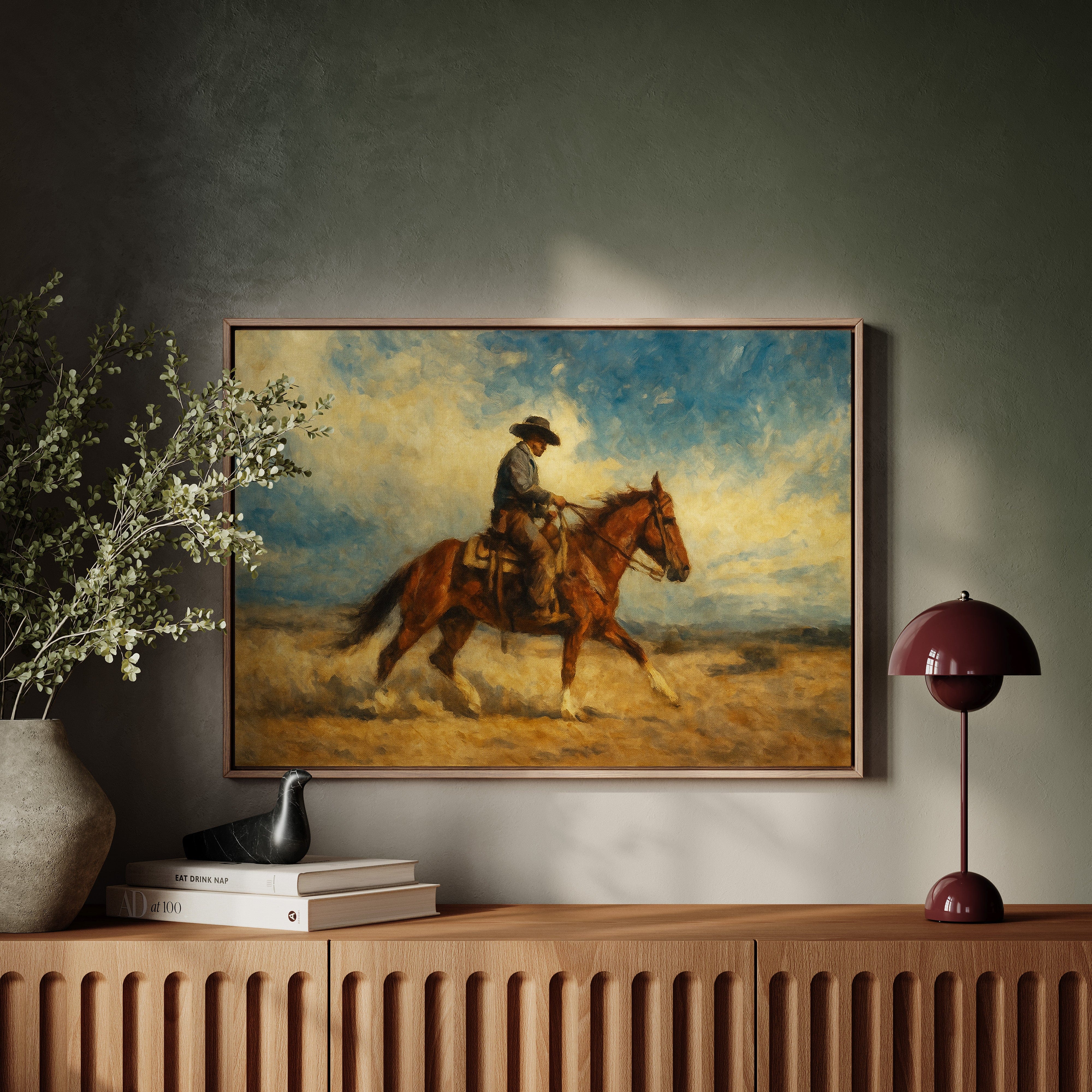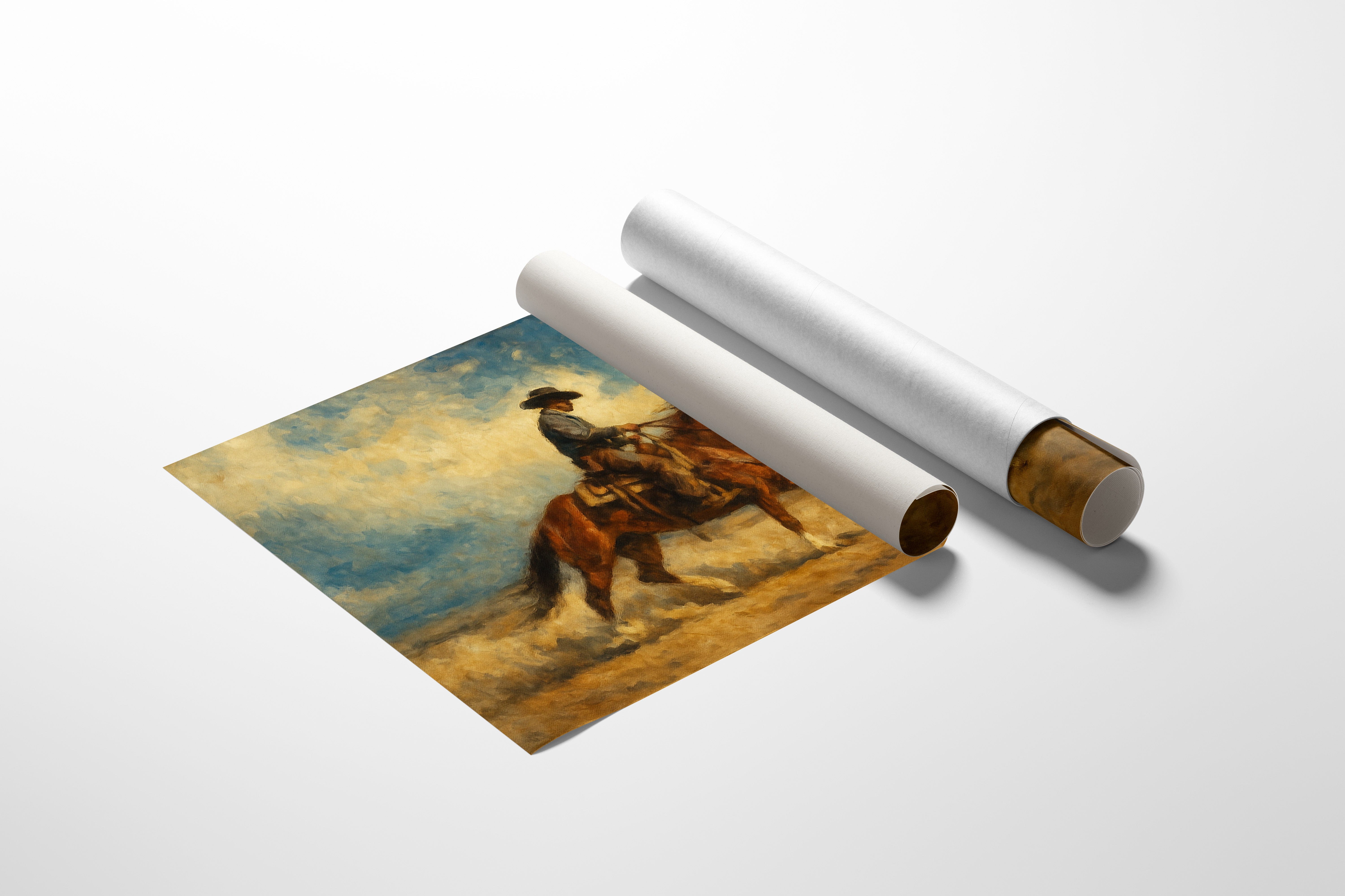 Capture the essence of the American frontier with Spirit of the Range, a richly textured digital oil painting of a cowboy riding at full stride across sunlit plains. The expressive brushwork and sweeping sky evoke the enduring freedom of the West, making this artwork a perfect statement piece for Western enthusiasts and rustic home decor.