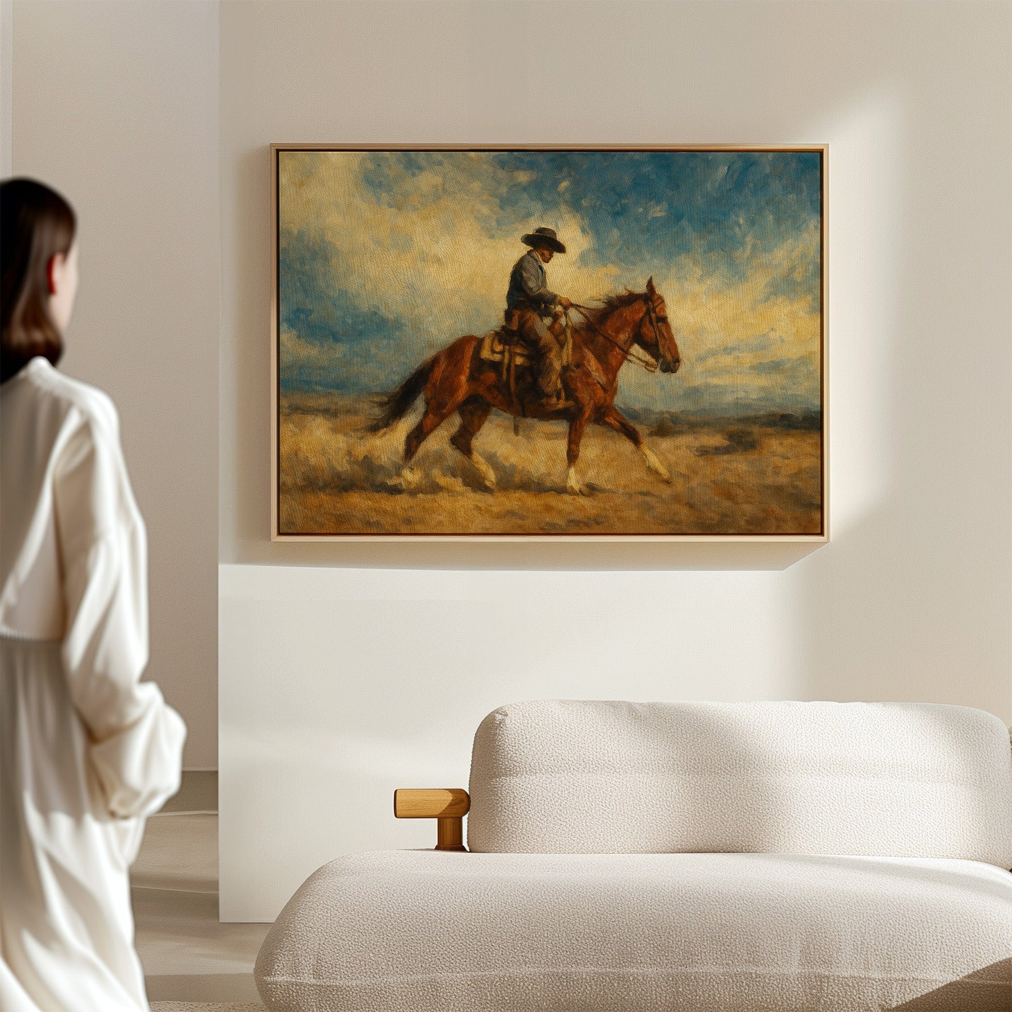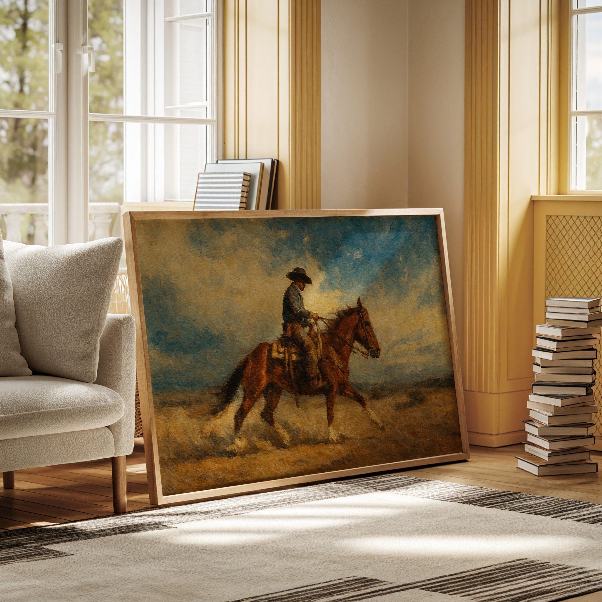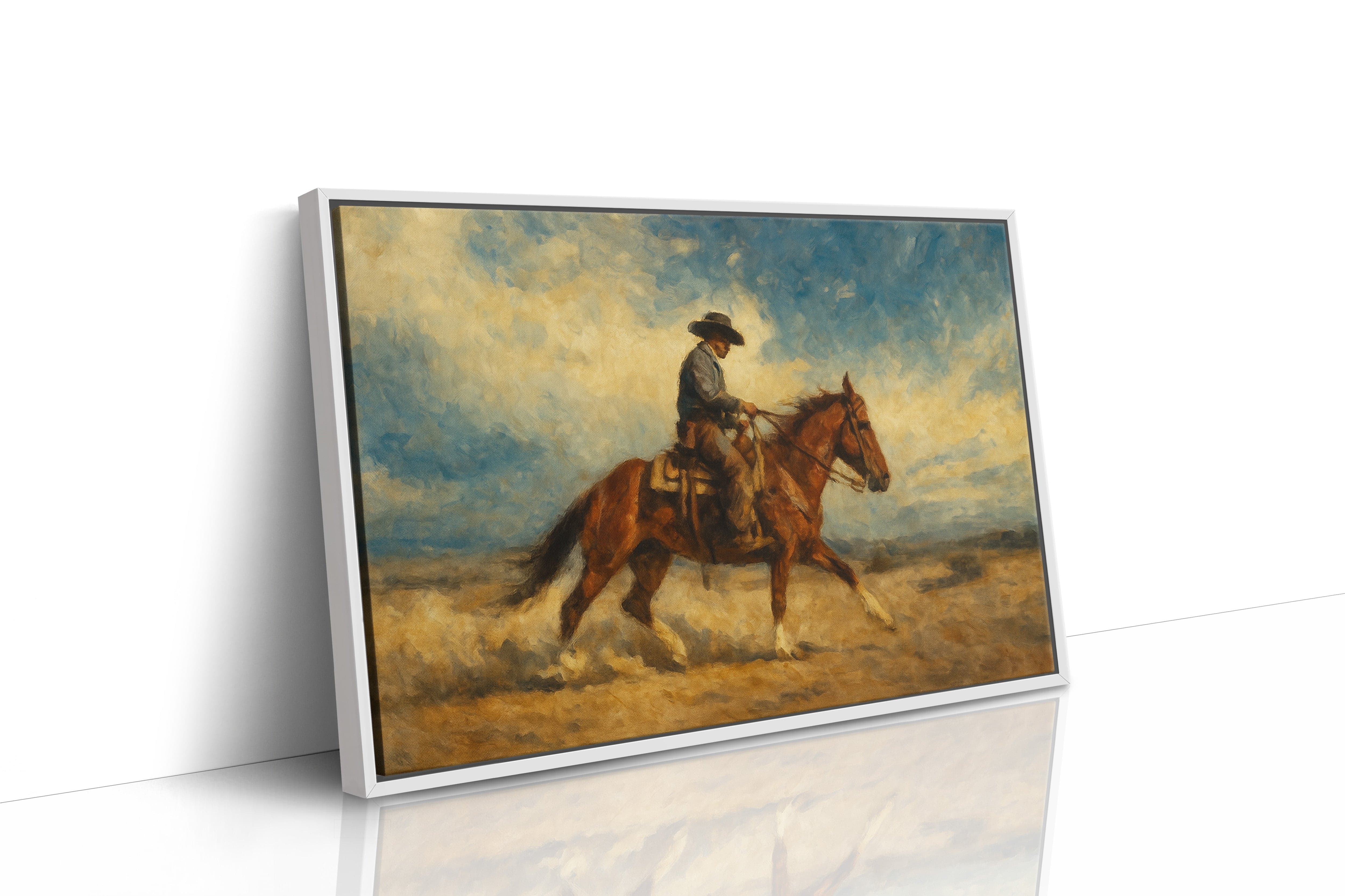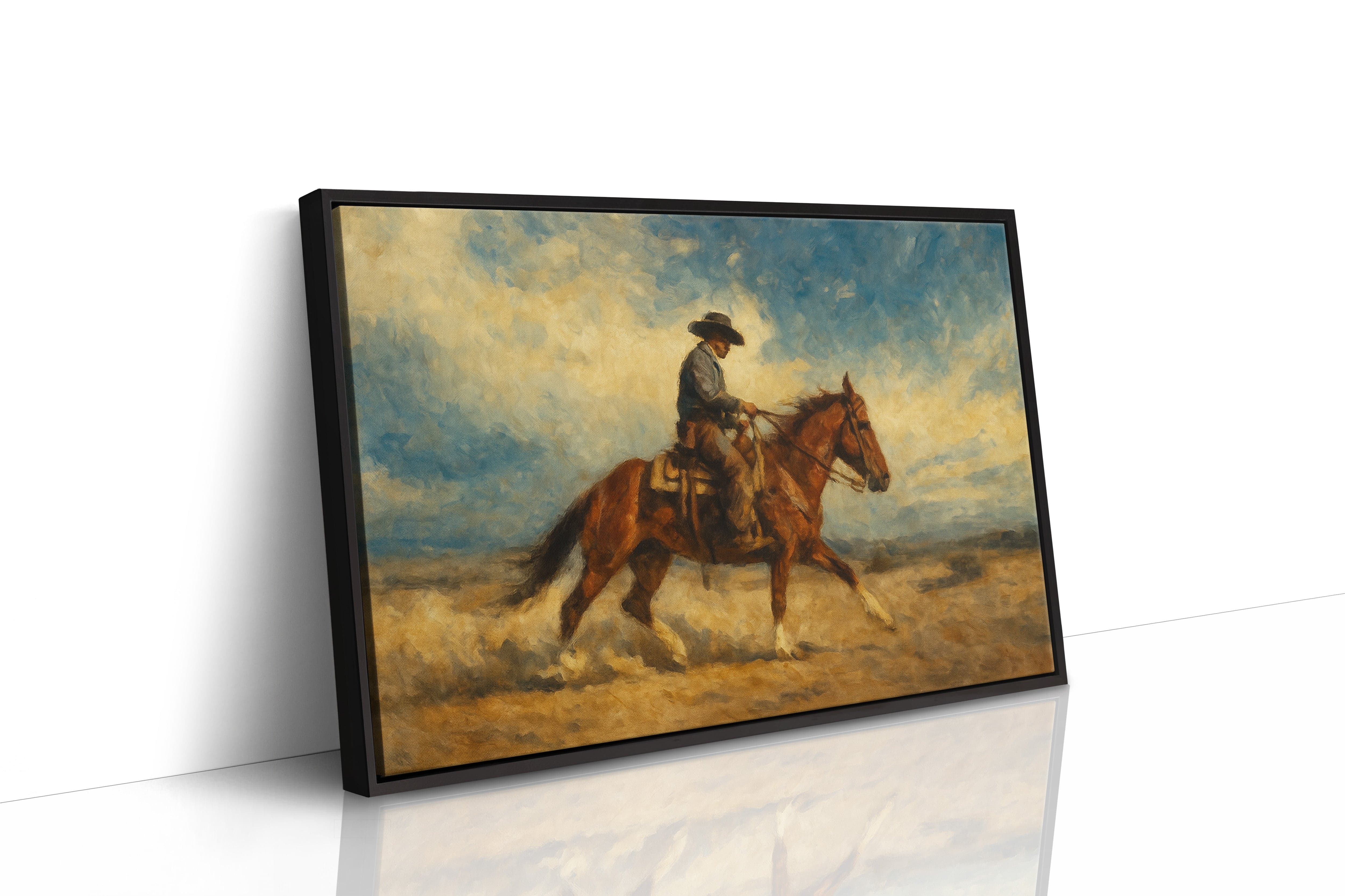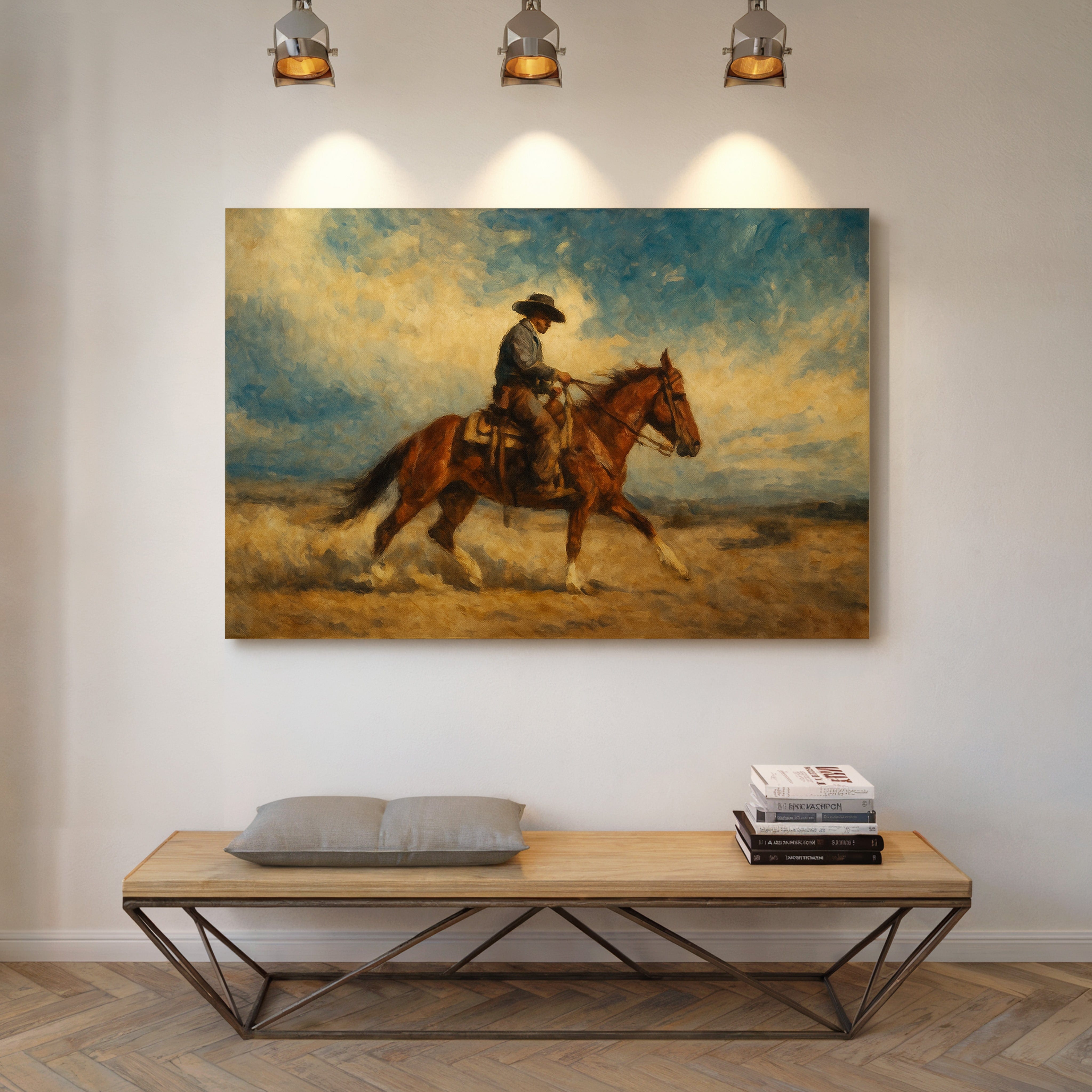 Capture the essence of the American frontier with Spirit of the Range, a richly textured digital oil painting of a cowboy riding at full stride across sunlit plains. The expressive brushwork and sweeping sky evoke the enduring freedom of the West, making this artwork a perfect statement piece for Western enthusiasts and rustic home decor.