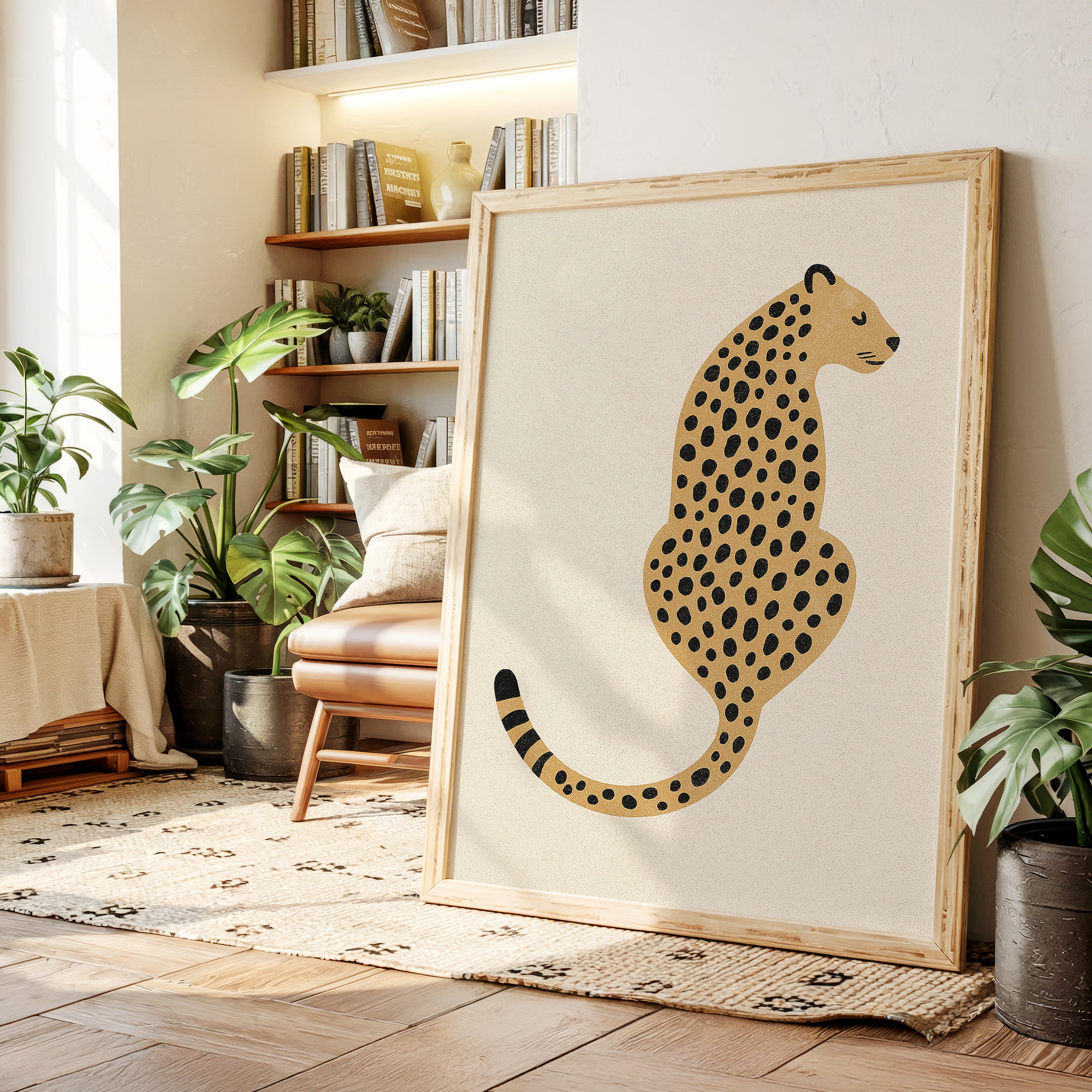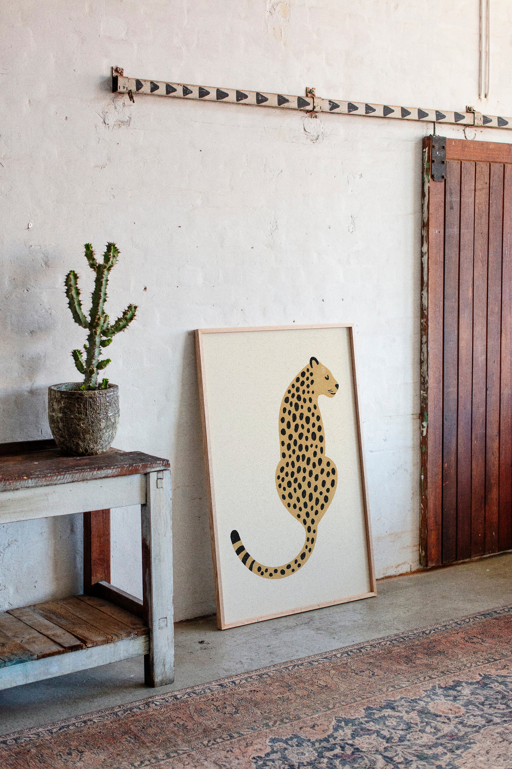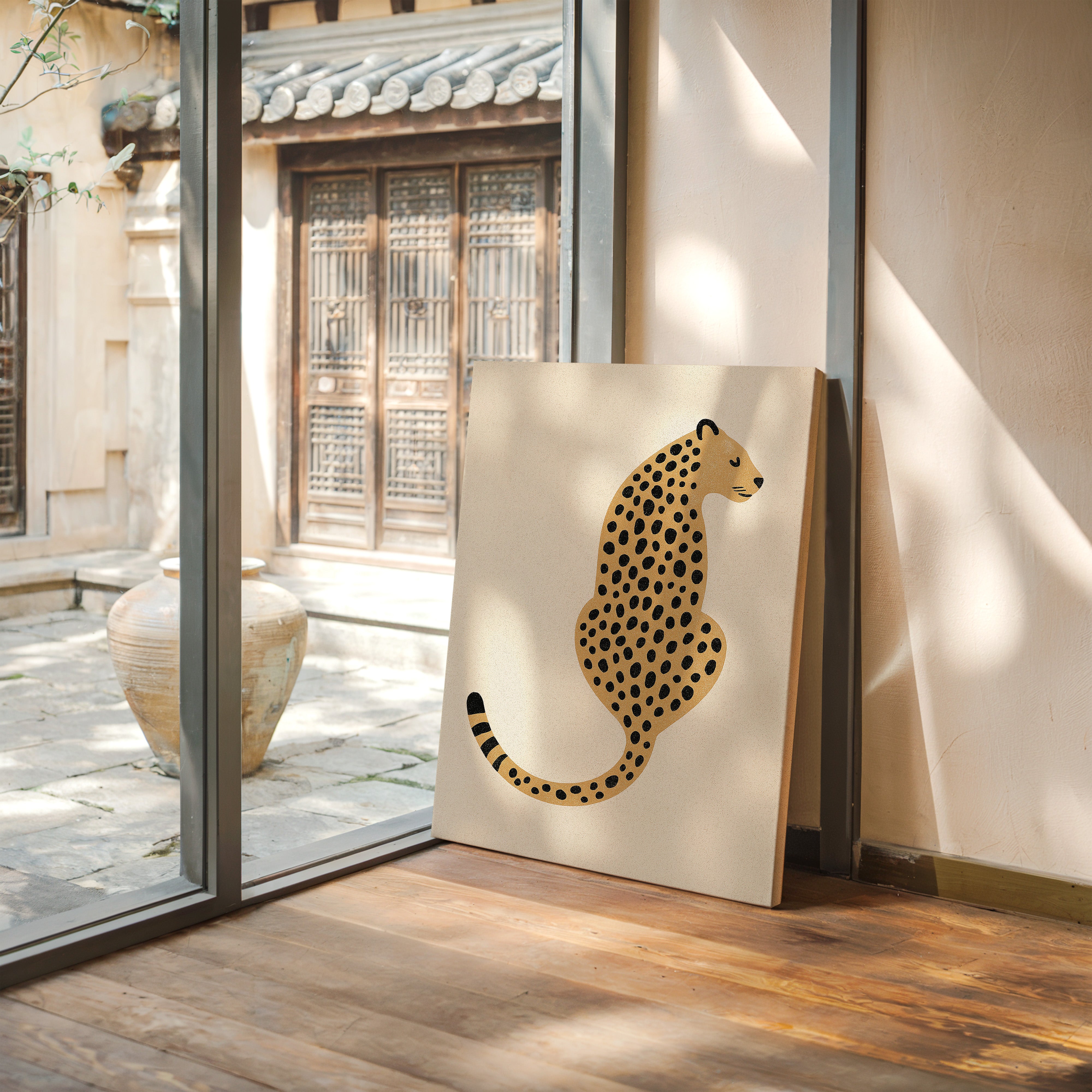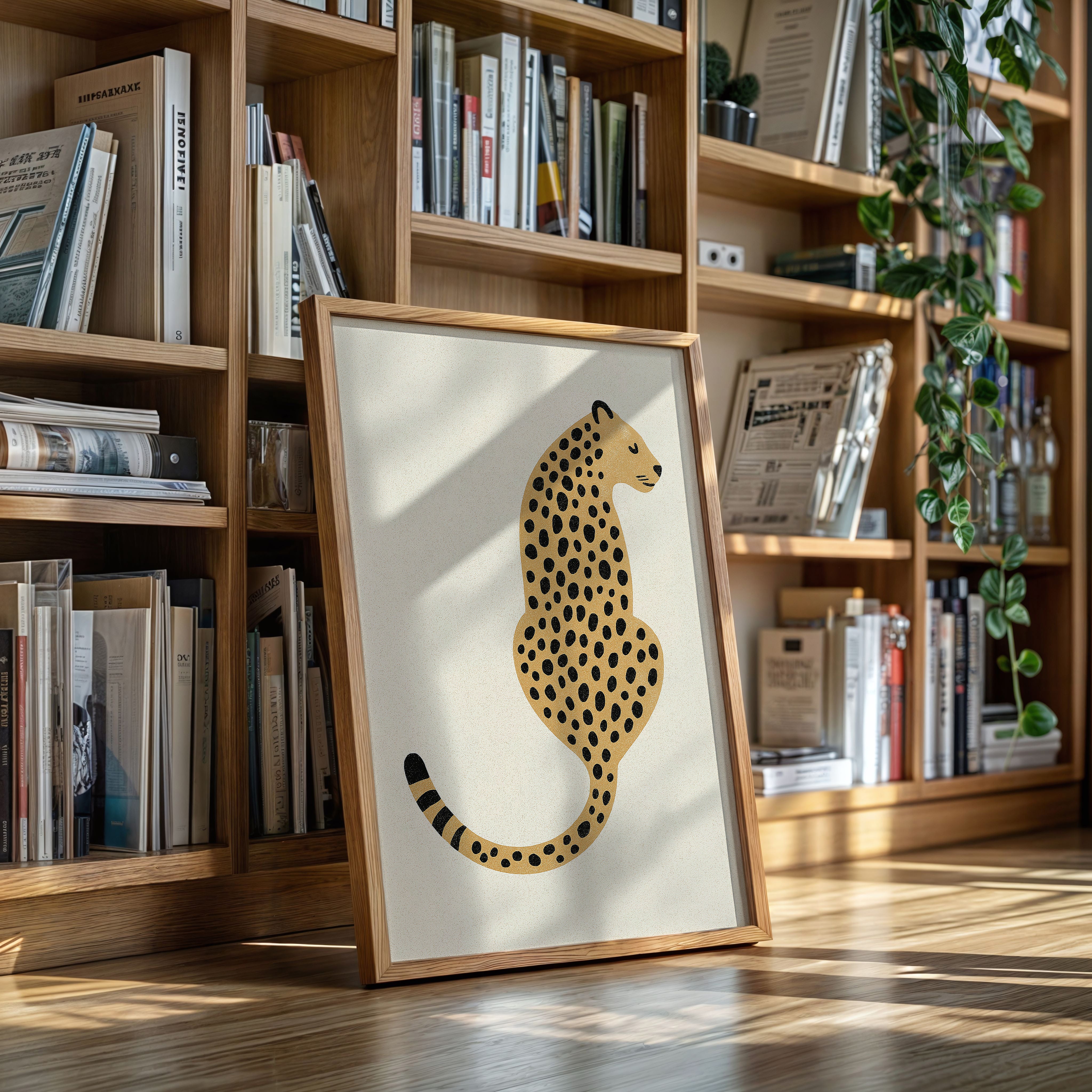 A minimalist scene unfolds where wild meets refined - a striking leopard illustration poses with quiet confidence against cream-colored canvas. The composition breathes with intentional spacing, anchored by a rugged cactus plant perched on a weathered wooden table. Rich textures play between smooth gallery walls and rustic wooden elements, while geometric patterns trace overhead like ancient markers. This vignette speaks to the intersection of natural beauty and artistic restraint. Perfect for modern spaces seeking that perfect balance of sophistication and organic warmth. Makes an especially striking statement in a home office, reading nook, or any space calling for a touch of untamed elegance.