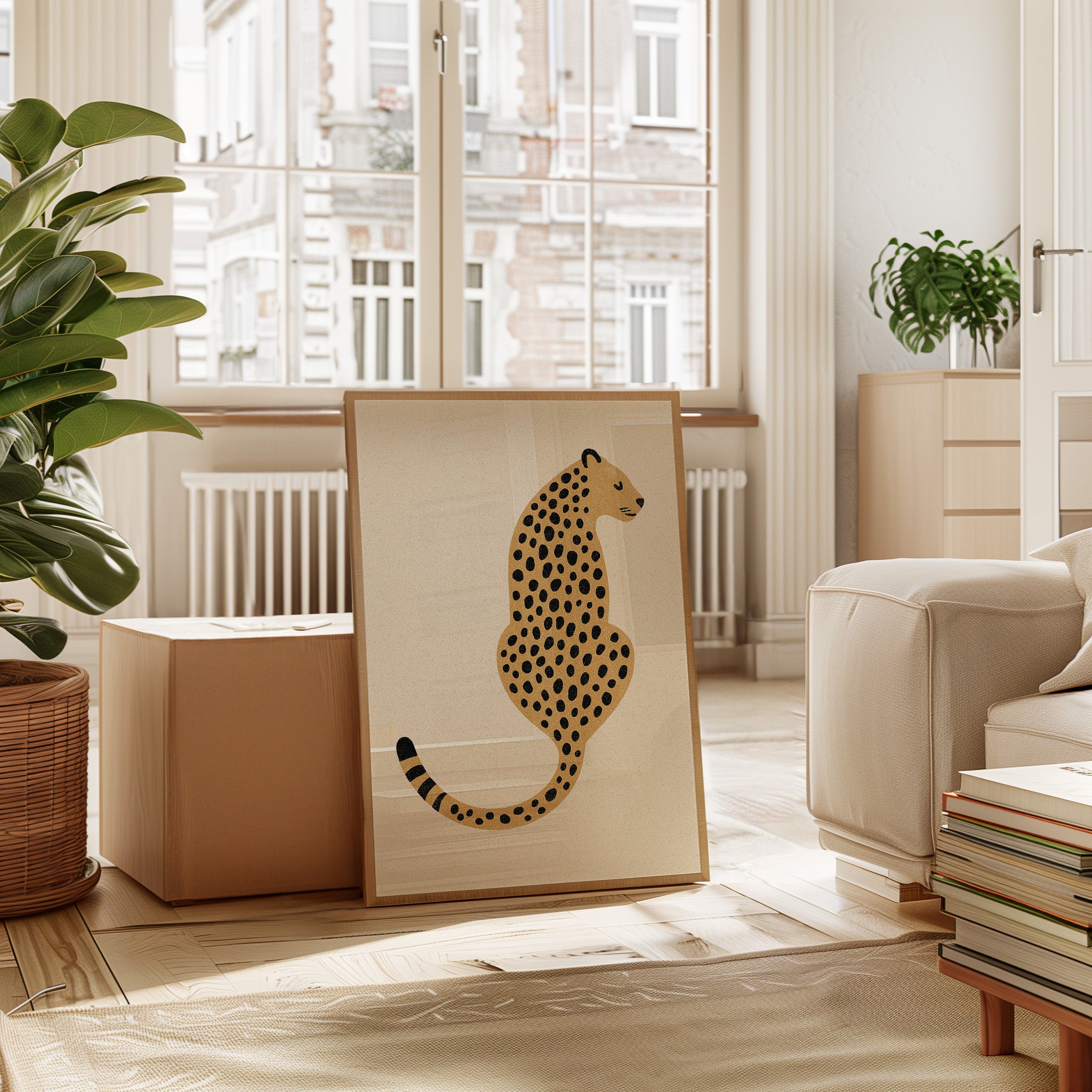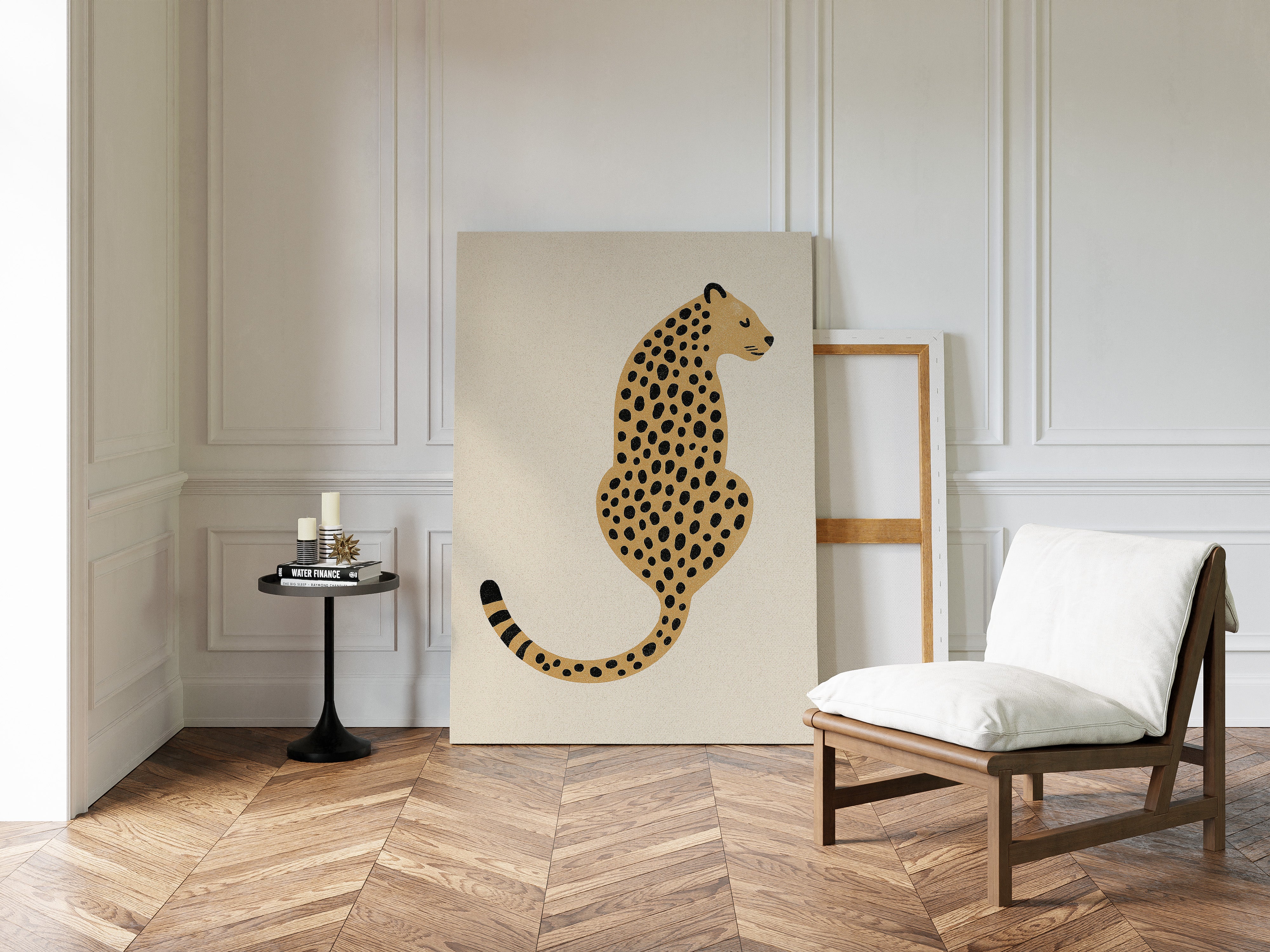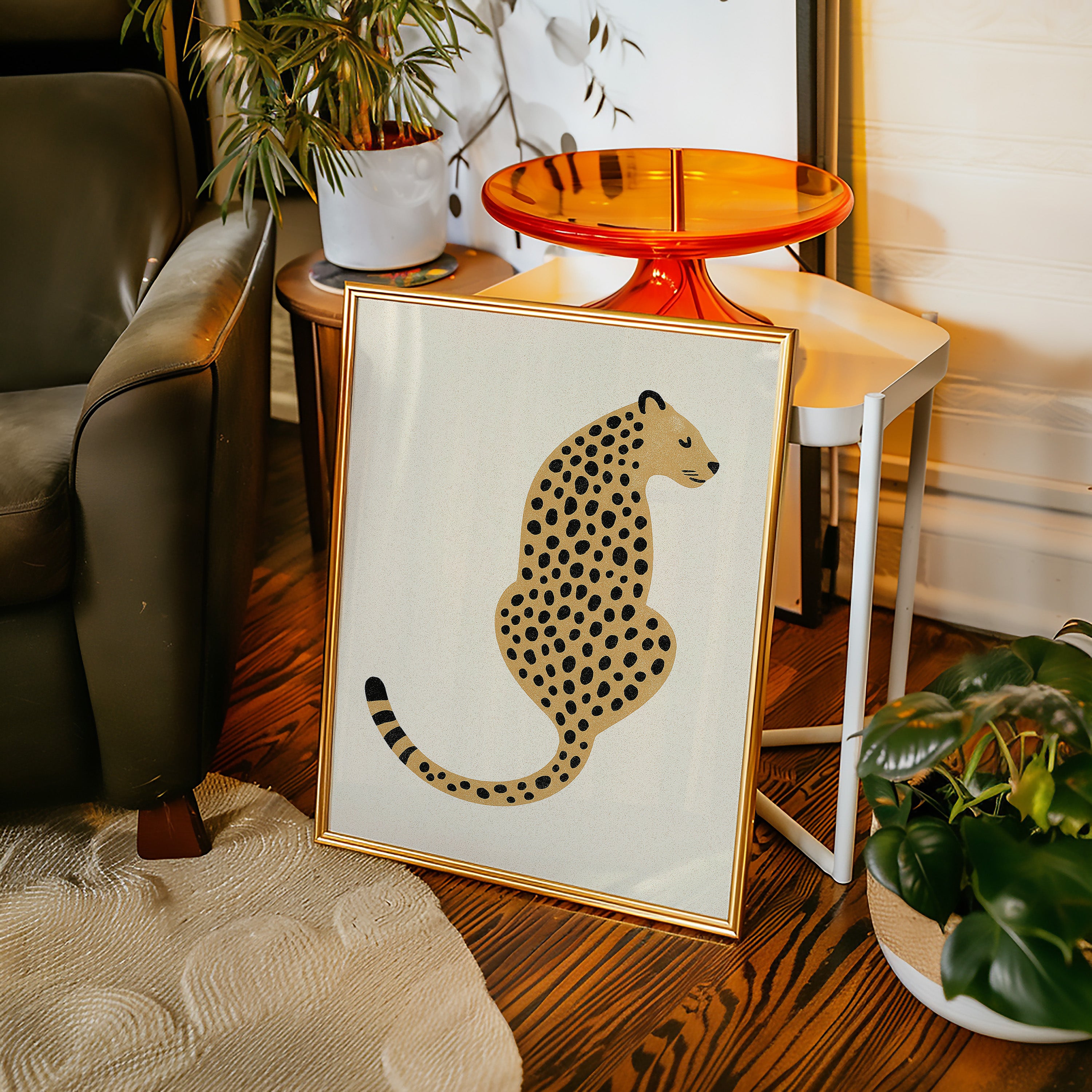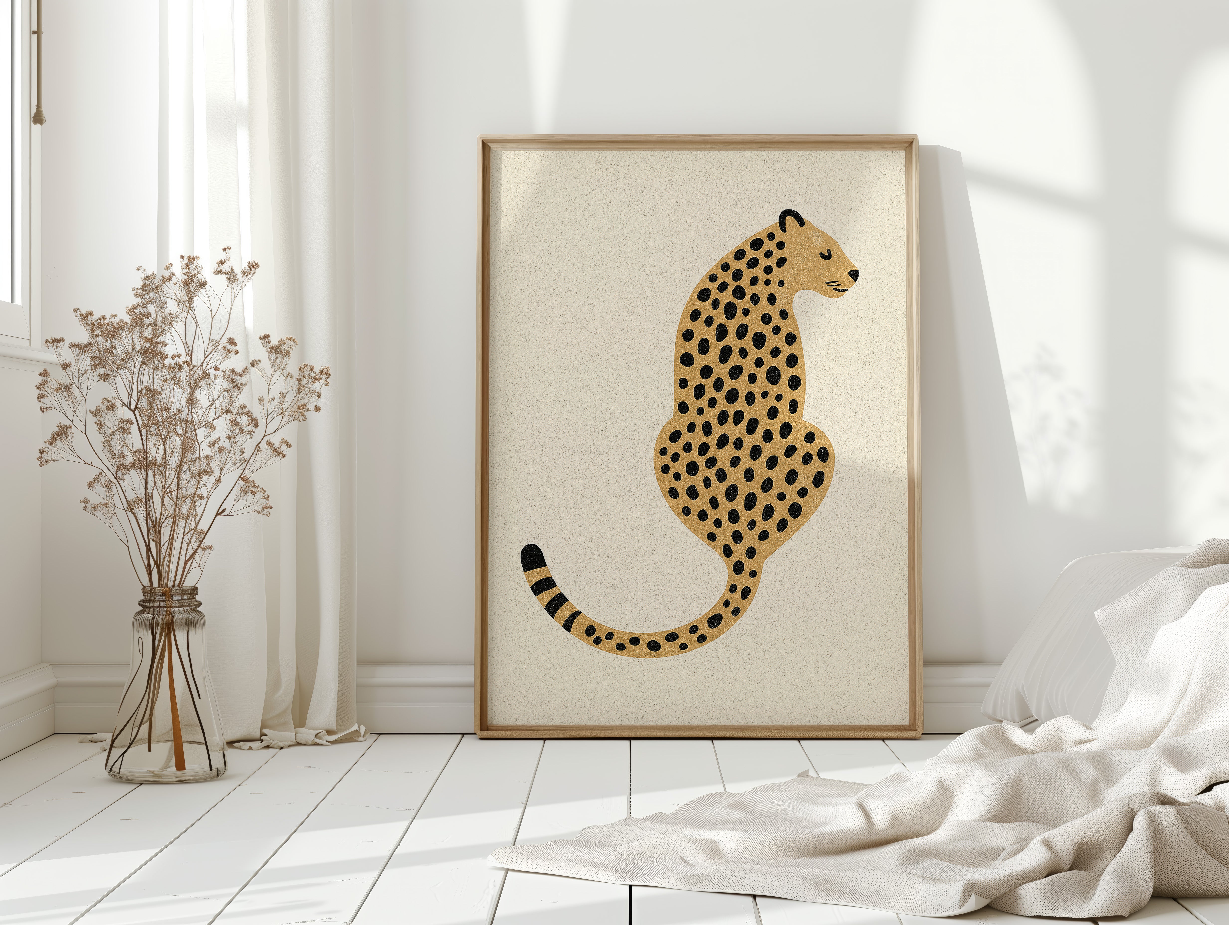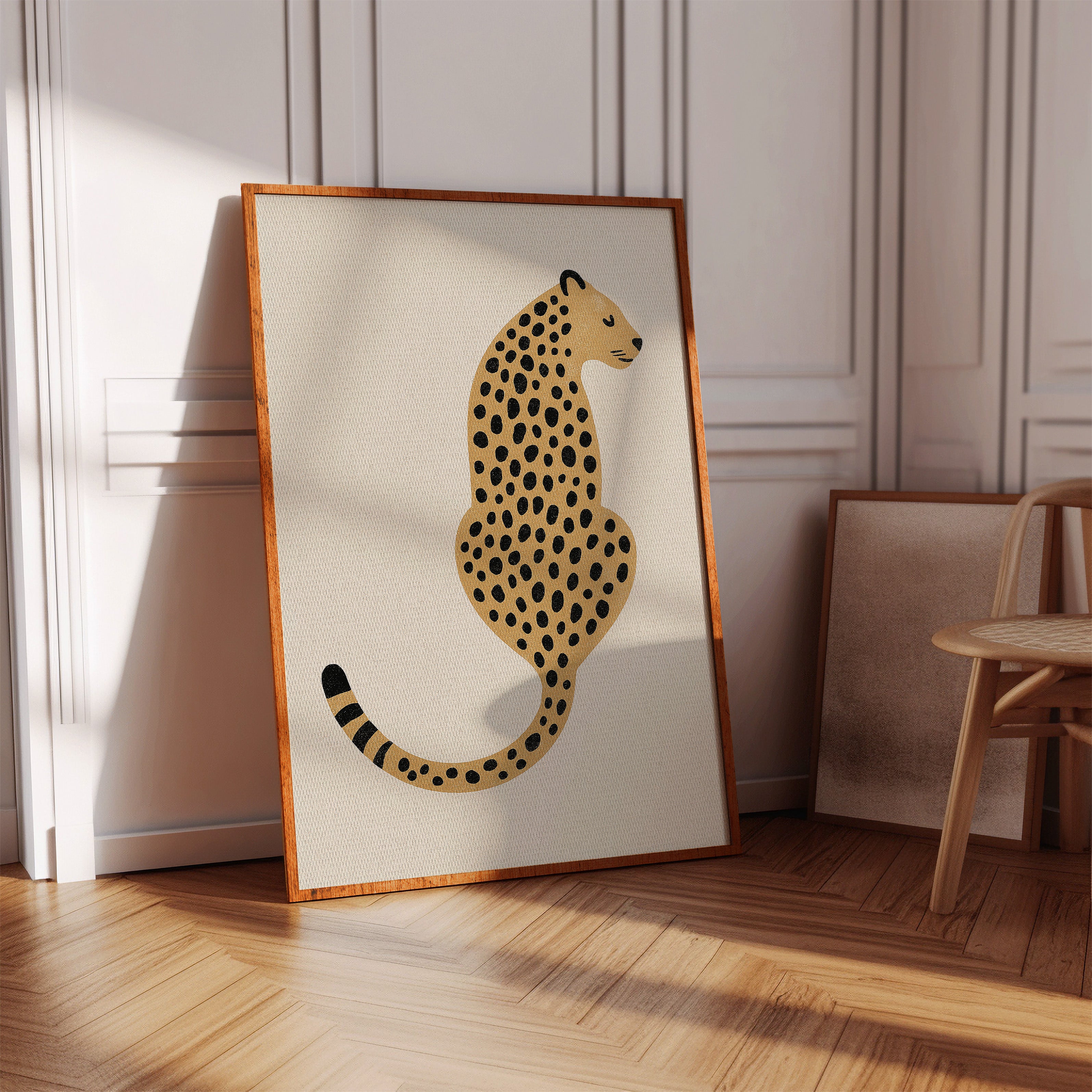 A minimalist scene unfolds where wild meets refined - a striking leopard illustration poses with quiet confidence against cream-colored canvas. The composition breathes with intentional spacing, anchored by a rugged cactus plant perched on a weathered wooden table. Rich textures play between smooth gallery walls and rustic wooden elements, while geometric patterns trace overhead like ancient markers. This vignette speaks to the intersection of natural beauty and artistic restraint. Perfect for modern spaces seeking that perfect balance of sophistication and organic warmth. Makes an especially striking statement in a home office, reading nook, or any space calling for a touch of untamed elegance.