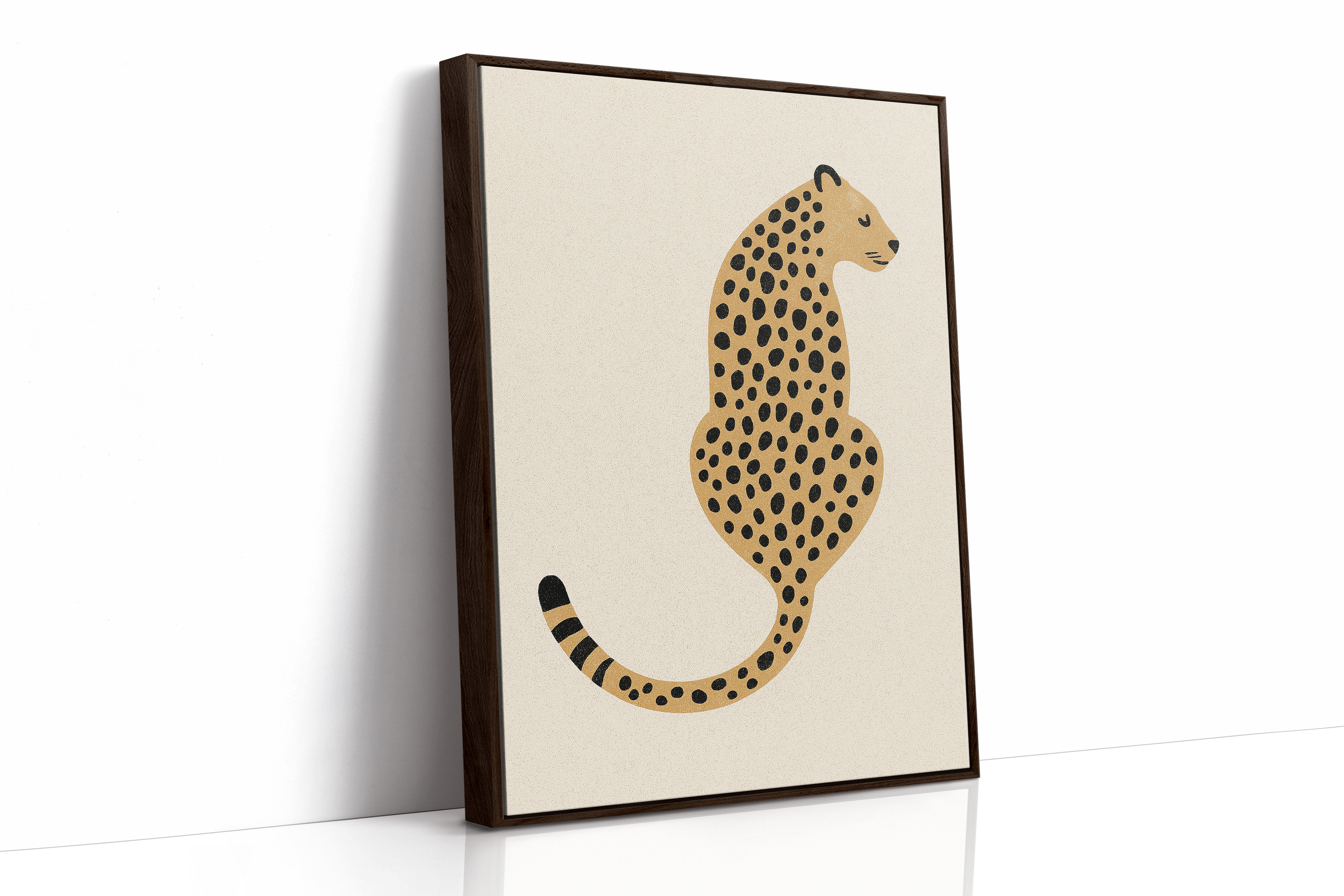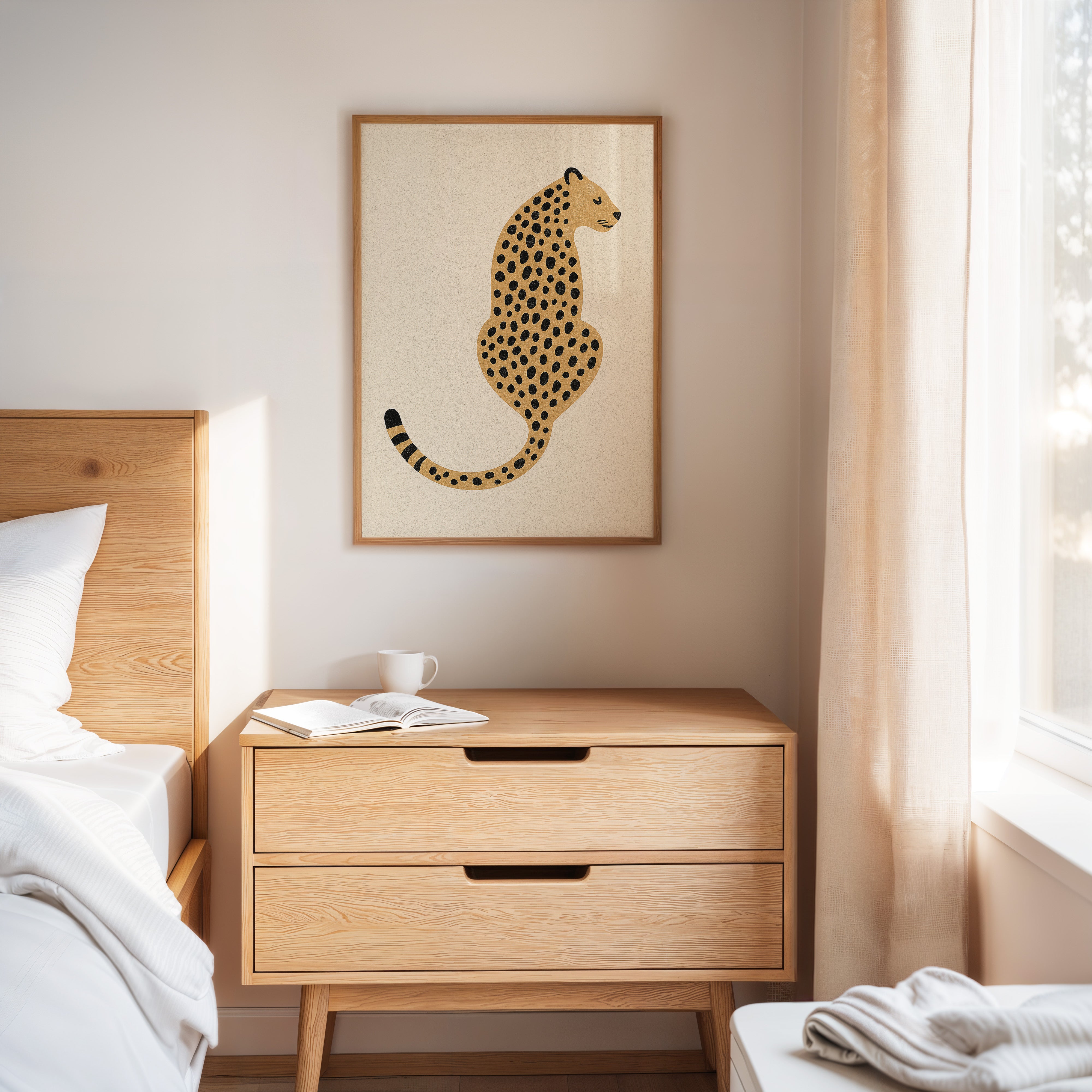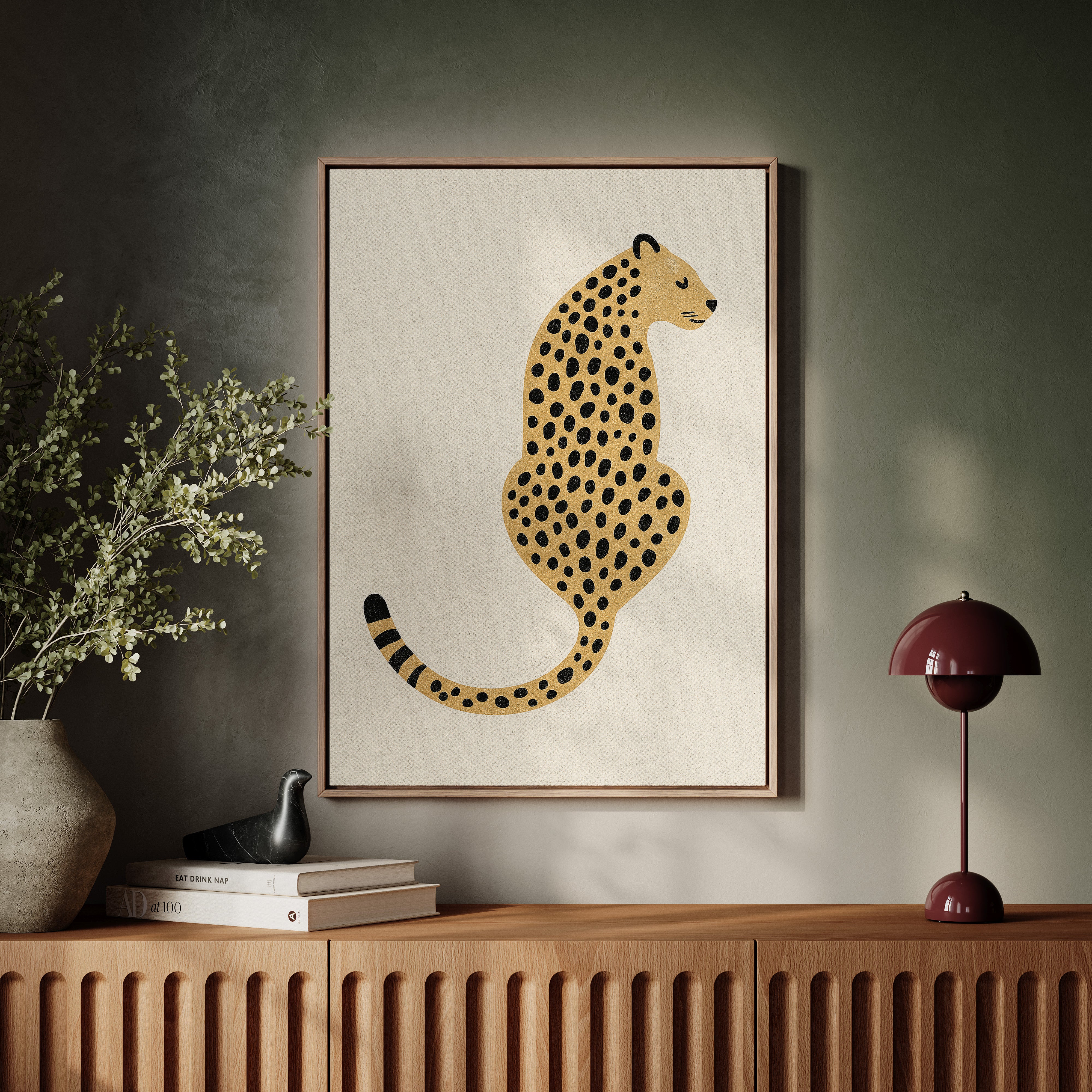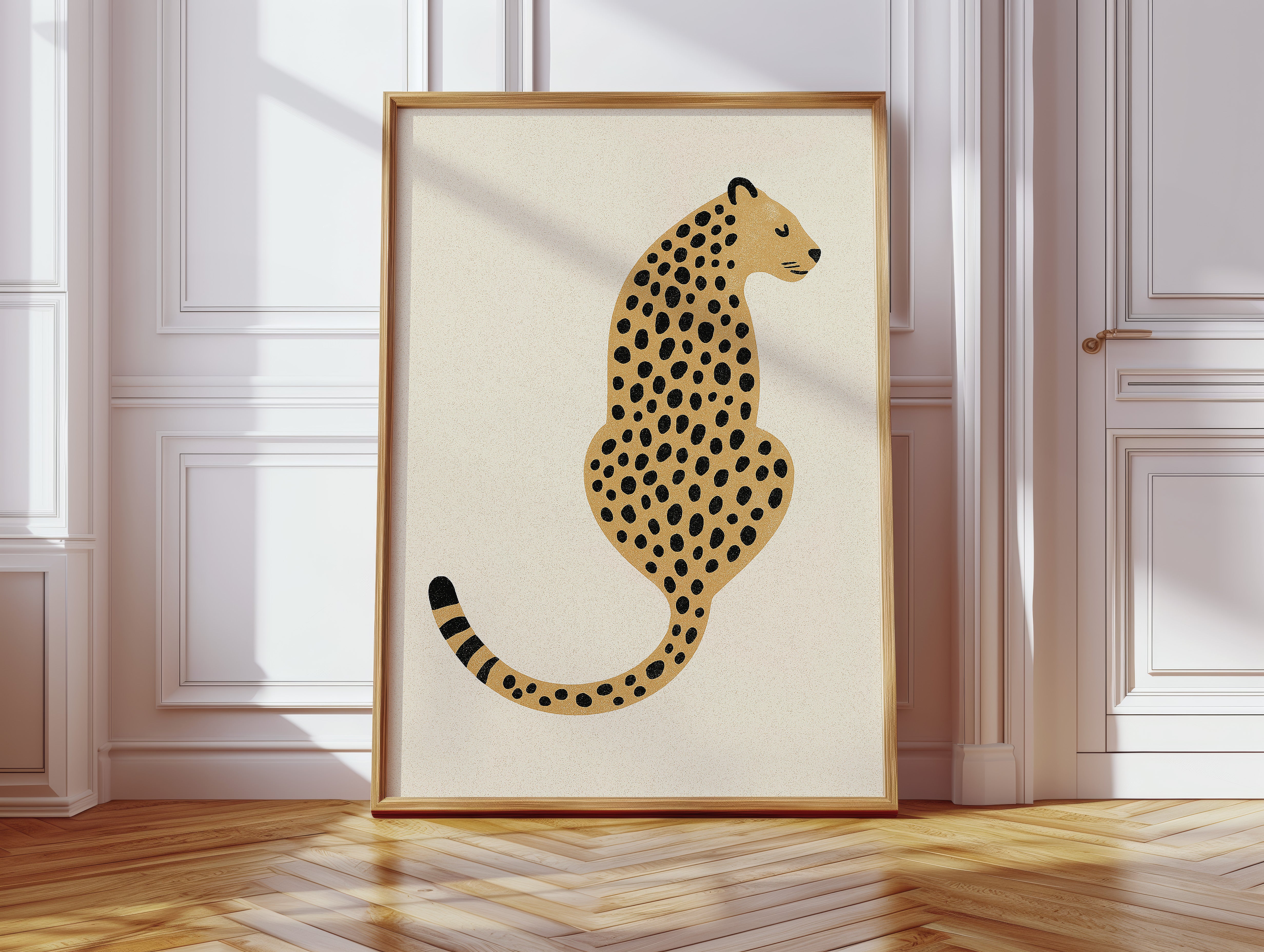 A minimalist scene unfolds where wild meets refined - a striking leopard illustration poses with quiet confidence against cream-colored canvas. The composition breathes with intentional spacing, anchored by a rugged cactus plant perched on a weathered wooden table. Rich textures play between smooth gallery walls and rustic wooden elements, while geometric patterns trace overhead like ancient markers. This vignette speaks to the intersection of natural beauty and artistic restraint. Perfect for modern spaces seeking that perfect balance of sophistication and organic warmth. Makes an especially striking statement in a home office, reading nook, or any space calling for a touch of untamed elegance.