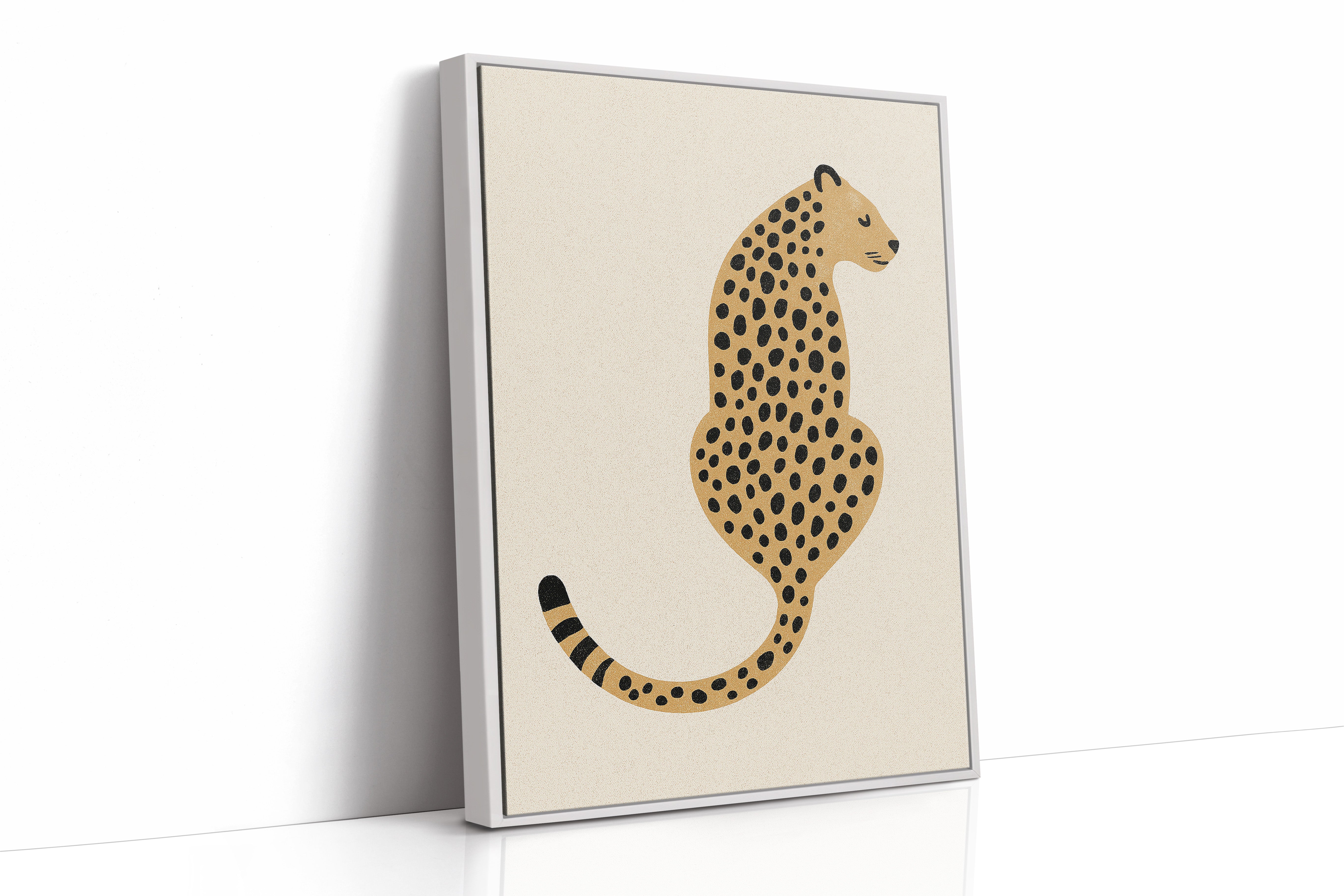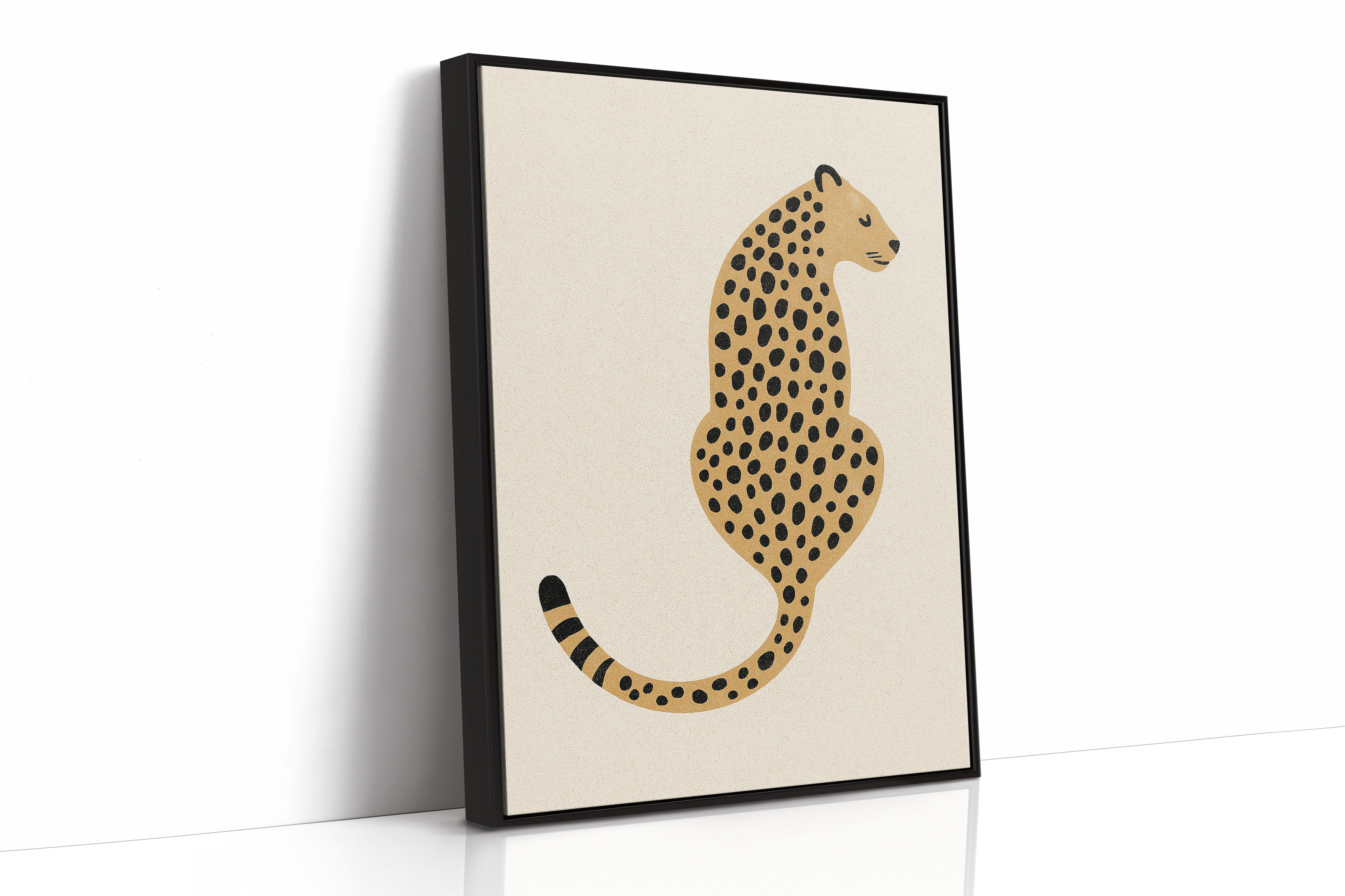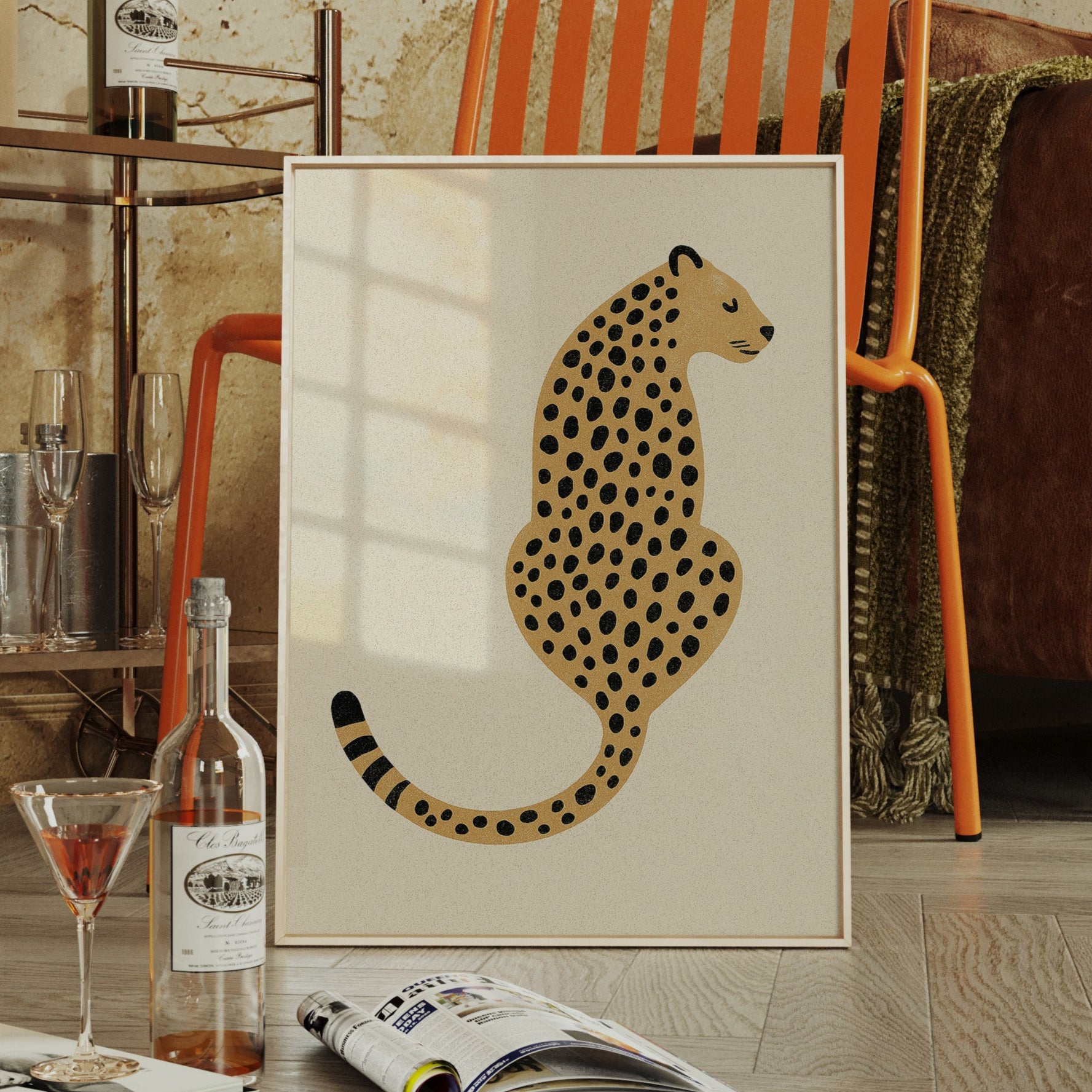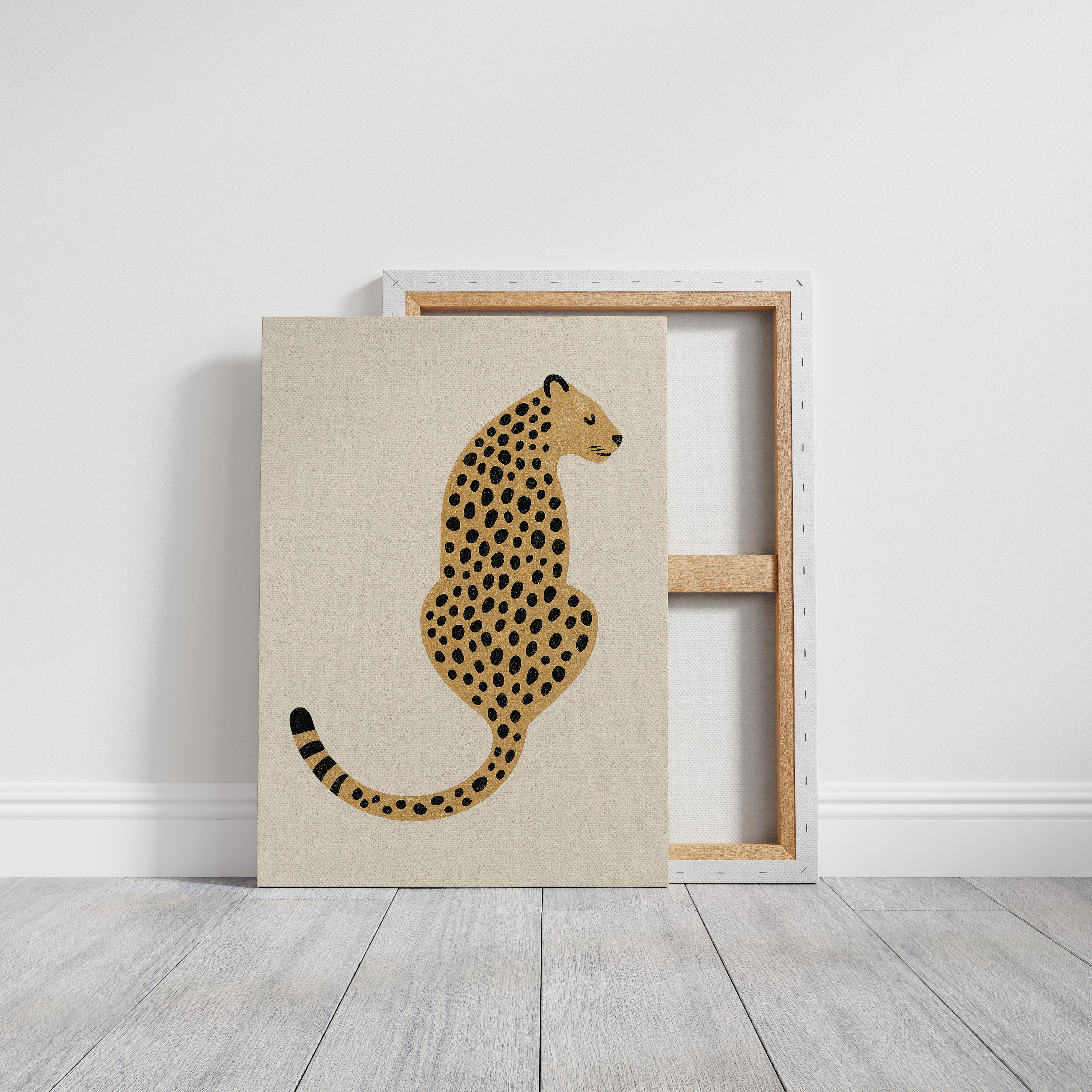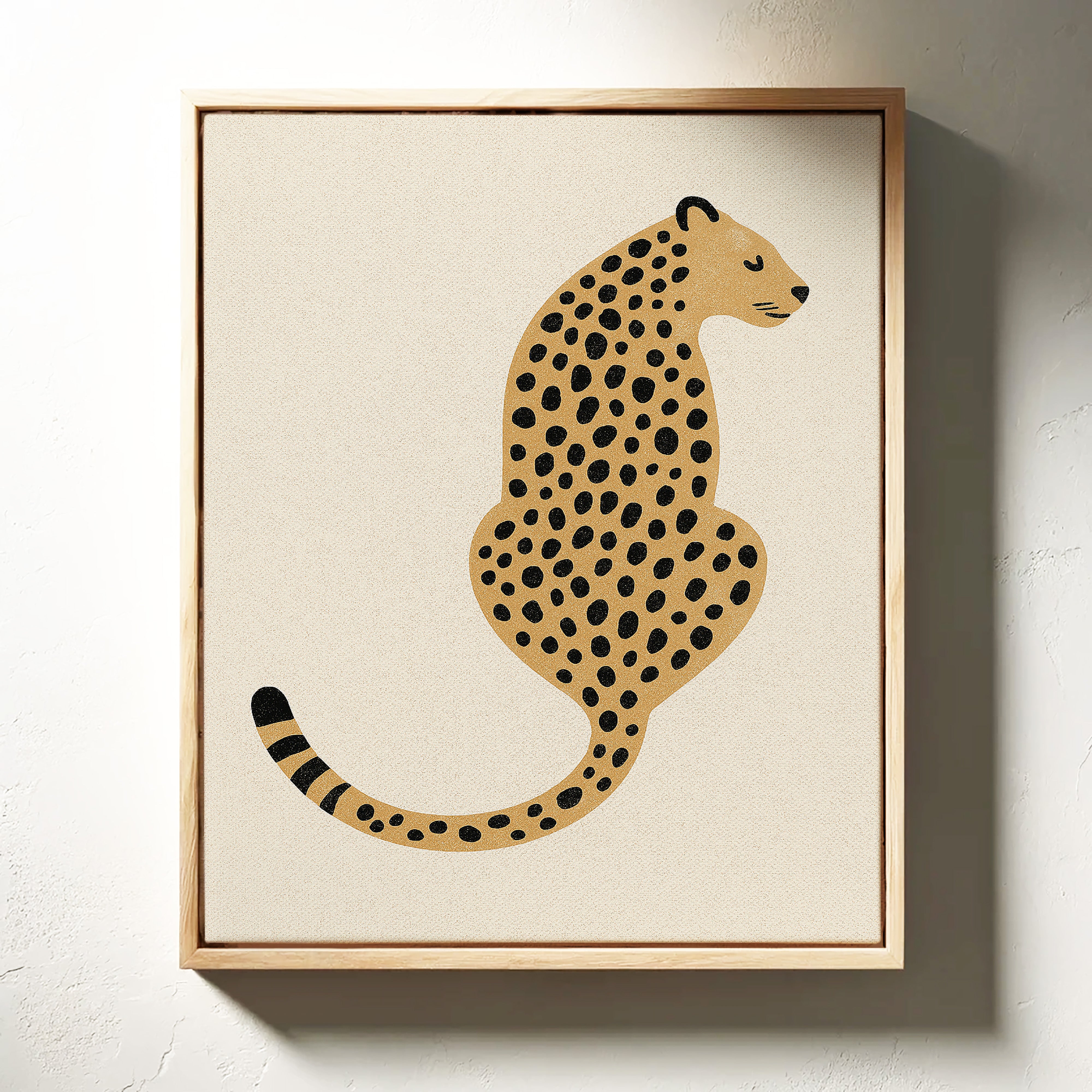 A minimalist scene unfolds where wild meets refined - a striking leopard illustration poses with quiet confidence against cream-colored canvas. The composition breathes with intentional spacing, anchored by a rugged cactus plant perched on a weathered wooden table. Rich textures play between smooth gallery walls and rustic wooden elements, while geometric patterns trace overhead like ancient markers. This vignette speaks to the intersection of natural beauty and artistic restraint. Perfect for modern spaces seeking that perfect balance of sophistication and organic warmth. Makes an especially striking statement in a home office, reading nook, or any space calling for a touch of untamed elegance.