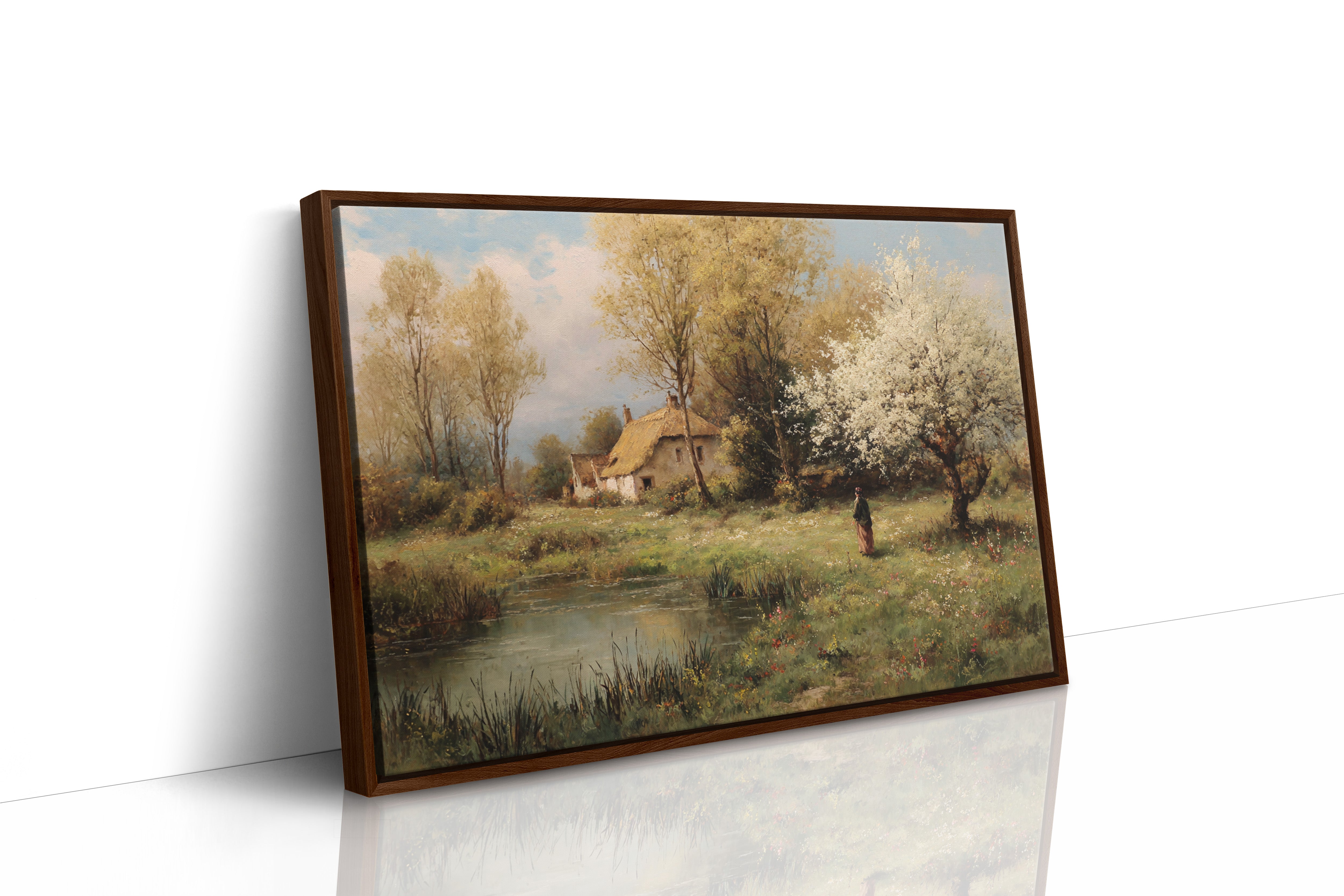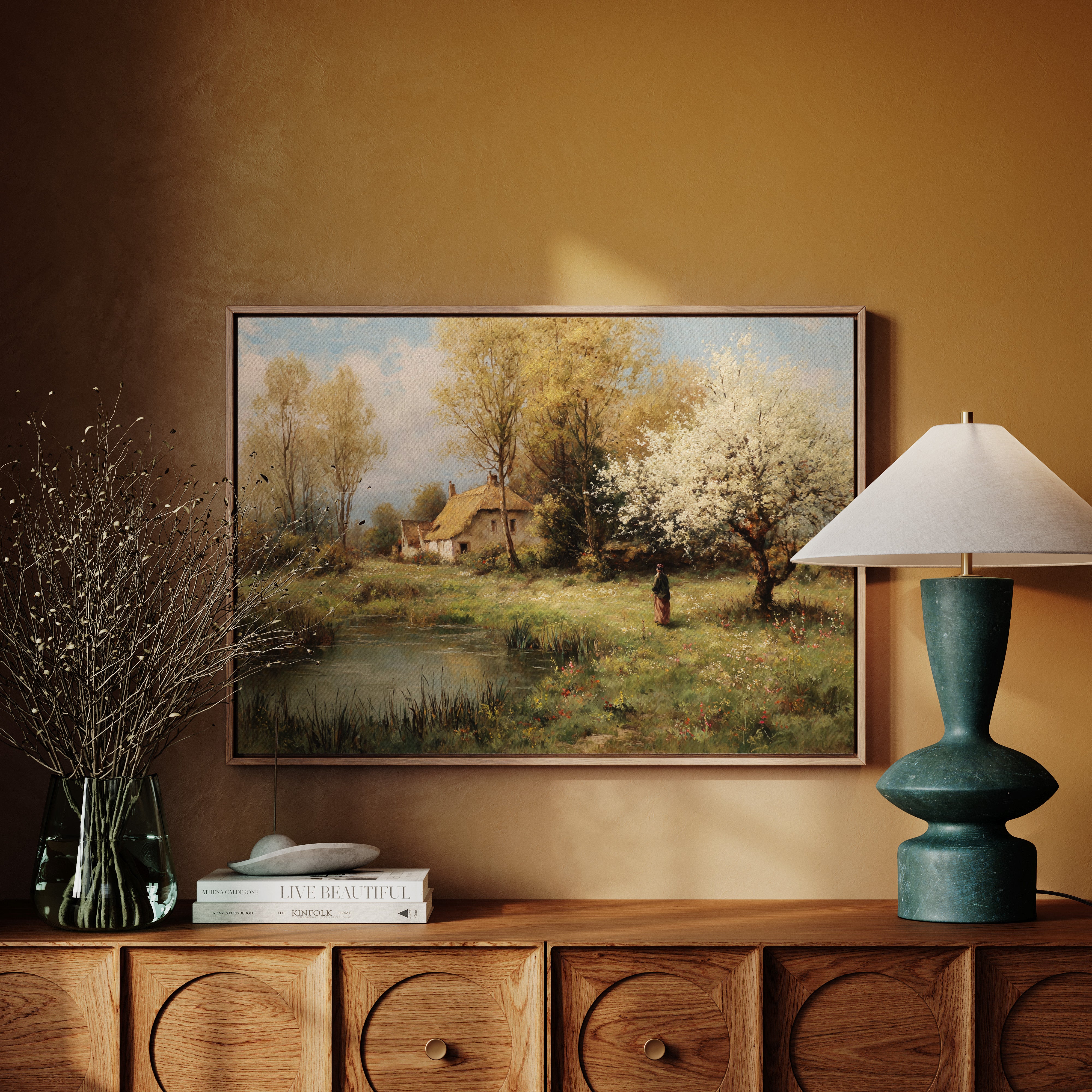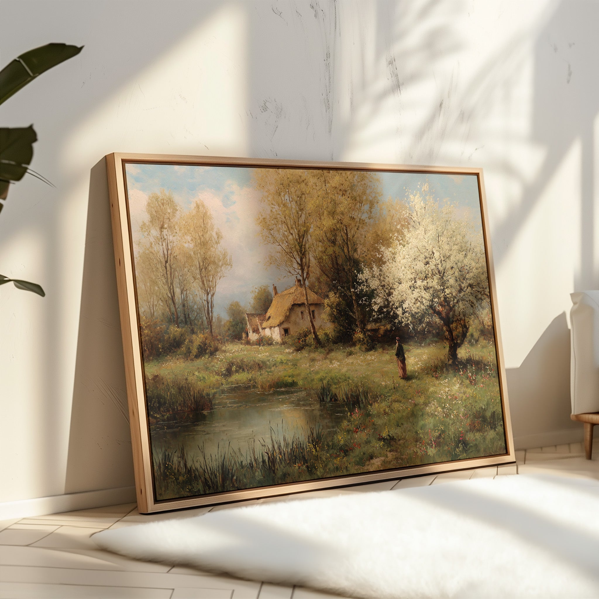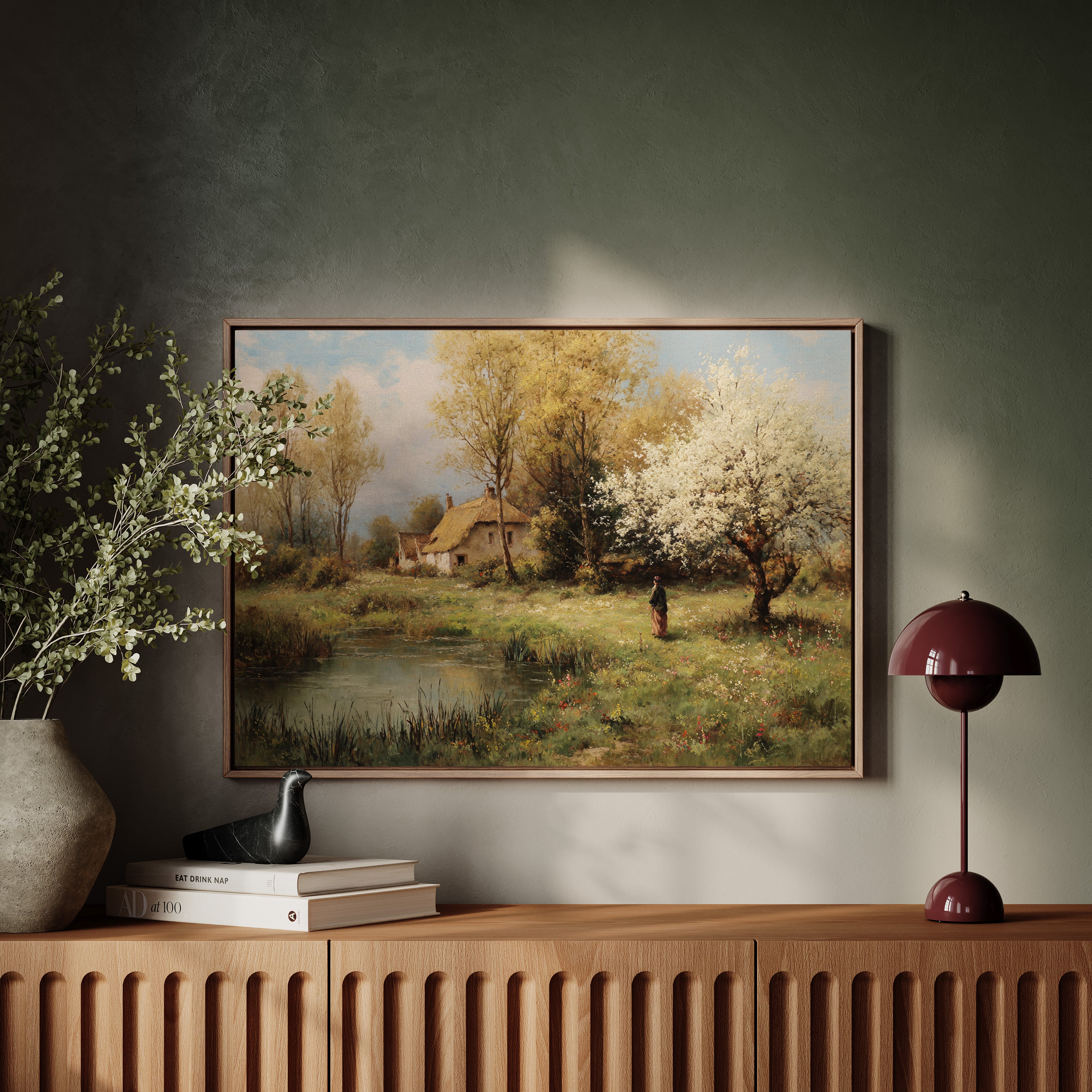 Sunlight filters through awakening trees, casting gentle shadows across a pastoral scene where time seems to move more slowly. A lone figure pauses along the pond's edge, surrounded by the first wildflowers of spring and the delicate white blossoms of a flowering tree. The thatched cottage nestles into the landscape, its weathered walls and rustic charm speaking to generations of simple country life. Golden afternoon light bathes the scene in warmth, while reeds stand sentinel at the water's edge, their reflection creating nature's own meditation. This tranquil scene would bring pastoral serenity to a reading nook or create a moment of peaceful contemplation in a bedroom sanctuary.