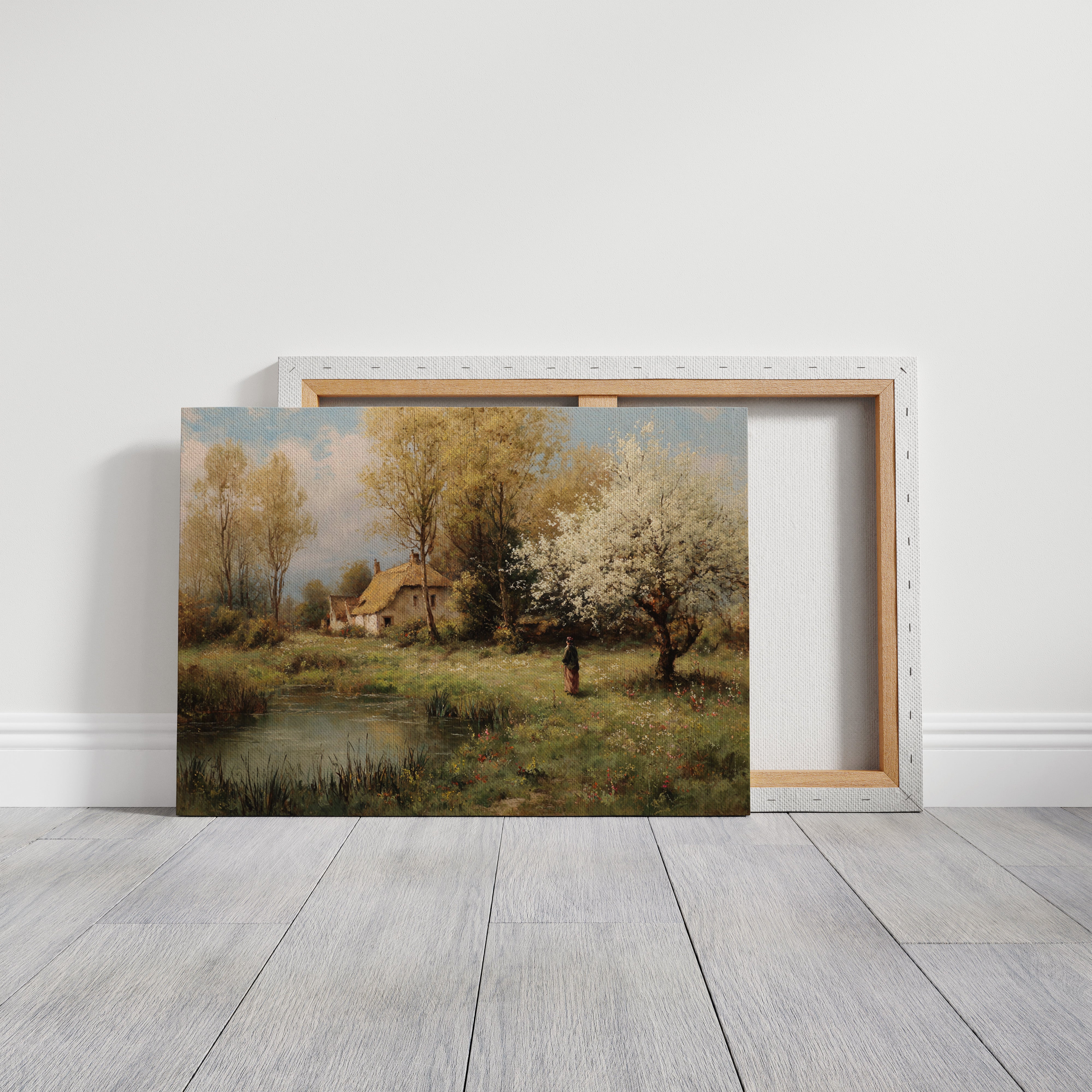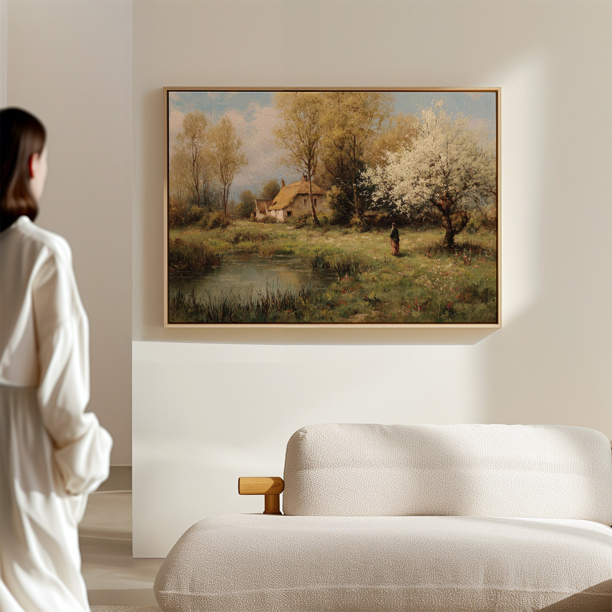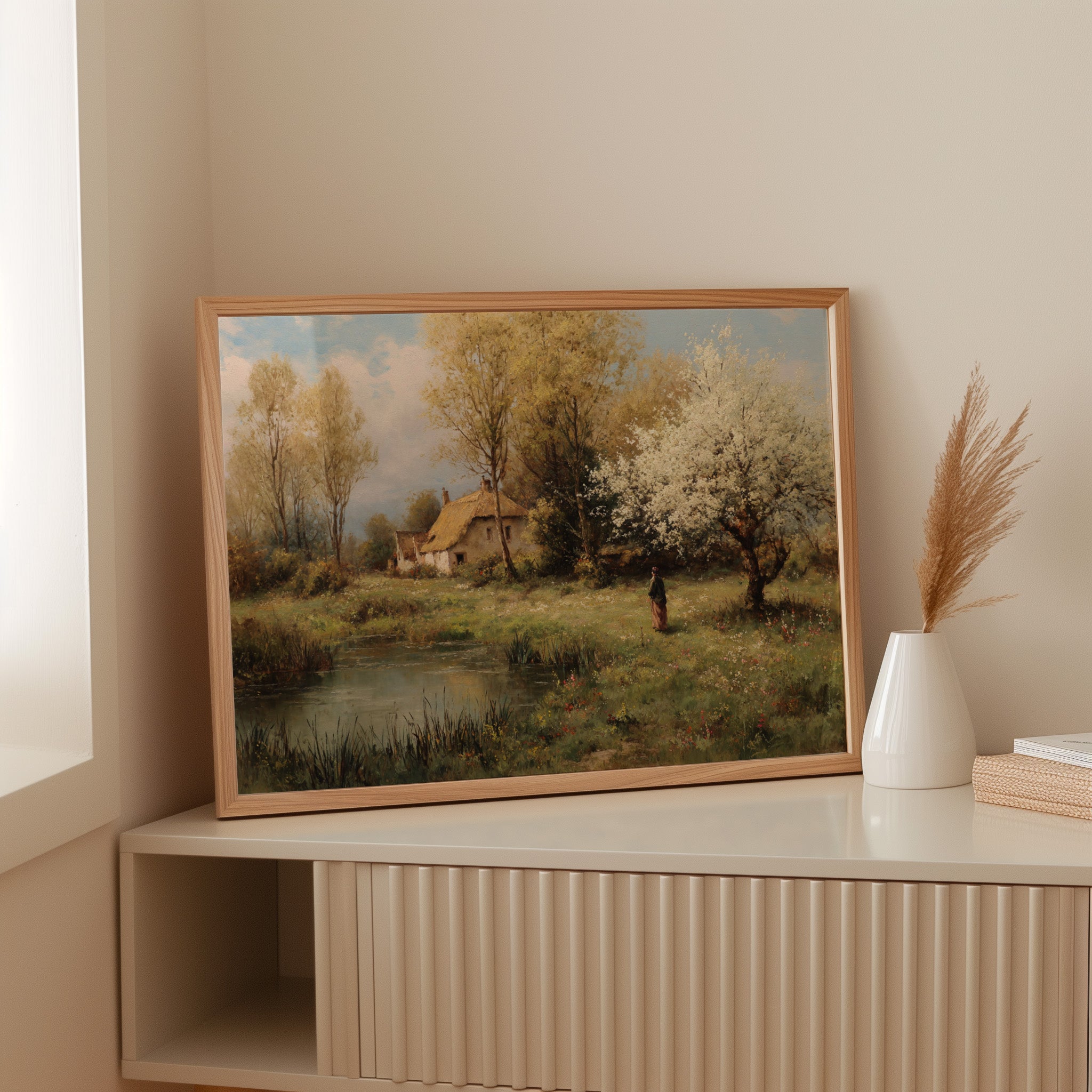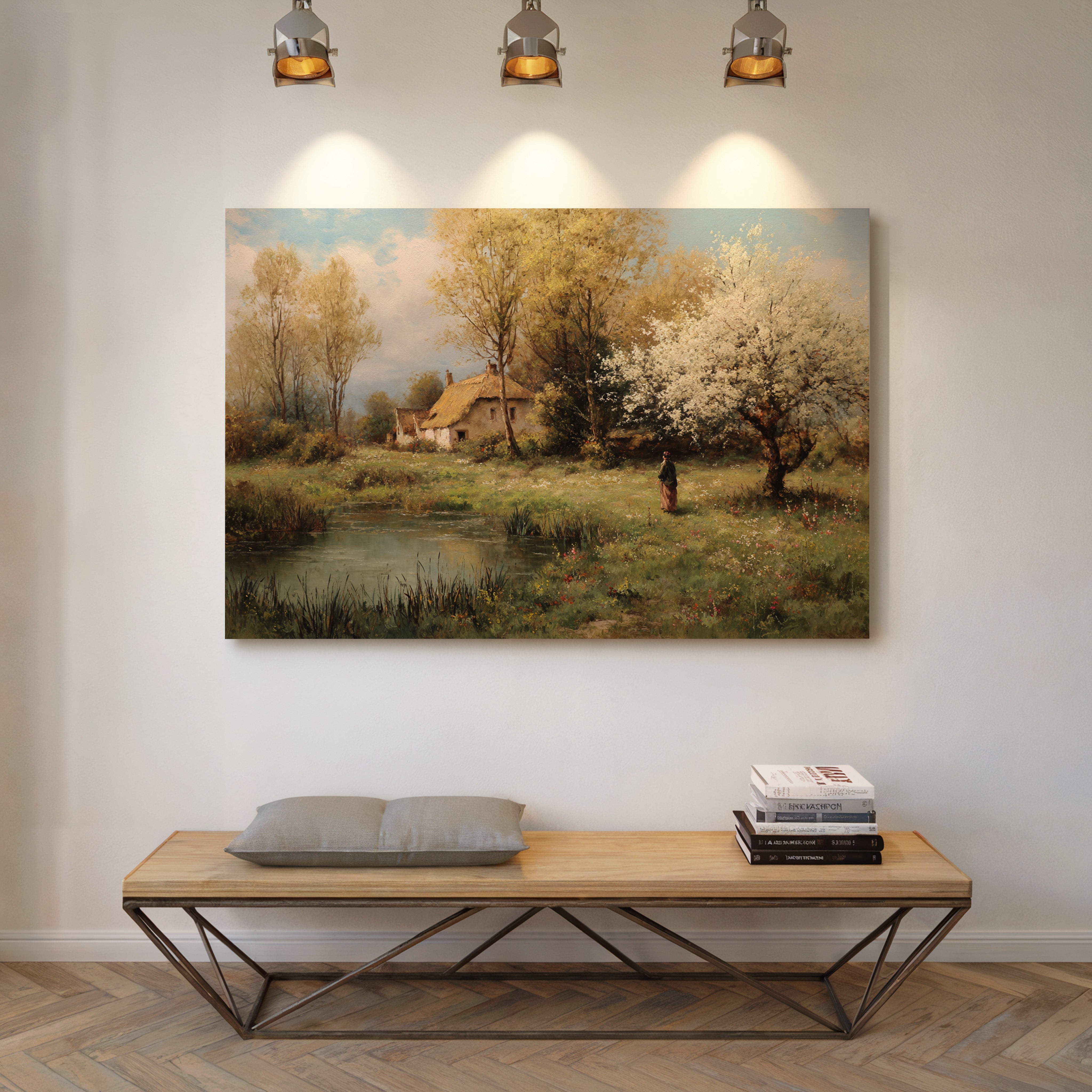 Sunlight filters through awakening trees, casting gentle shadows across a pastoral scene where time seems to move more slowly. A lone figure pauses along the pond's edge, surrounded by the first wildflowers of spring and the delicate white blossoms of a flowering tree. The thatched cottage nestles into the landscape, its weathered walls and rustic charm speaking to generations of simple country life. Golden afternoon light bathes the scene in warmth, while reeds stand sentinel at the water's edge, their reflection creating nature's own meditation. This tranquil scene would bring pastoral serenity to a reading nook or create a moment of peaceful contemplation in a bedroom sanctuary.