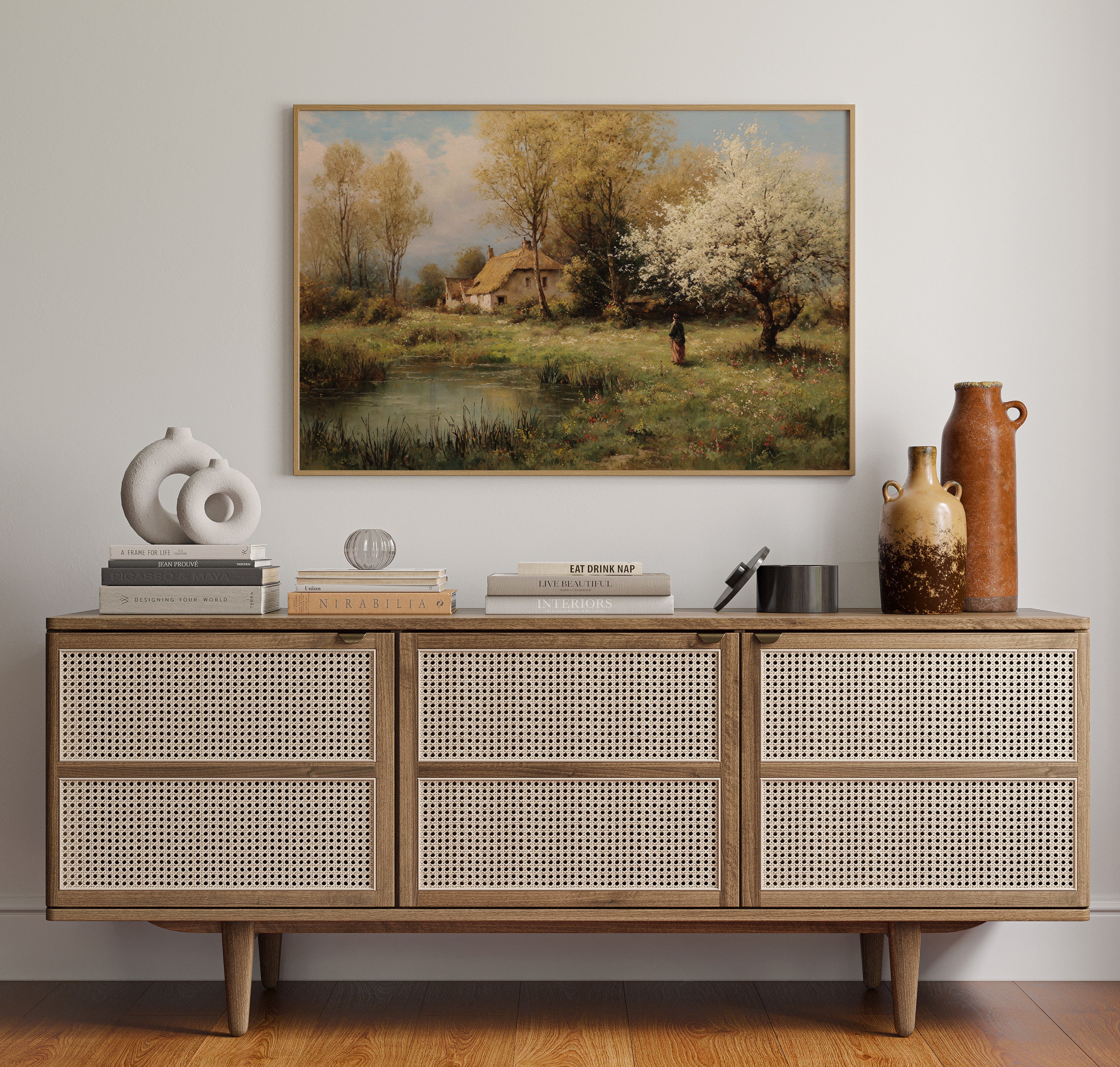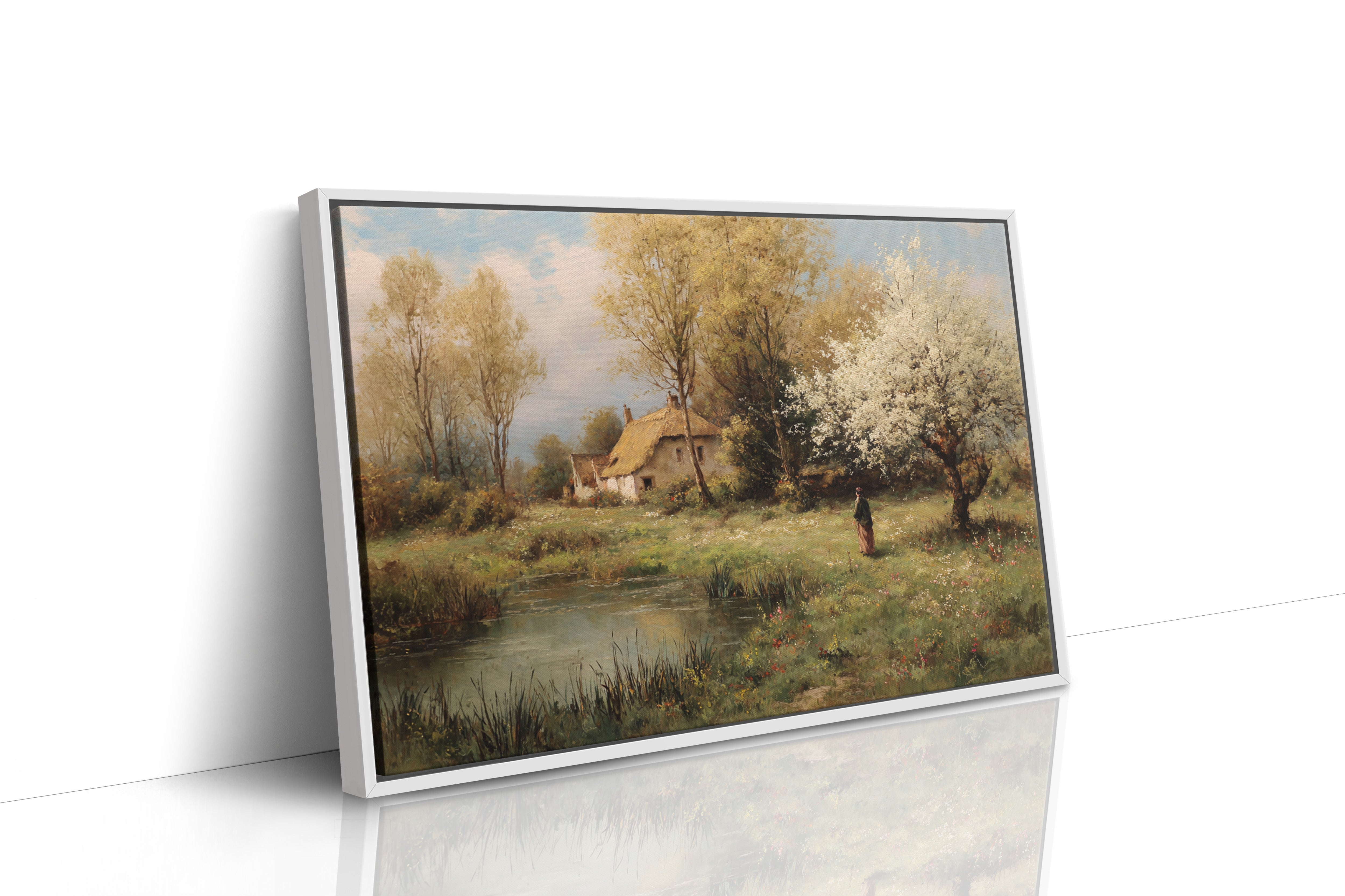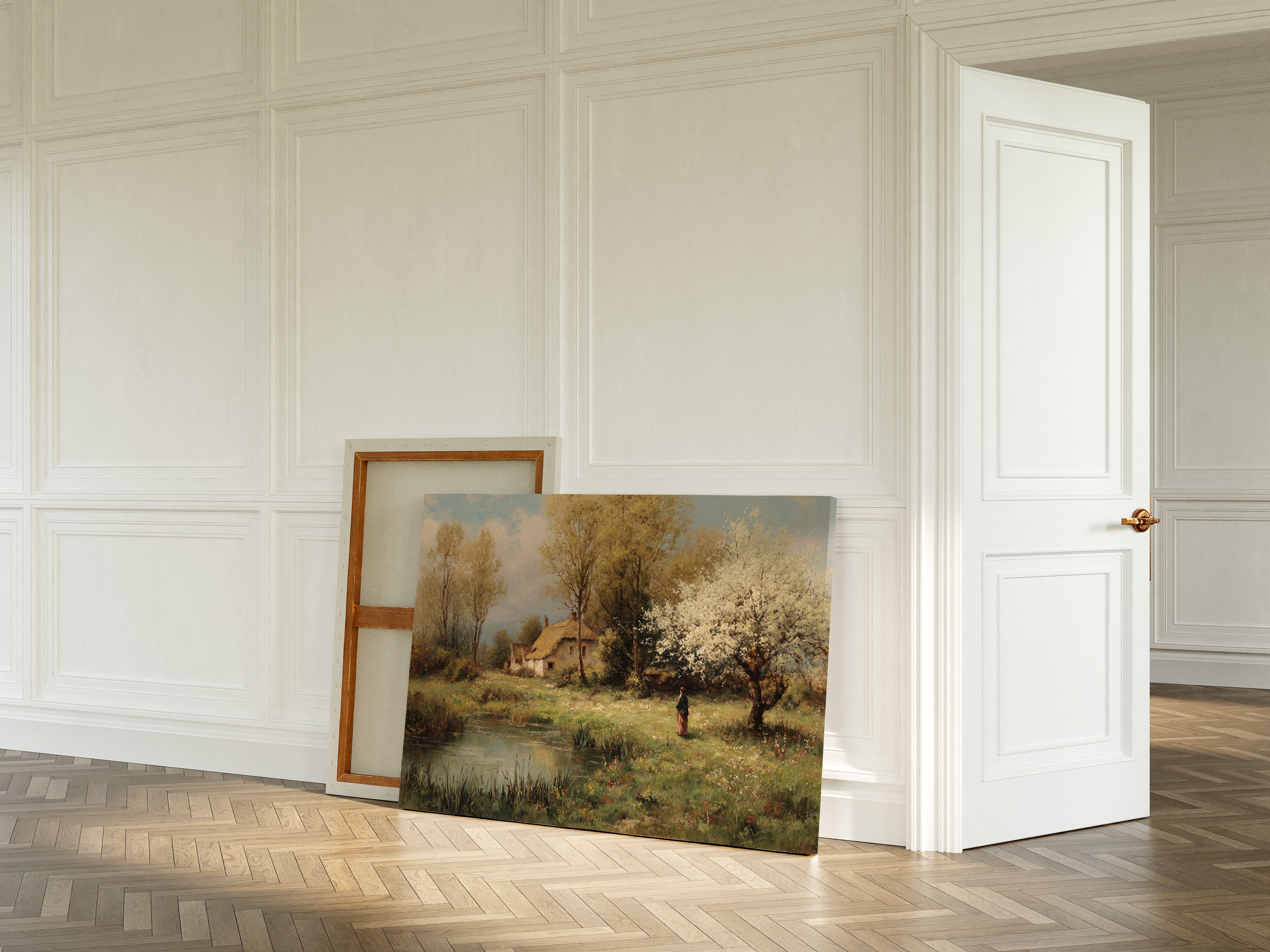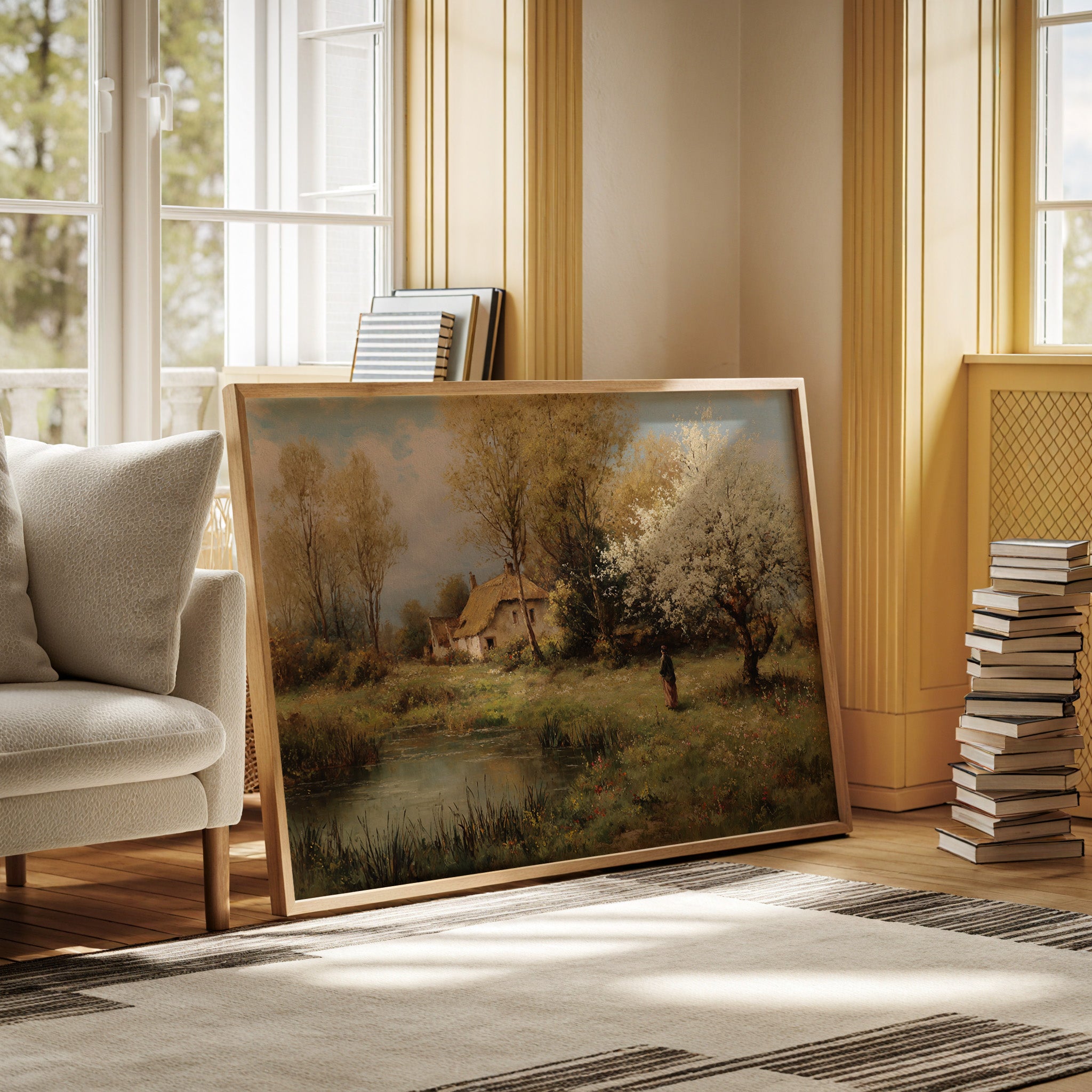 Sunlight filters through awakening trees, casting gentle shadows across a pastoral scene where time seems to move more slowly. A lone figure pauses along the pond's edge, surrounded by the first wildflowers of spring and the delicate white blossoms of a flowering tree. The thatched cottage nestles into the landscape, its weathered walls and rustic charm speaking to generations of simple country life. Golden afternoon light bathes the scene in warmth, while reeds stand sentinel at the water's edge, their reflection creating nature's own meditation. This tranquil scene would bring pastoral serenity to a reading nook or create a moment of peaceful contemplation in a bedroom sanctuary.