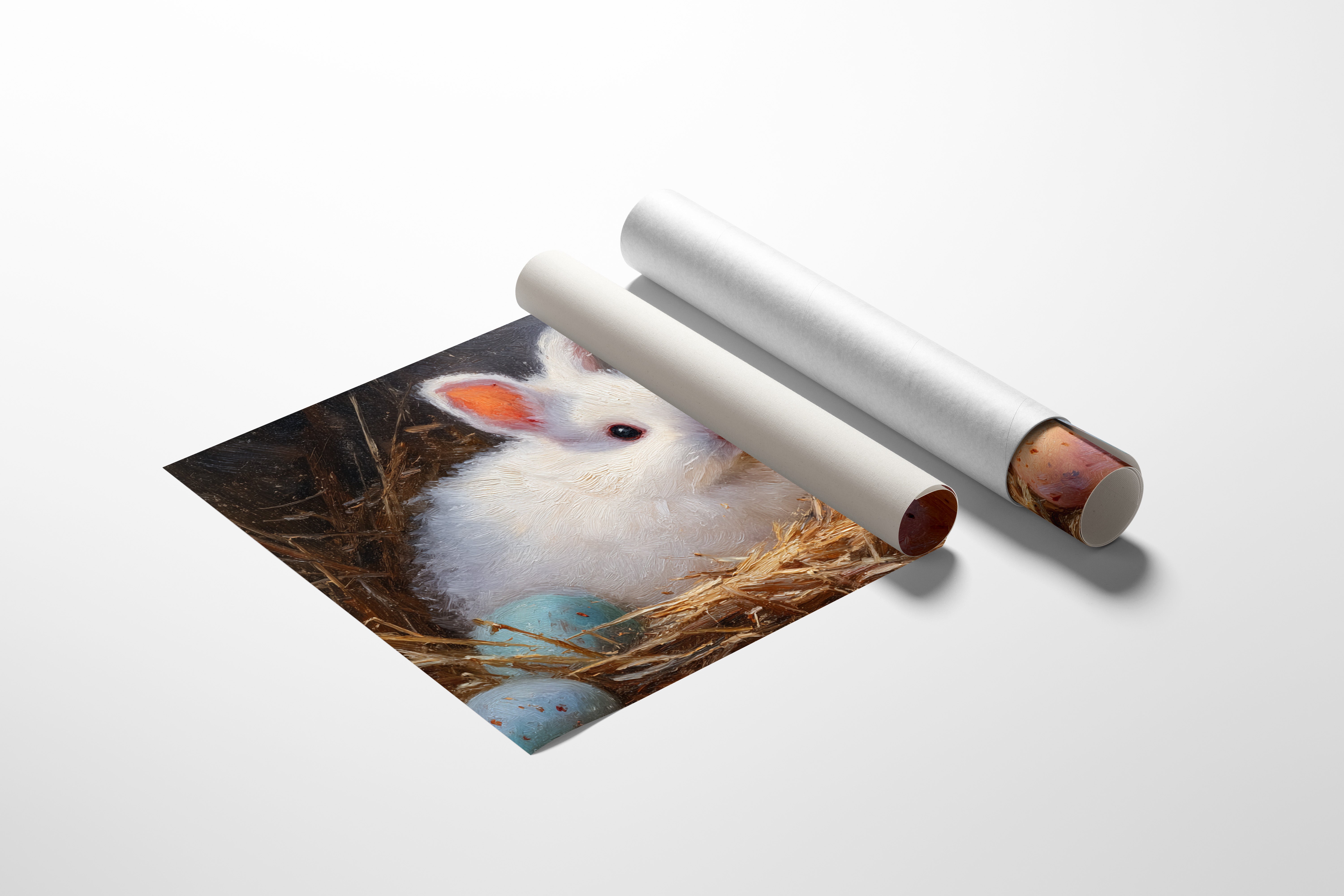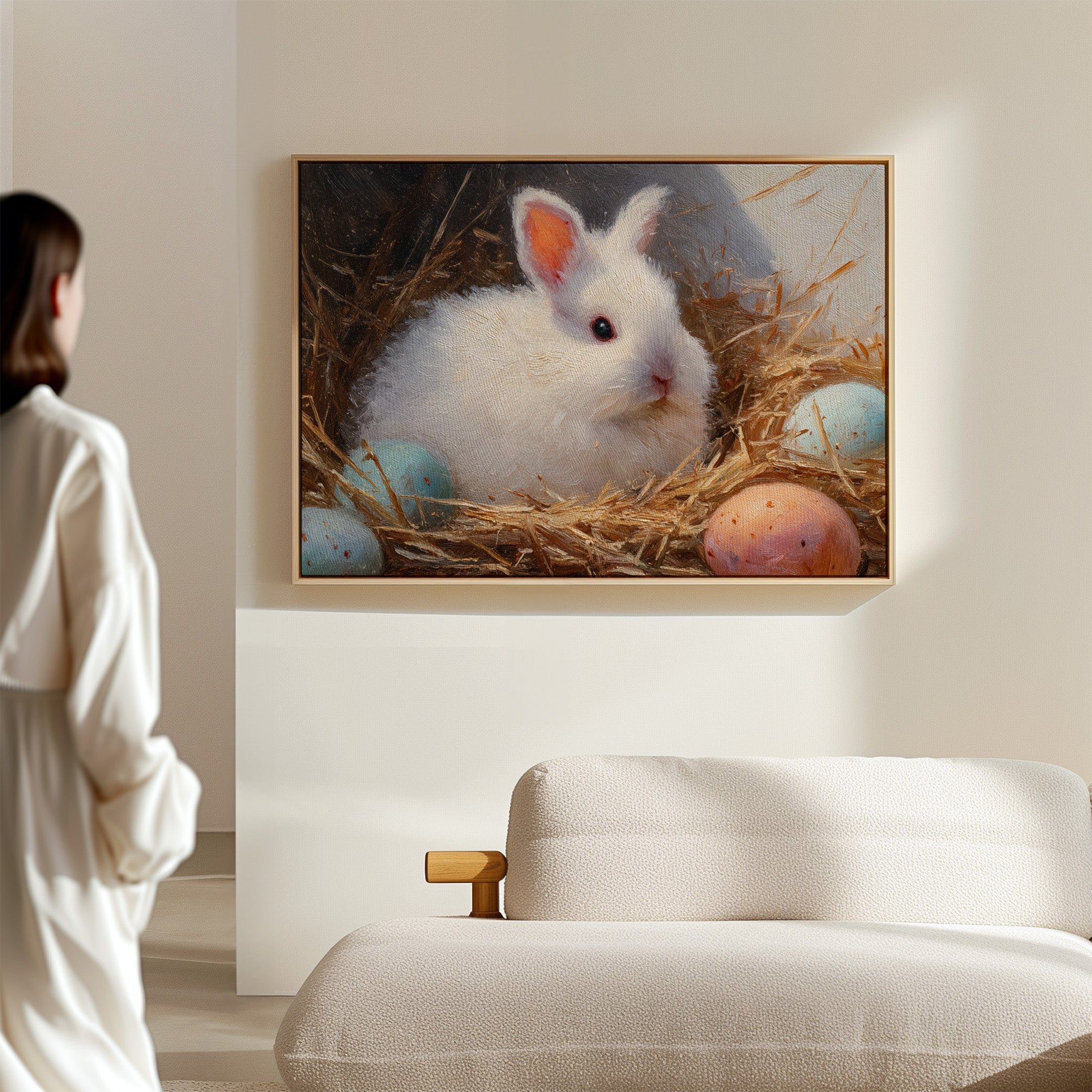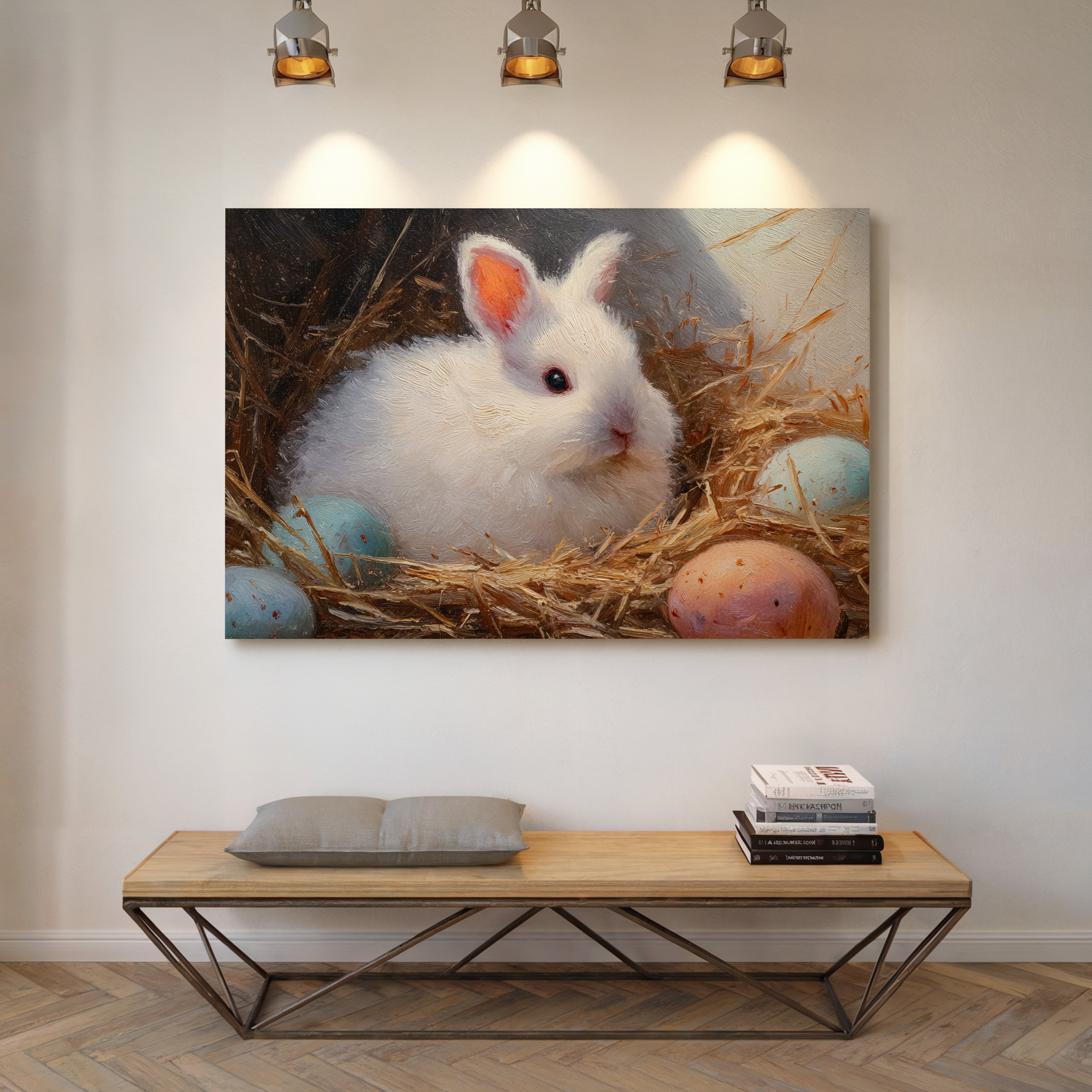 "A tender moment captured in soft brushstrokes, where innocence meets tradition in a nest of golden hay. The white bunny's fur glows with ethereal luminescence against the rustic backdrop, while pastel eggs in robin's egg blue and coral pink add whimsical touches of spring's promise. The delicate details - from the translucent pink ears to the alert black eyes - create an intimate portrait of countryside charm. This heartwarming scene would bring a touch of pastoral elegance to a child's room or add seasonal warmth to any space seeking a connection to nature's gentle rhythms.