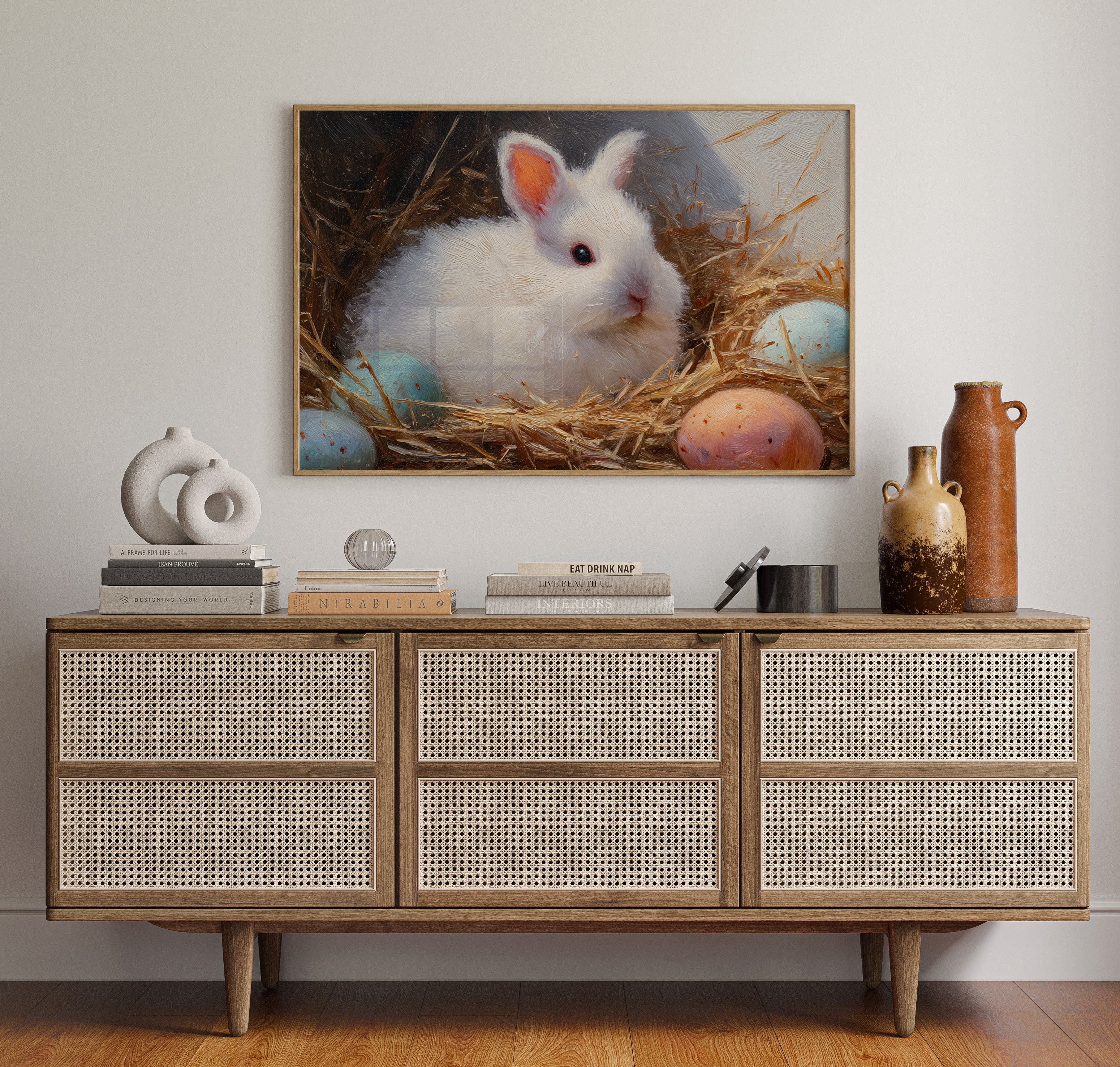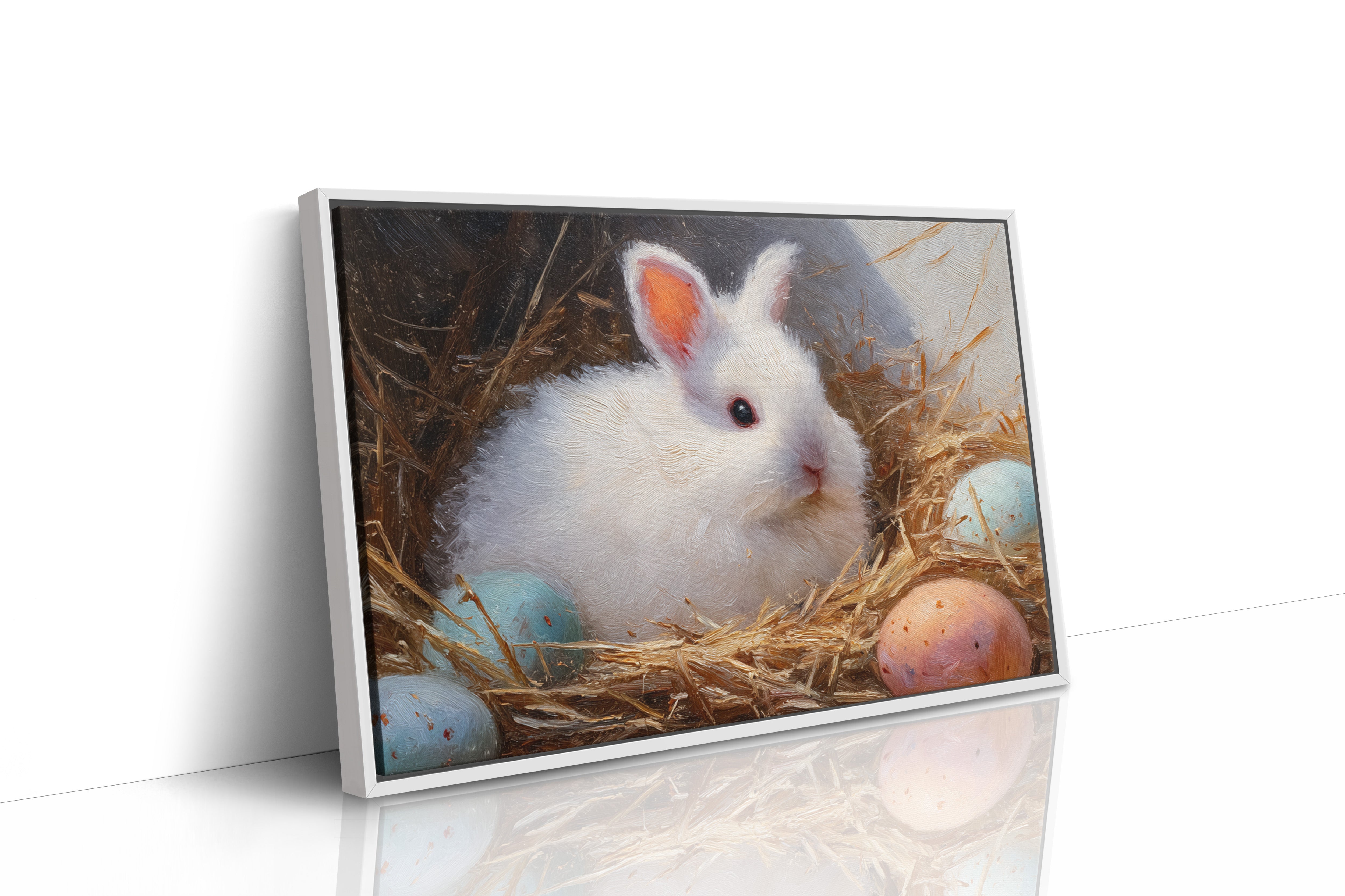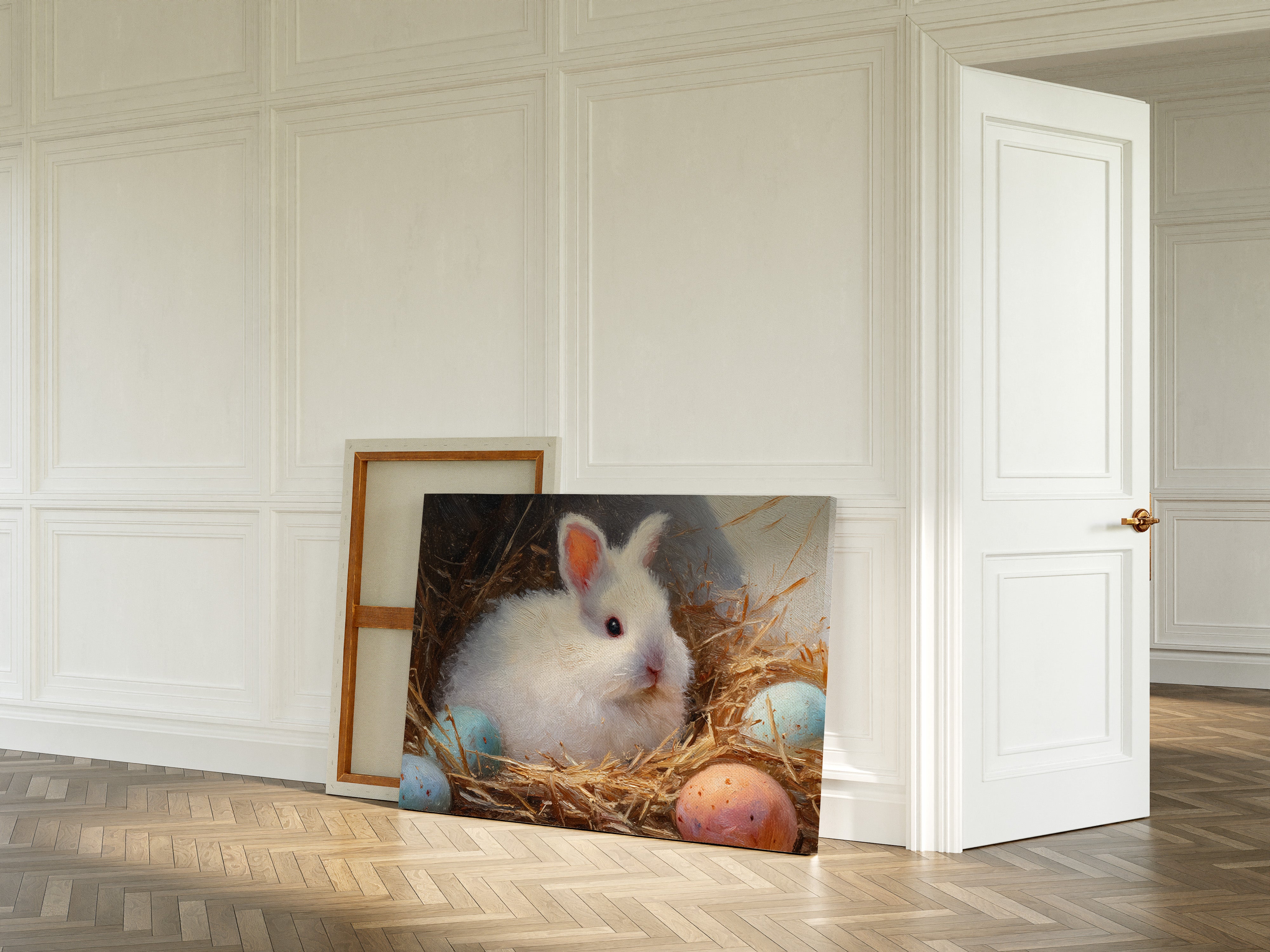 "A tender moment captured in soft brushstrokes, where innocence meets tradition in a nest of golden hay. The white bunny's fur glows with ethereal luminescence against the rustic backdrop, while pastel eggs in robin's egg blue and coral pink add whimsical touches of spring's promise. The delicate details - from the translucent pink ears to the alert black eyes - create an intimate portrait of countryside charm. This heartwarming scene would bring a touch of pastoral elegance to a child's room or add seasonal warmth to any space seeking a connection to nature's gentle rhythms.