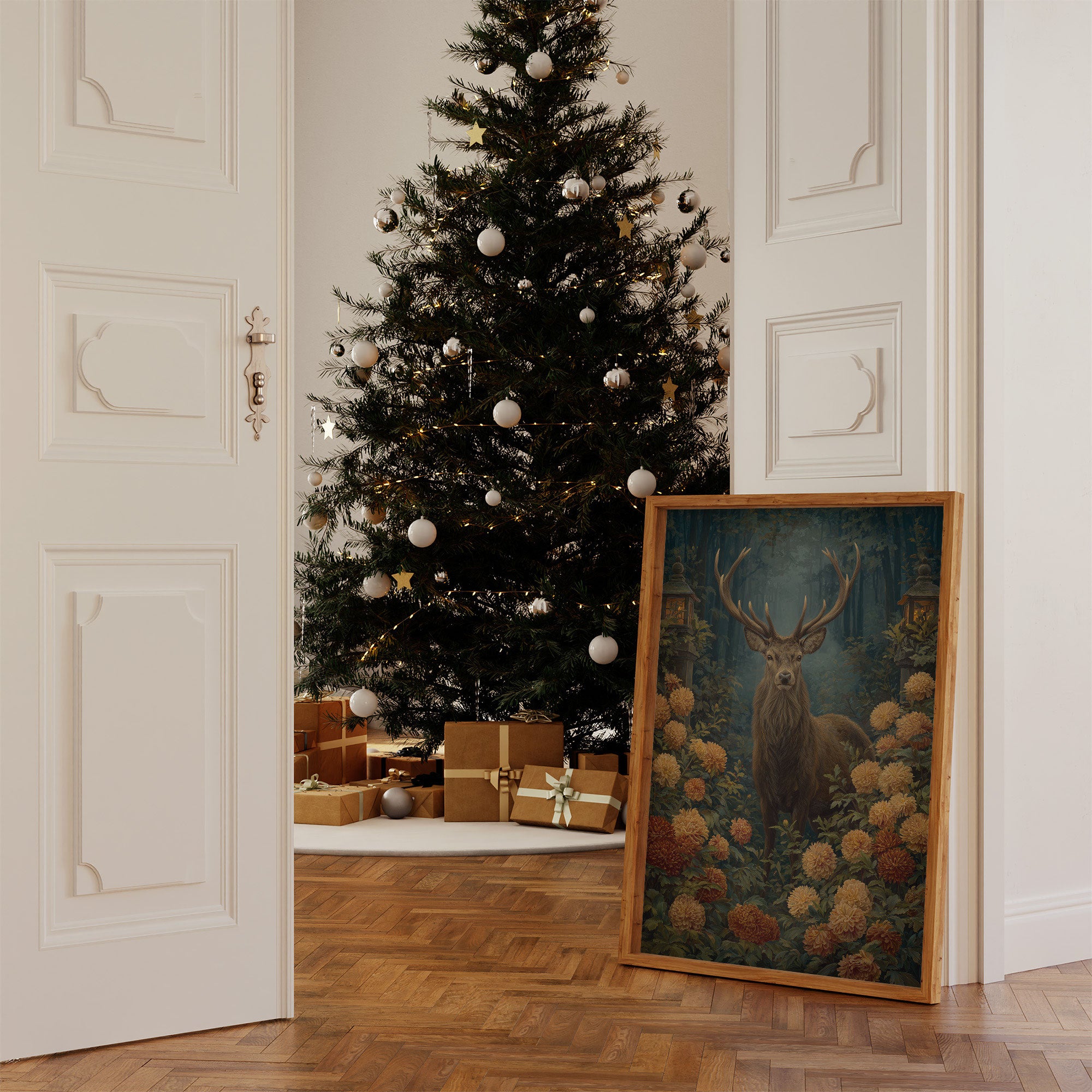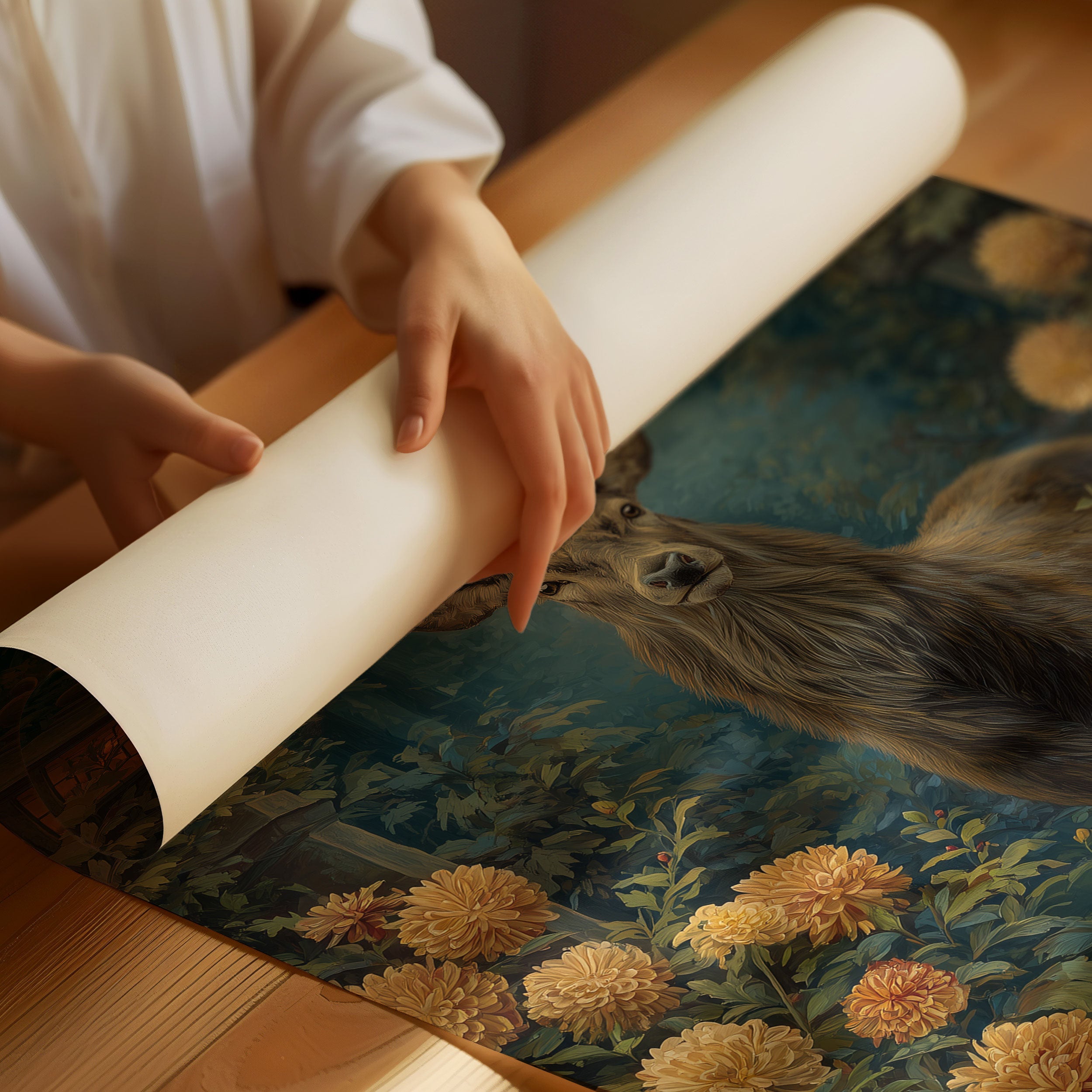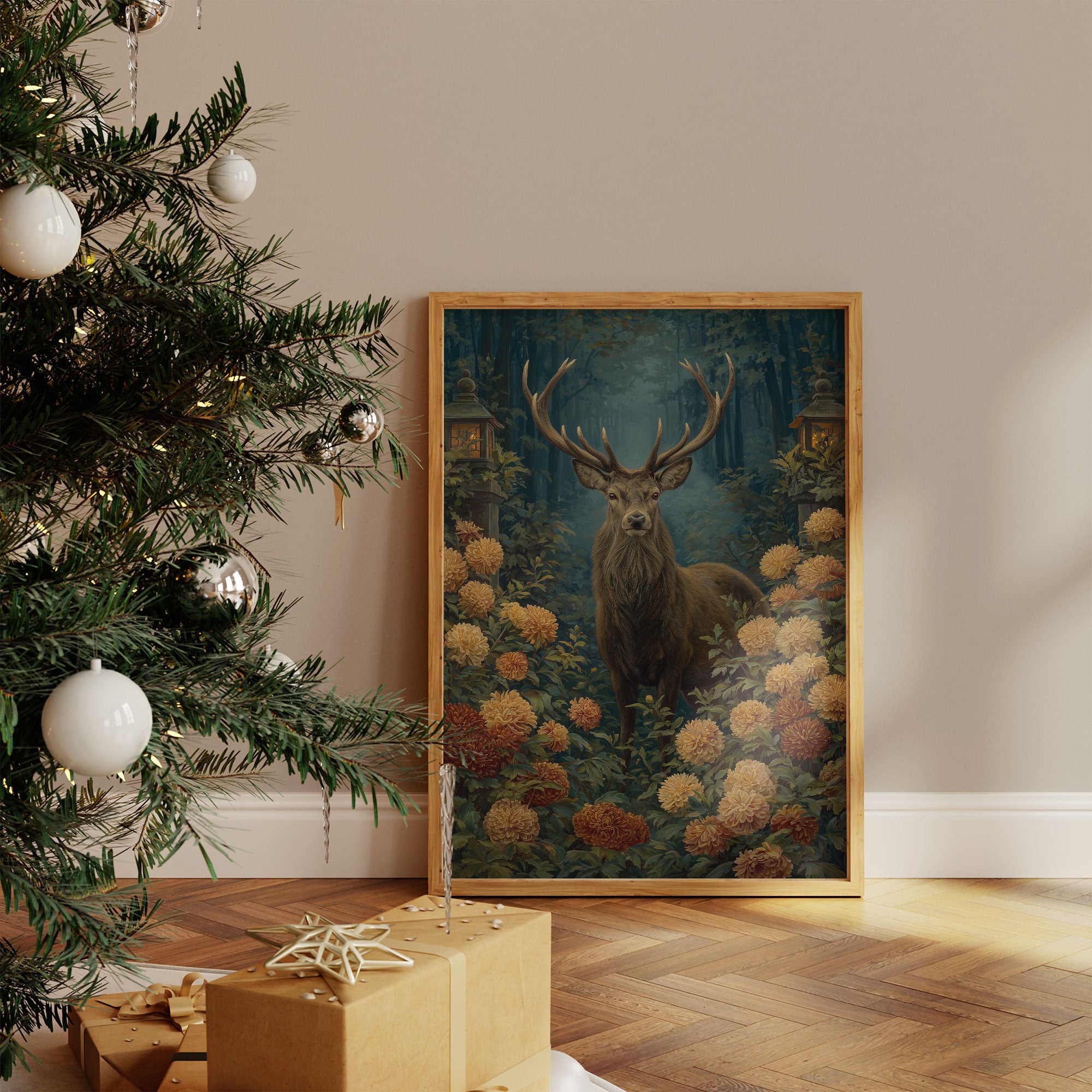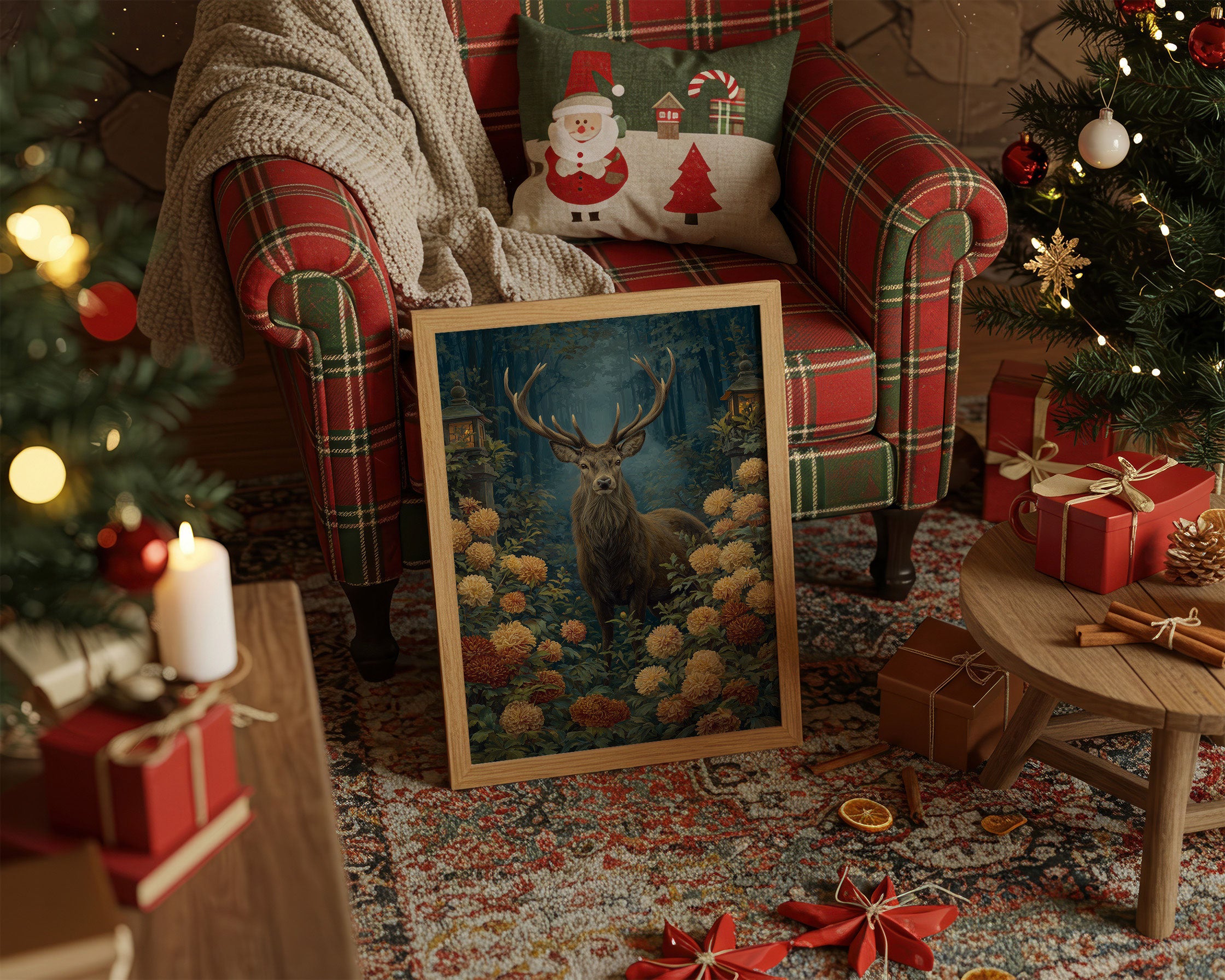 A majestic stag stands amid a mystical garden, surrounded by blooming golden chrysanthemums that seem to illuminate the dusky forest setting. Deep teal shadows dance through ancient trees, while hanging lanterns cast a gentle glow across the scene. The deer's proud antlers reach skyward like natural crown, while autumn flowers create a royal garden worthy of this forest sovereign. This enchanting piece brings an air of woodland magic to any space, perfect for a study, reading nook, or dining room where its rich colors and dreamy atmosphere can inspire contemplative moments.