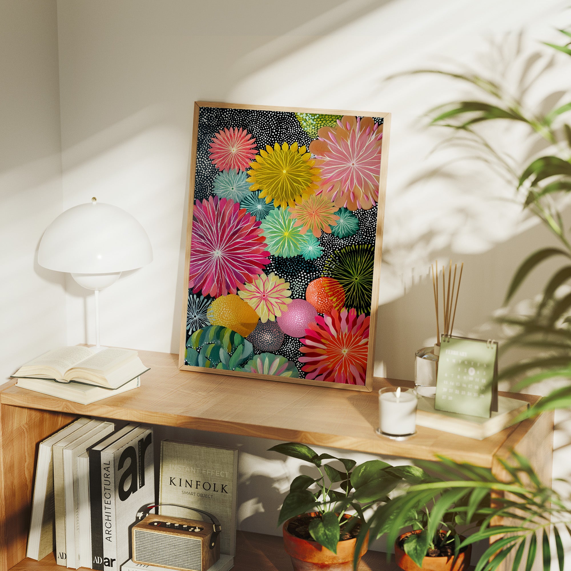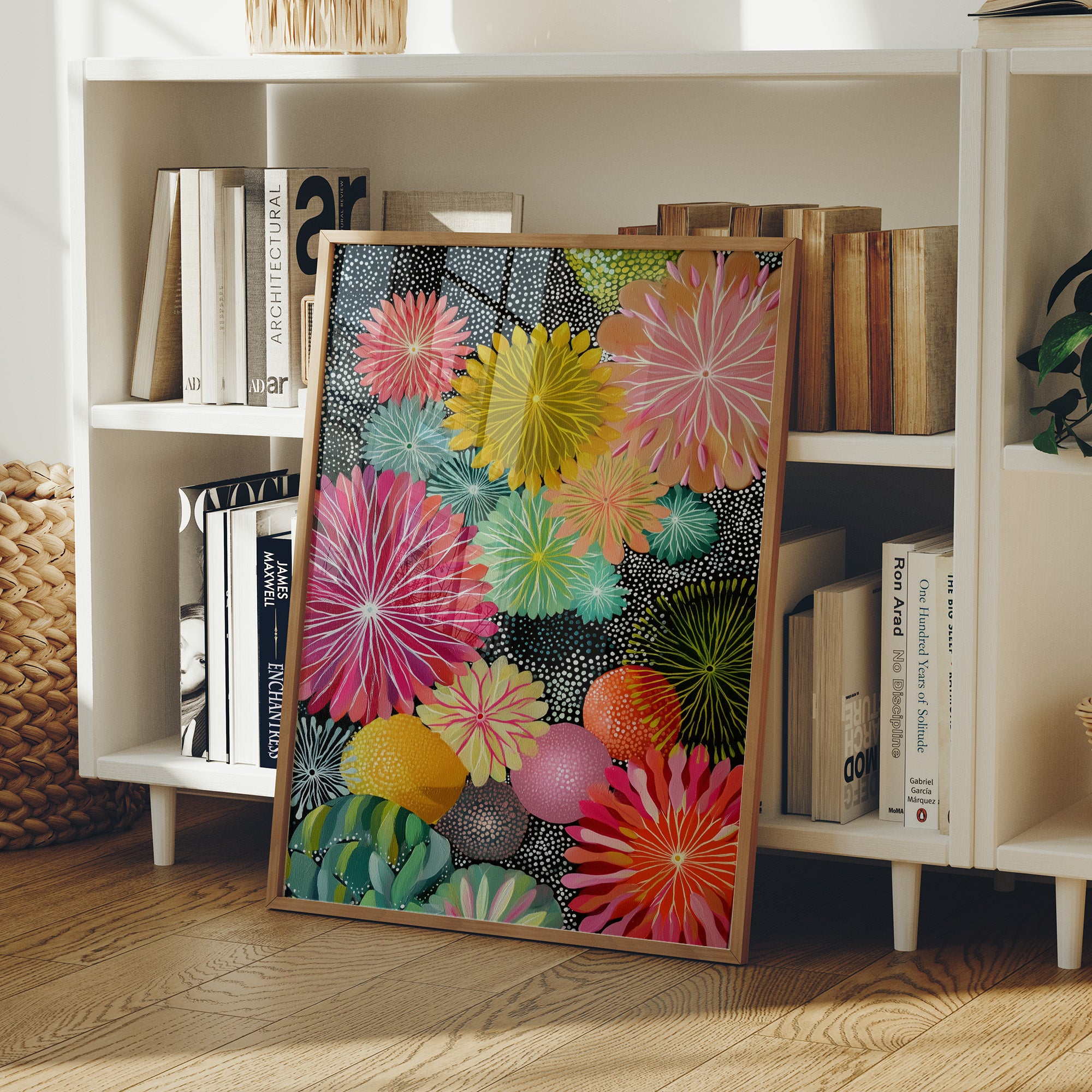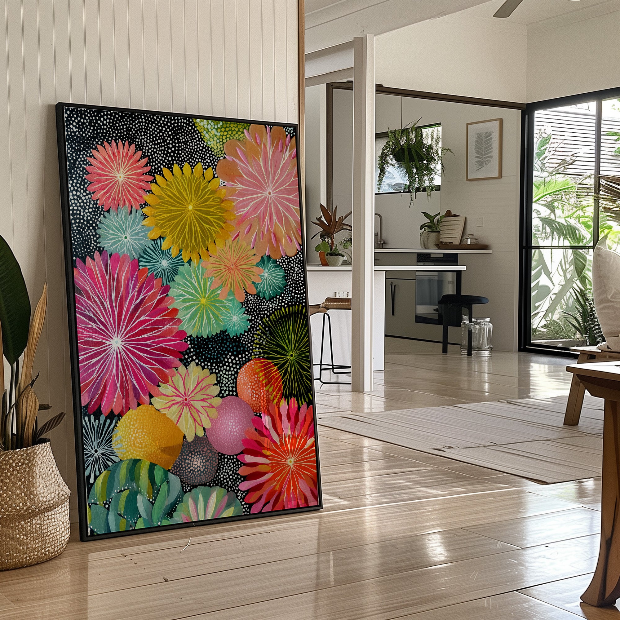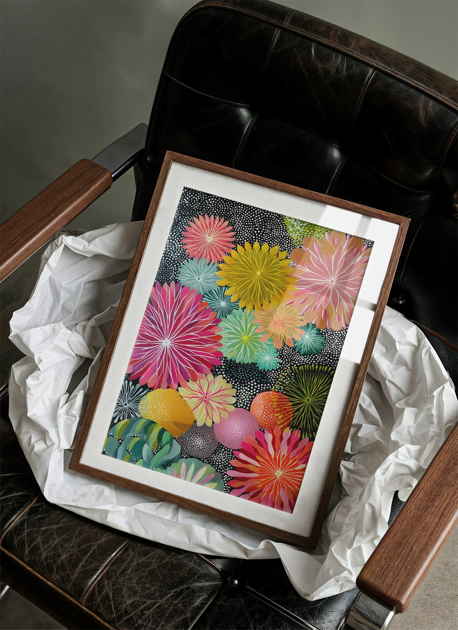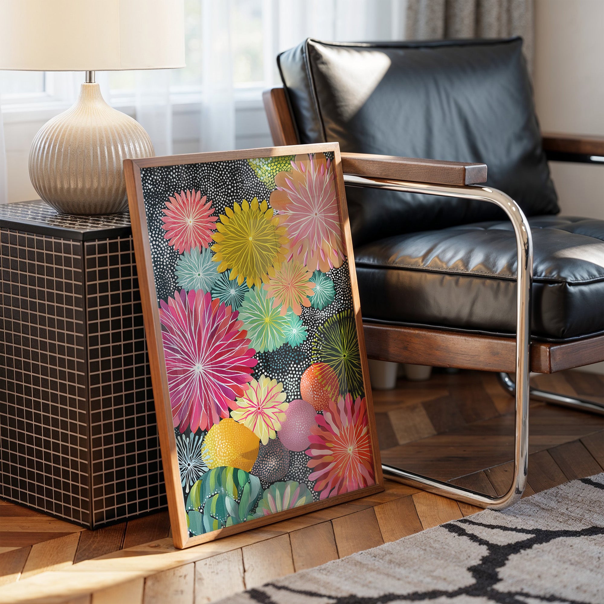 Vibrant chrysanthemum-like blooms burst across a starlit black canvas, creating a joyful celebration of color and pattern. Each flower radiates with its own personality - coral pinks, sunny yellows, and mint greens interweave while delicate white dots create a magical, cosmic atmosphere. The composition feels both modern and timeless, like a garden viewed through a kaleidoscope at midnight. This piece would bring an energetic focal point to a modern home office or creative studio, where its playful spirit can inspire imagination and creative thinking.