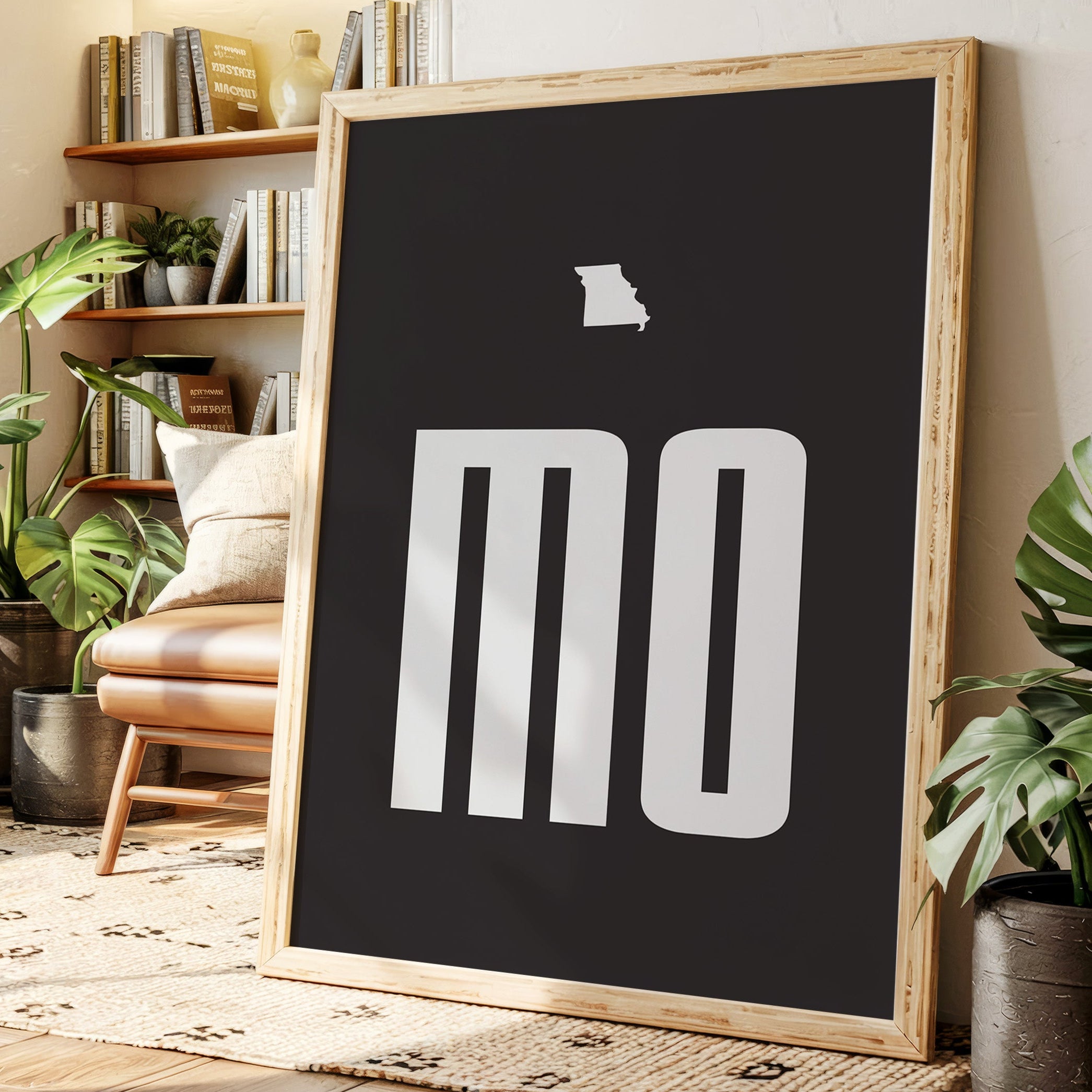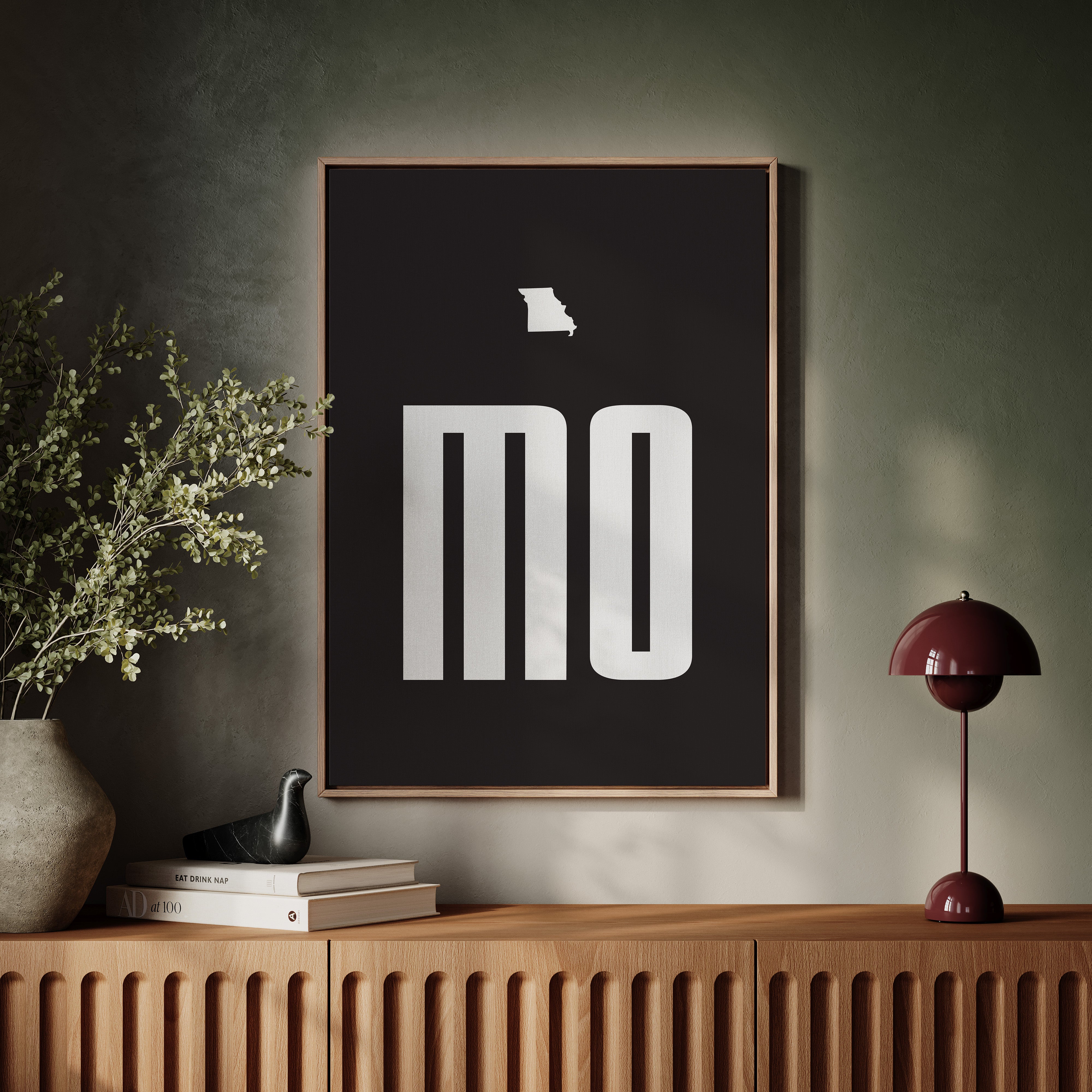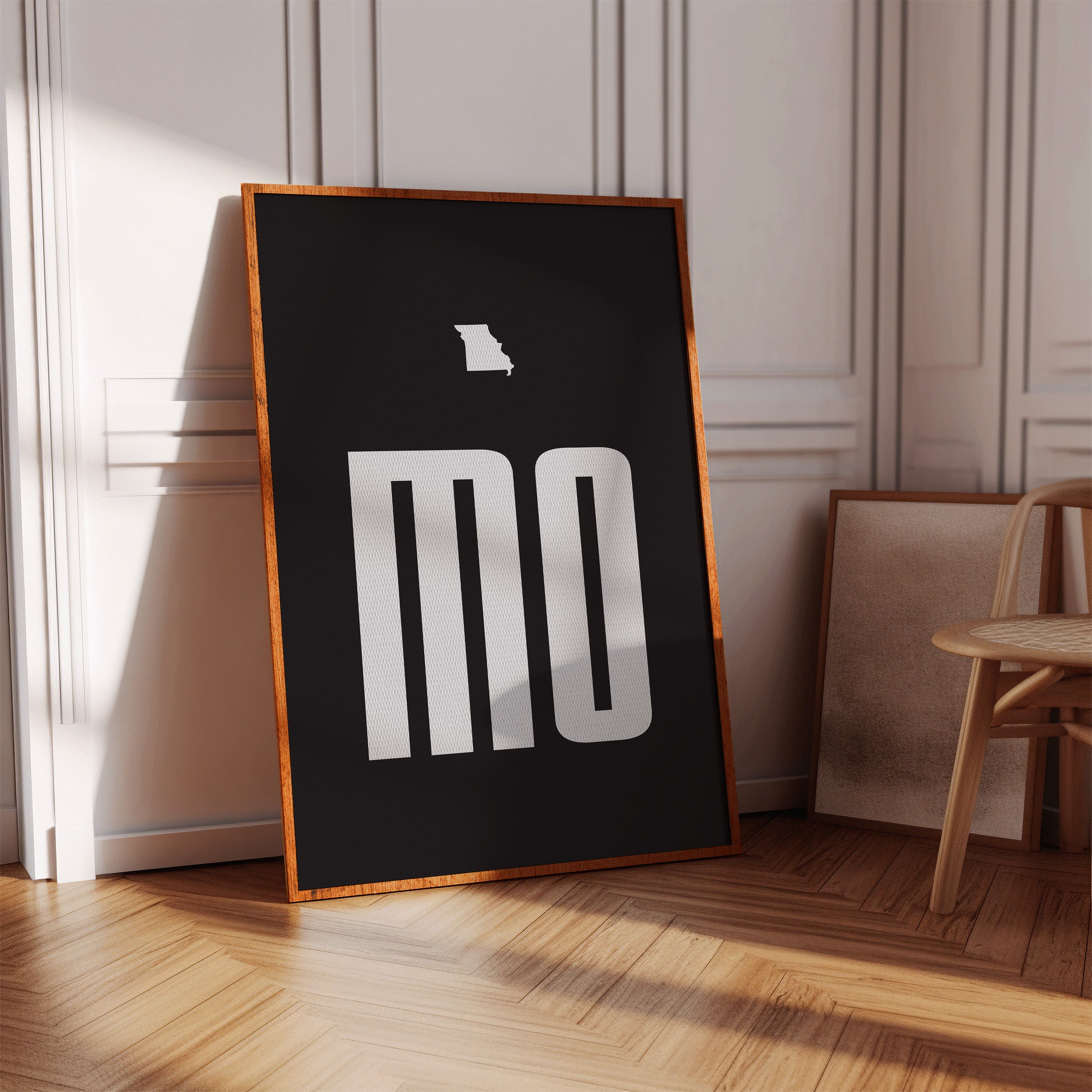 A bold minimalist design emerges from darkness, where crisp white letters ""MO"" stand sentinel against a deep black background. Above them, the distinctive shape of Missouri hovers like a watchful guardian of the heartland. The stark contrast creates a powerful visual statement that speaks to both place and identity. The geometric precision of the typography plays against the organic edges of the state outline, creating a compelling dialogue between form and space. This piece captures the essence of modern design while paying homage to geographic heritage. This striking composition would command attention in a modern office space or add sophisticated contrast to a contemporary living room's gallery wall.