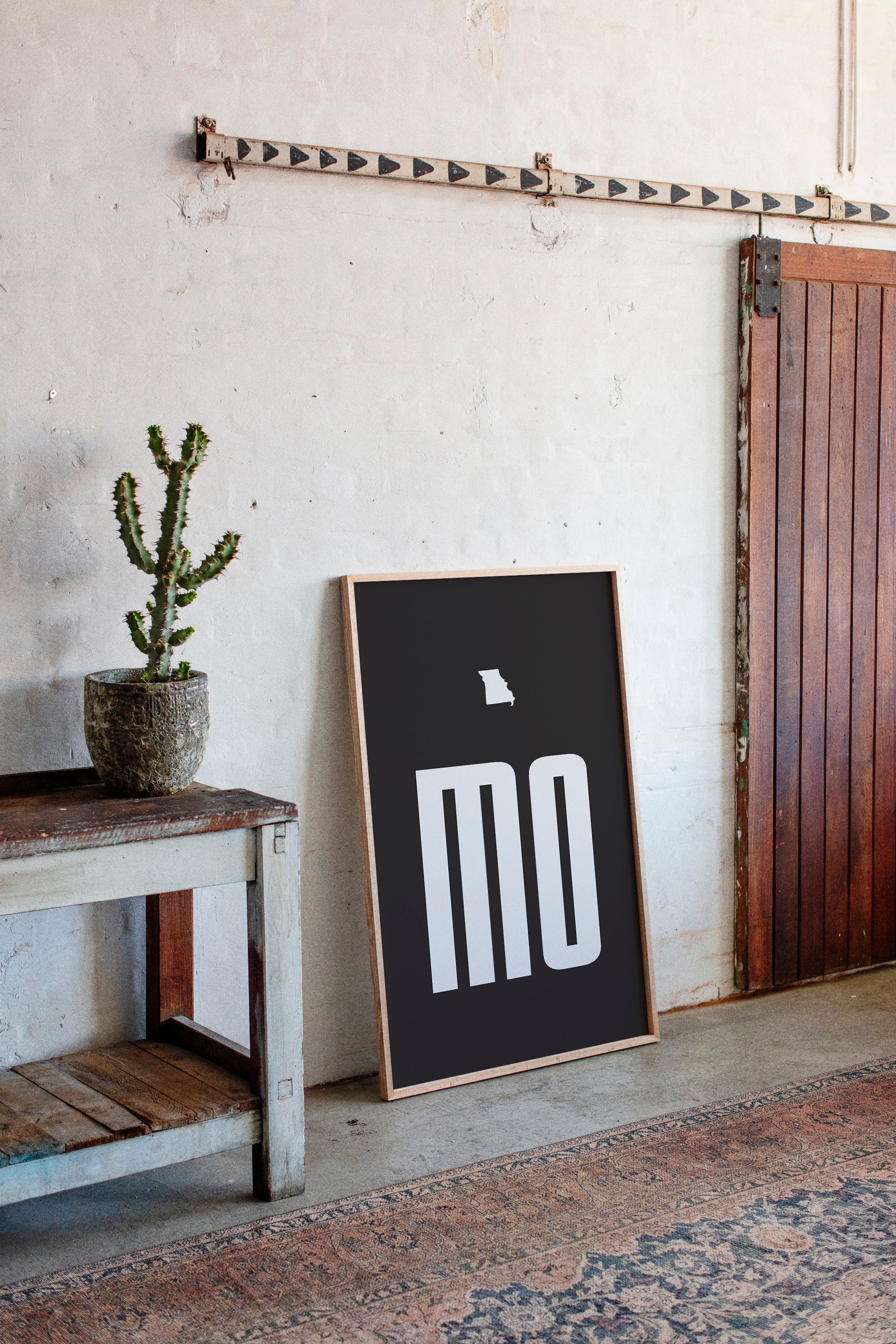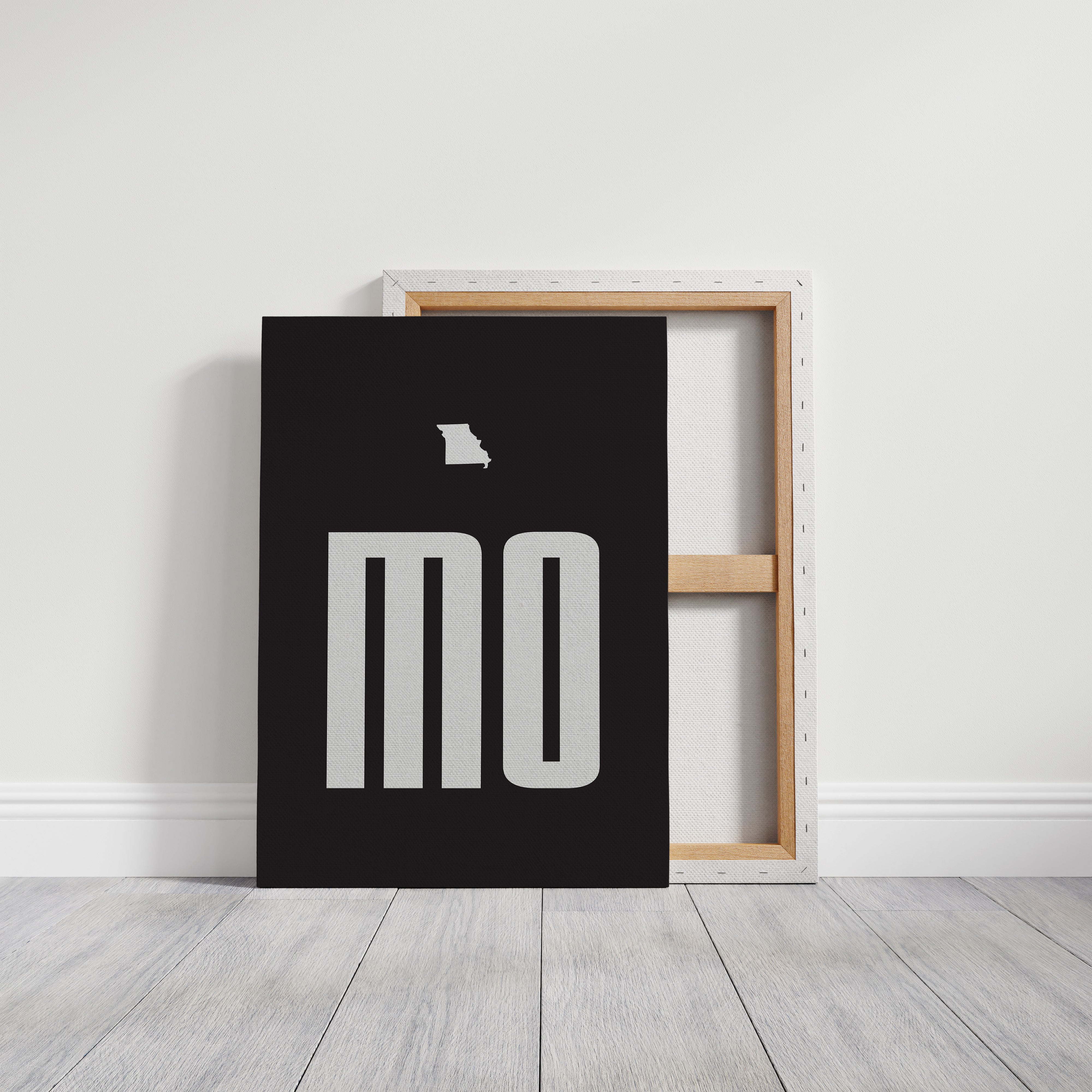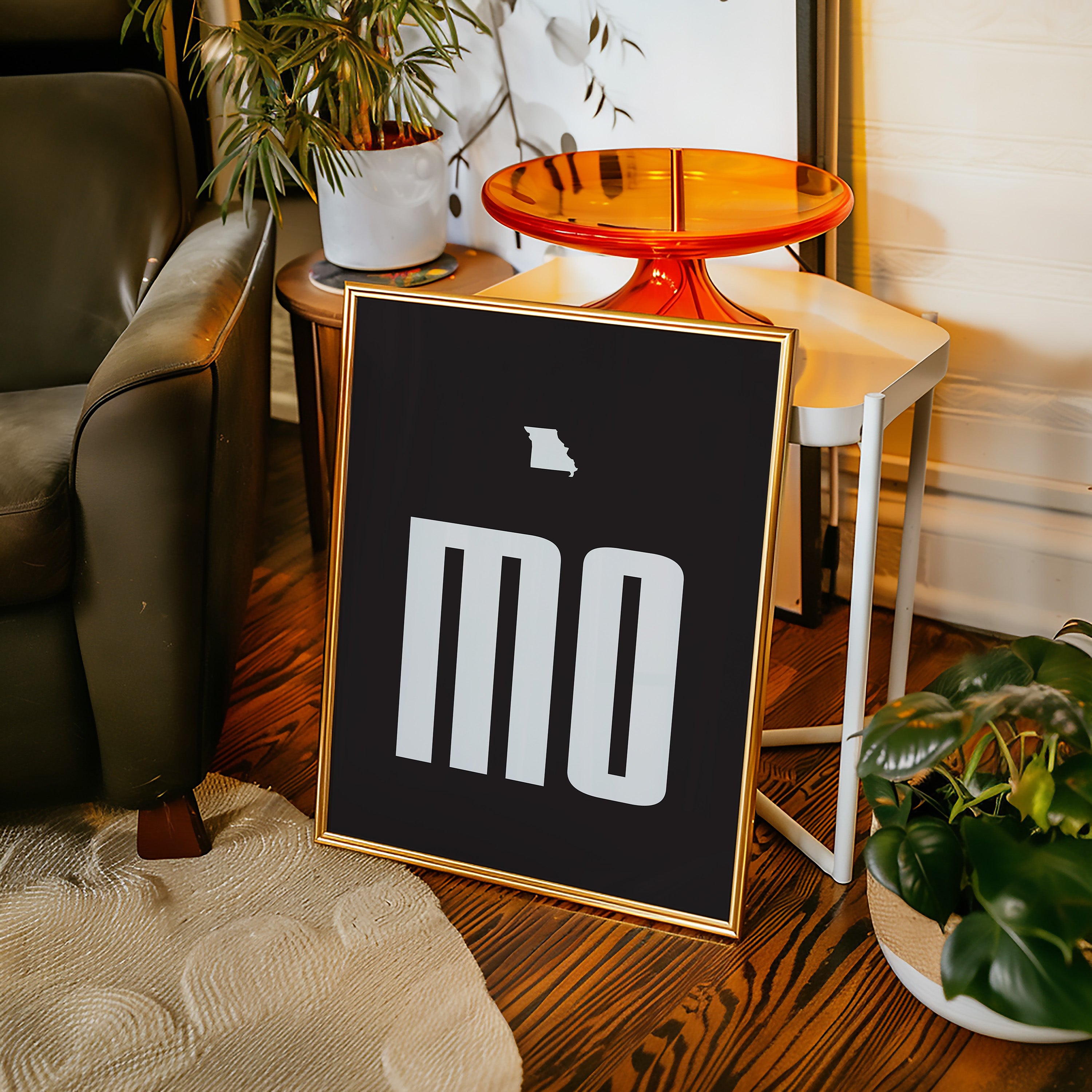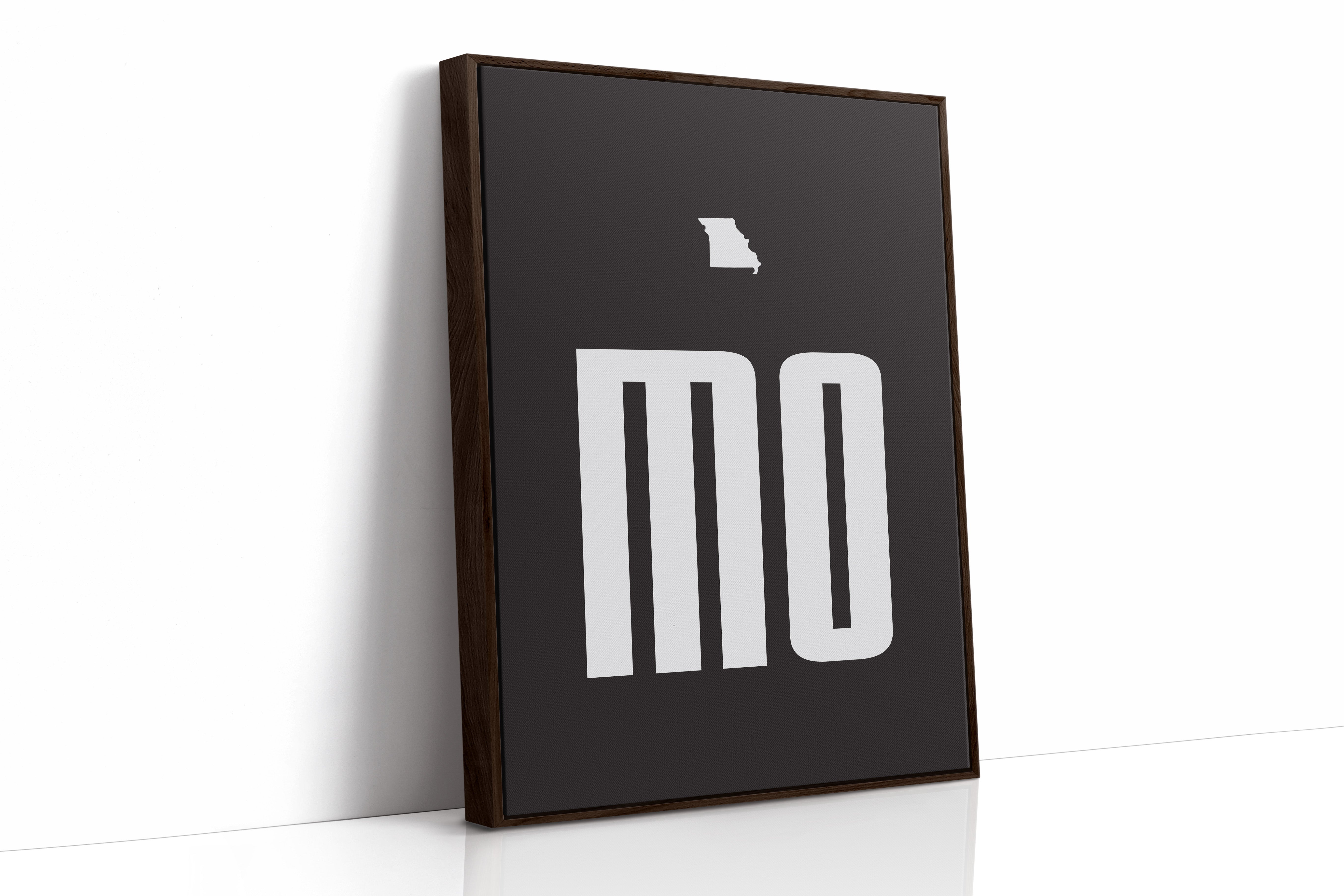 A bold minimalist design emerges from darkness, where crisp white letters ""MO"" stand sentinel against a deep black background. Above them, the distinctive shape of Missouri hovers like a watchful guardian of the heartland. The stark contrast creates a powerful visual statement that speaks to both place and identity. The geometric precision of the typography plays against the organic edges of the state outline, creating a compelling dialogue between form and space. This piece captures the essence of modern design while paying homage to geographic heritage. This striking composition would command attention in a modern office space or add sophisticated contrast to a contemporary living room's gallery wall.