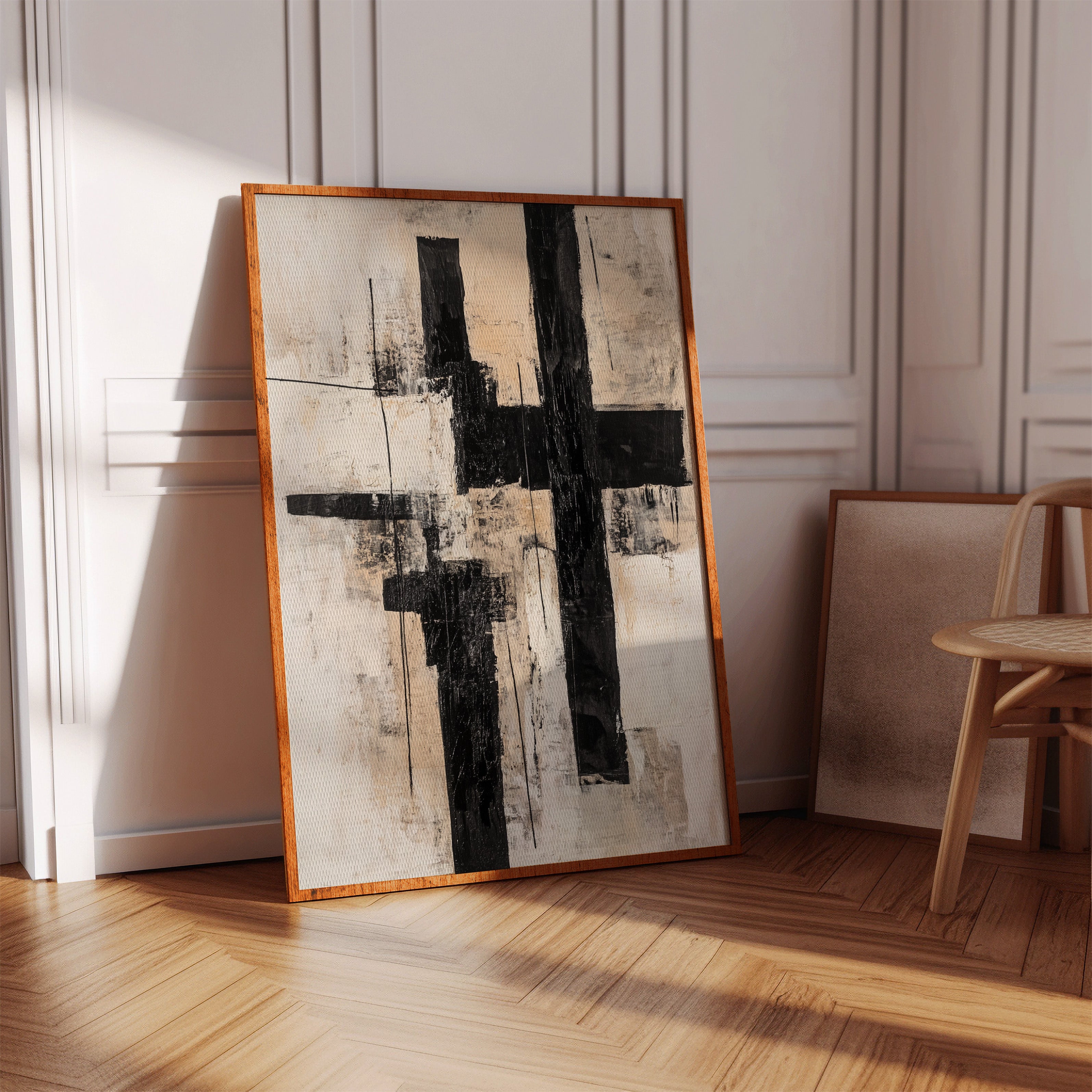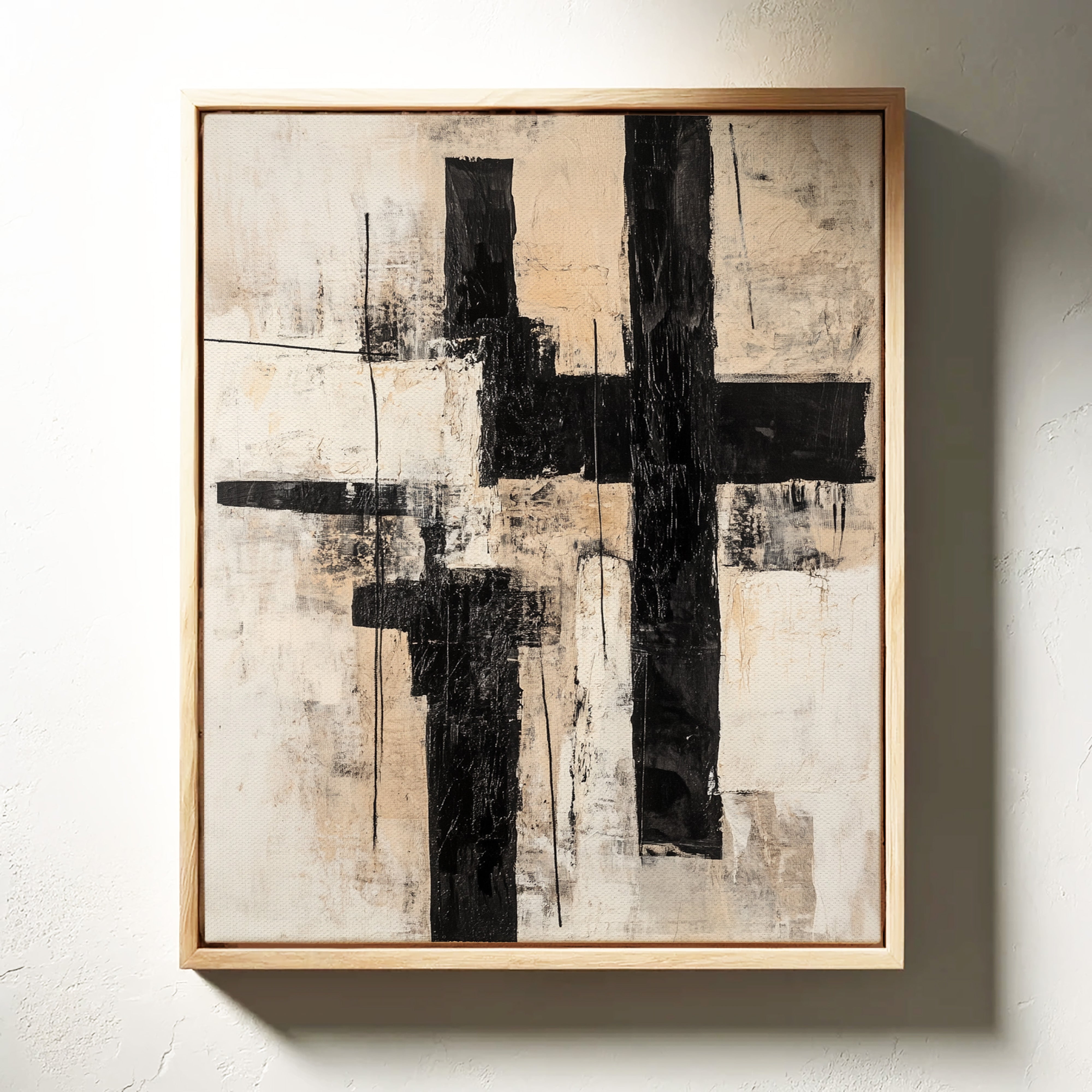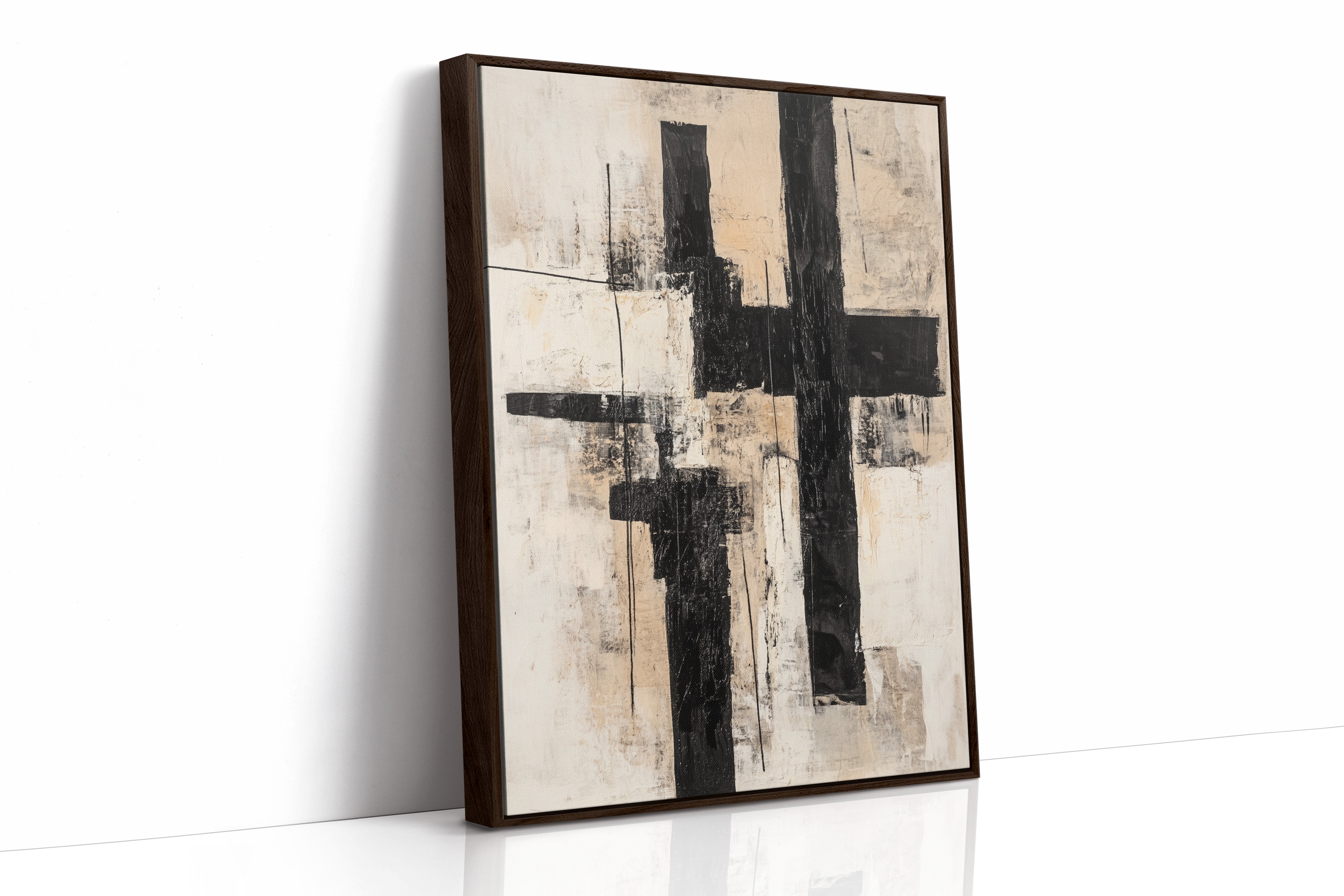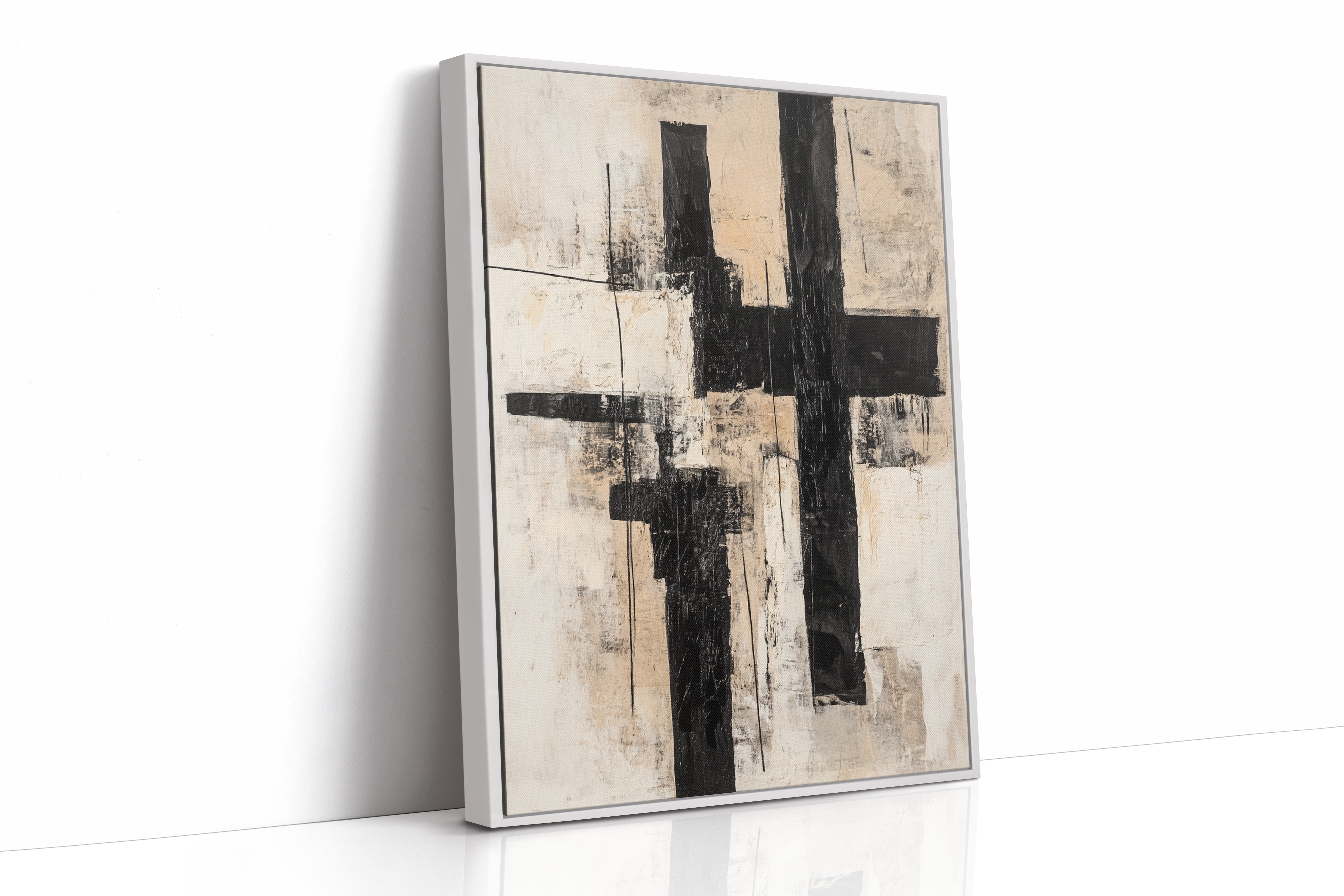 Bold strokes of midnight black slice through a canvas of weathered ivory, creating a dramatic interplay of light and shadow. The composition speaks of urban geometry and architectural forms, with rough-hewn textures that suggest concrete and steel. Deep ebony shapes command attention against the textured background, while subtle variations in the cream tones add depth and movement. This contemporary piece would bring sophisticated drama to a minimal modern space, acting as a powerful focal point in an entry hall or above a sleek console.