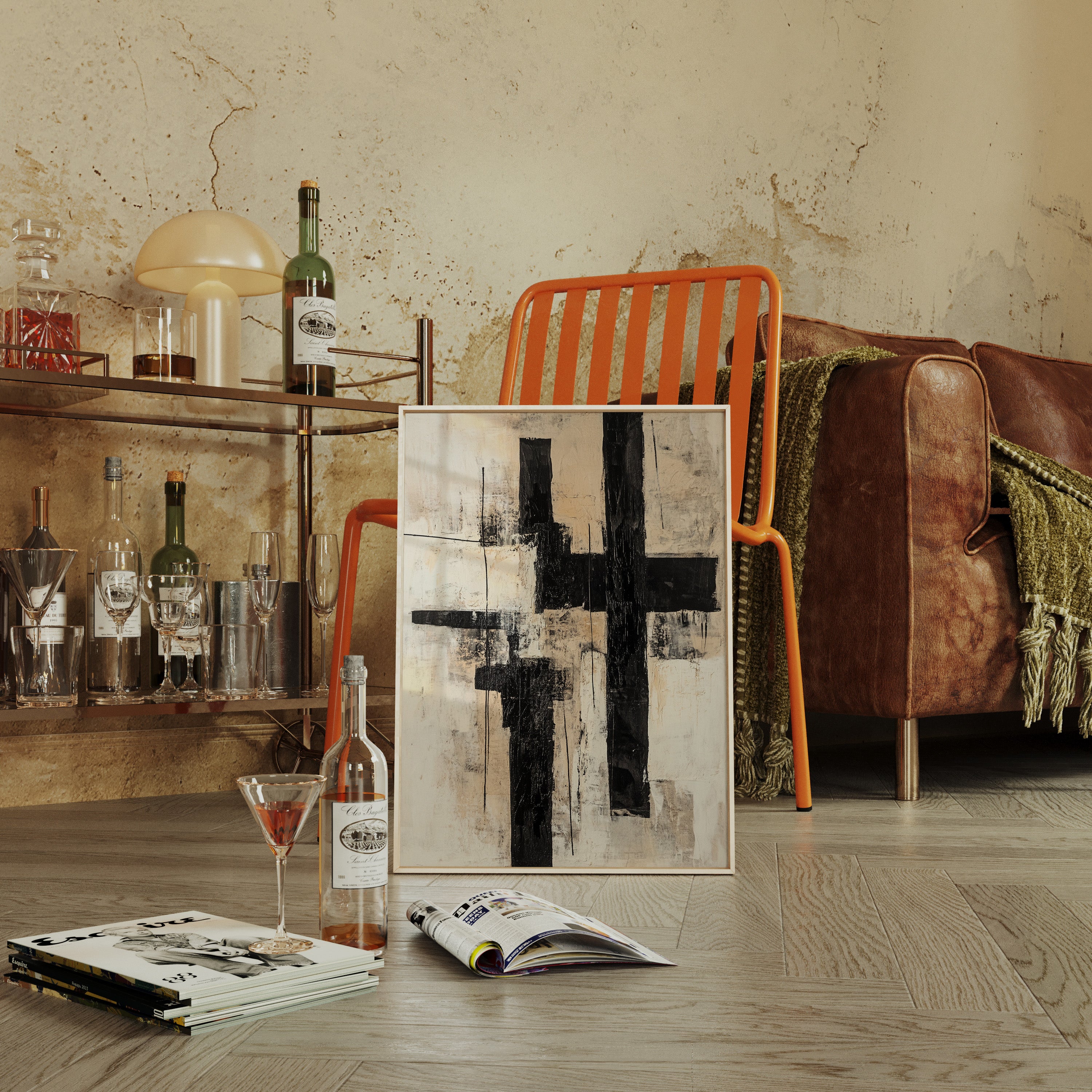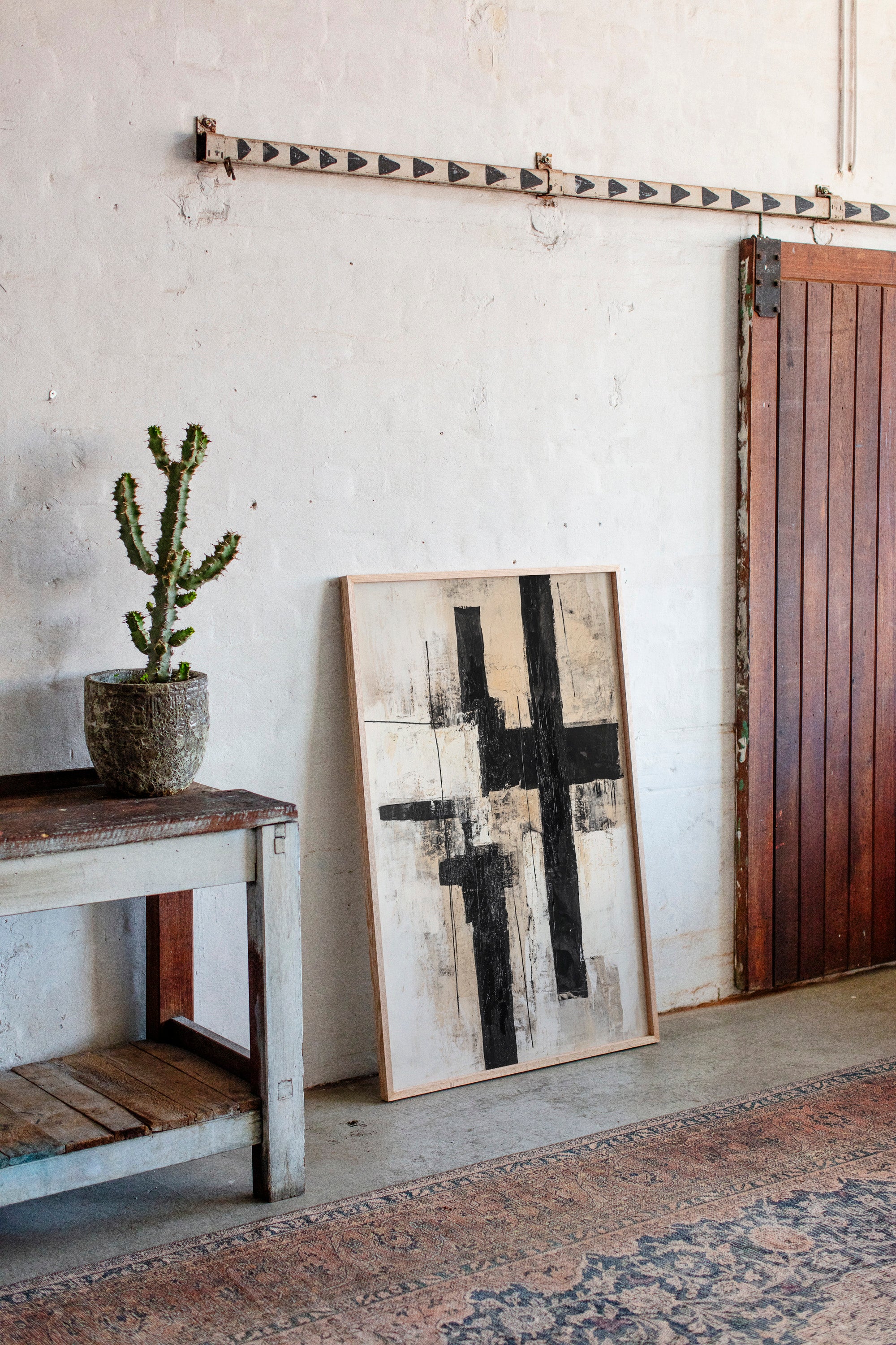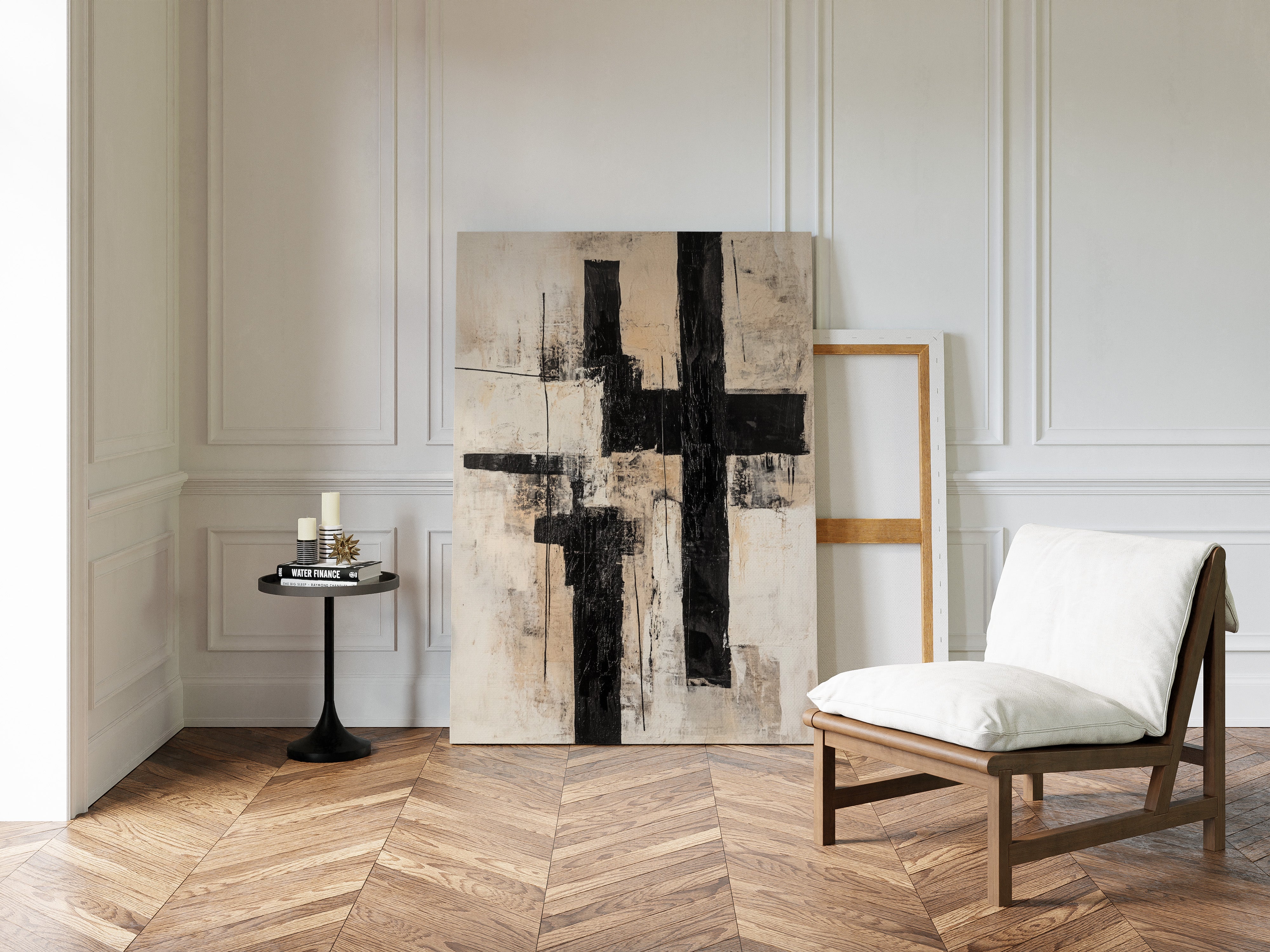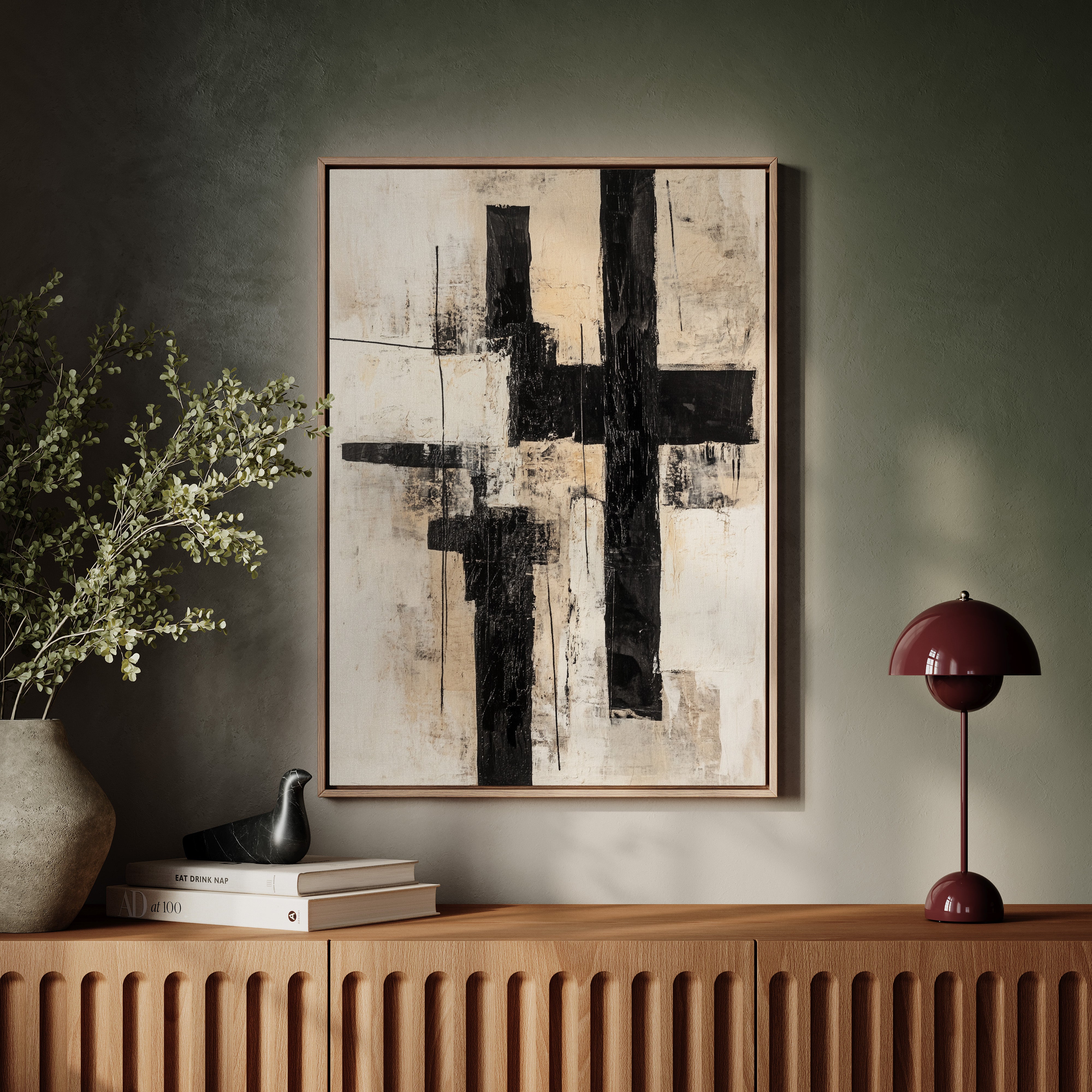 Bold strokes of midnight black slice through a canvas of weathered ivory, creating a dramatic interplay of light and shadow. The composition speaks of urban geometry and architectural forms, with rough-hewn textures that suggest concrete and steel. Deep ebony shapes command attention against the textured background, while subtle variations in the cream tones add depth and movement. This contemporary piece would bring sophisticated drama to a minimal modern space, acting as a powerful focal point in an entry hall or above a sleek console.