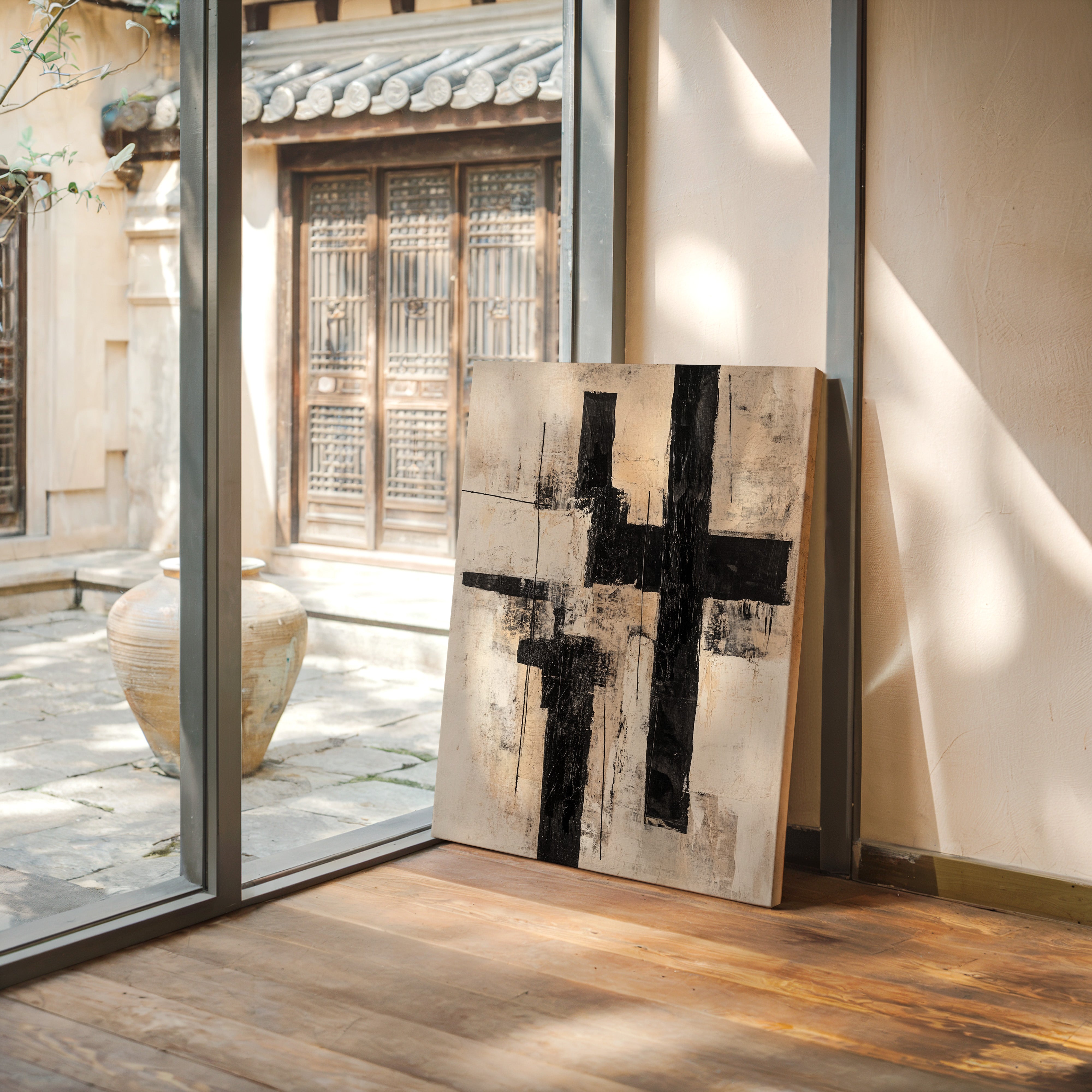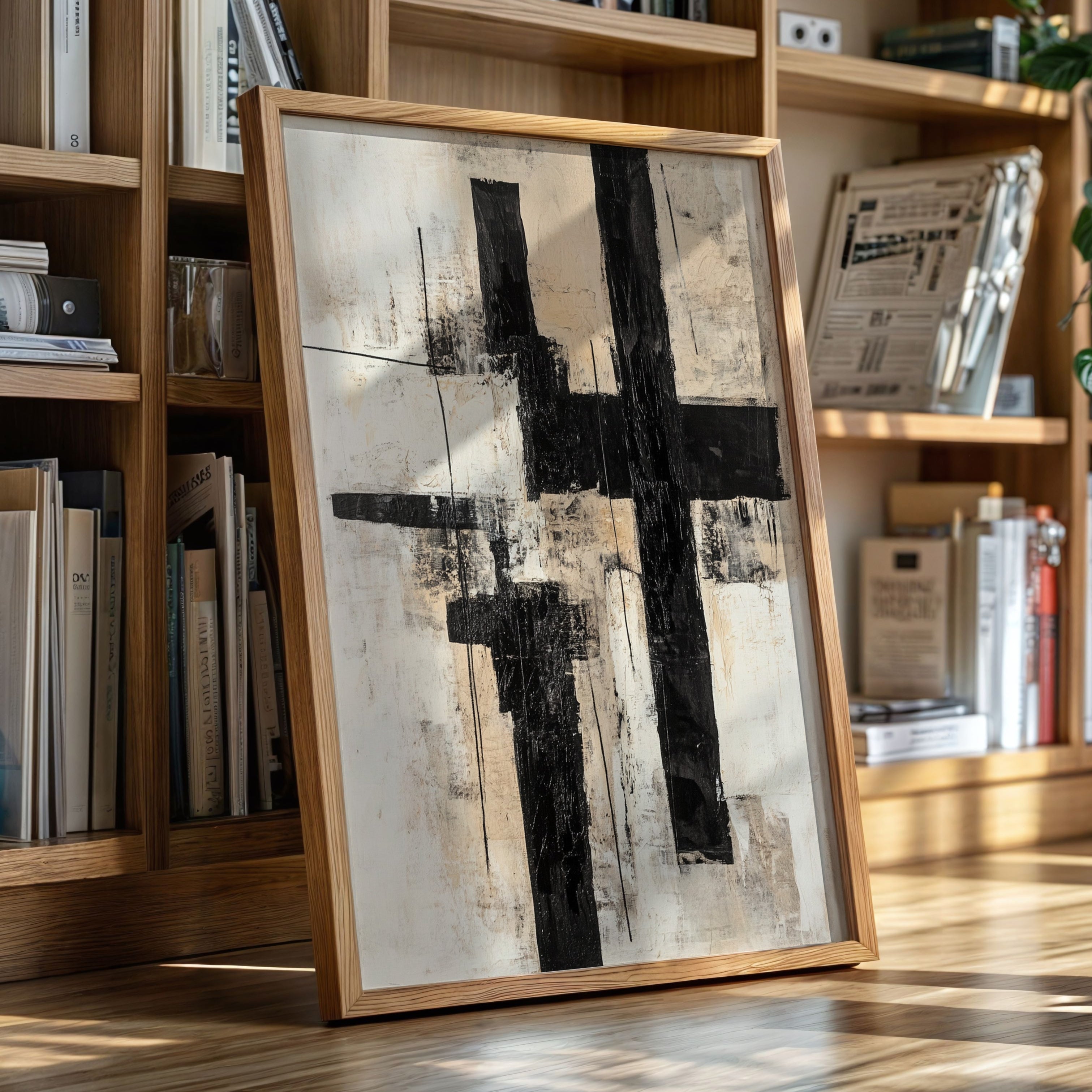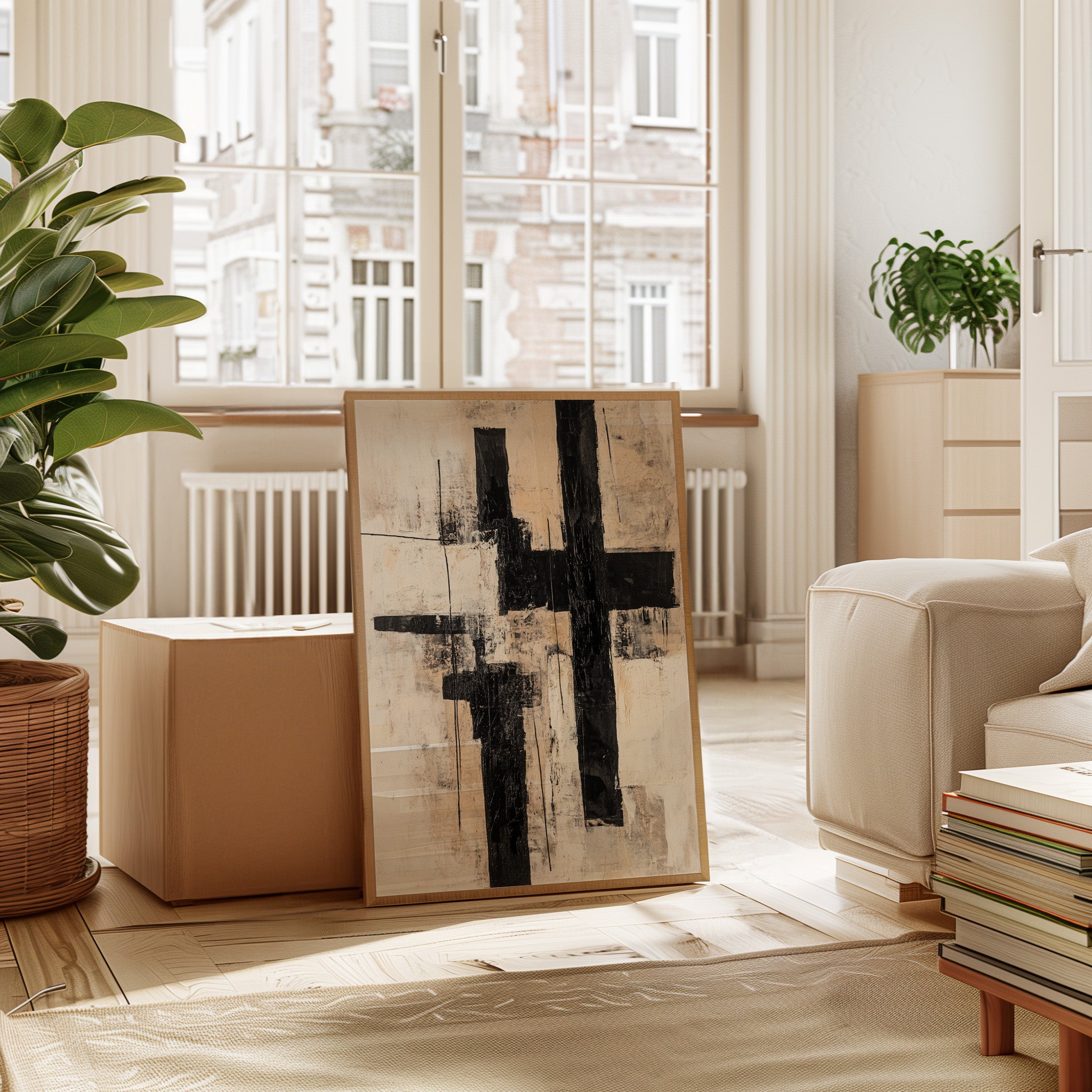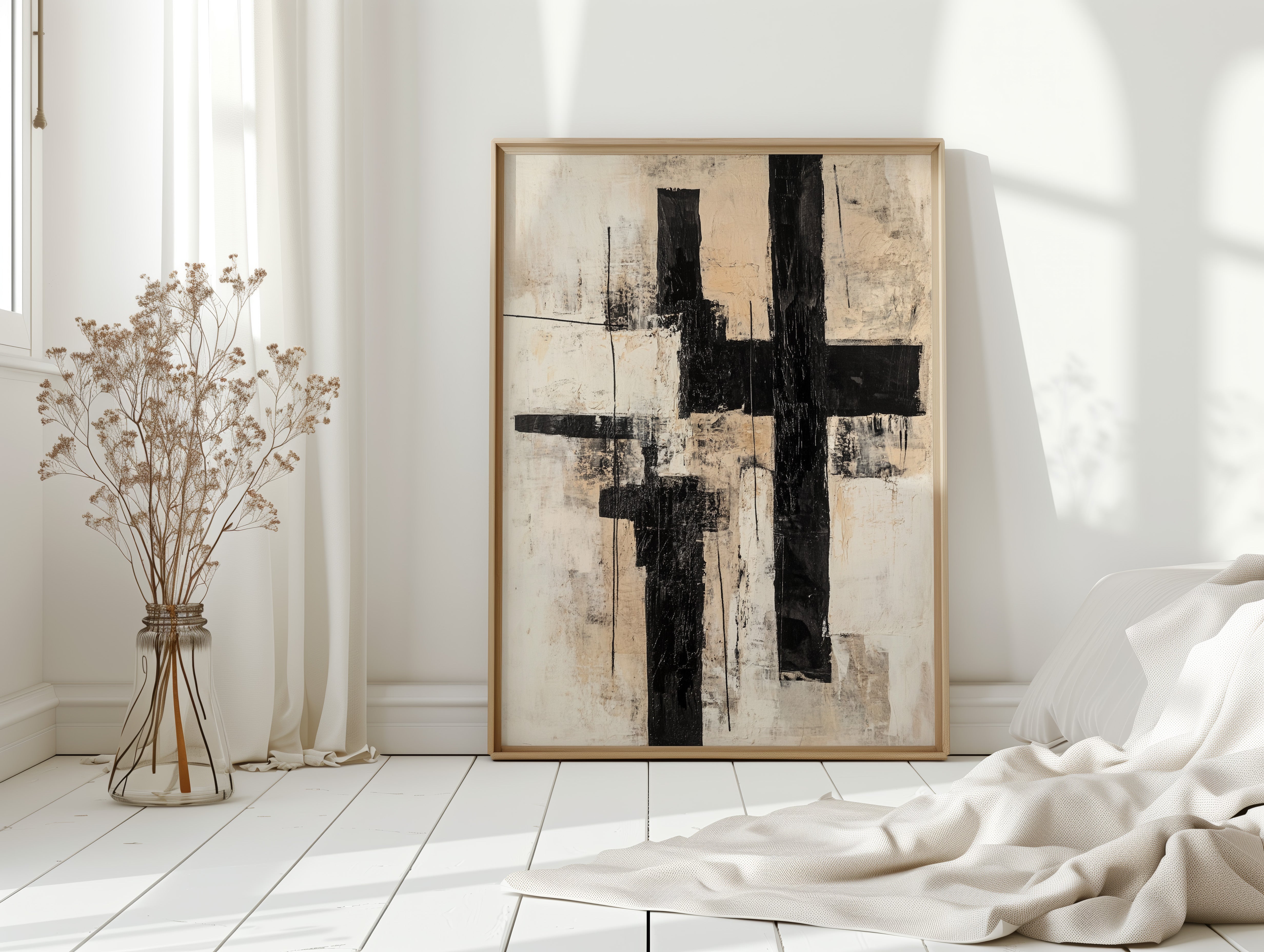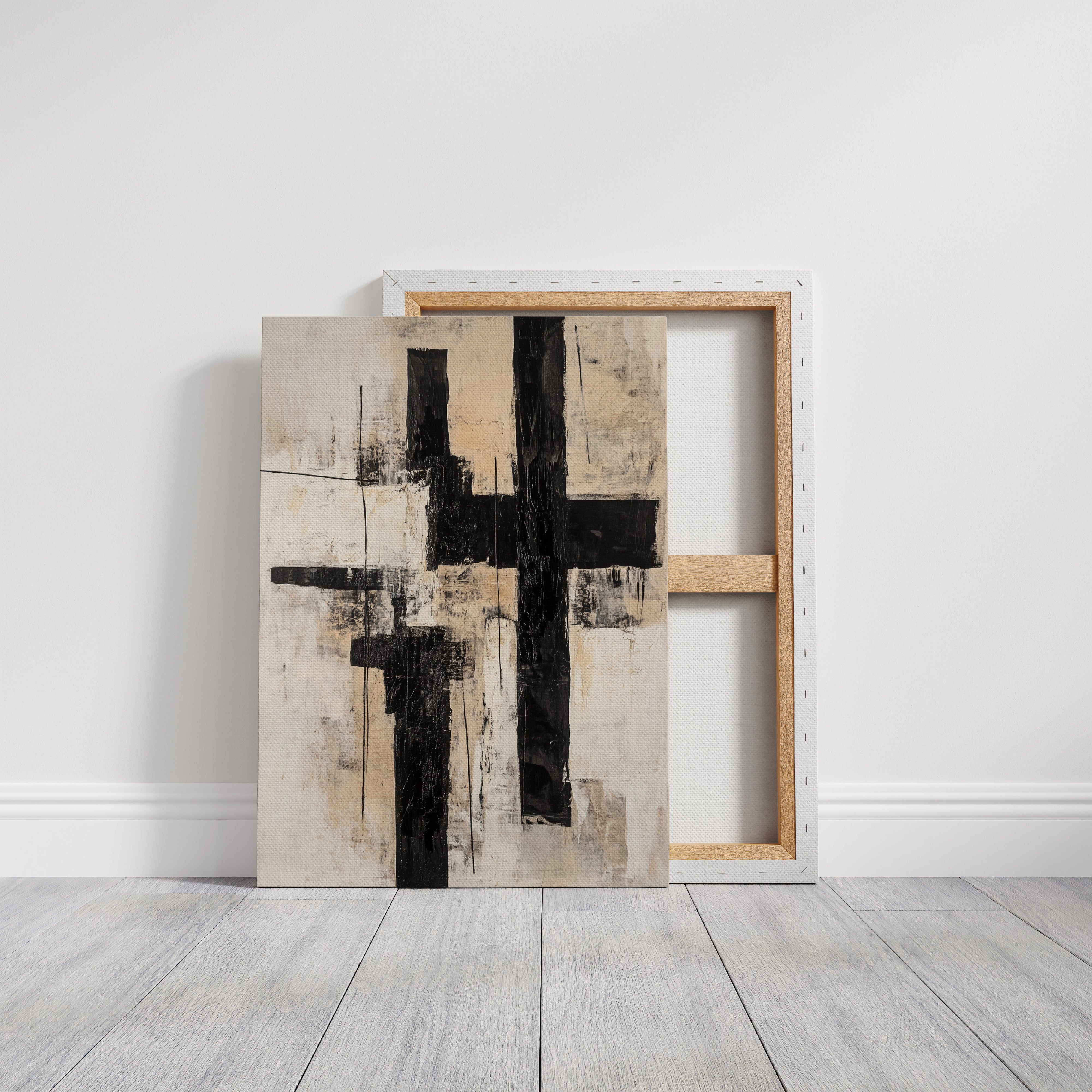 Bold strokes of midnight black slice through a canvas of weathered ivory, creating a dramatic interplay of light and shadow. The composition speaks of urban geometry and architectural forms, with rough-hewn textures that suggest concrete and steel. Deep ebony shapes command attention against the textured background, while subtle variations in the cream tones add depth and movement. This contemporary piece would bring sophisticated drama to a minimal modern space, acting as a powerful focal point in an entry hall or above a sleek console.