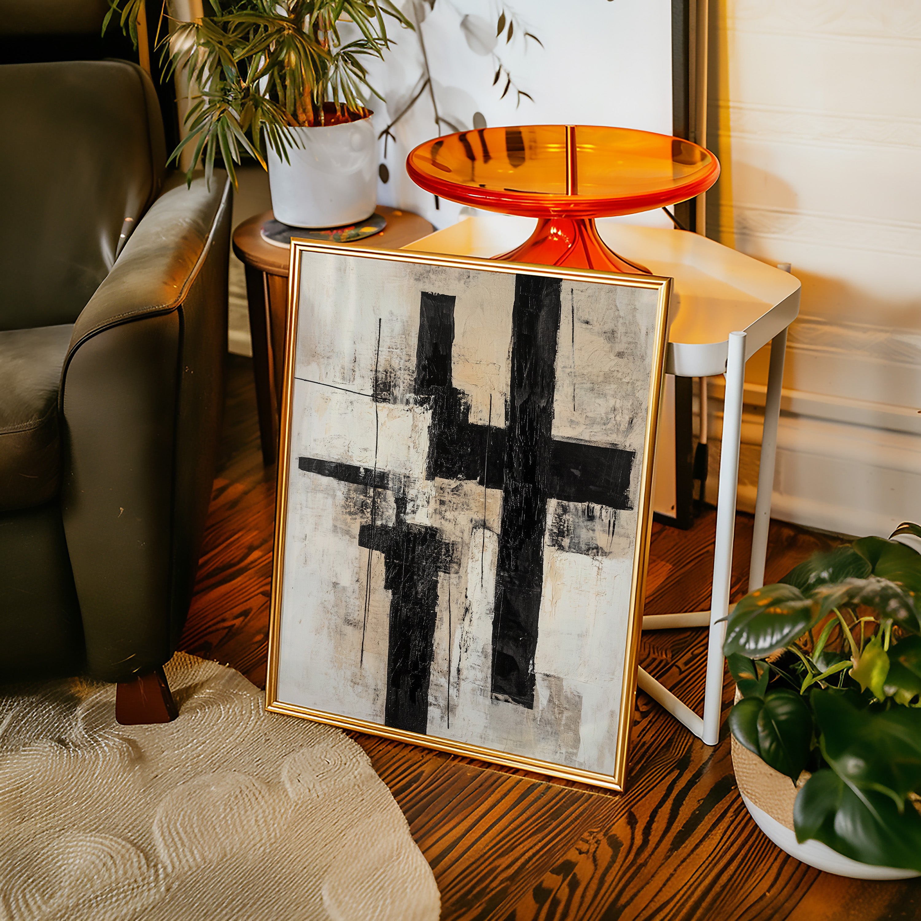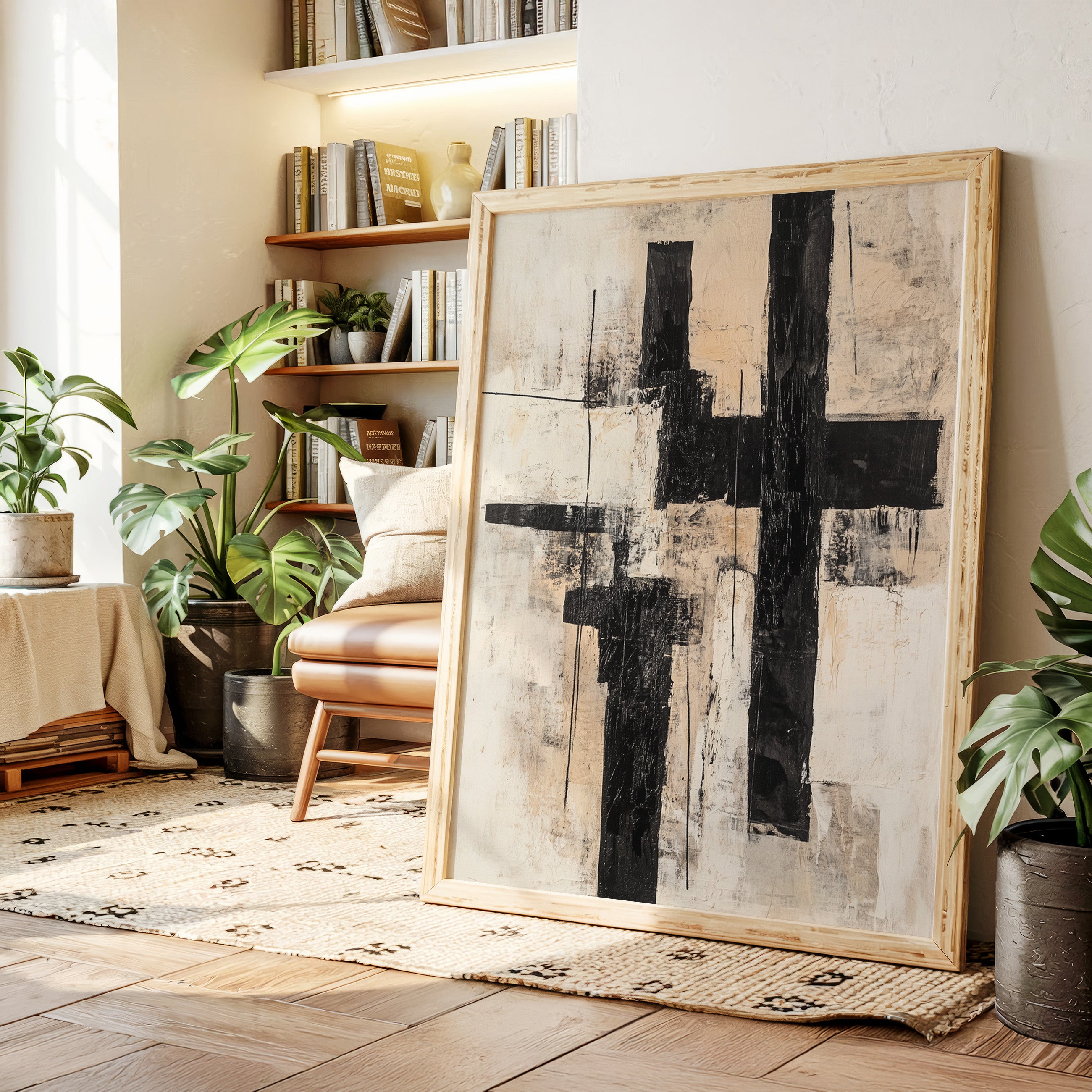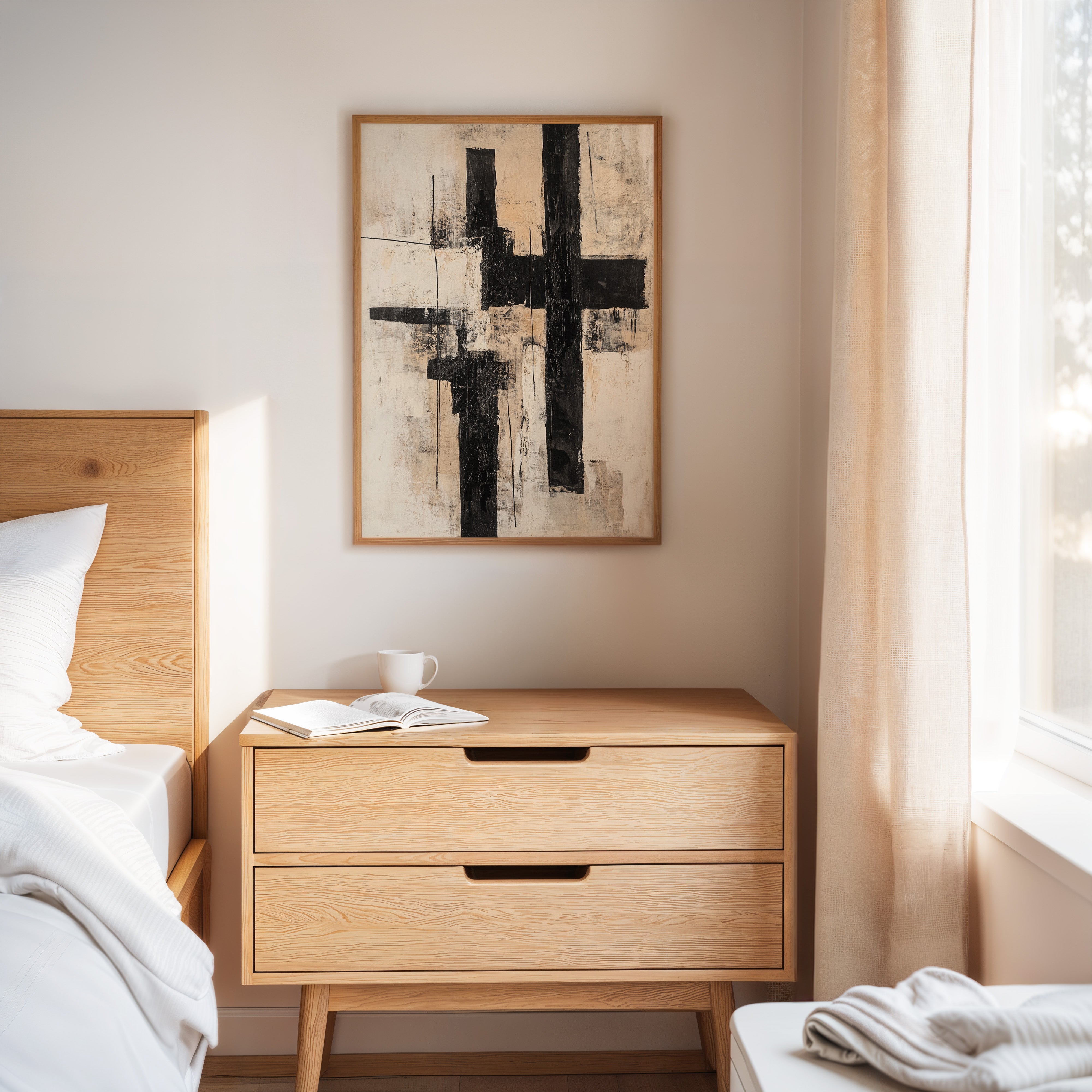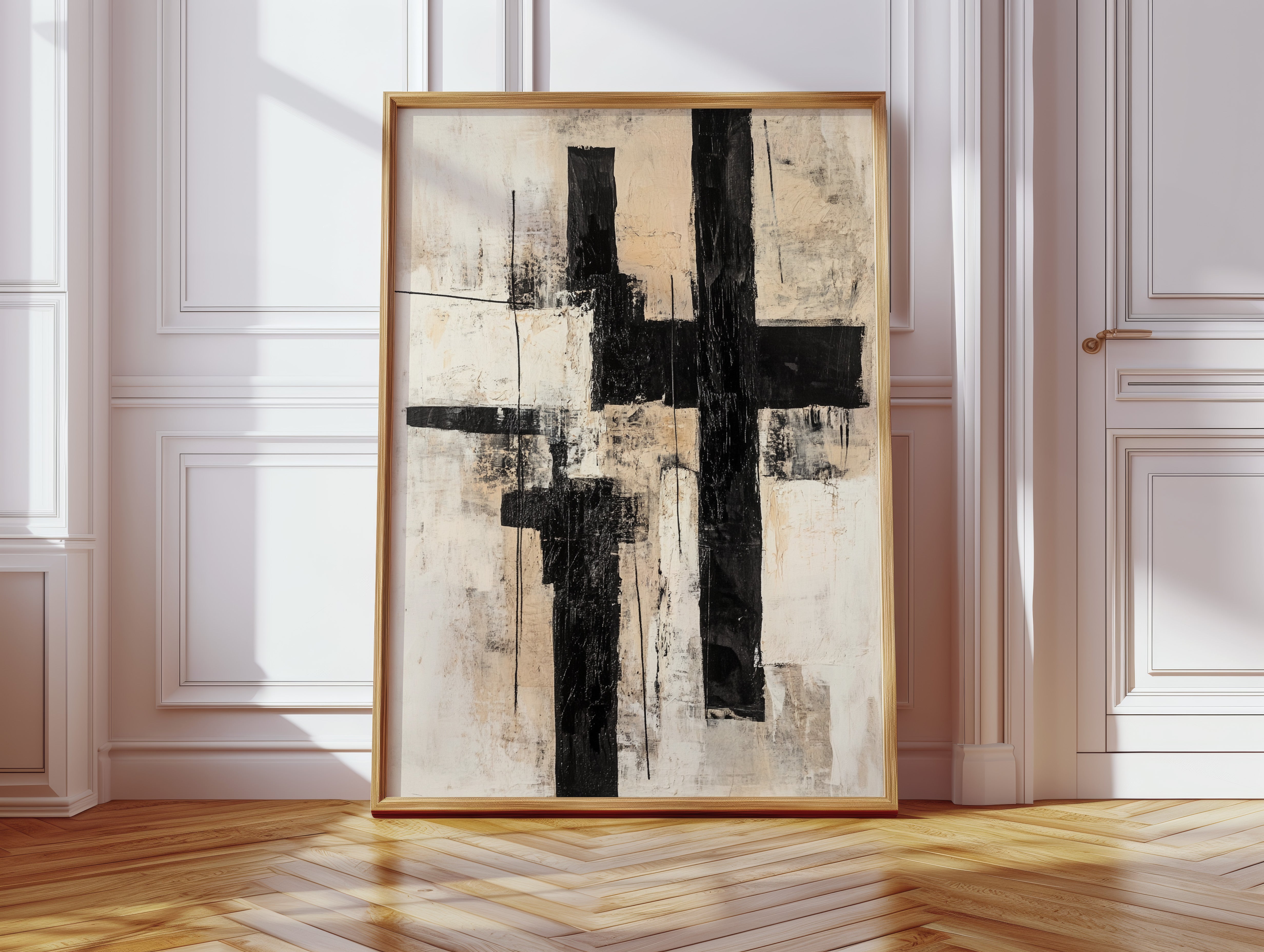 Bold strokes of midnight black slice through a canvas of weathered ivory, creating a dramatic interplay of light and shadow. The composition speaks of urban geometry and architectural forms, with rough-hewn textures that suggest concrete and steel. Deep ebony shapes command attention against the textured background, while subtle variations in the cream tones add depth and movement. This contemporary piece would bring sophisticated drama to a minimal modern space, acting as a powerful focal point in an entry hall or above a sleek console.