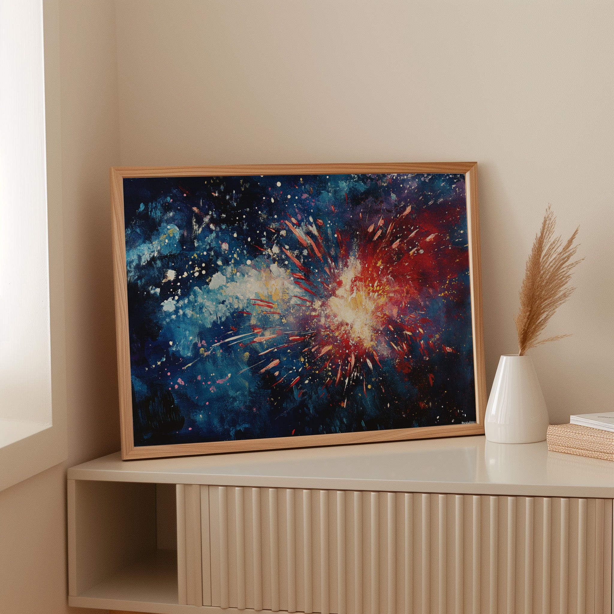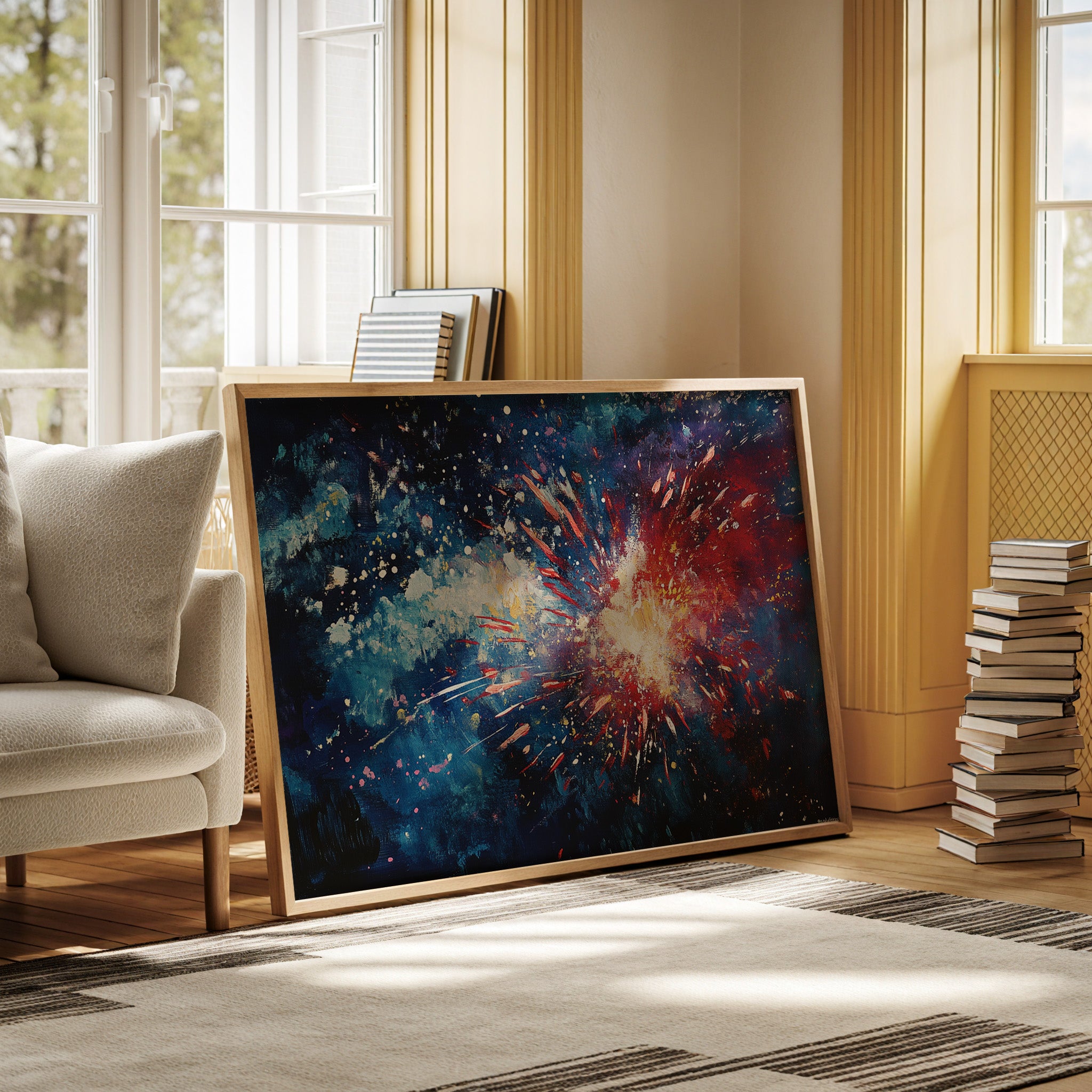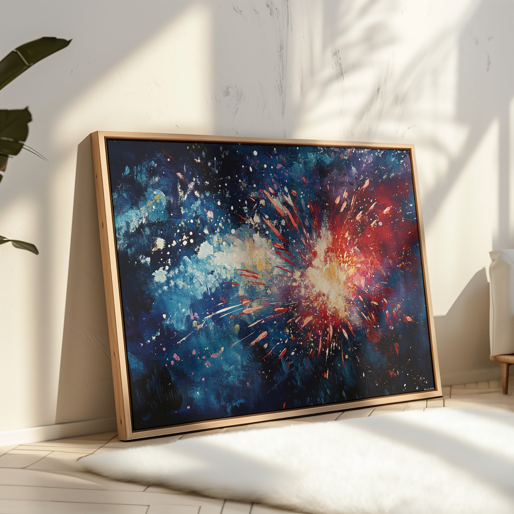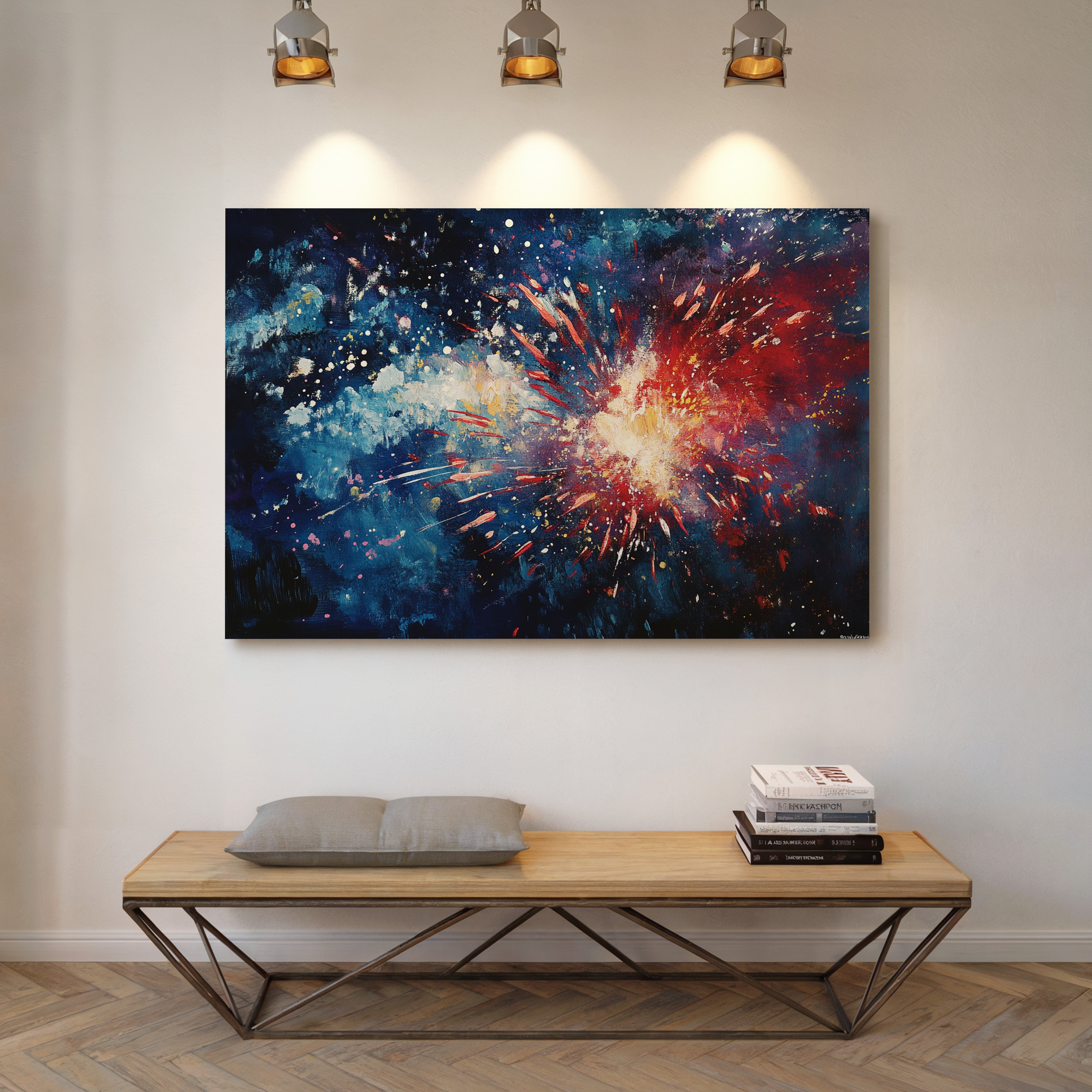 A magnificent explosion of light pierces through the depths of a midnight sky, casting brilliant rays of crimson and gold across the canvas. The dramatic contrast between deep oceanic blues and fierce reds creates a cosmic dance of color and energy, while delicate speckles of white and yellow stars scatter like celestial confetti. The piece captures that fleeting moment when light and darkness collide in spectacular fashion, reminiscent of both fireworks and distant supernovas. This powerful abstract interpretation brings the wonder of the cosmos into intimate spaces.
