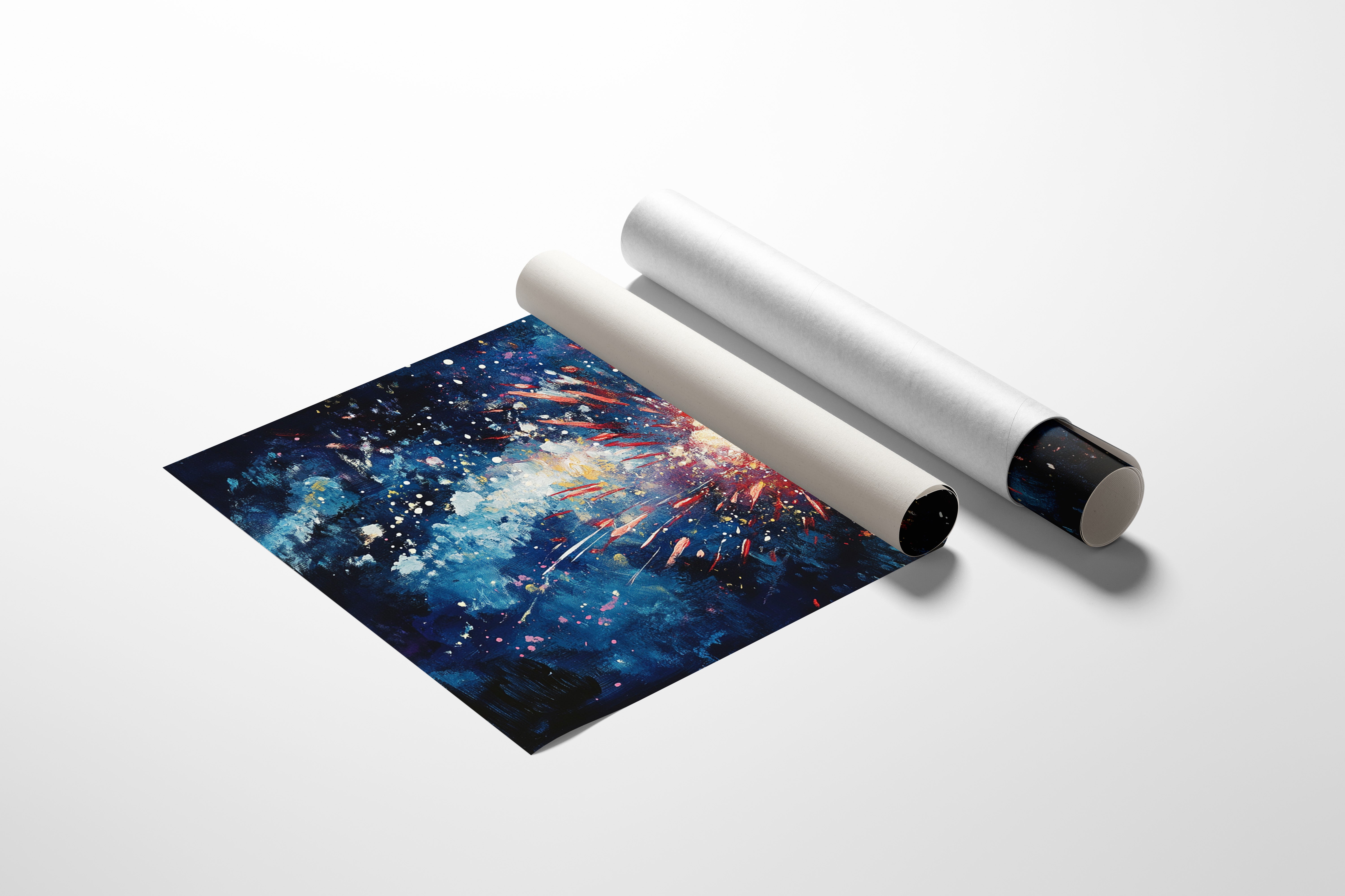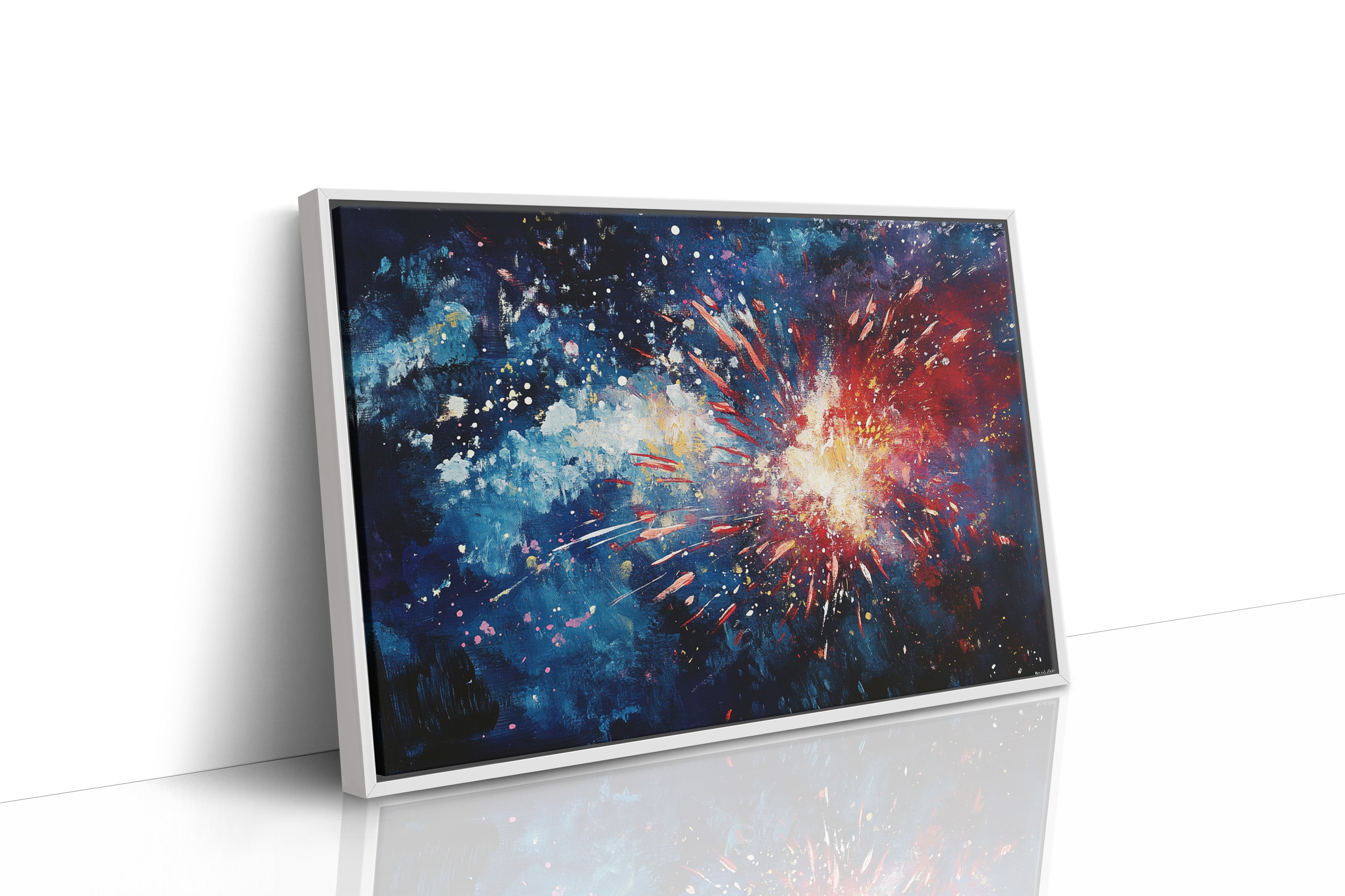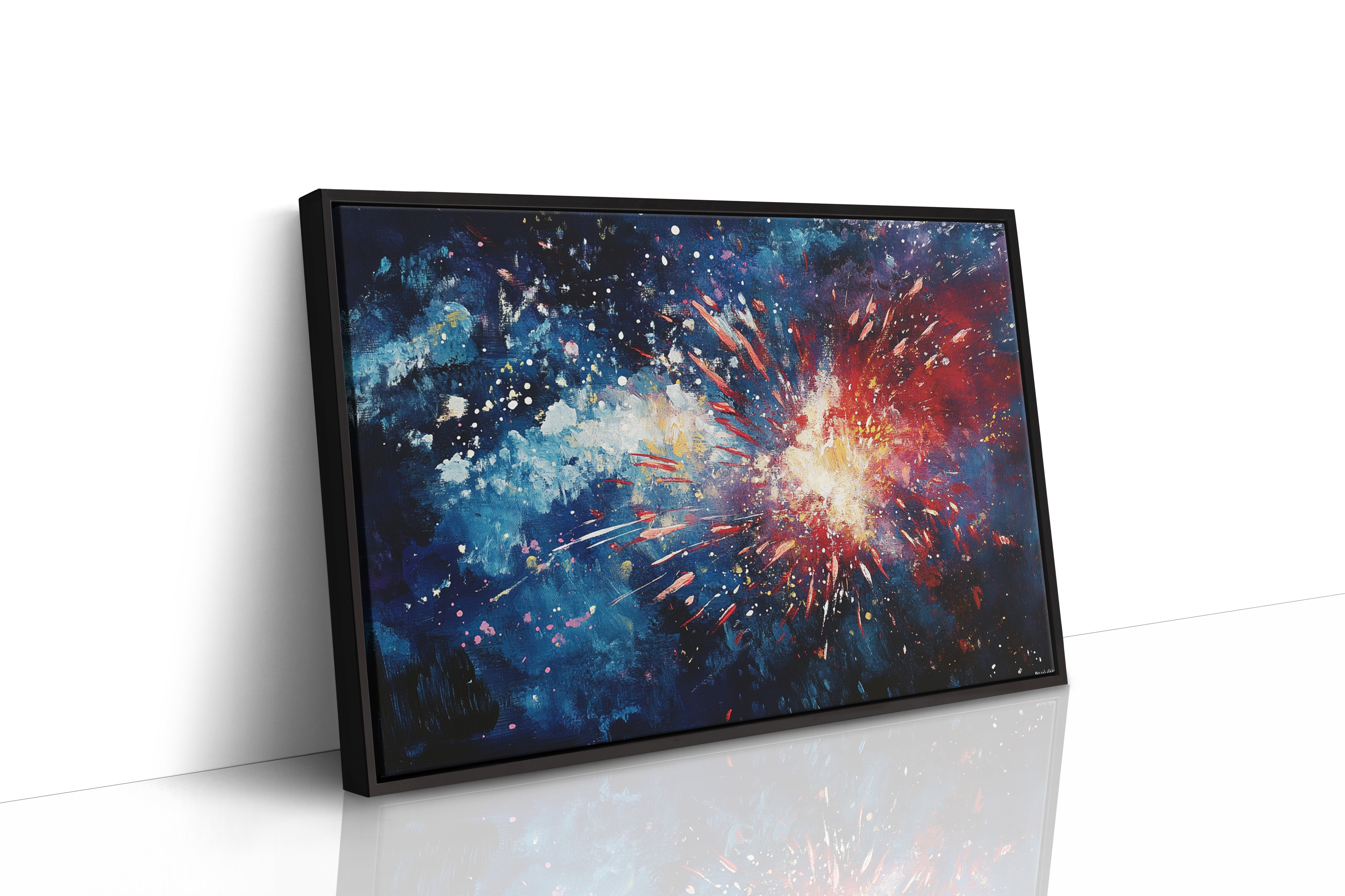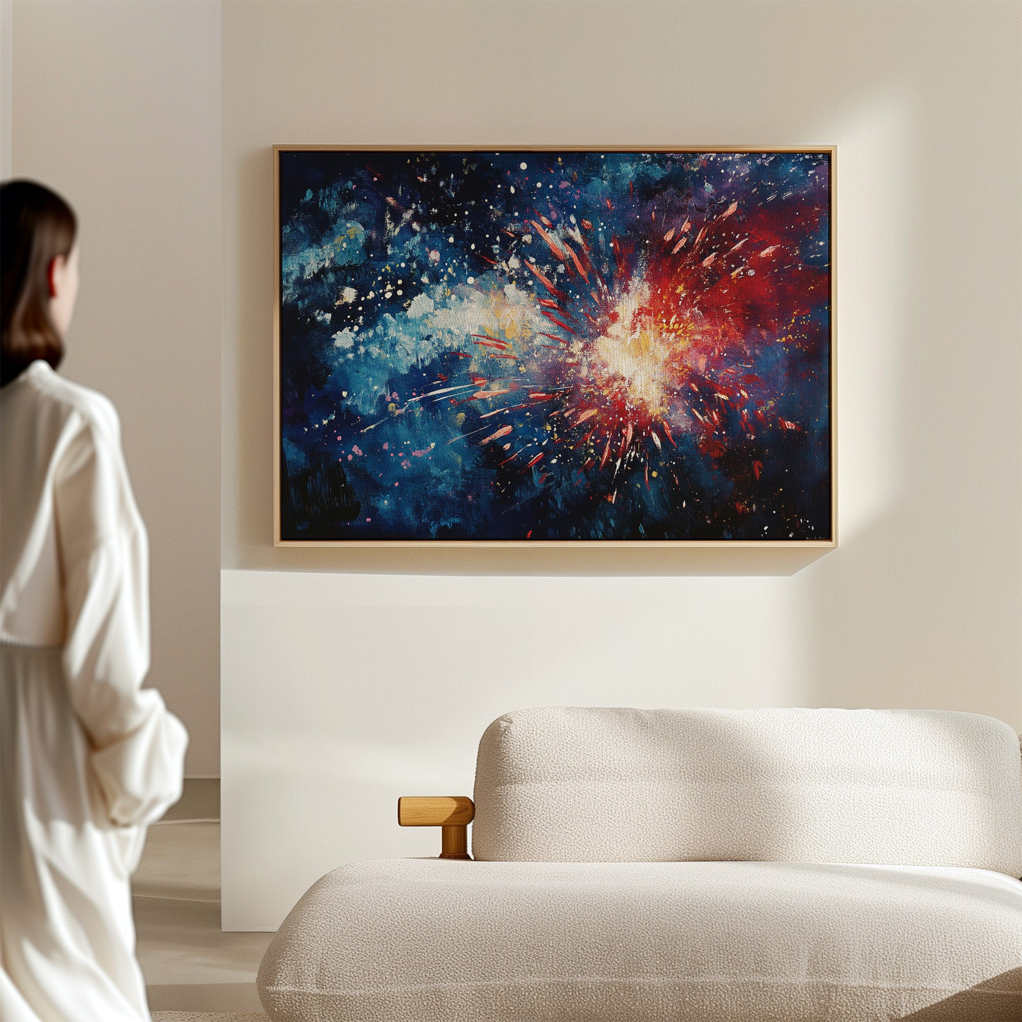 A magnificent explosion of light pierces through the depths of a midnight sky, casting brilliant rays of crimson and gold across the canvas. The dramatic contrast between deep oceanic blues and fierce reds creates a cosmic dance of color and energy, while delicate speckles of white and yellow stars scatter like celestial confetti. The piece captures that fleeting moment when light and darkness collide in spectacular fashion, reminiscent of both fireworks and distant supernovas. This powerful abstract interpretation brings the wonder of the cosmos into intimate spaces.