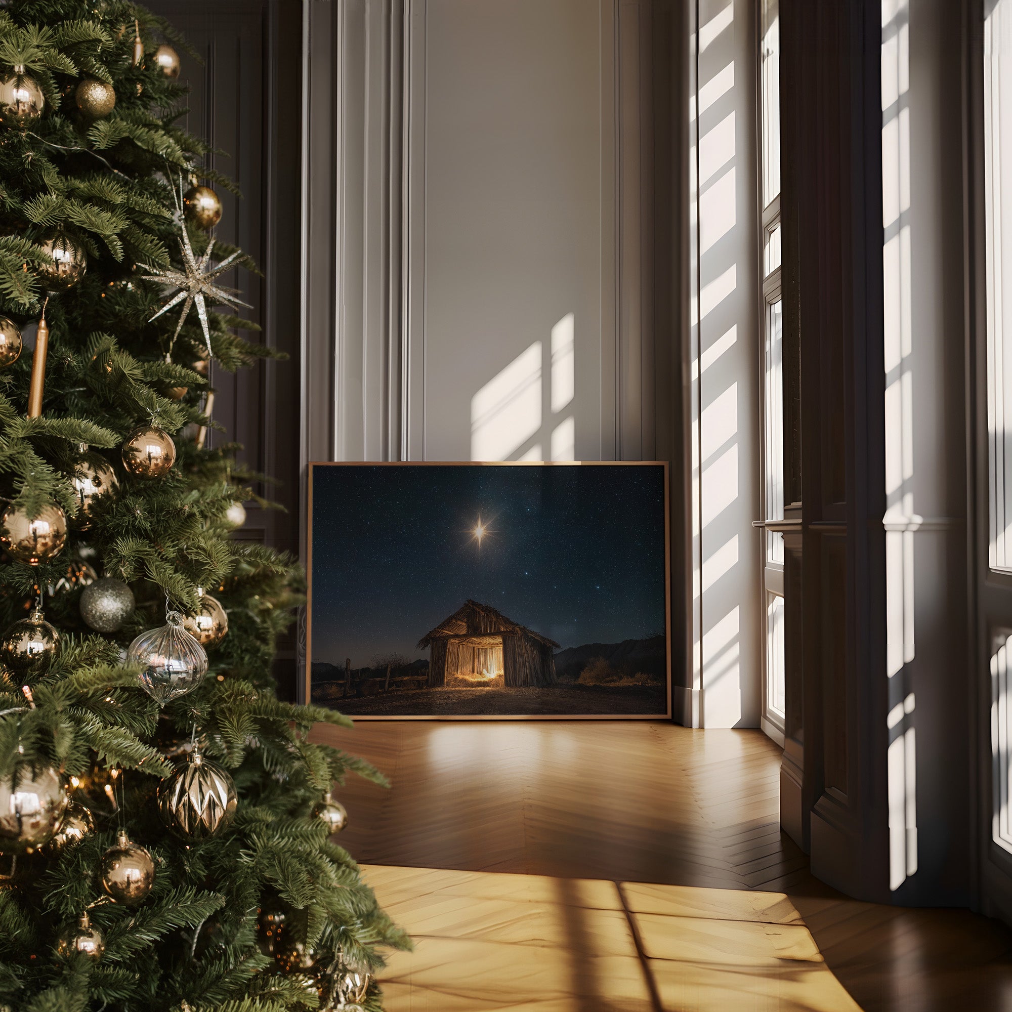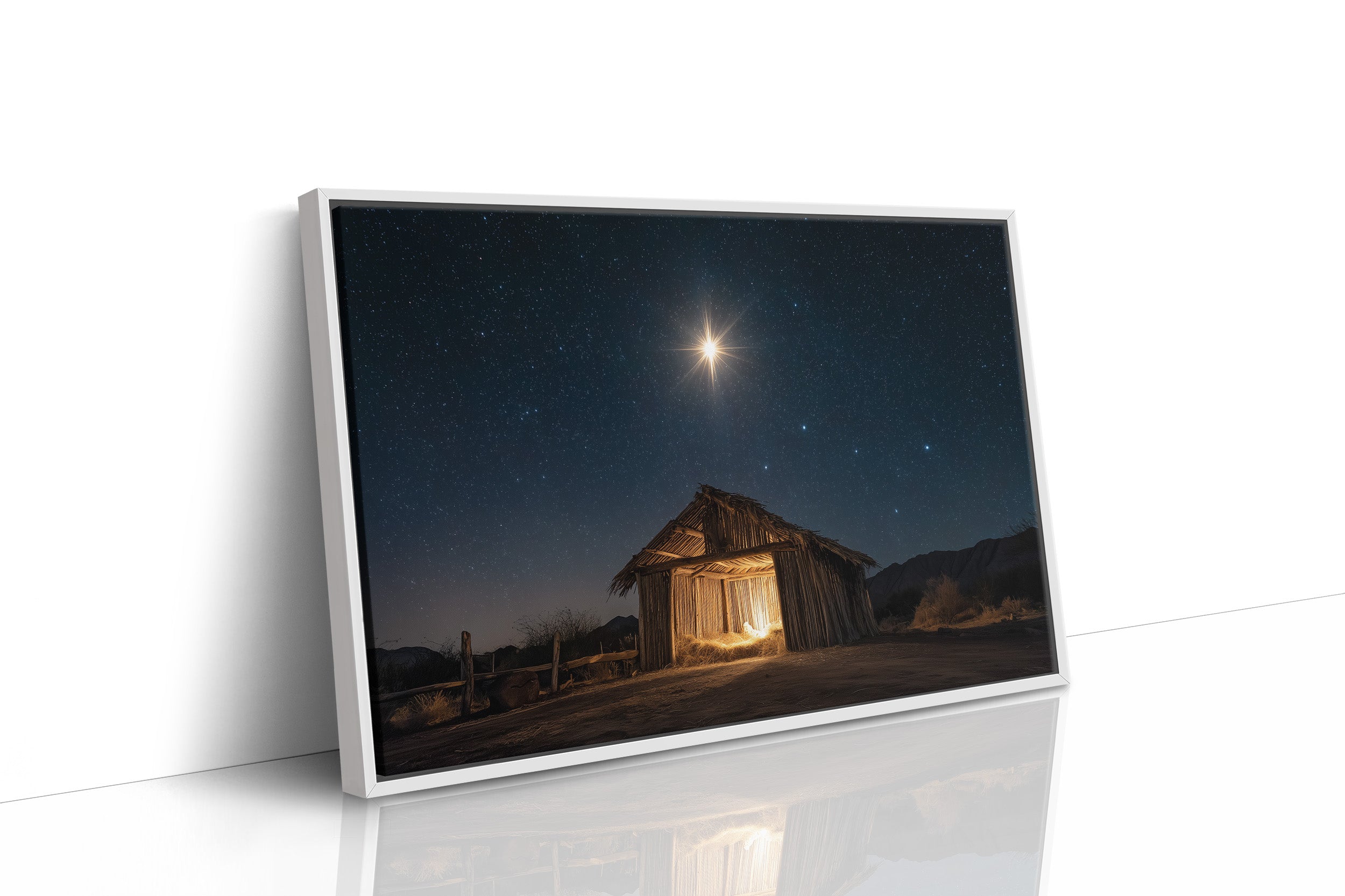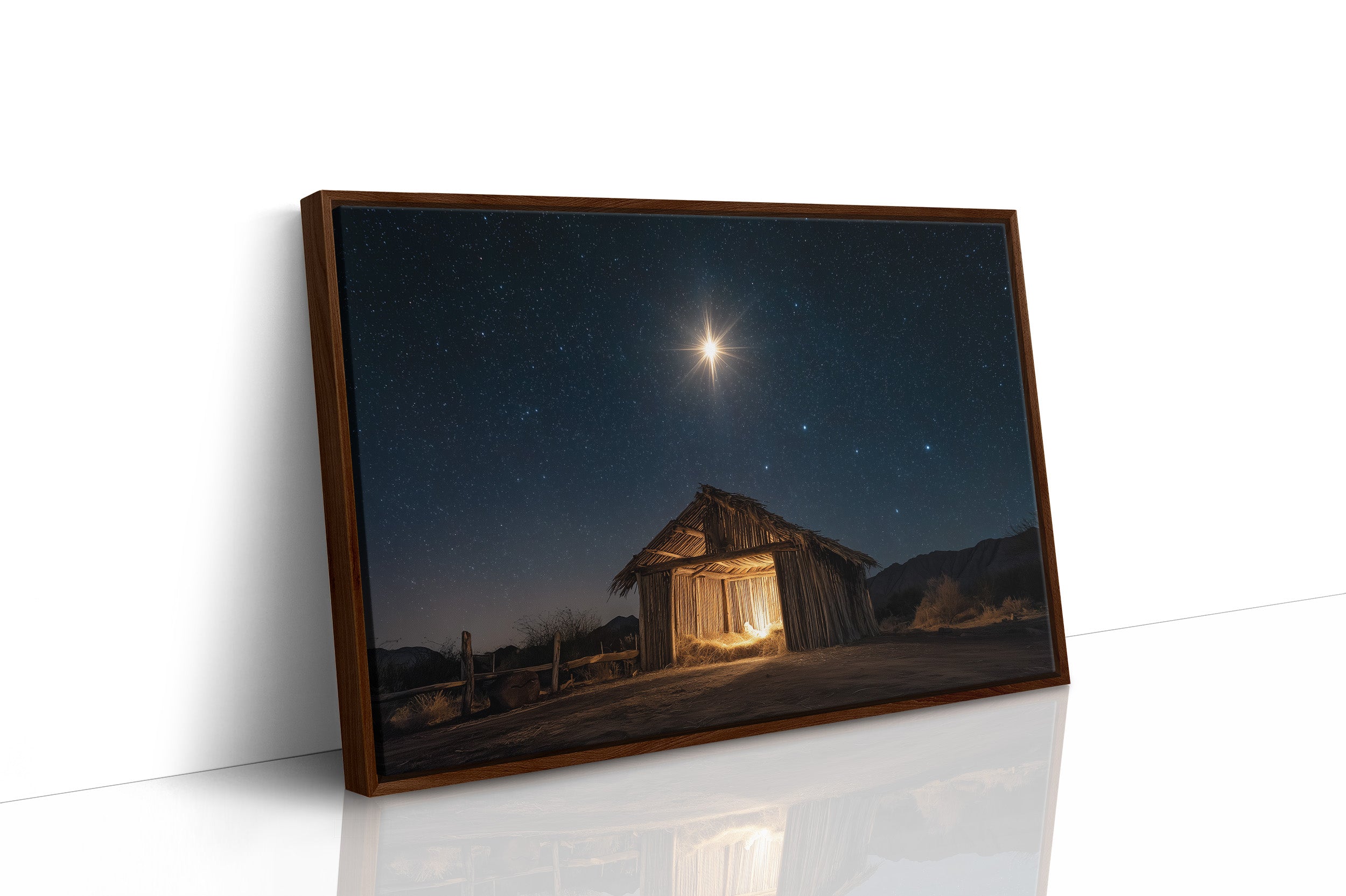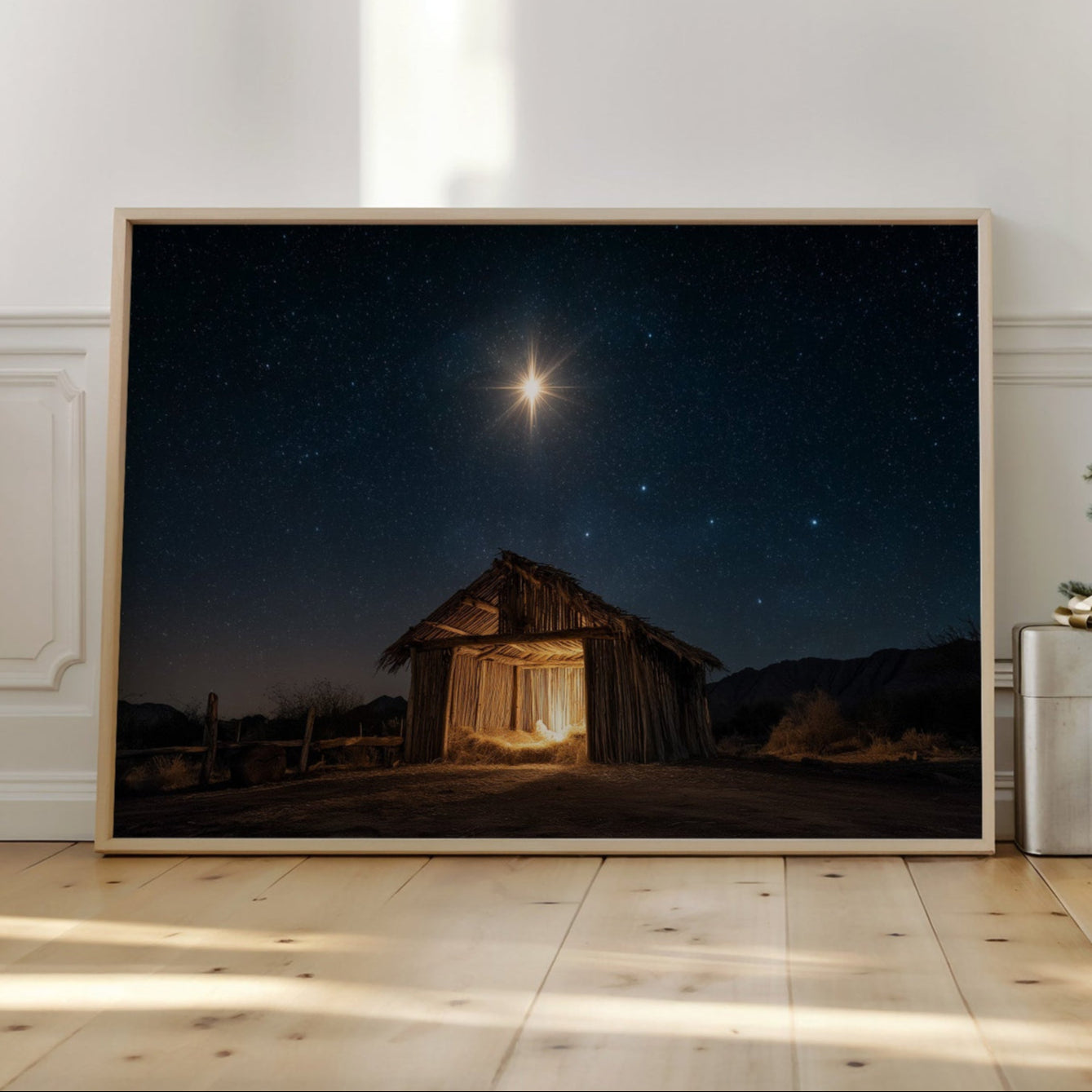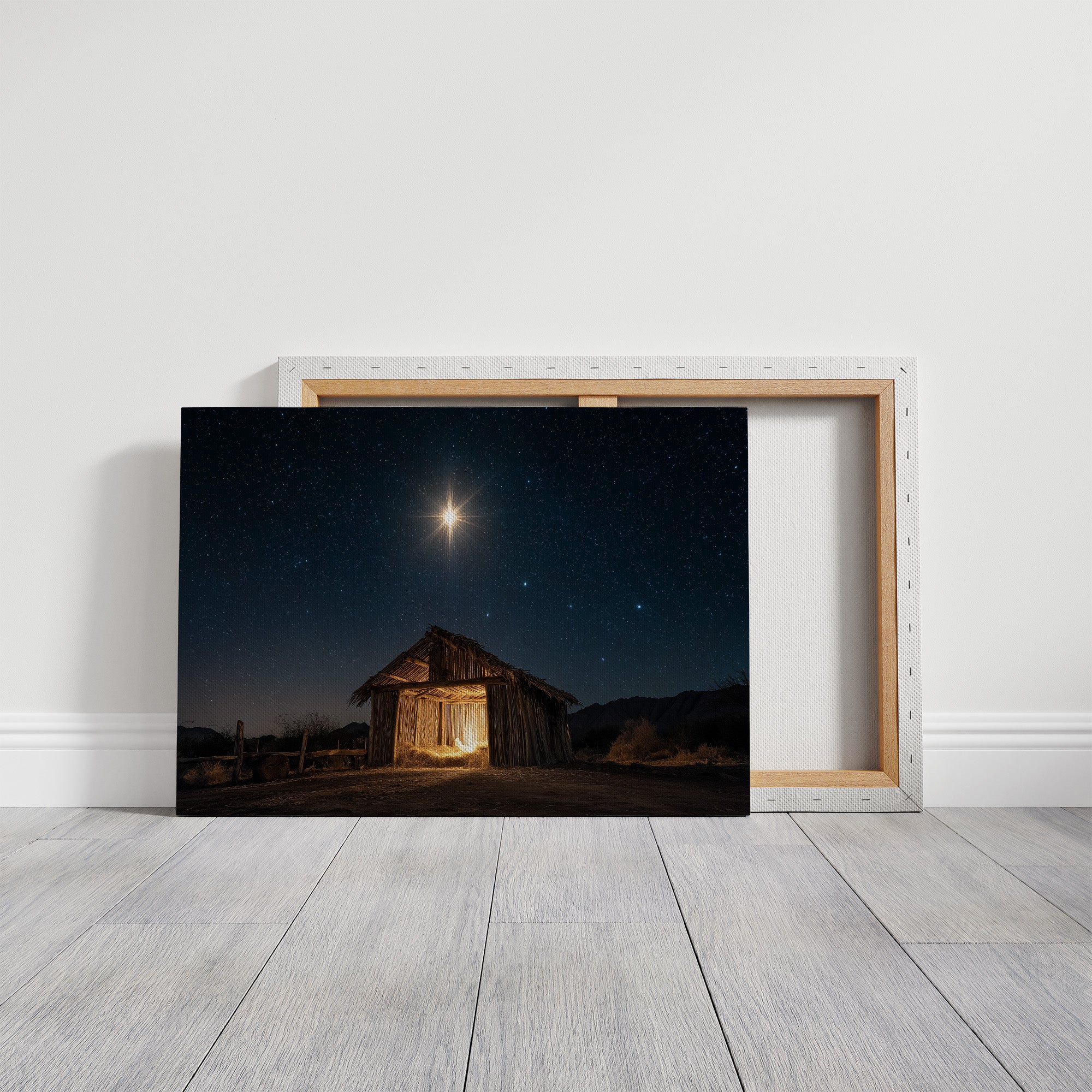A brilliant star pierces the velvet darkness, casting its golden light upon a weathered wooden shelter below. The simple structure stands as a solitary beacon in the desert night, its rough-hewn walls glowing with warm interior light that spills onto the dusty ground. Against the backdrop of a star-studded sky, the scene captures a moment of profound serenity and ancient storytelling. The contrast between the celestial radiance above and the earthly simplicity below creates a powerful narrative of divine meeting mortal. This piece brings a sense of peace and wonder to living spaces, particularly suited for quiet corners where contemplation meets comfort.