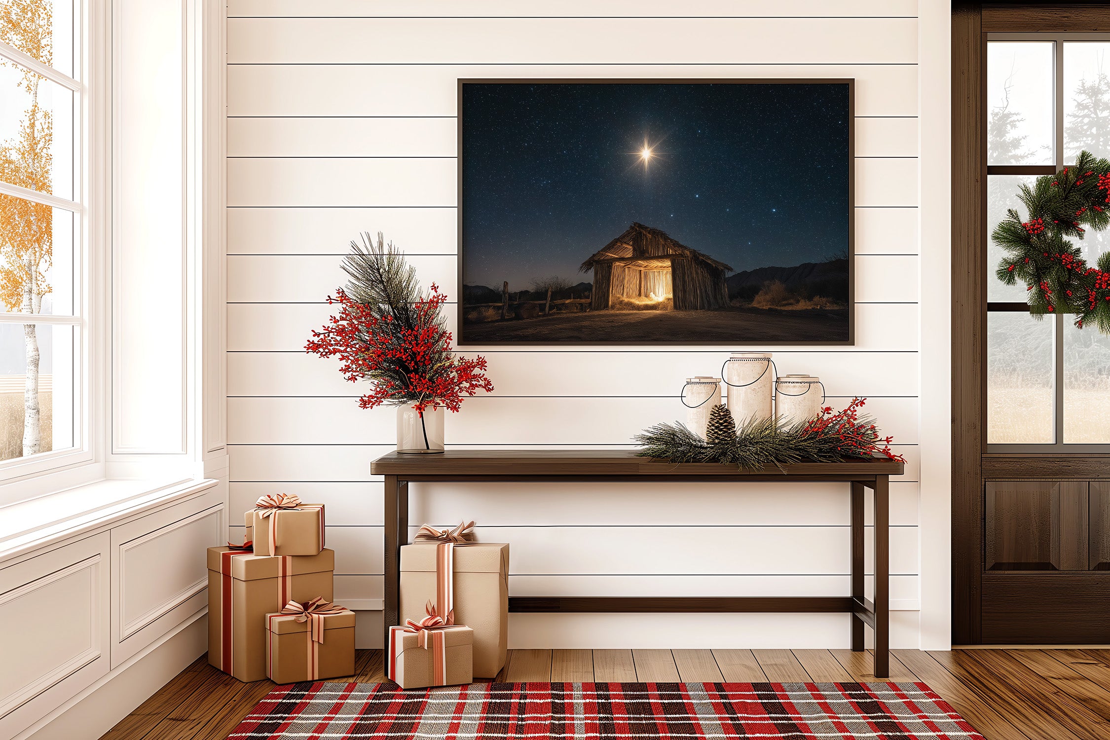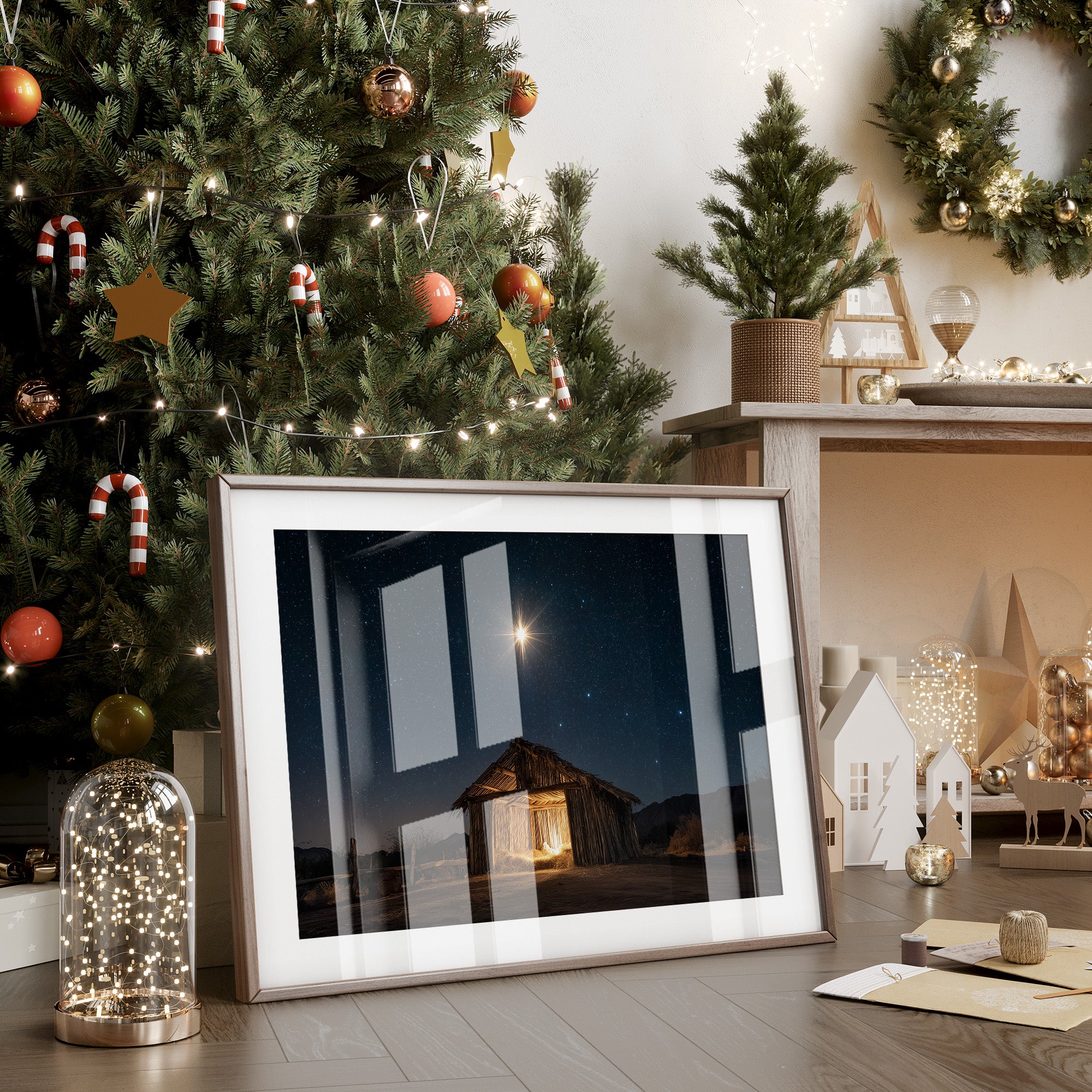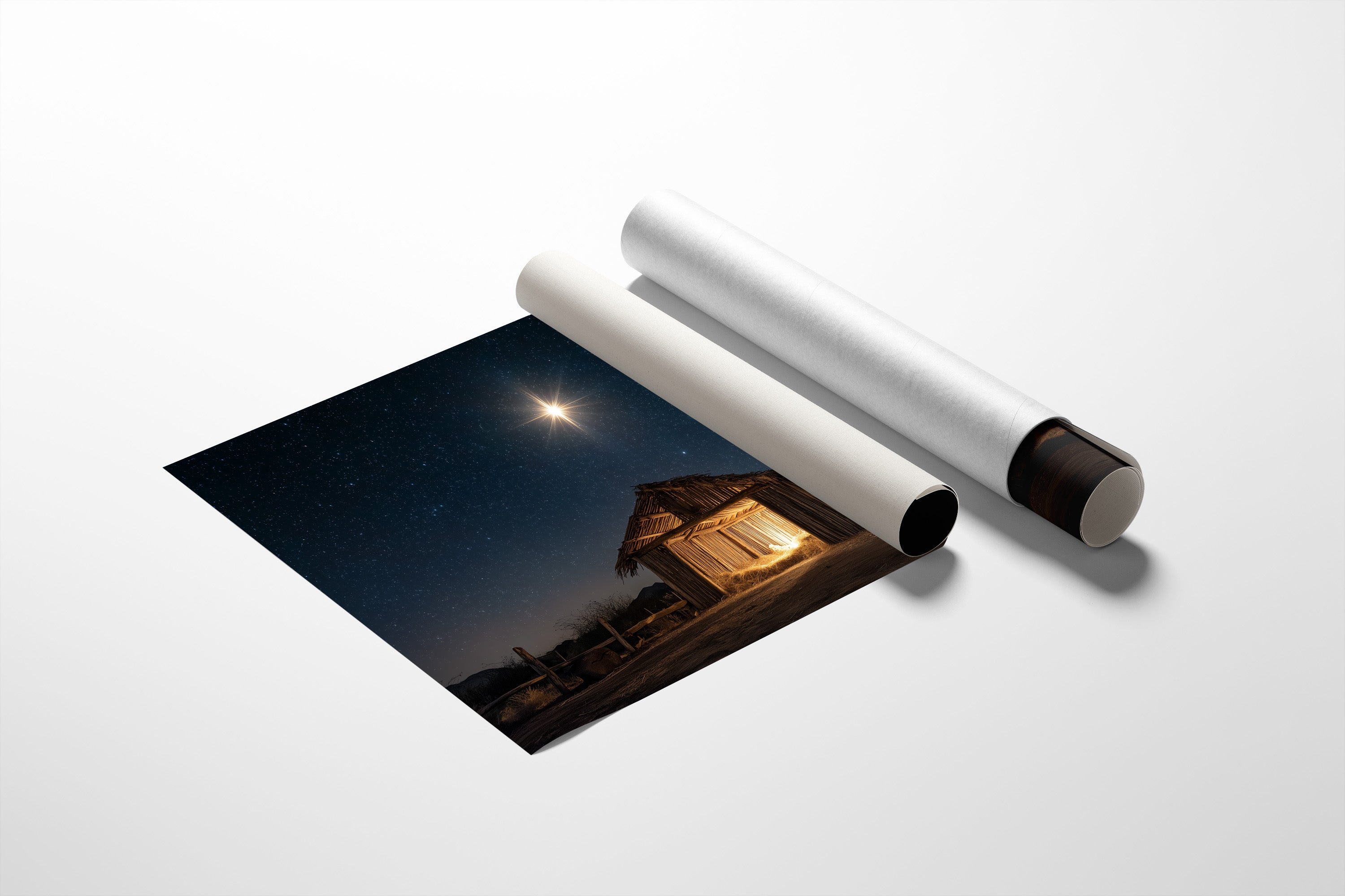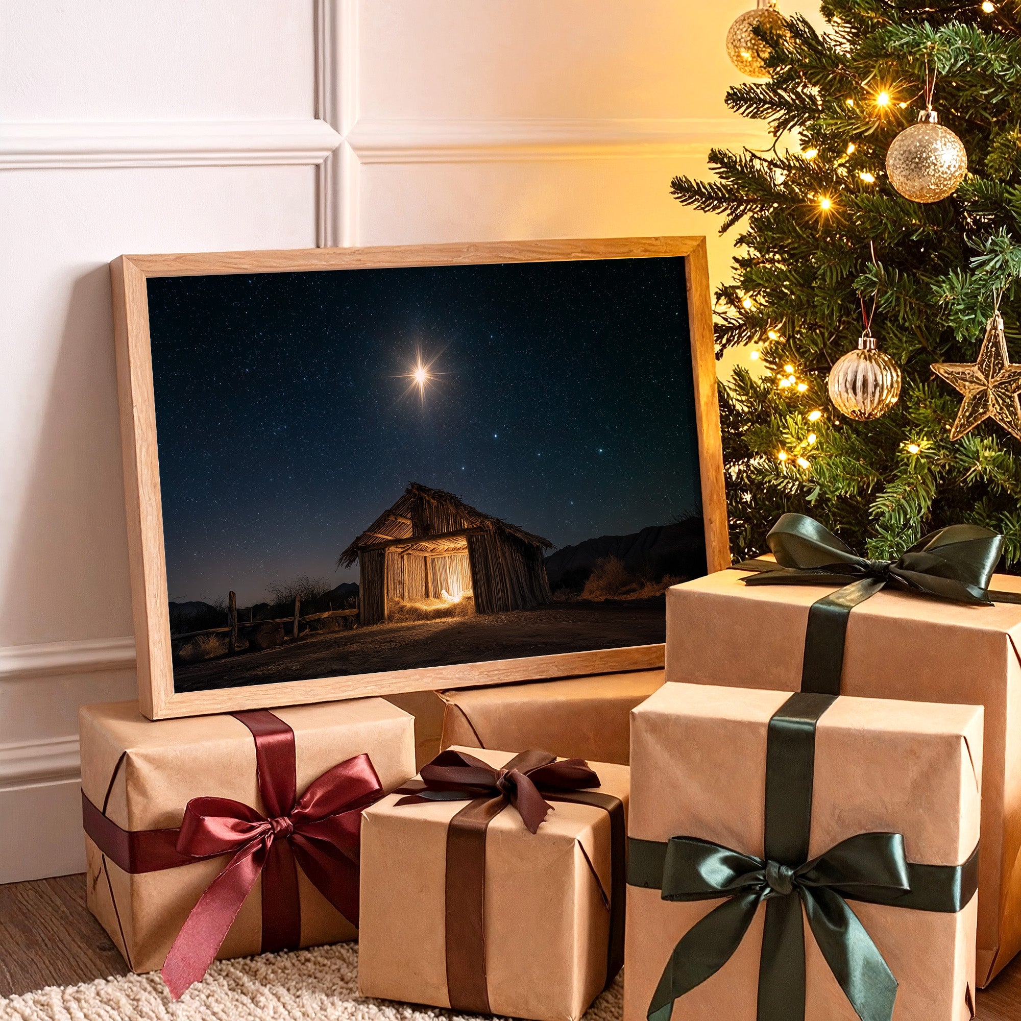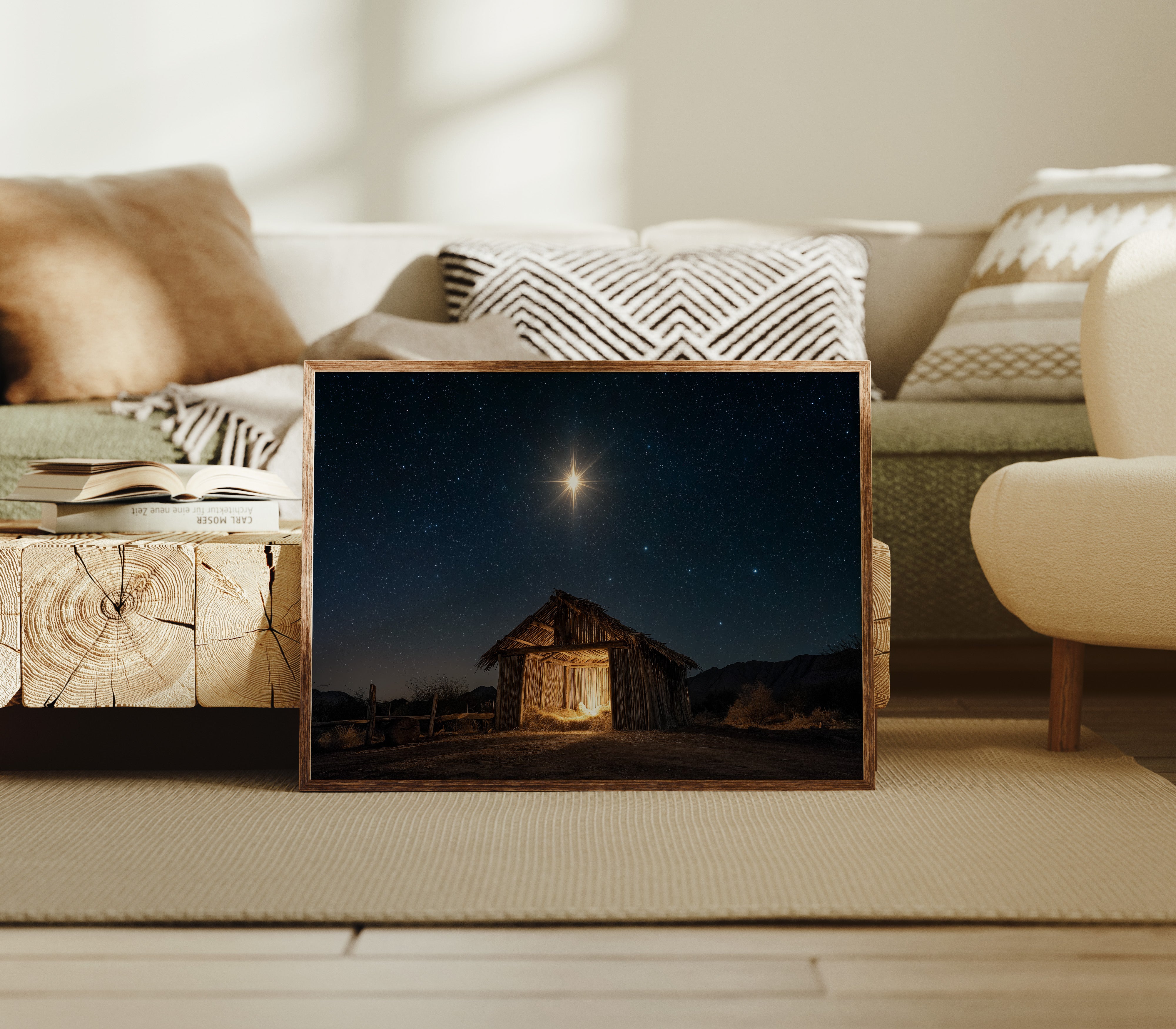A brilliant star pierces the velvet darkness, casting its golden light upon a weathered wooden shelter below. The simple structure stands as a solitary beacon in the desert night, its rough-hewn walls glowing with warm interior light that spills onto the dusty ground. Against the backdrop of a star-studded sky, the scene captures a moment of profound serenity and ancient storytelling. The contrast between the celestial radiance above and the earthly simplicity below creates a powerful narrative of divine meeting mortal. This piece brings a sense of peace and wonder to living spaces, particularly suited for quiet corners where contemplation meets comfort.