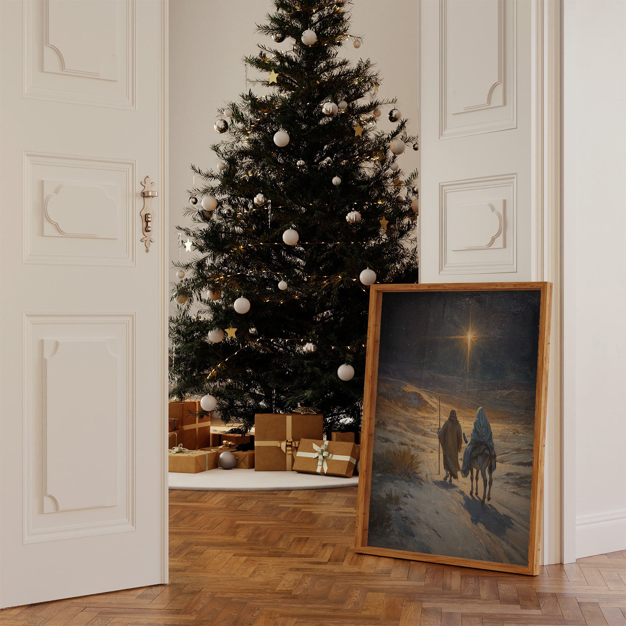 A golden star pierces the deep night sky, casting divine light across a snow-covered landscape. Two travelers make their way through the windswept terrain, their forms silhouetted against the crystalline snow, while long shadows stretch behind them in the ethereal glow. The artist masterfully captures the interplay of celestial light and earthly journey, using rich blues and warm golds to create a sense of sacred pilgrimage. This contemplative scene brings a sense of peace and wonder to any space, perfect for a quiet reading nook or meditation room where its spiritual essence can be fully appreciated.