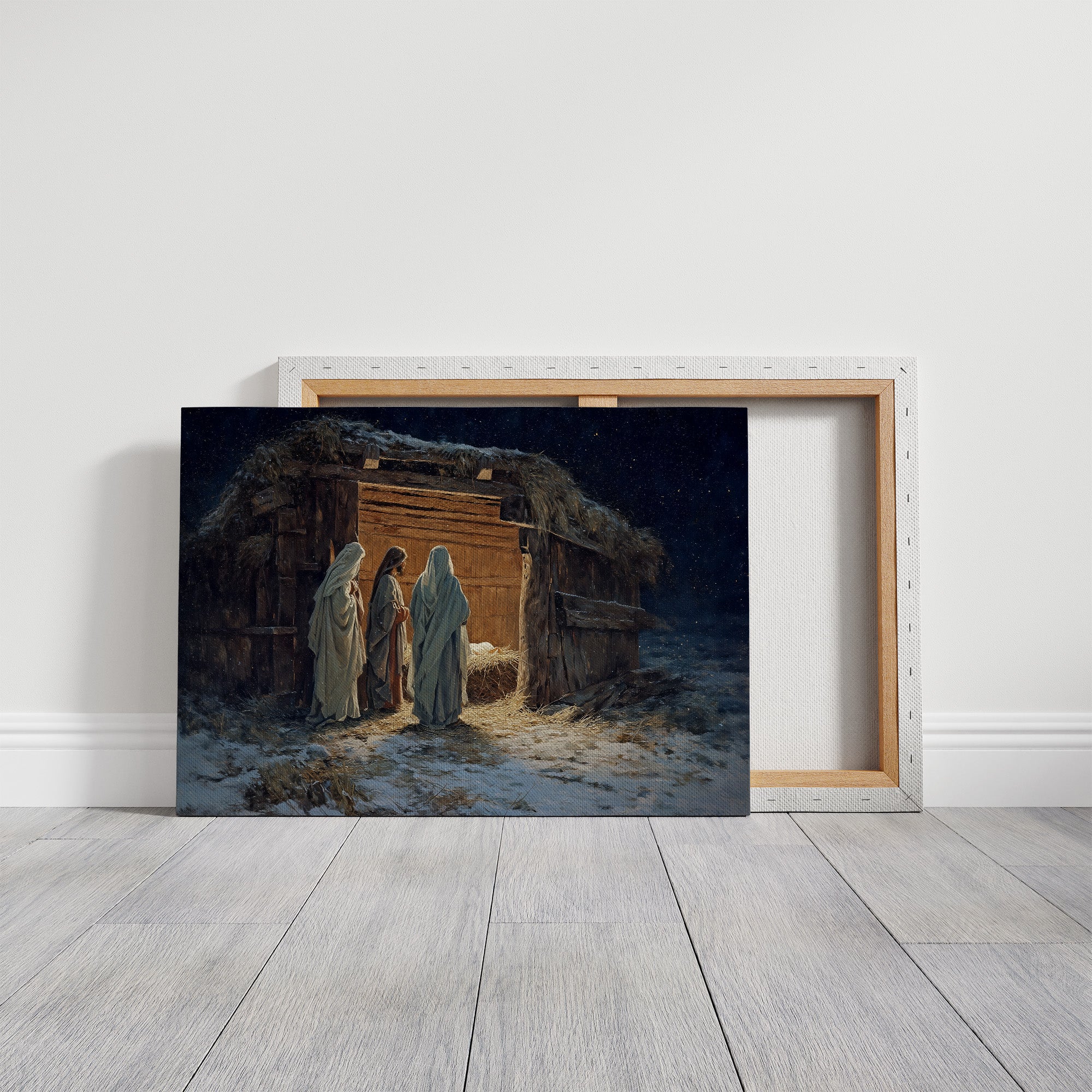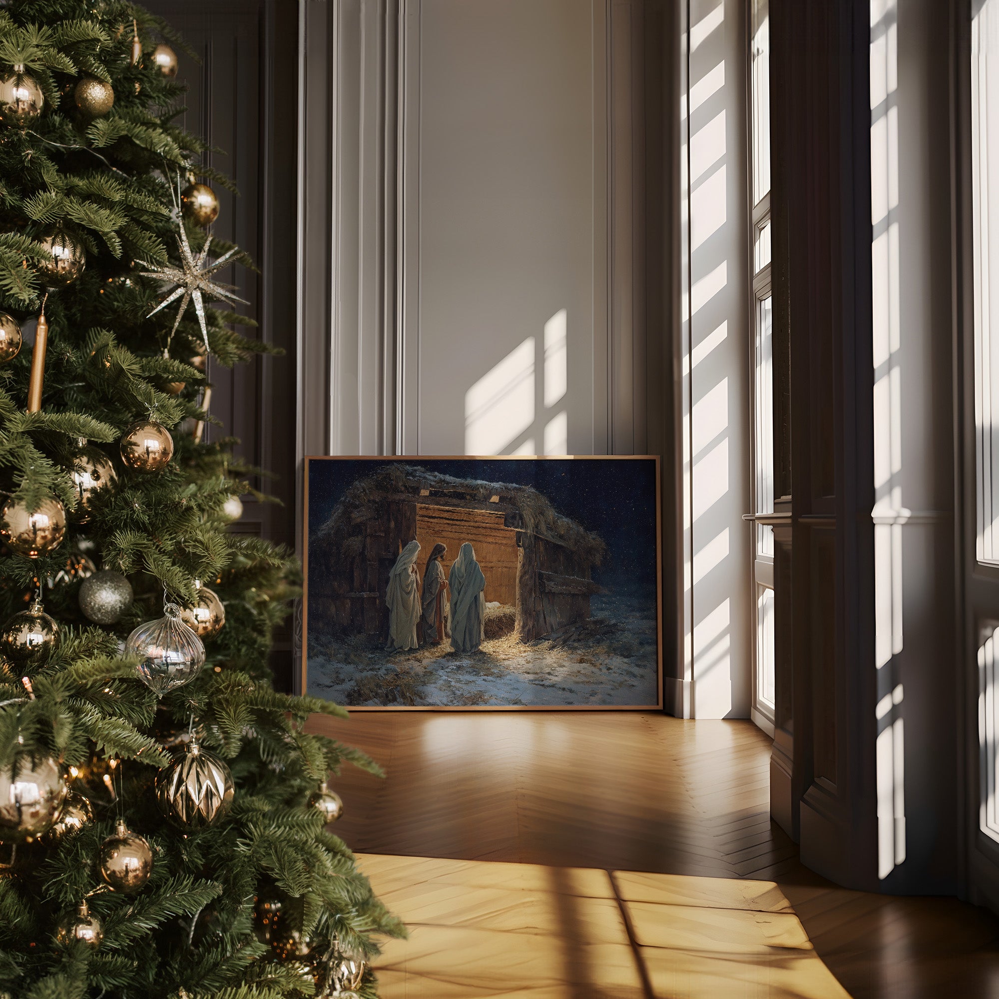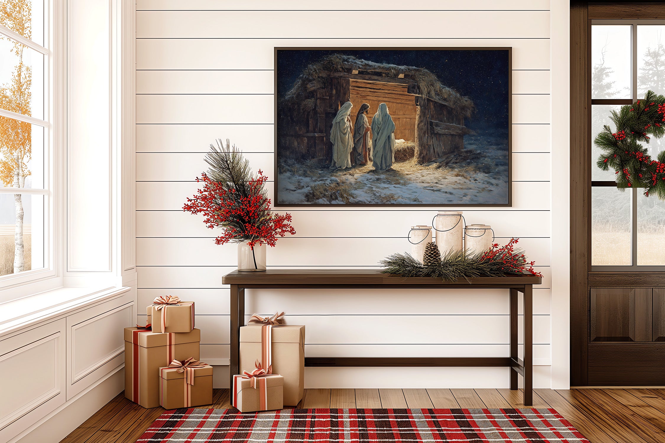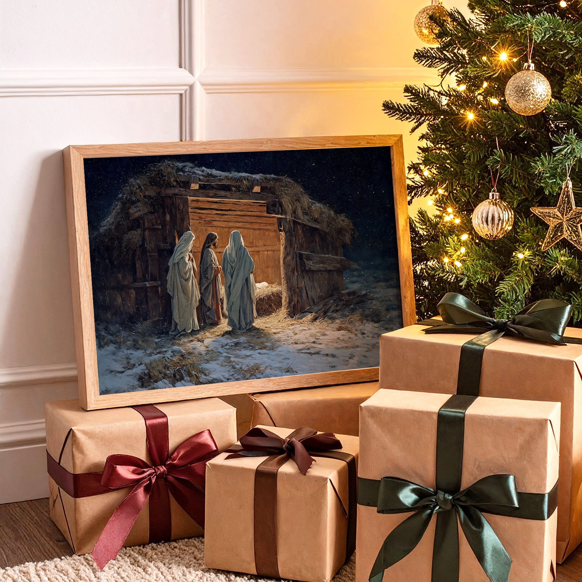 A golden glow spills from a humble doorway into the cold night, drawing three robed figures toward its warmth. The contrast between the dark starlit sky and the luminous interior creates a moment of profound anticipation. Rich textures of rough-hewn wood, weathered stone, and flowing fabric tell a story of journey and discovery, while scattered snow and twinkling stars add touches of winter magic. This contemplative scene brings a sense of reverence to any space, perfect for creating a focal point in a living room or study where quiet reflection is welcomed.