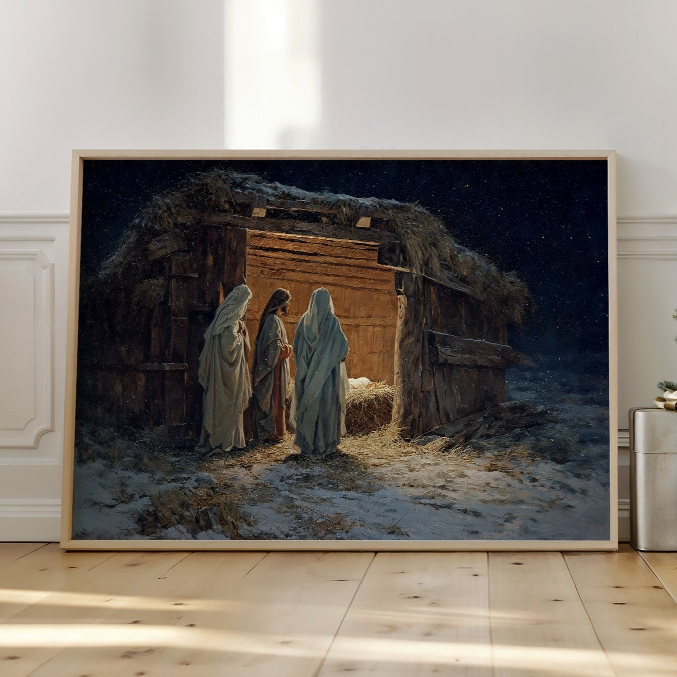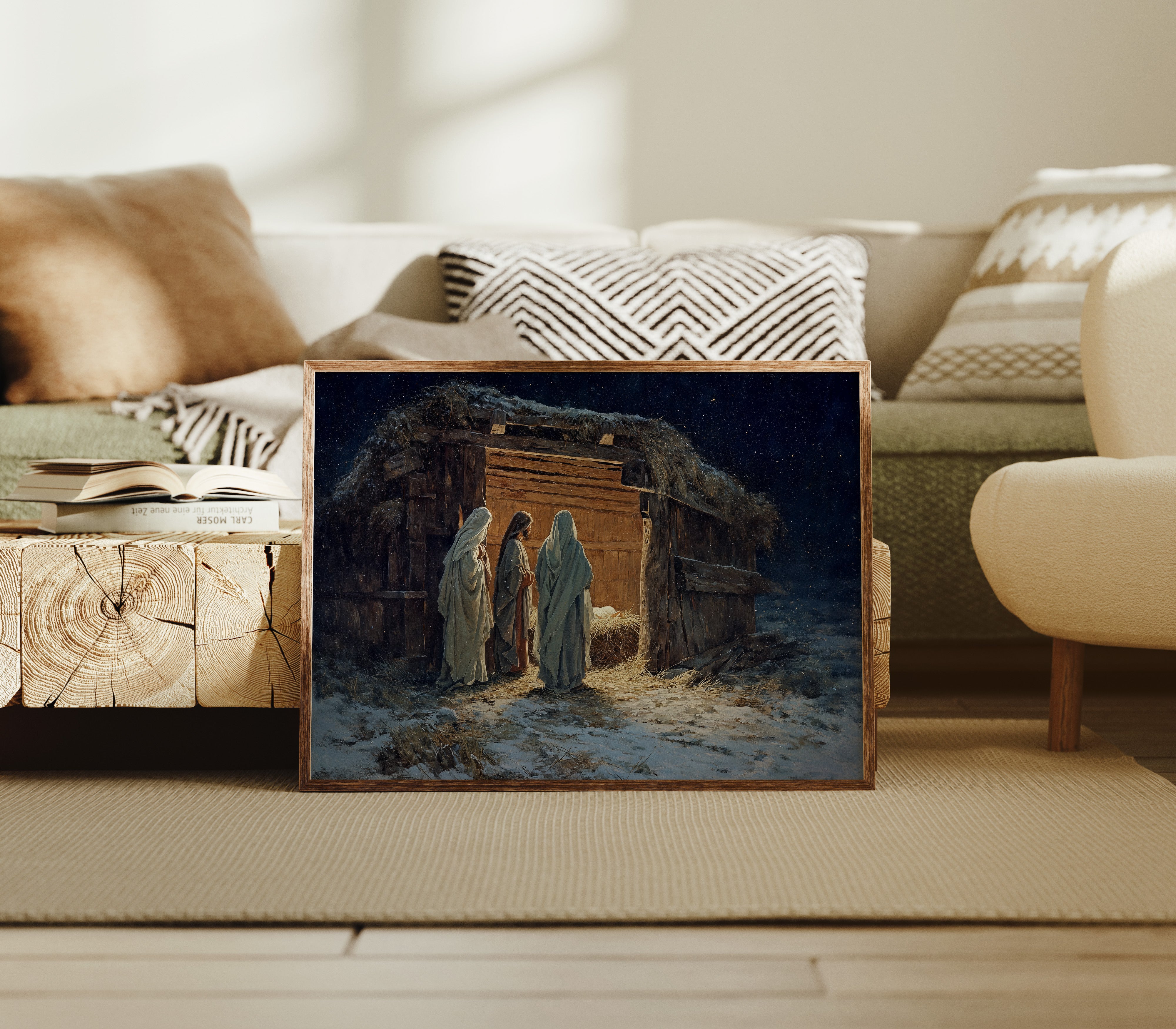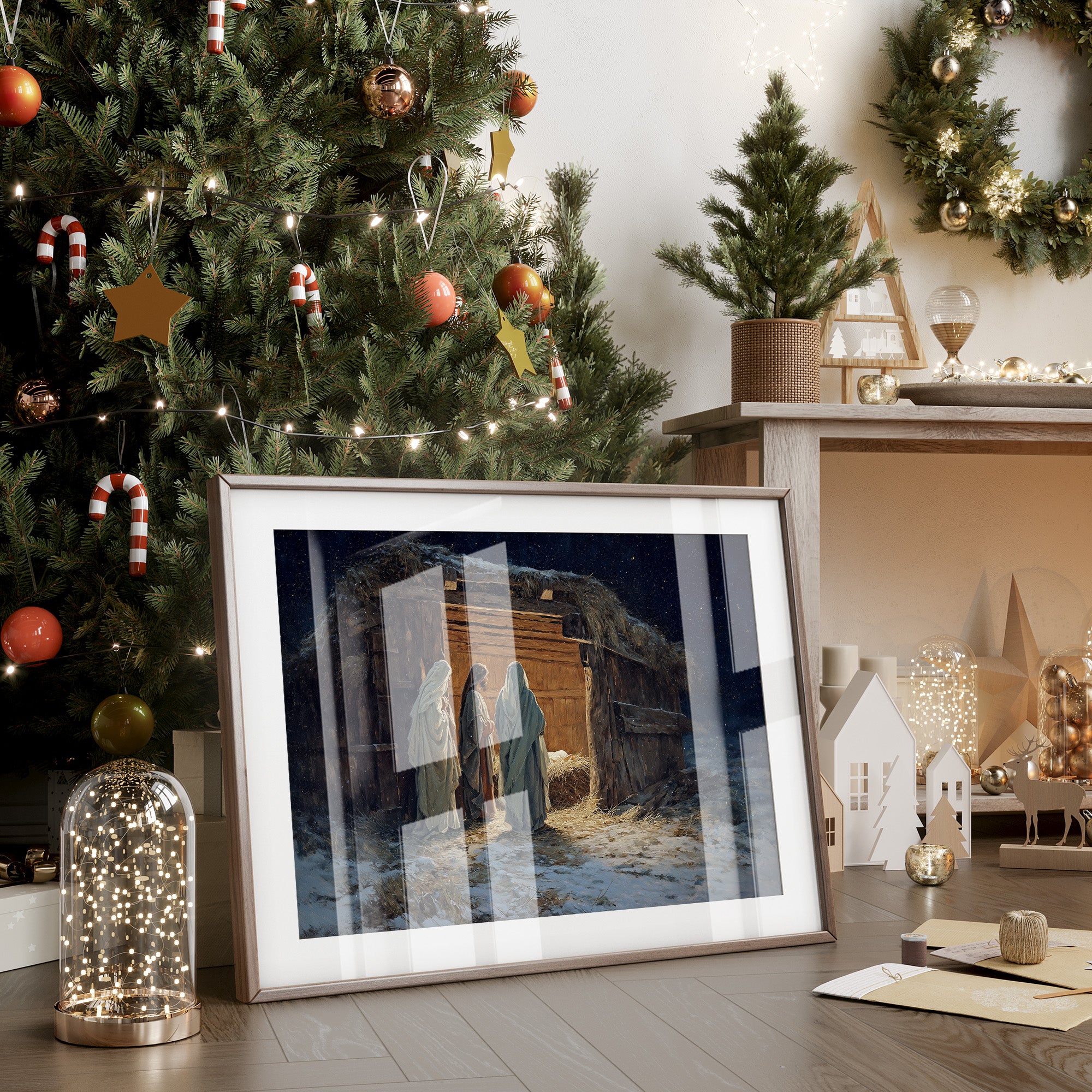 A golden glow spills from a humble doorway into the cold night, drawing three robed figures toward its warmth. The contrast between the dark starlit sky and the luminous interior creates a moment of profound anticipation. Rich textures of rough-hewn wood, weathered stone, and flowing fabric tell a story of journey and discovery, while scattered snow and twinkling stars add touches of winter magic. This contemplative scene brings a sense of reverence to any space, perfect for creating a focal point in a living room or study where quiet reflection is welcomed.