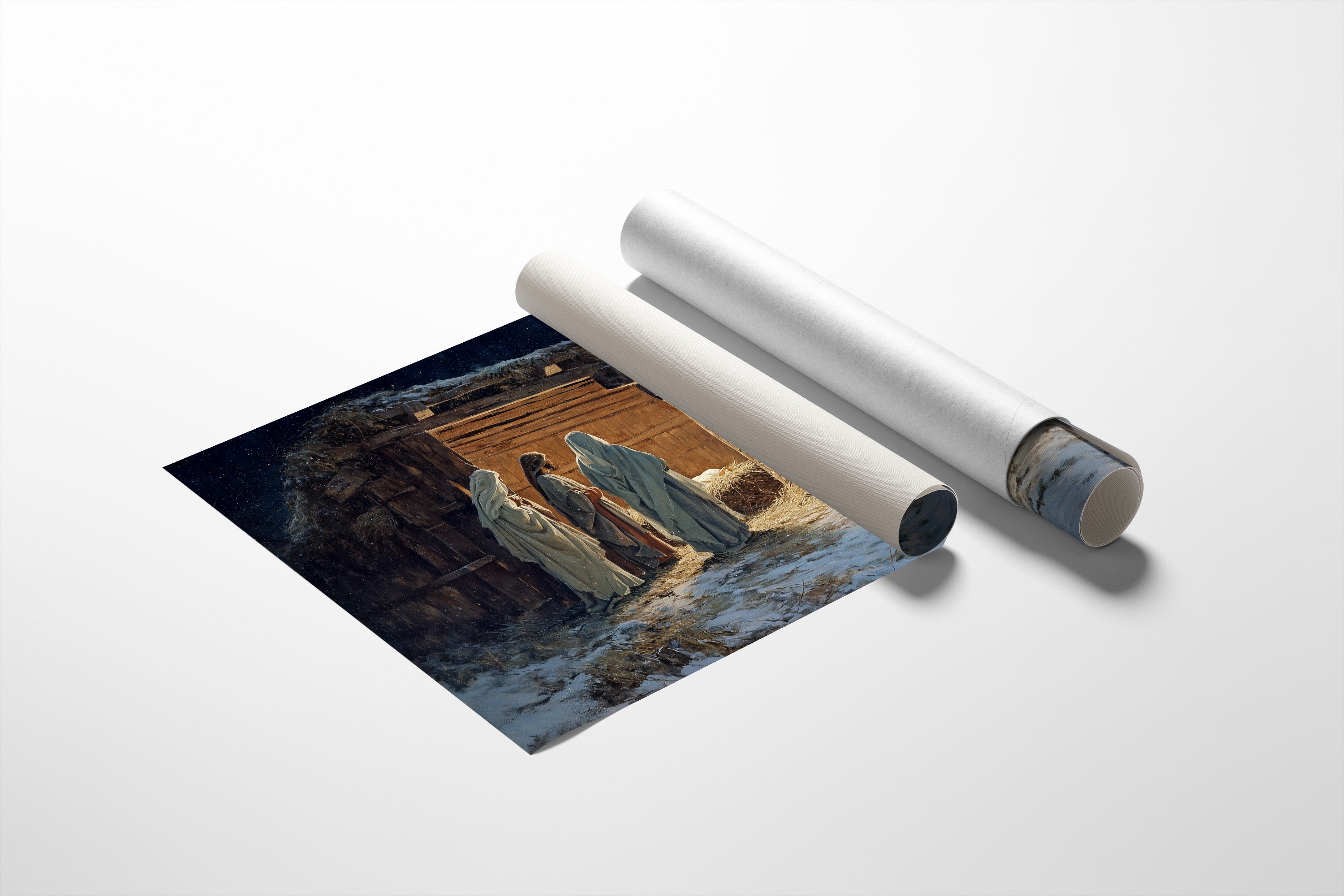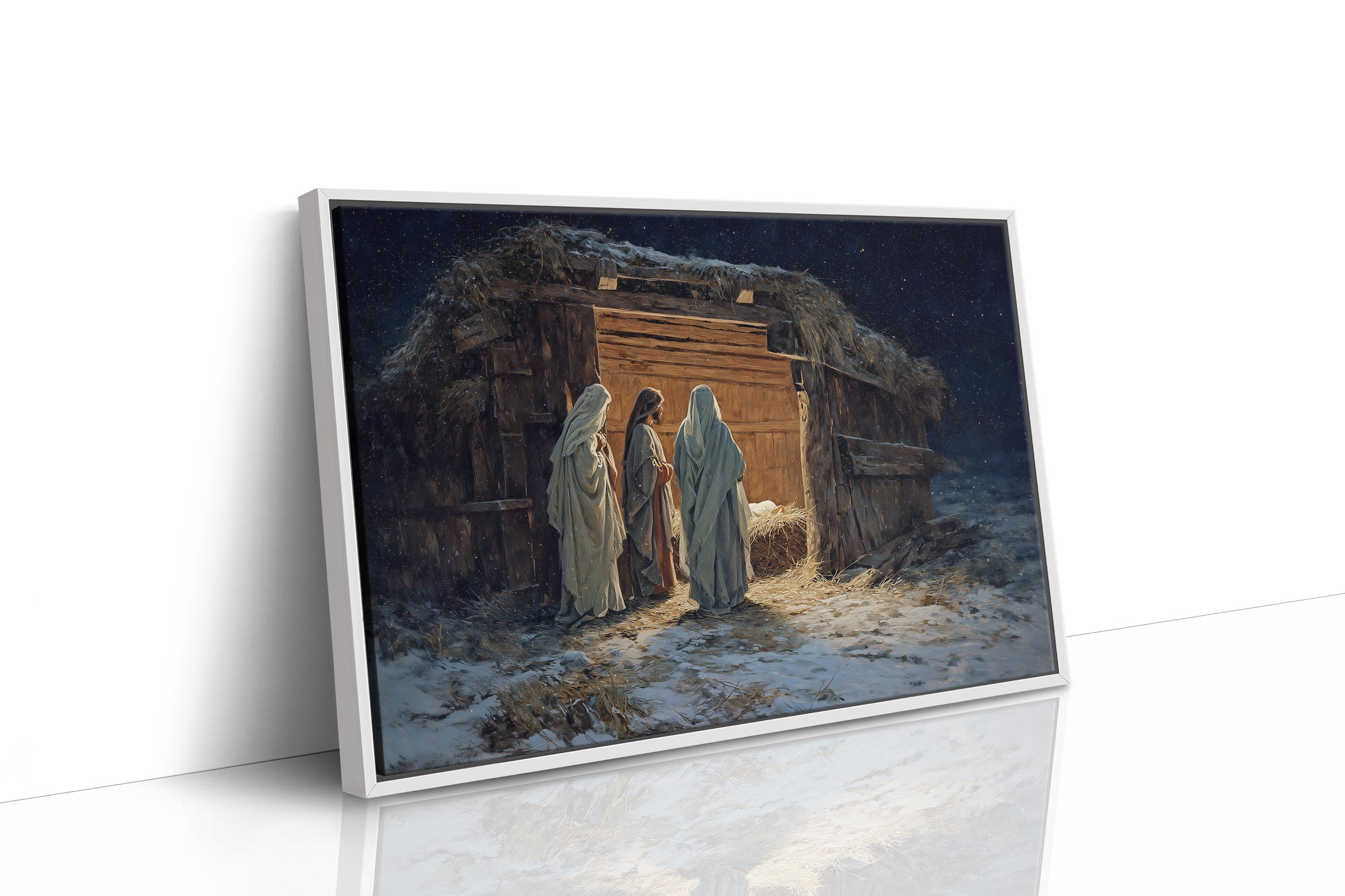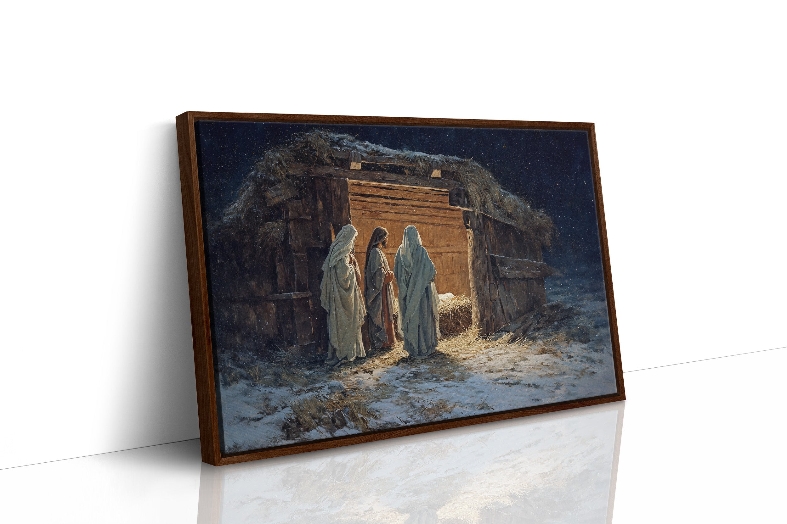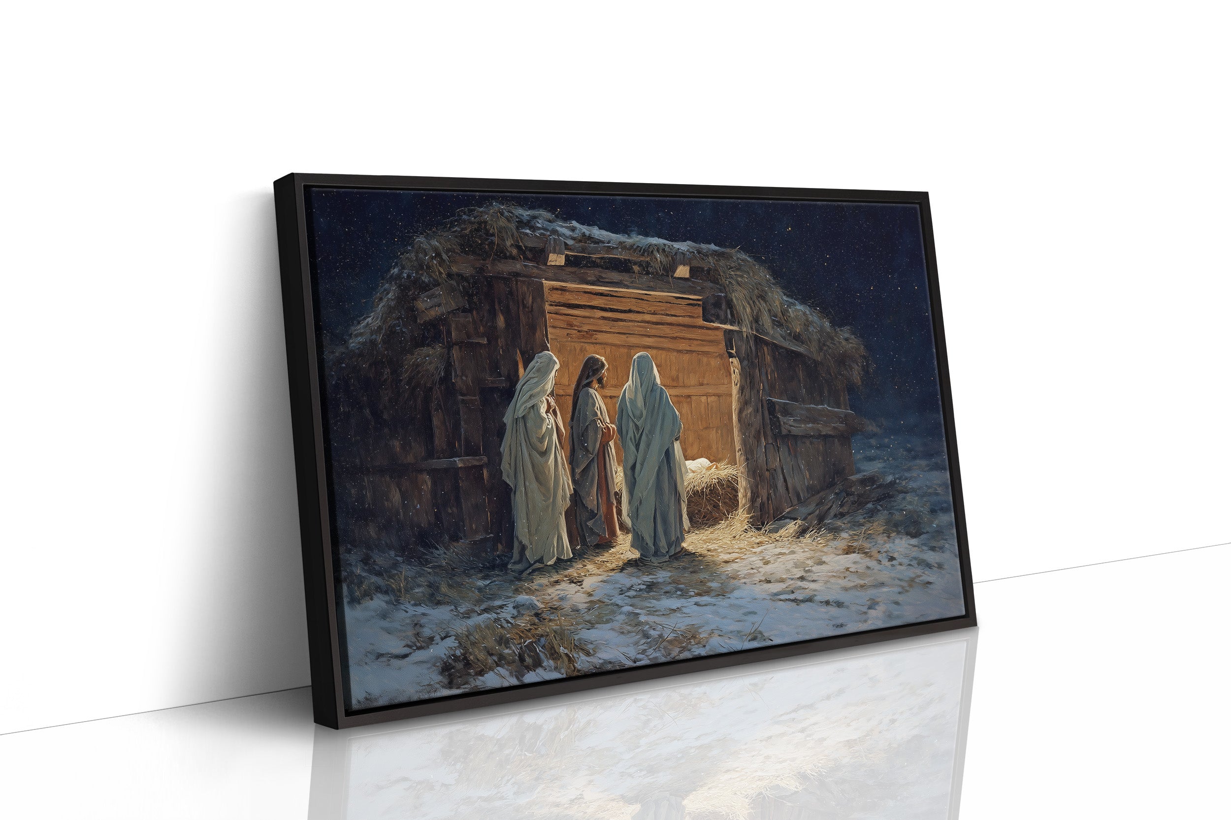 A golden glow spills from a humble doorway into the cold night, drawing three robed figures toward its warmth. The contrast between the dark starlit sky and the luminous interior creates a moment of profound anticipation. Rich textures of rough-hewn wood, weathered stone, and flowing fabric tell a story of journey and discovery, while scattered snow and twinkling stars add touches of winter magic. This contemplative scene brings a sense of reverence to any space, perfect for creating a focal point in a living room or study where quiet reflection is welcomed.