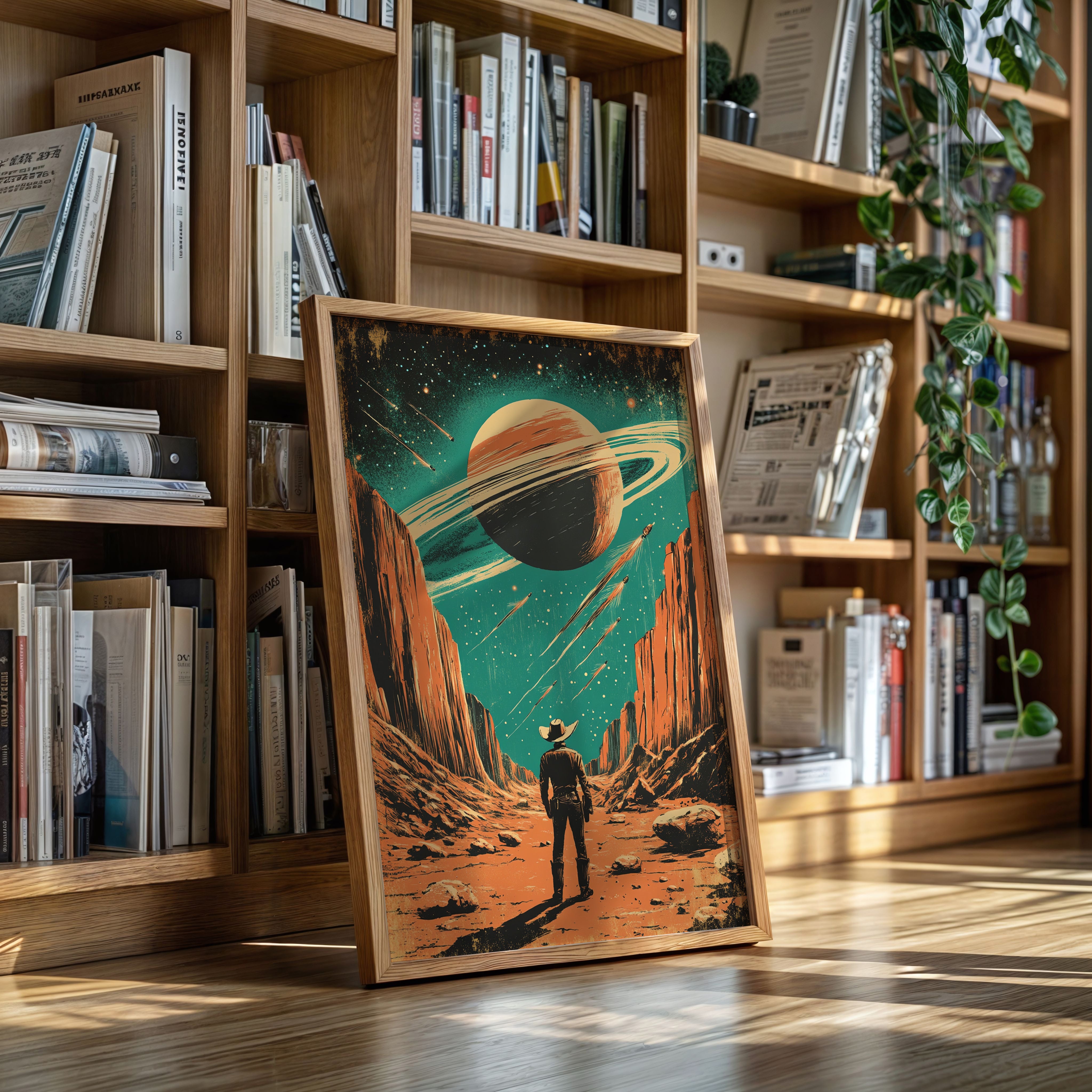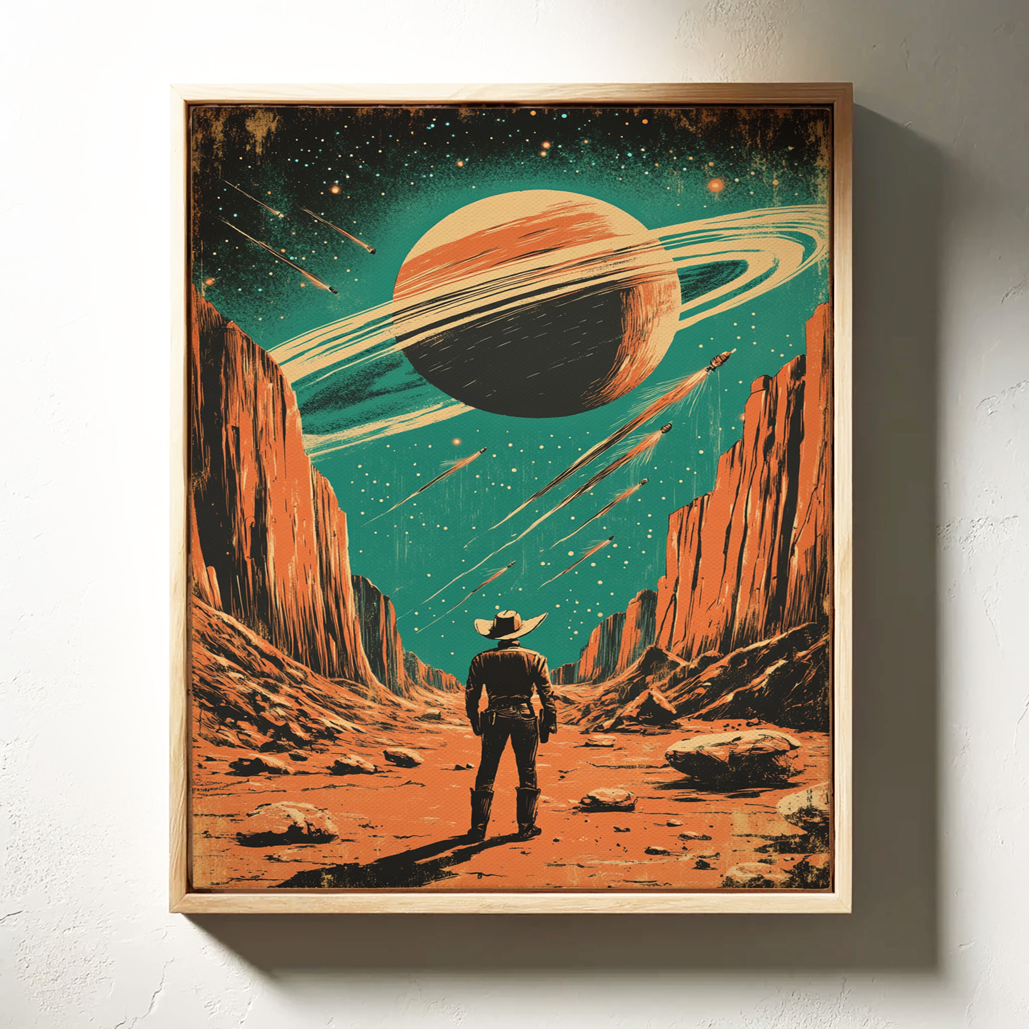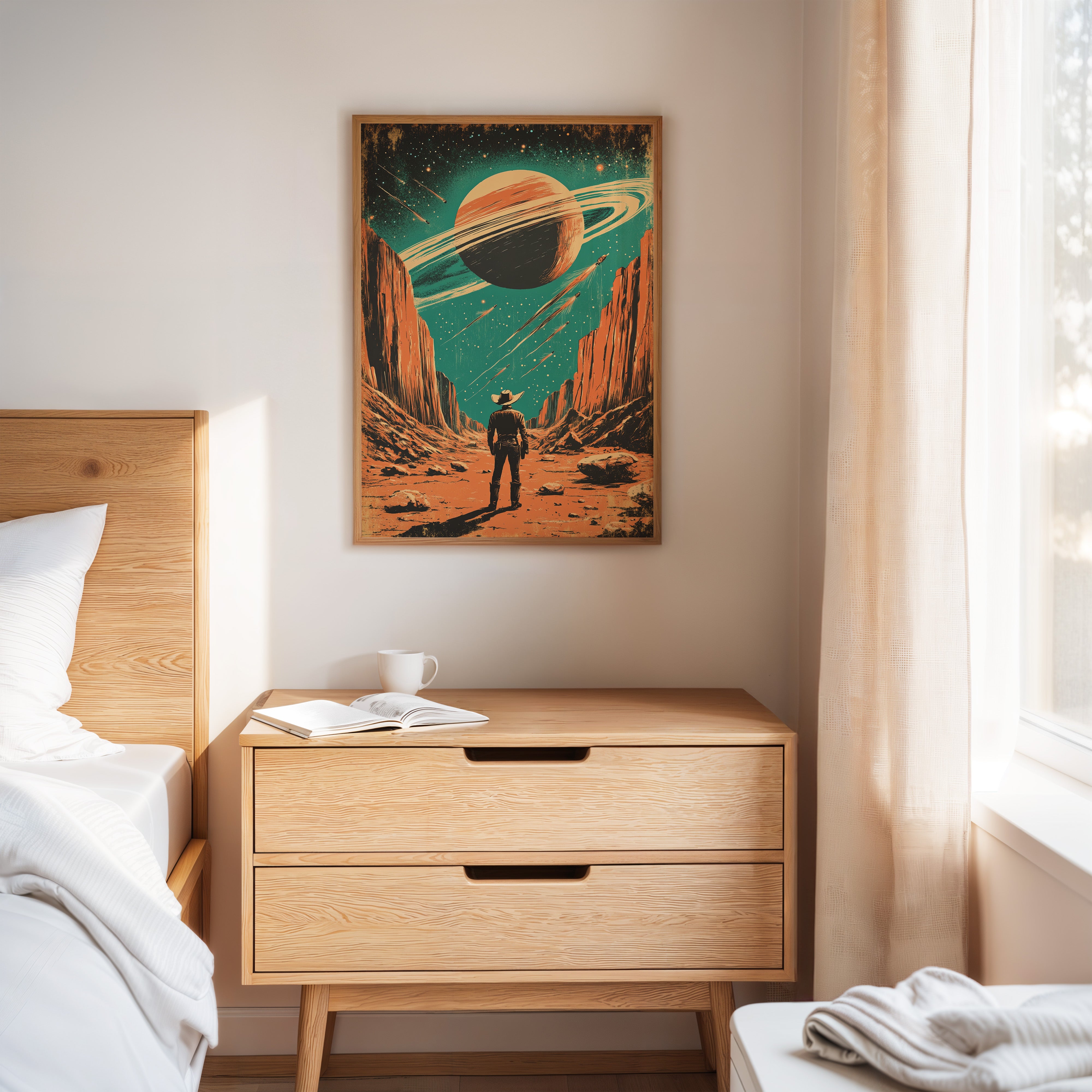 A lone figure stands beneath a cosmic sky, where planets drift like dreams across a canyon of time. Part of our Retro Futurism collection, this piece captures the essence of yesterday's tomorrow. Perfect for a study or creative space, inviting endless exploration. Each piece is crafted to inspire and captivate.