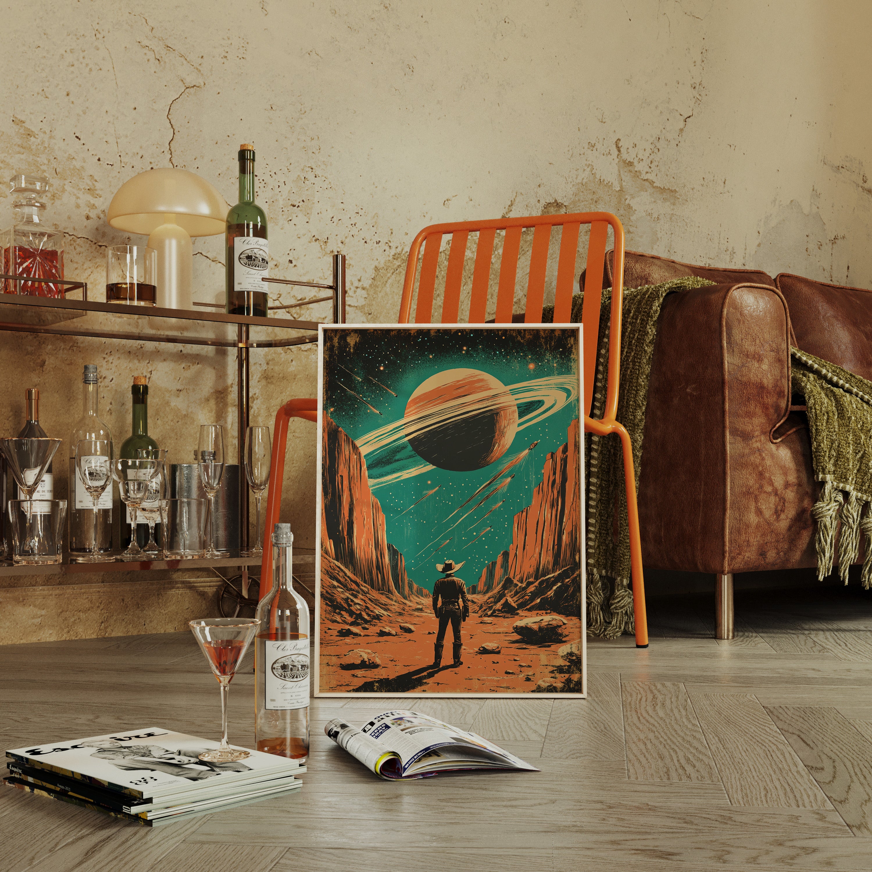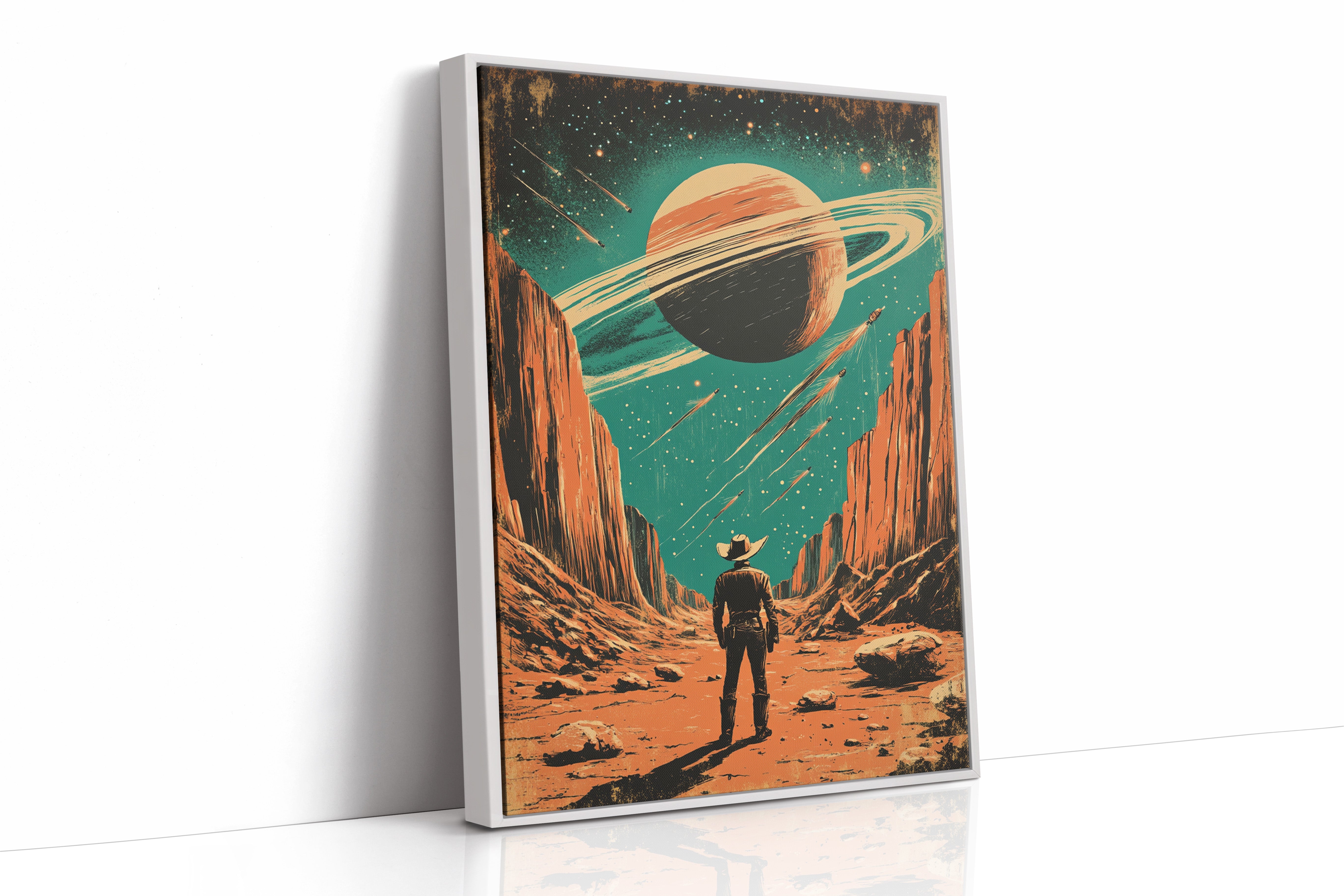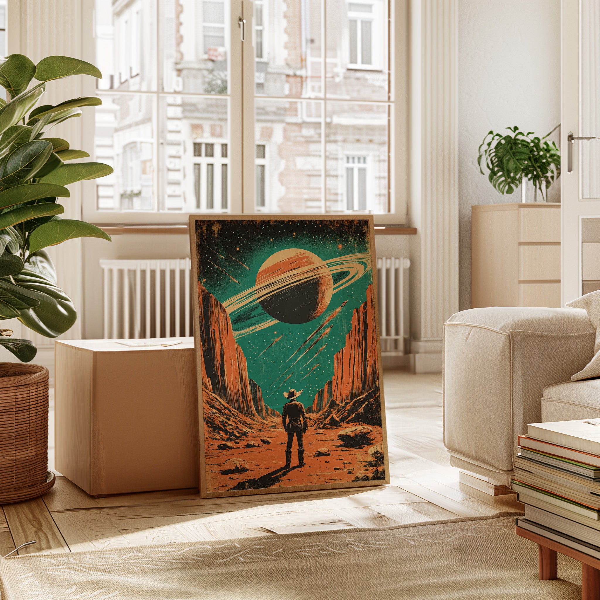 A lone figure stands beneath a cosmic sky, where planets drift like dreams across a canyon of time. Part of our Retro Futurism collection, this piece captures the essence of yesterday's tomorrow. Perfect for a study or creative space, inviting endless exploration. Each piece is crafted to inspire and captivate.