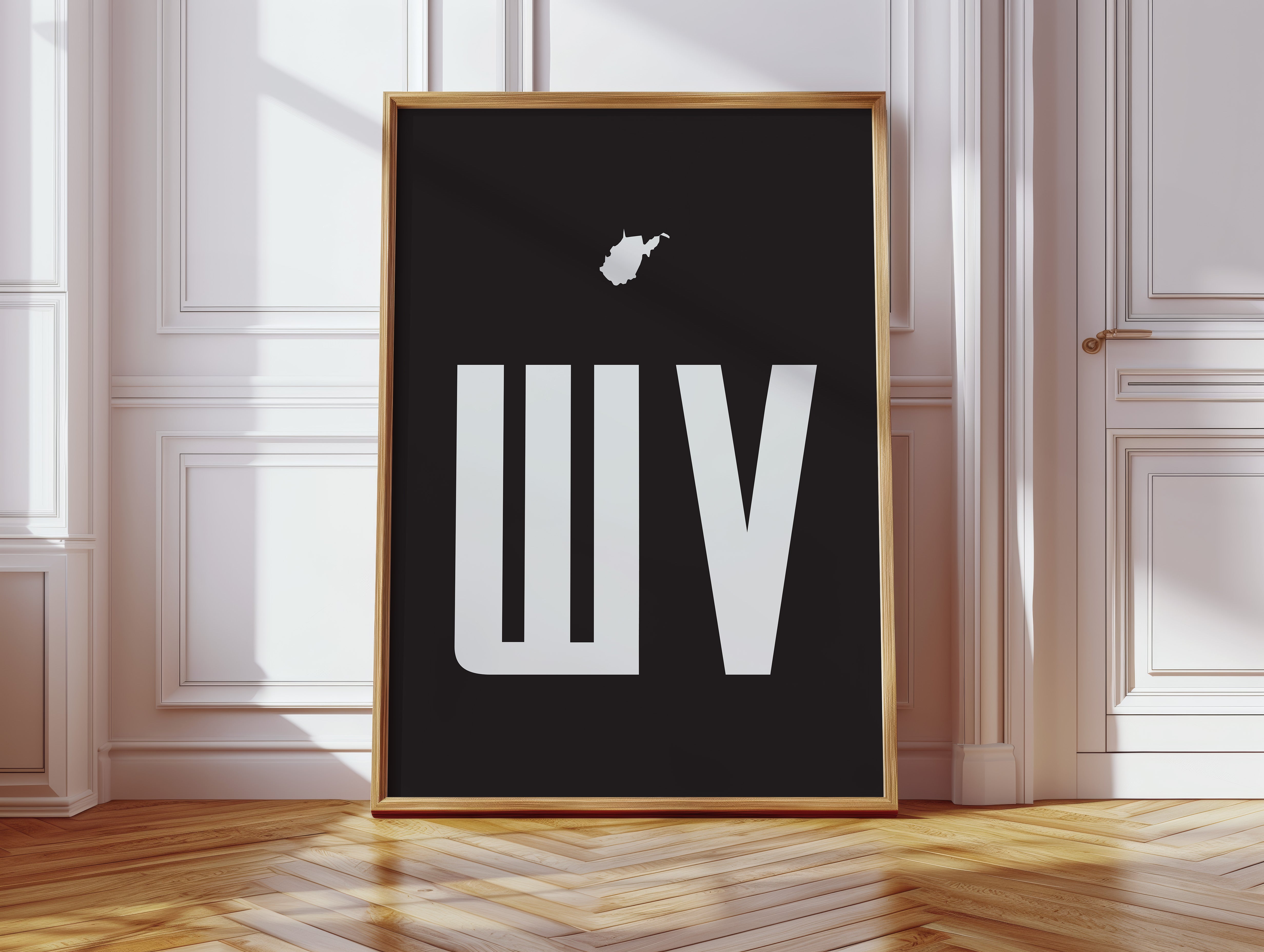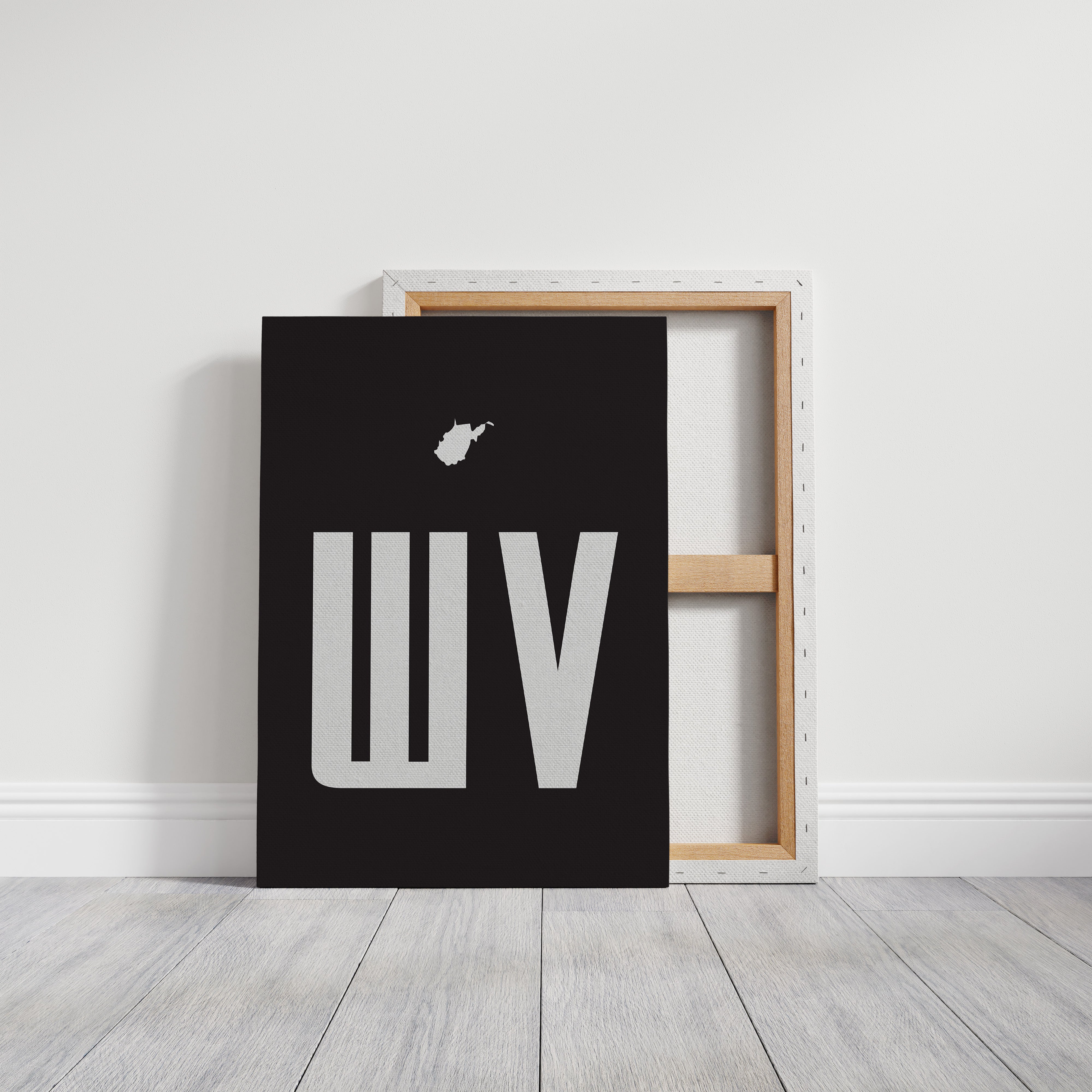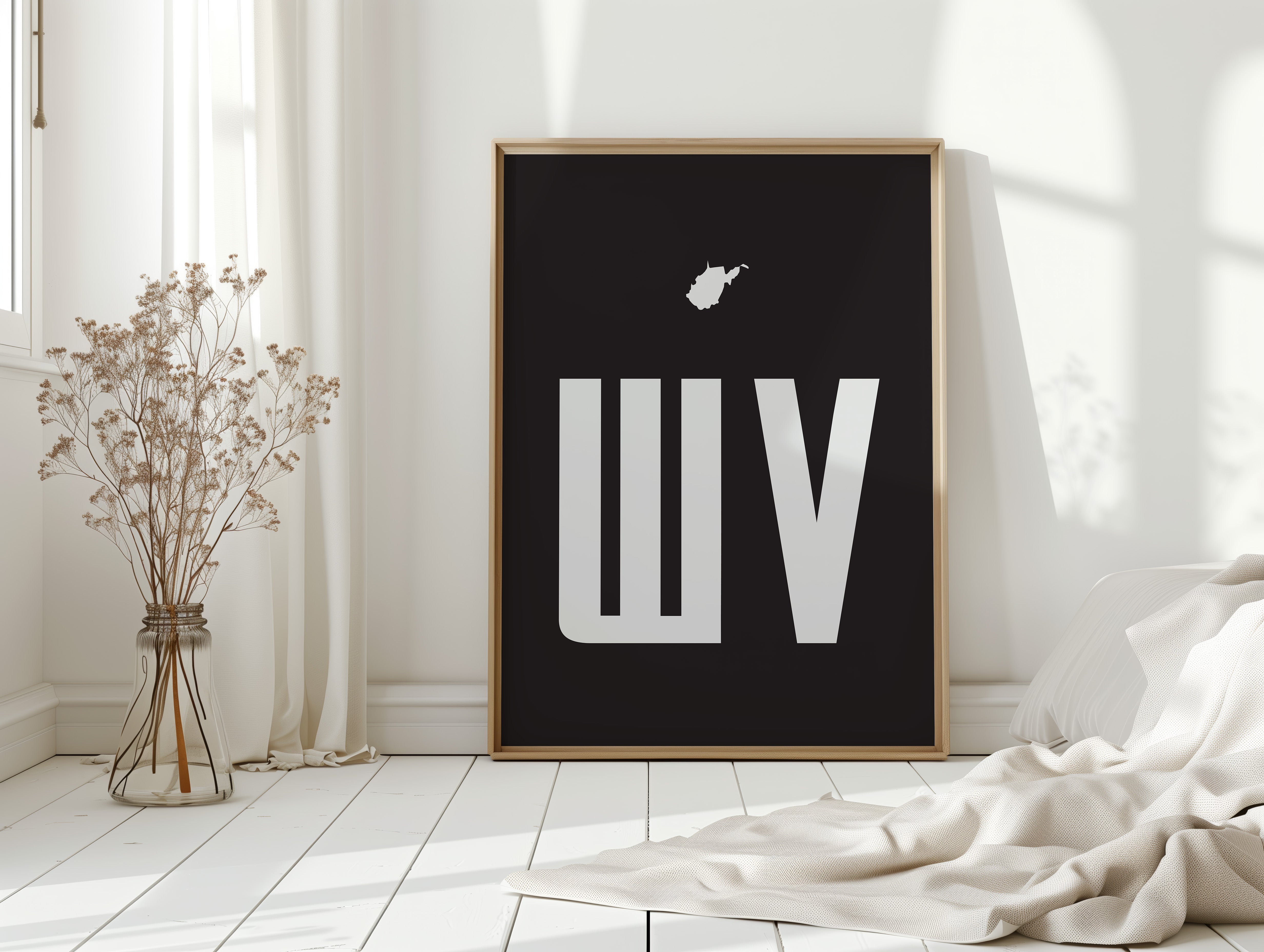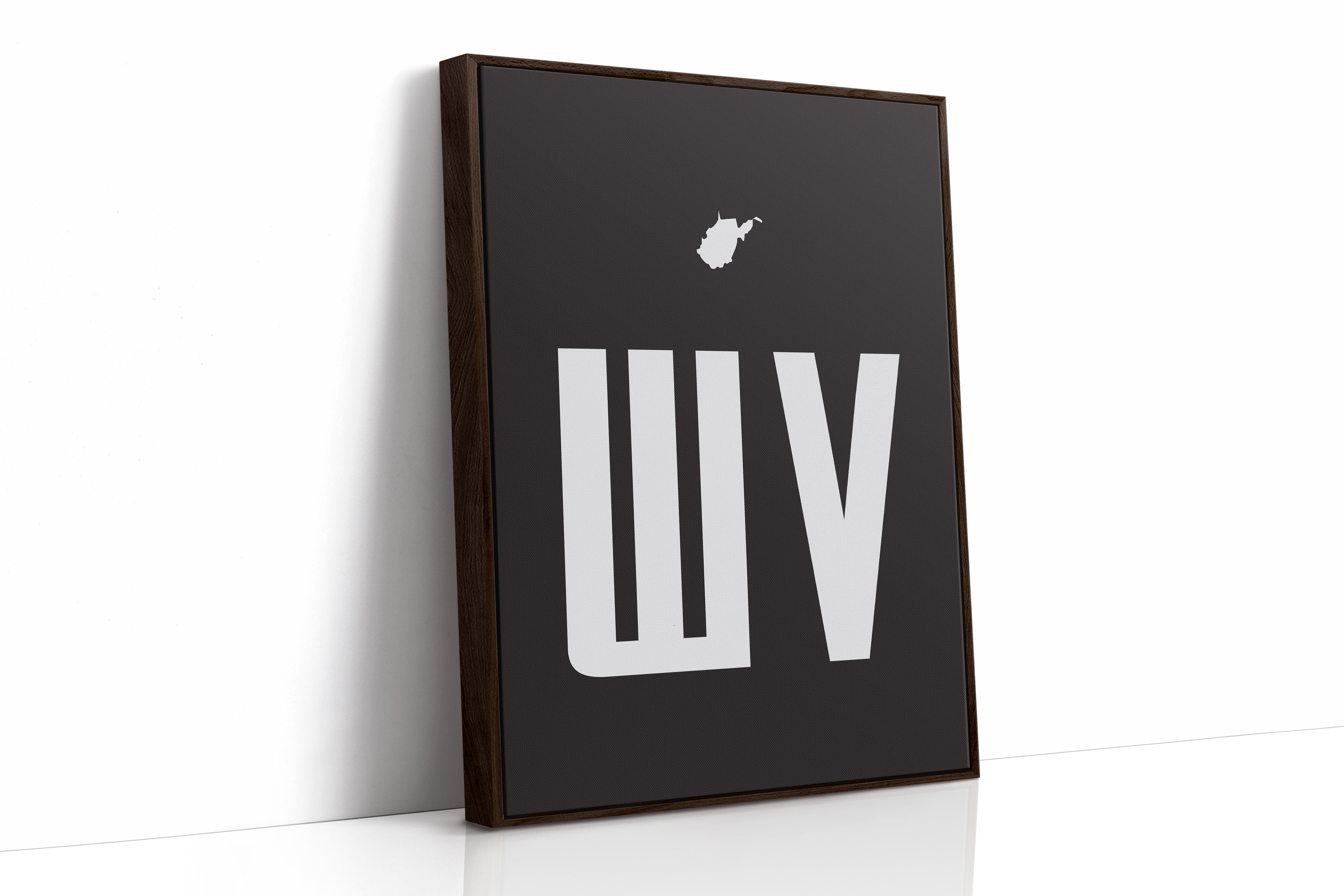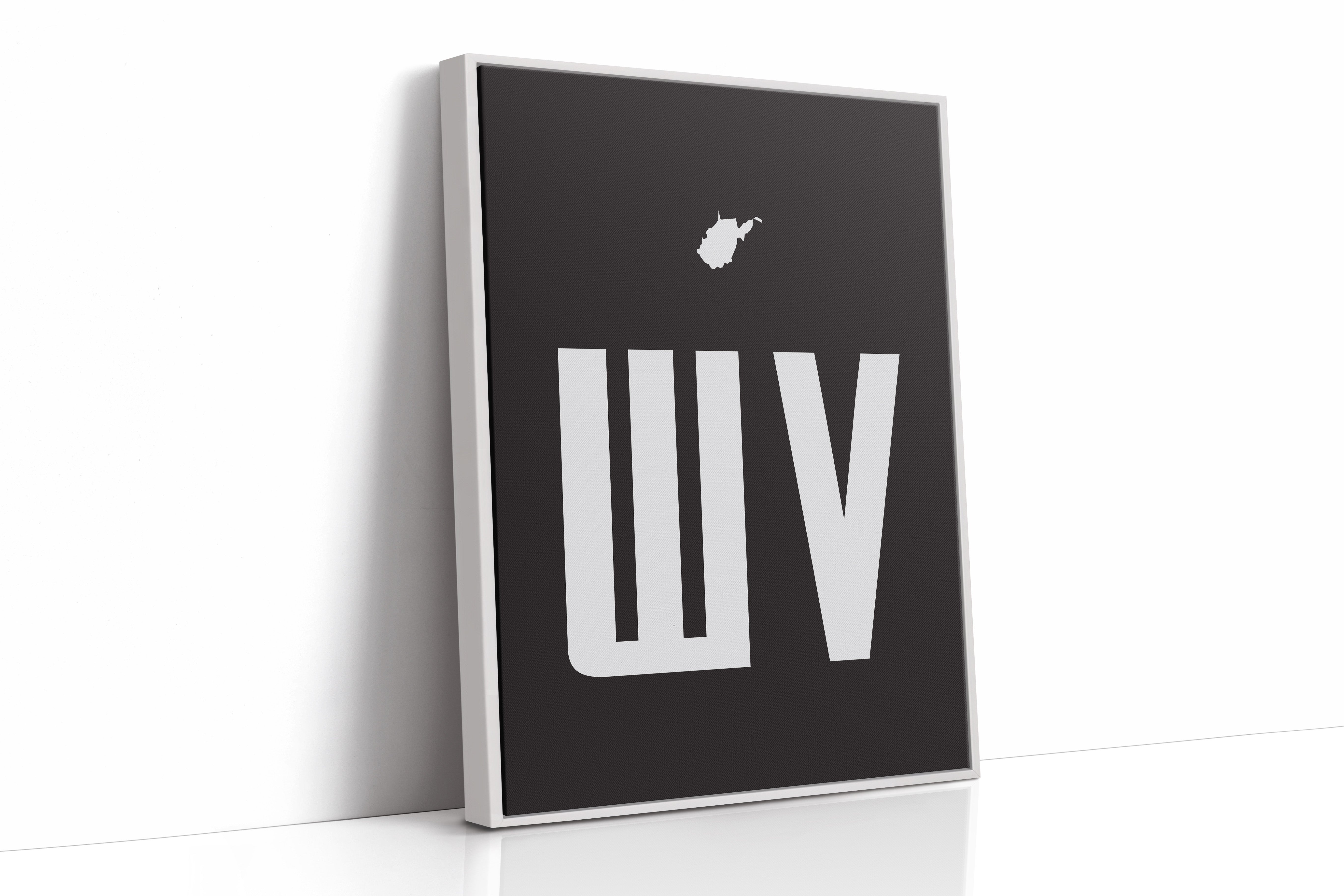 A stark contrast emerges between white and black, where bold typography meets state silhouette in elegant minimalism. The clean lines of ""WV"" stand proudly beneath West Virginia's distinctive shape, creating a powerful visual statement about place and identity. The composition speaks to both modernist design principles and regional pride, with negative space playing as crucial a role as the positive elements. This piece marries geometric precision with geographical significance, offering a sophisticated take on state pride. The crisp edges and thoughtful spacing demonstrate masterful restraint in design, while the state silhouette adds a personal, localized touch to the contemporary aesthetic. This striking piece would command attention in a modern office space or add sophisticated regional flair to a minimalist living room.