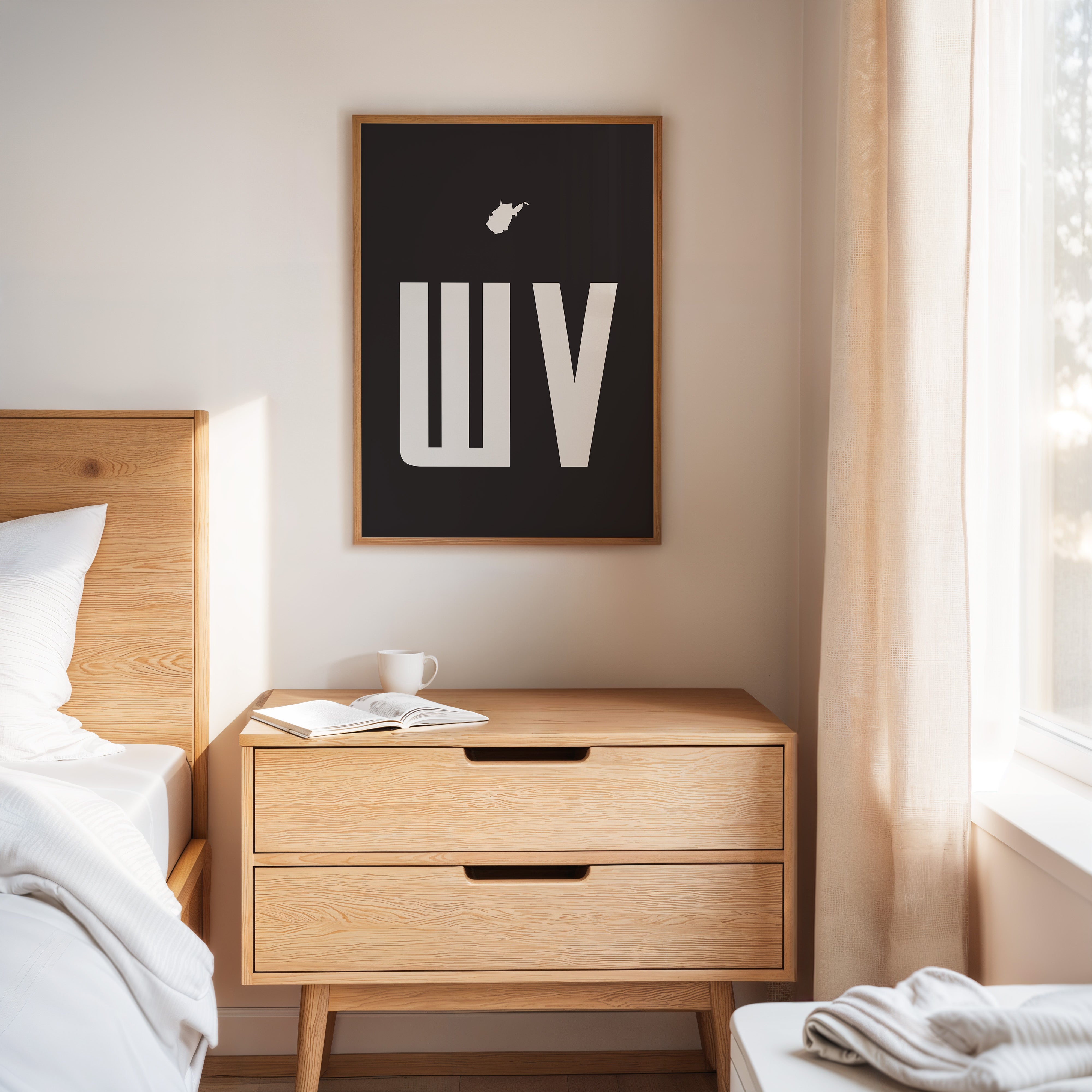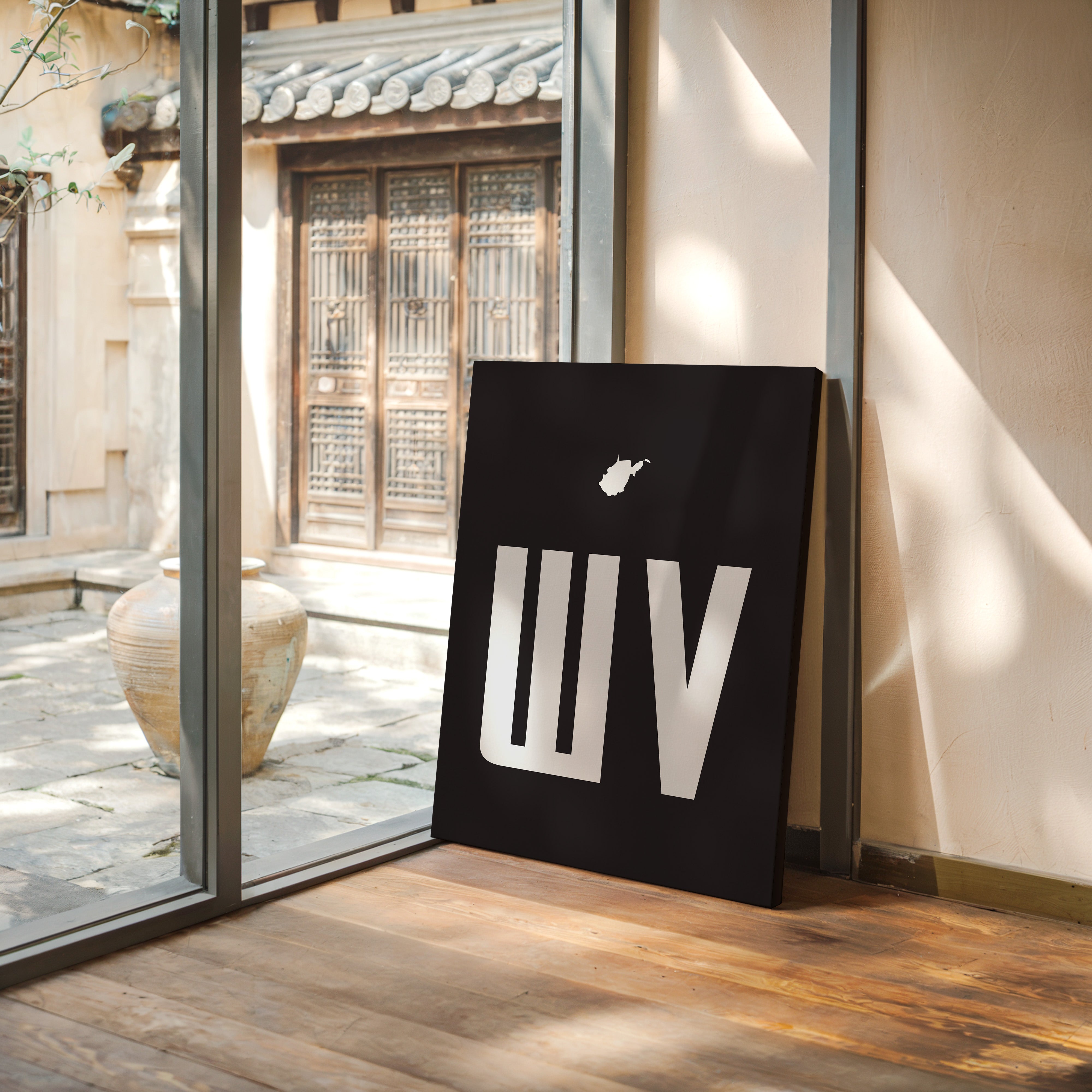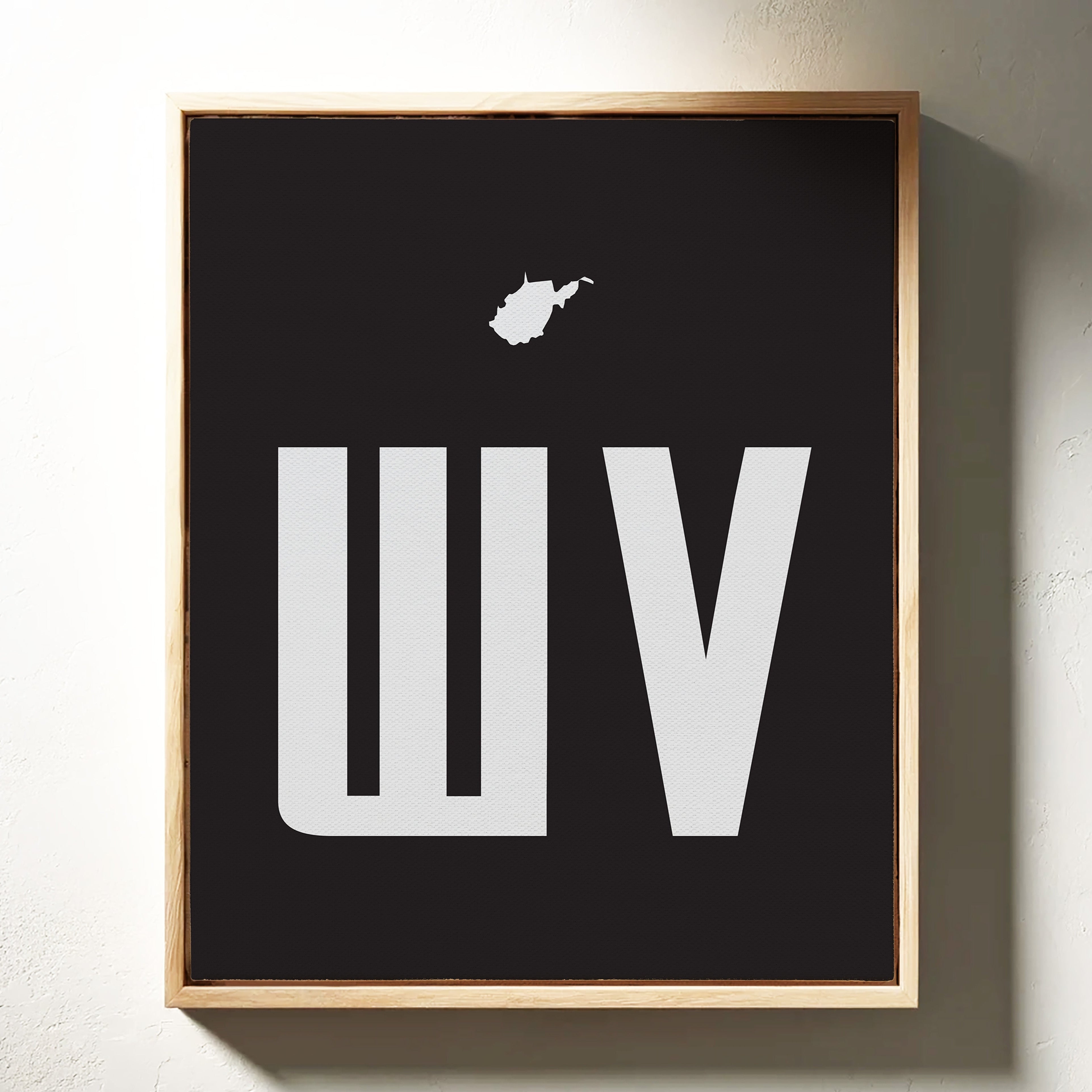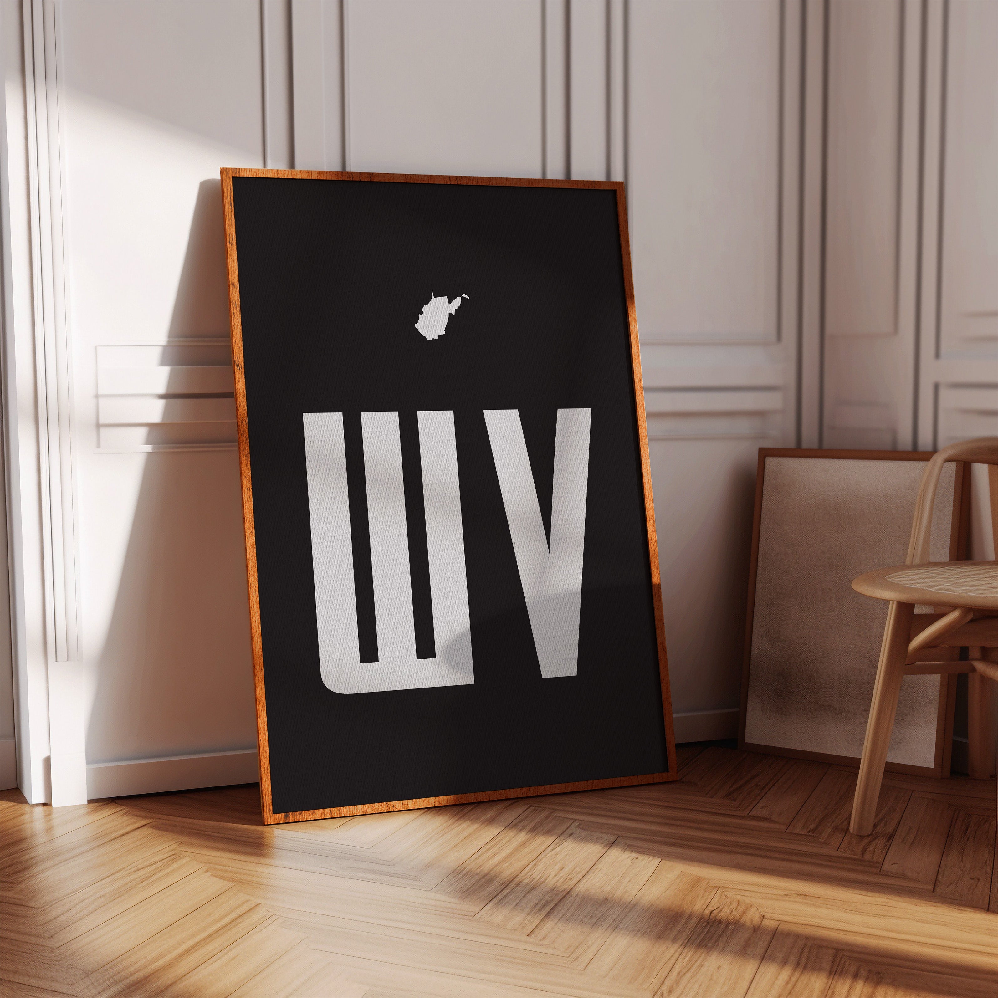 A stark contrast emerges between white and black, where bold typography meets state silhouette in elegant minimalism. The clean lines of ""WV"" stand proudly beneath West Virginia's distinctive shape, creating a powerful visual statement about place and identity. The composition speaks to both modernist design principles and regional pride, with negative space playing as crucial a role as the positive elements. This piece marries geometric precision with geographical significance, offering a sophisticated take on state pride. The crisp edges and thoughtful spacing demonstrate masterful restraint in design, while the state silhouette adds a personal, localized touch to the contemporary aesthetic. This striking piece would command attention in a modern office space or add sophisticated regional flair to a minimalist living room.