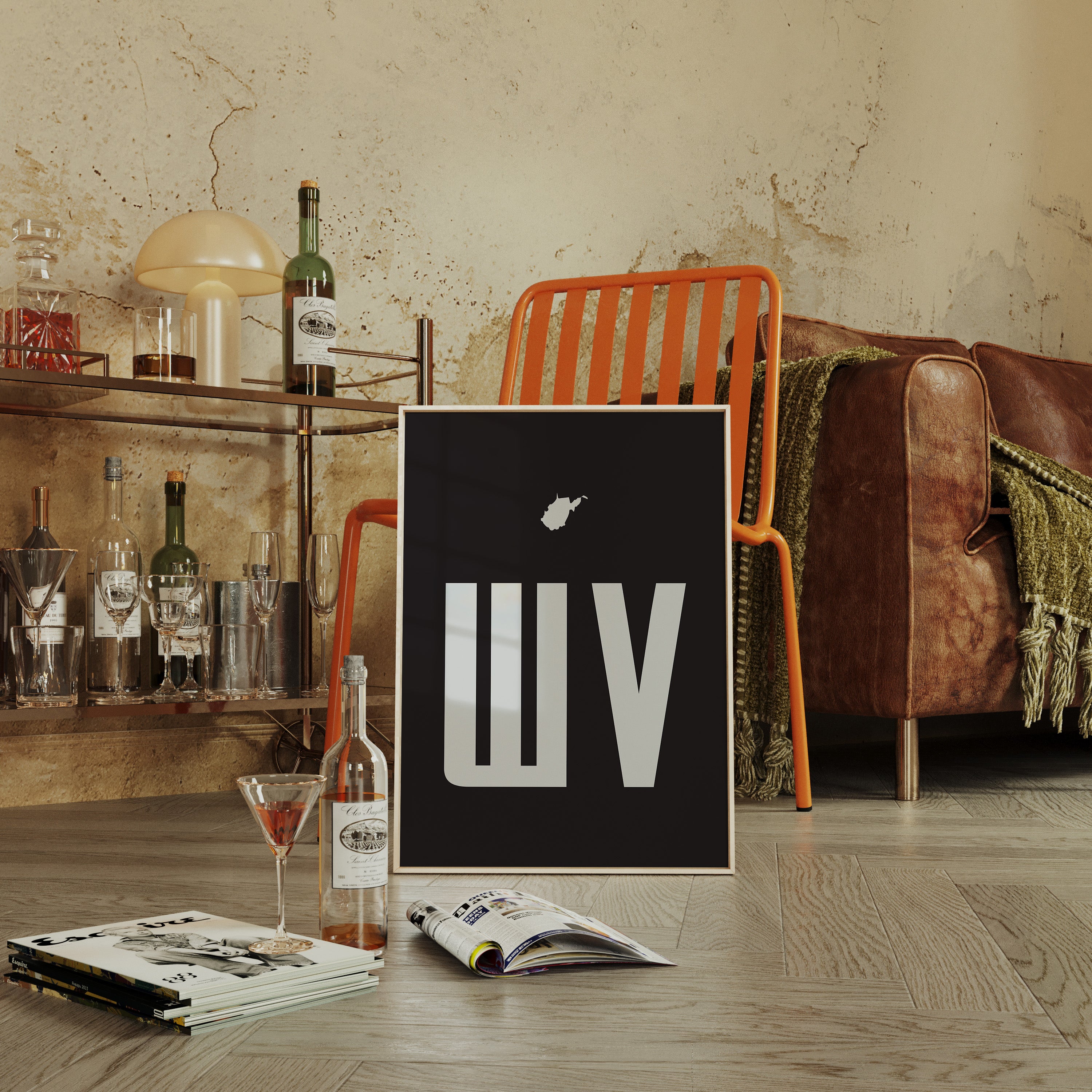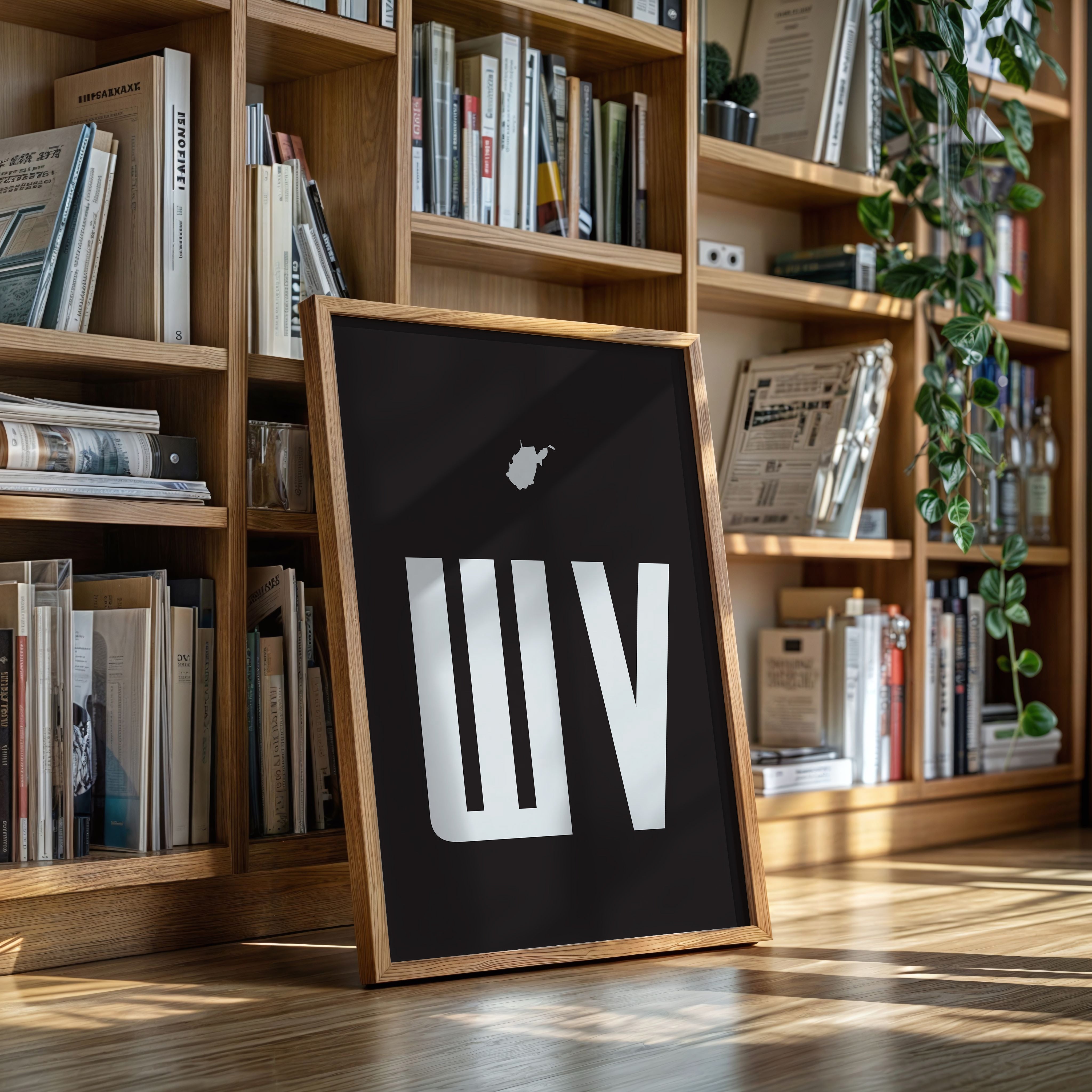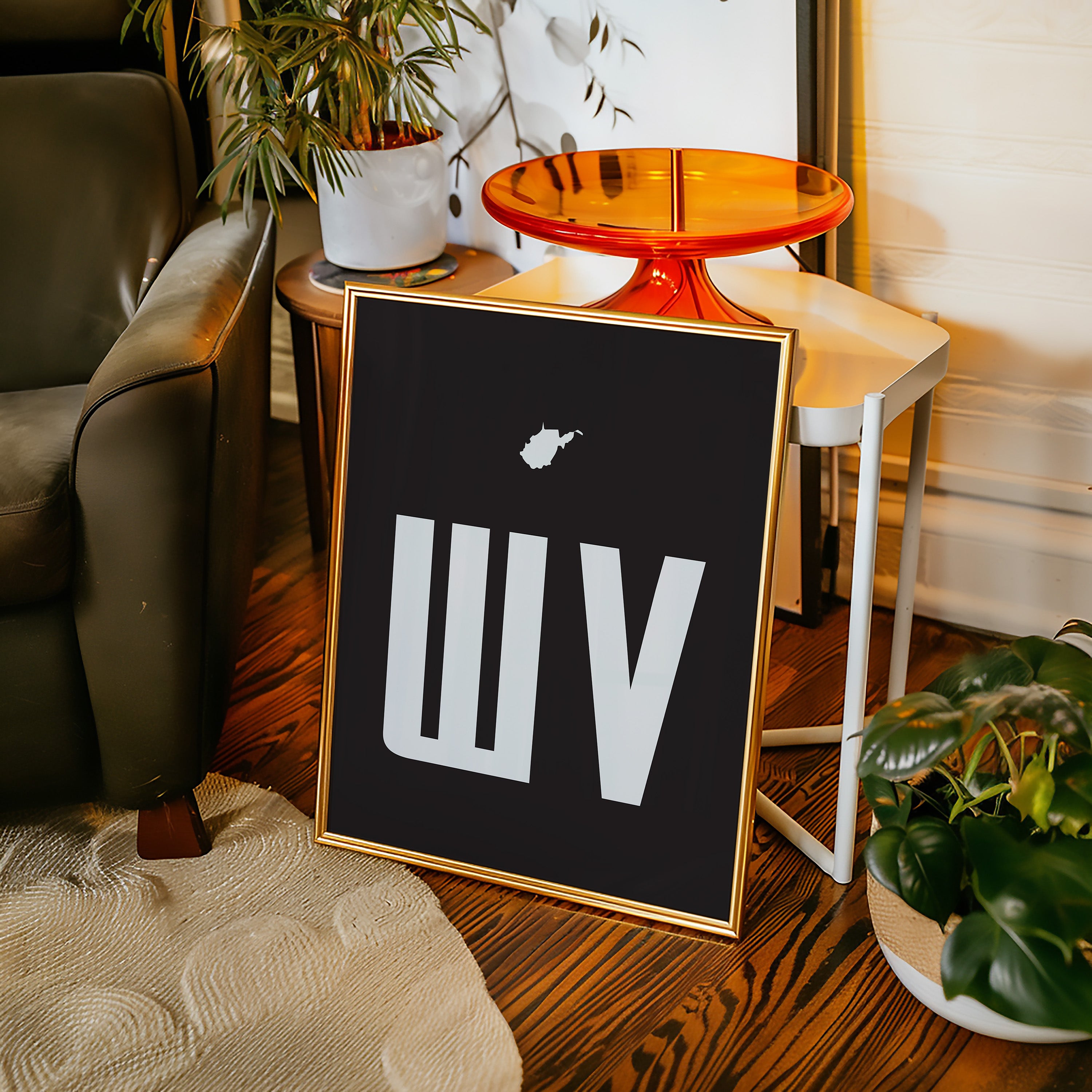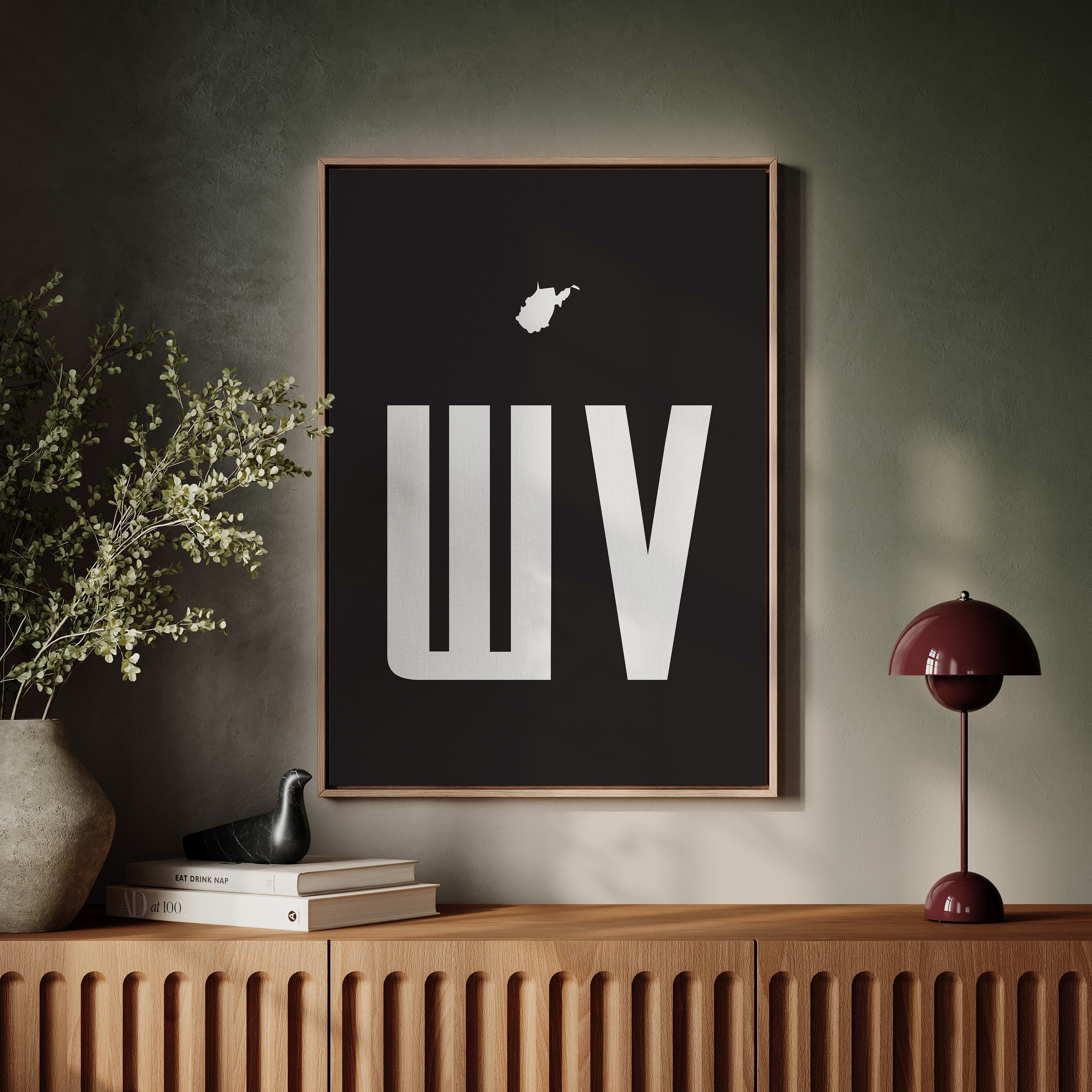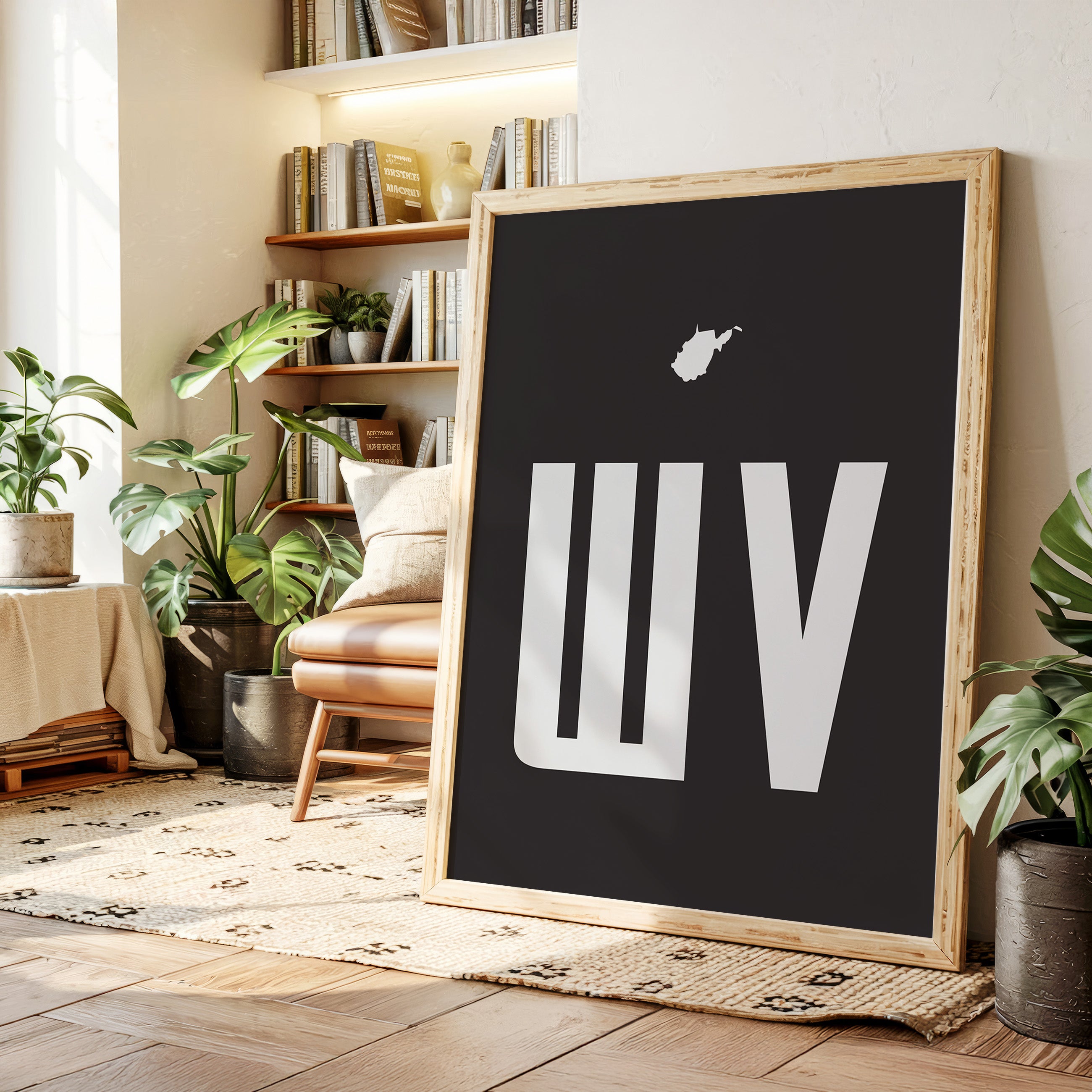 A stark contrast emerges between white and black, where bold typography meets state silhouette in elegant minimalism. The clean lines of ""WV"" stand proudly beneath West Virginia's distinctive shape, creating a powerful visual statement about place and identity. The composition speaks to both modernist design principles and regional pride, with negative space playing as crucial a role as the positive elements. This piece marries geometric precision with geographical significance, offering a sophisticated take on state pride. The crisp edges and thoughtful spacing demonstrate masterful restraint in design, while the state silhouette adds a personal, localized touch to the contemporary aesthetic. This striking piece would command attention in a modern office space or add sophisticated regional flair to a minimalist living room.