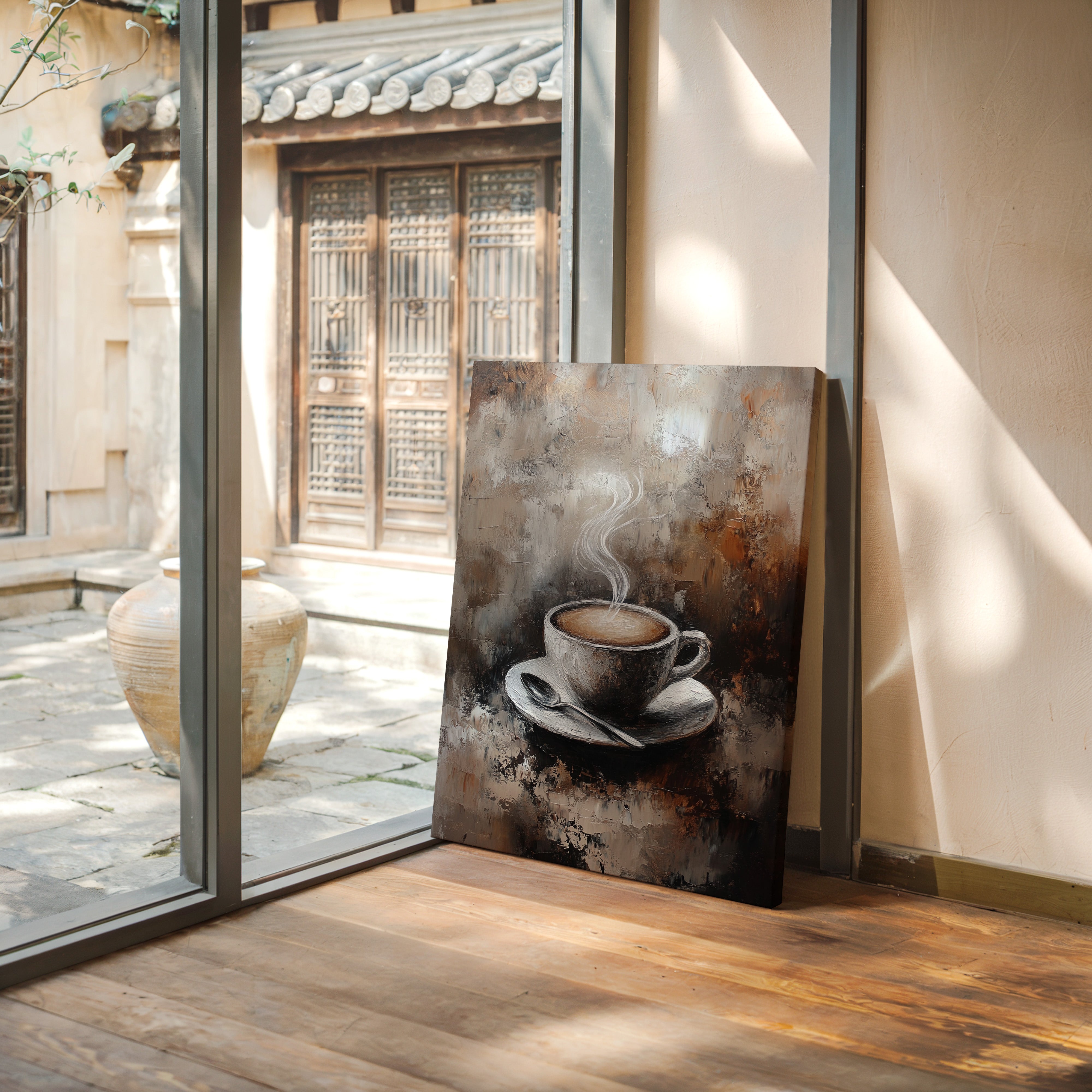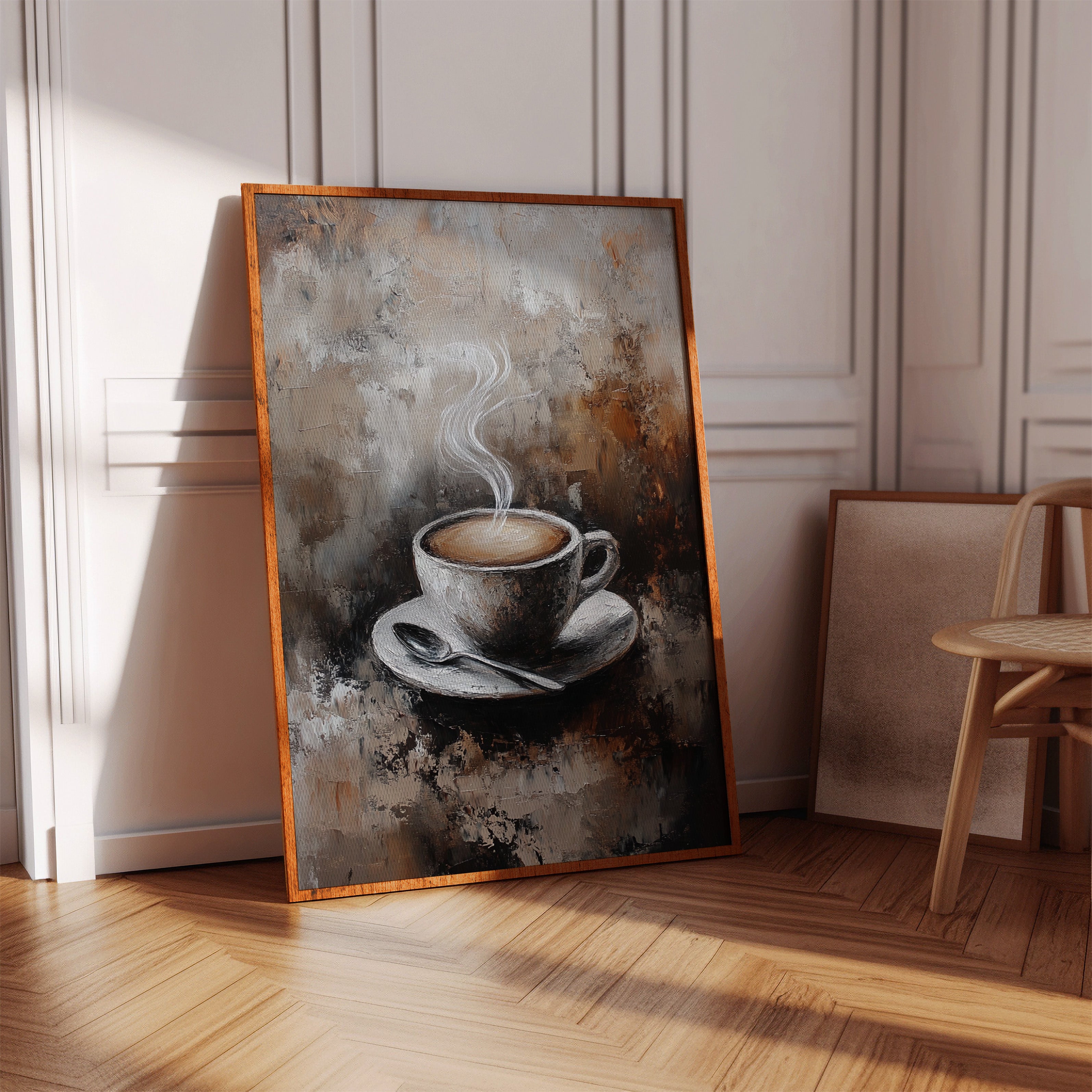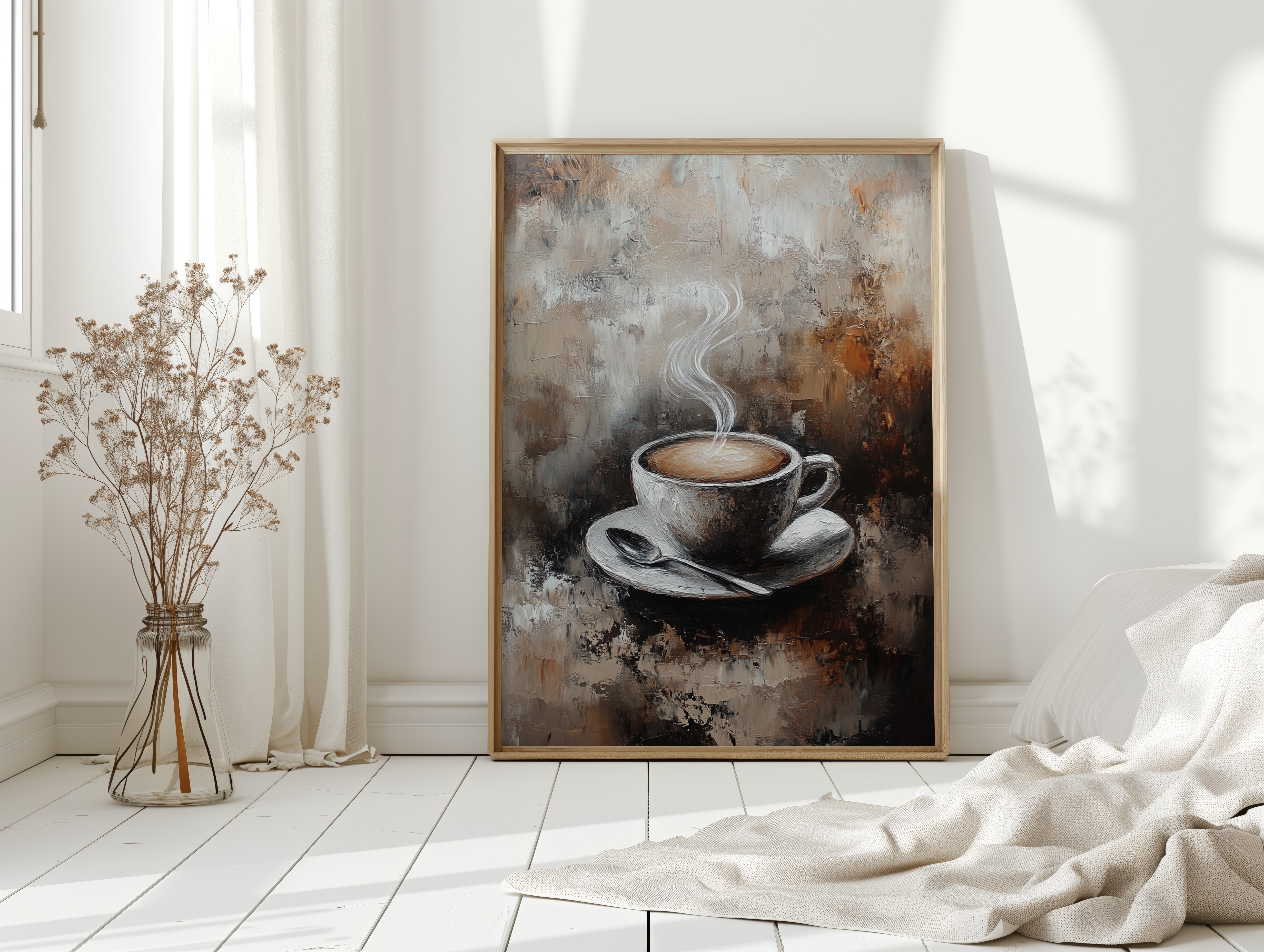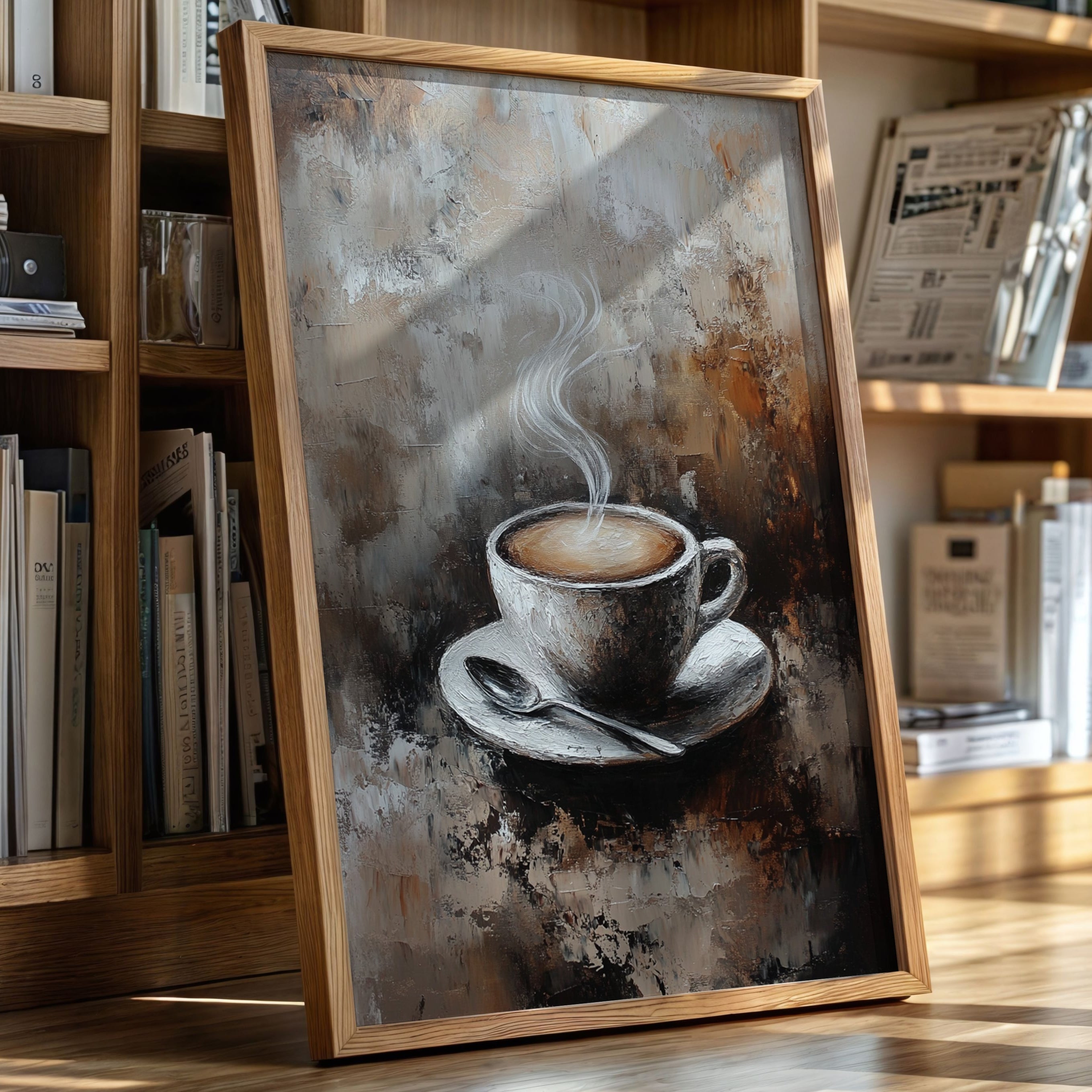 Inspired by the rich textures and earthy tones of a rustic cafe, the artist employs thick brushstrokes and a muted palette to evoke the cozy ambiance of your favorite coffee nook. The steam rising from the cup is a dance of elegance and simplicity, inviting you to savor each moment.