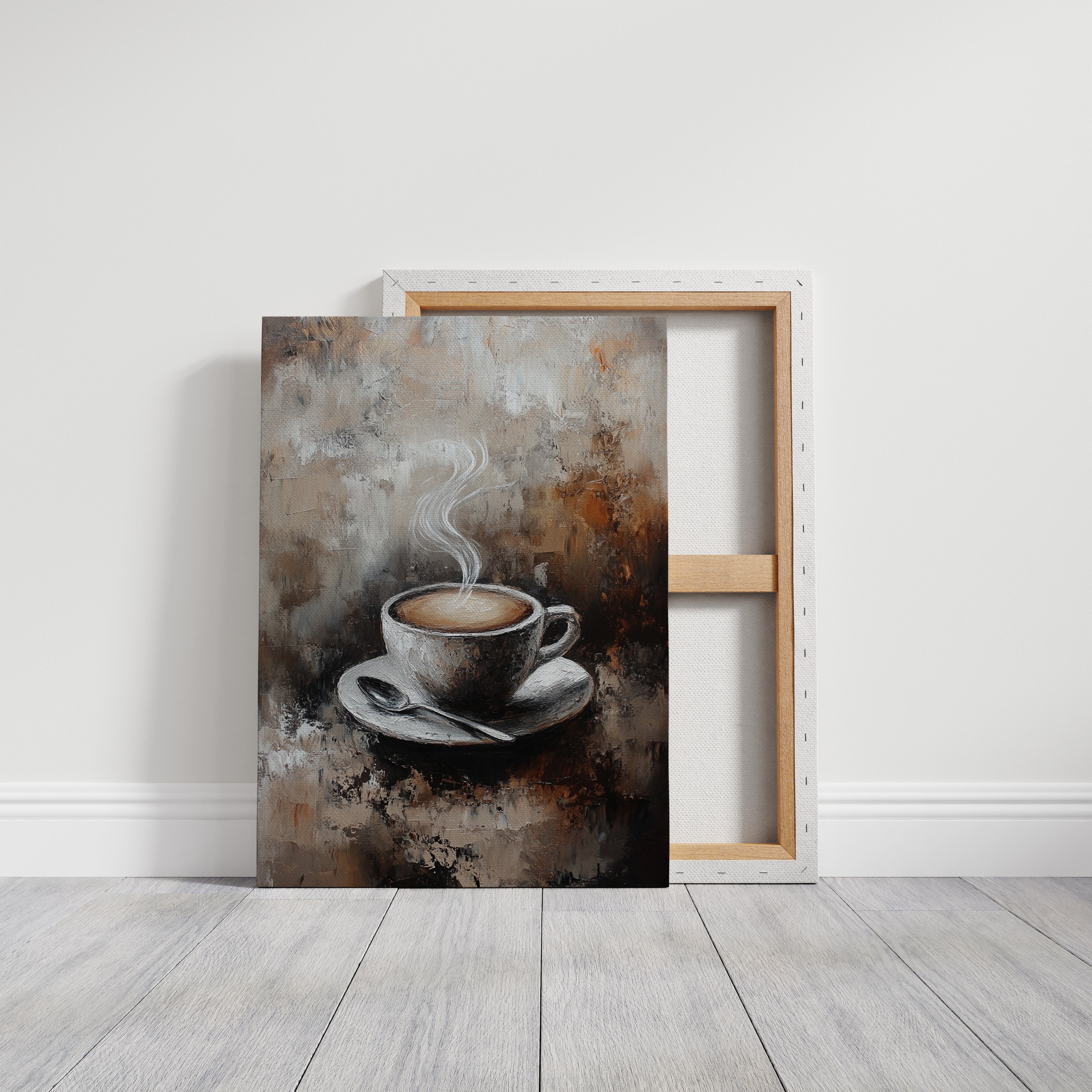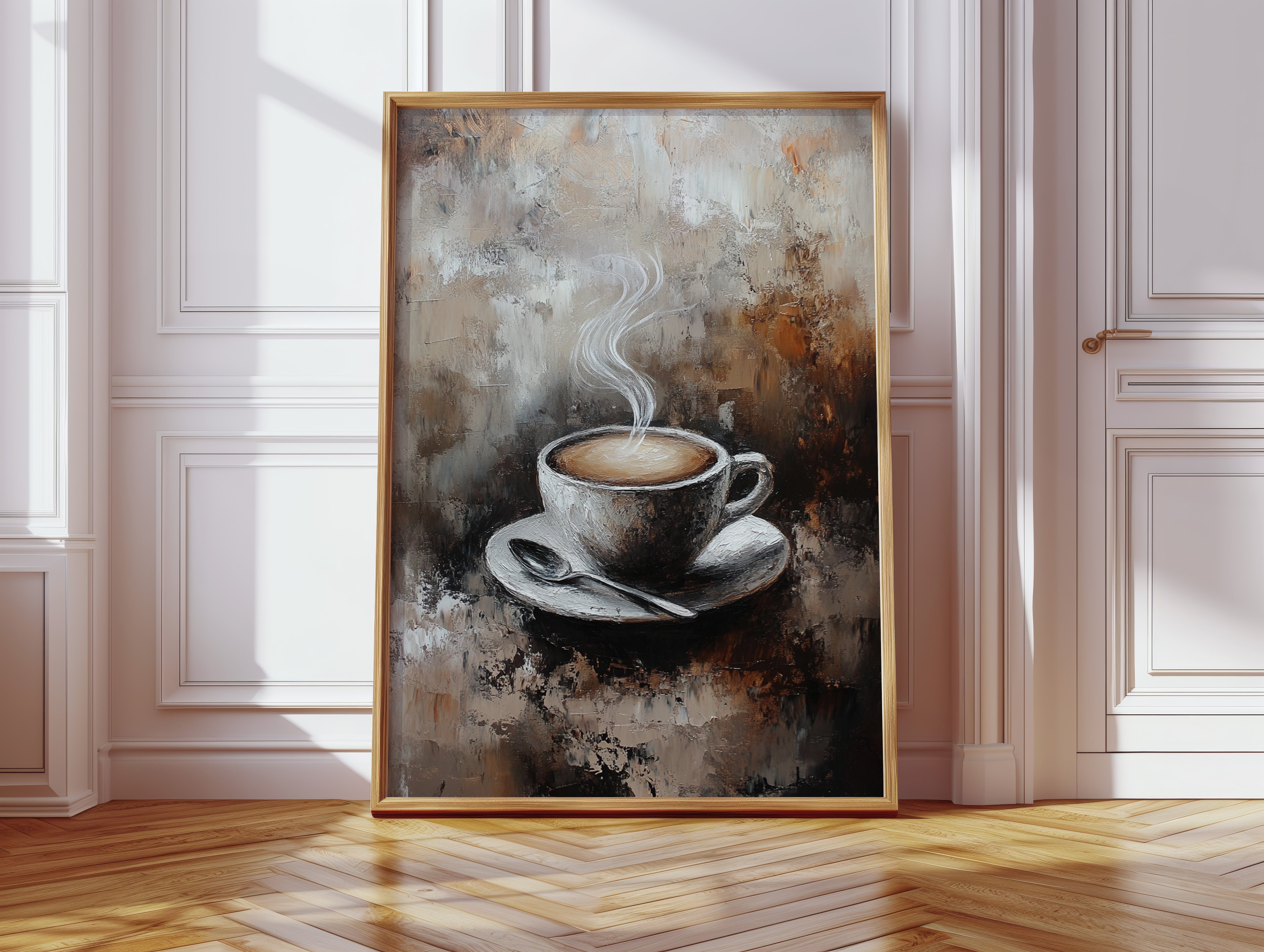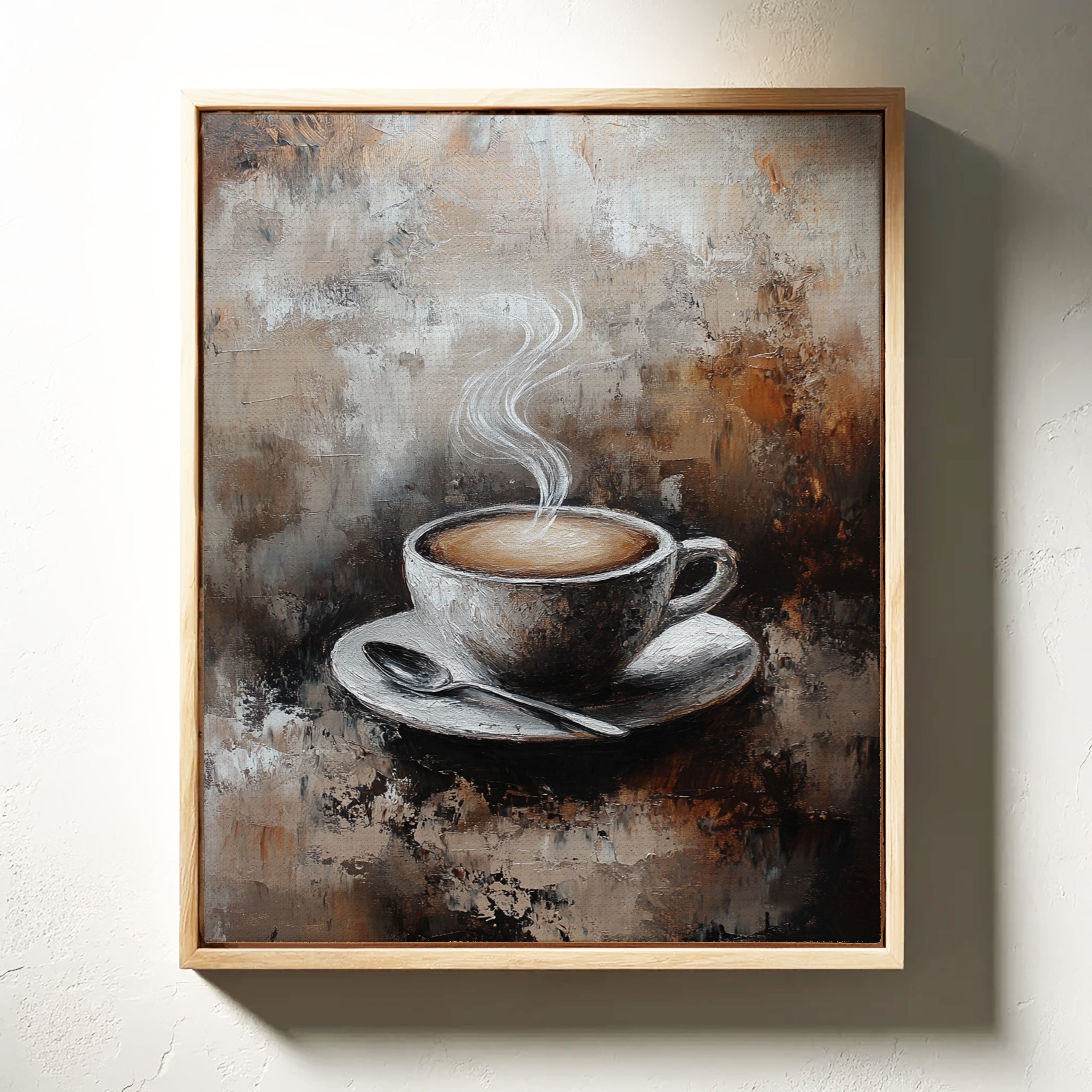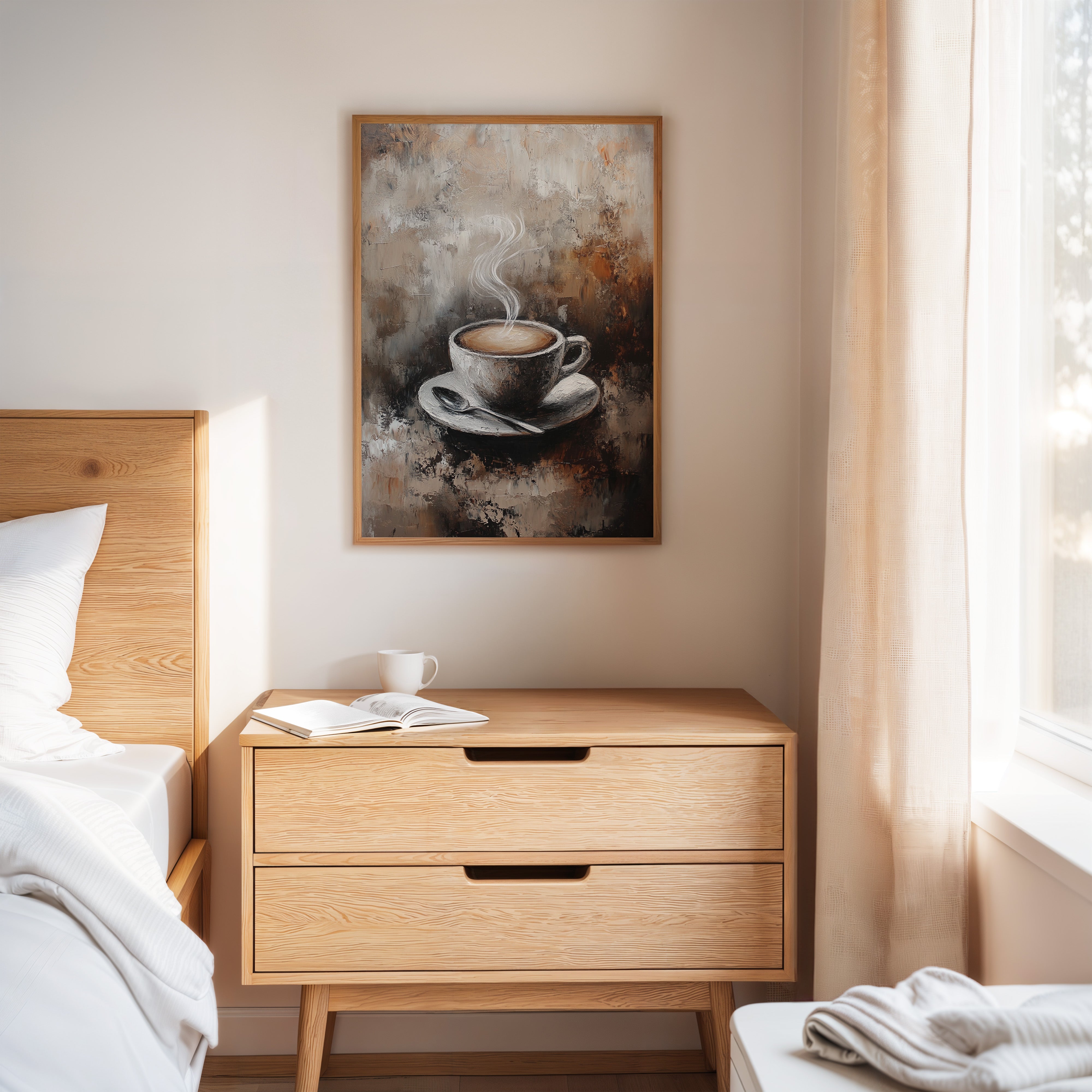 Inspired by the rich textures and earthy tones of a rustic cafe, the artist employs thick brushstrokes and a muted palette to evoke the cozy ambiance of your favorite coffee nook. The steam rising from the cup is a dance of elegance and simplicity, inviting you to savor each moment.