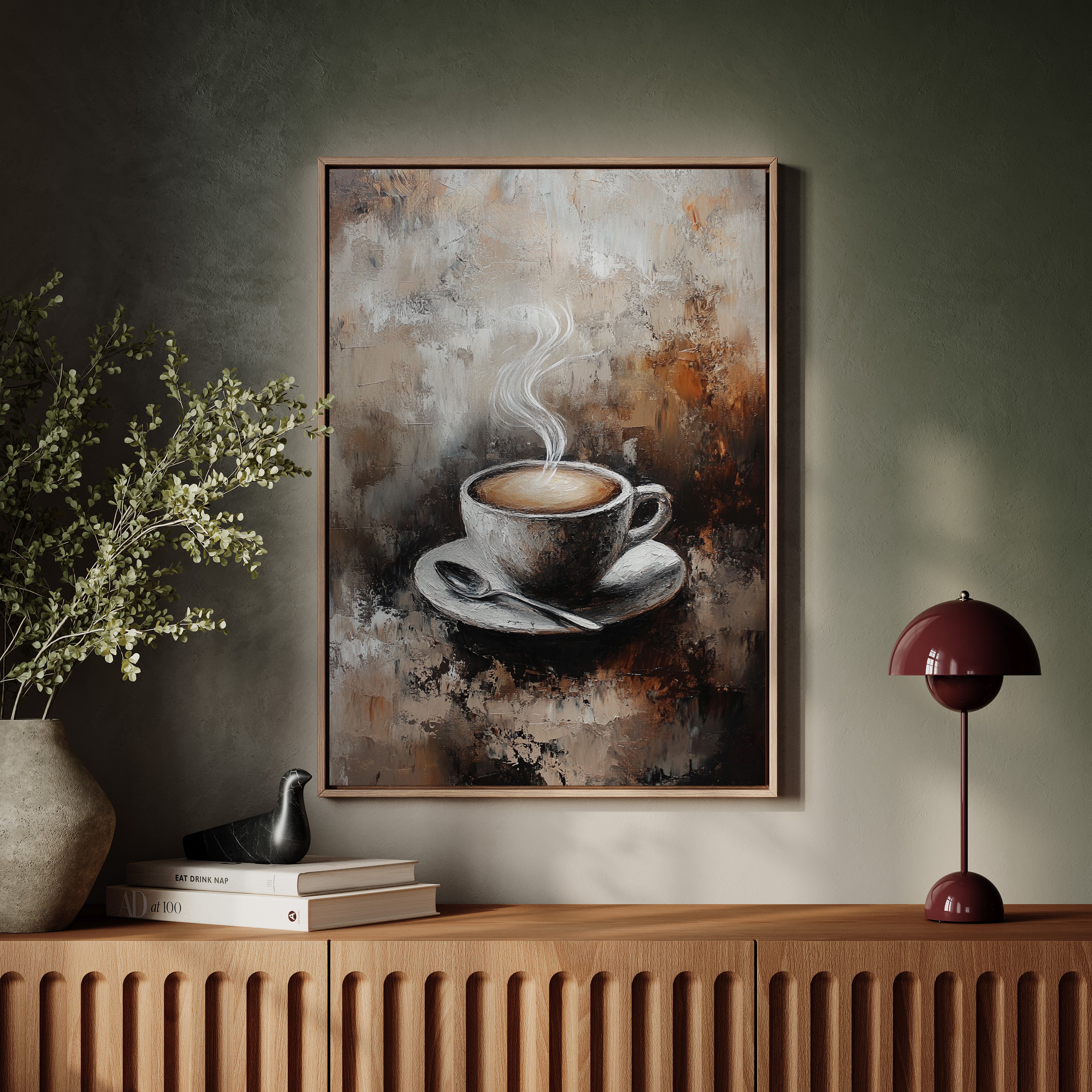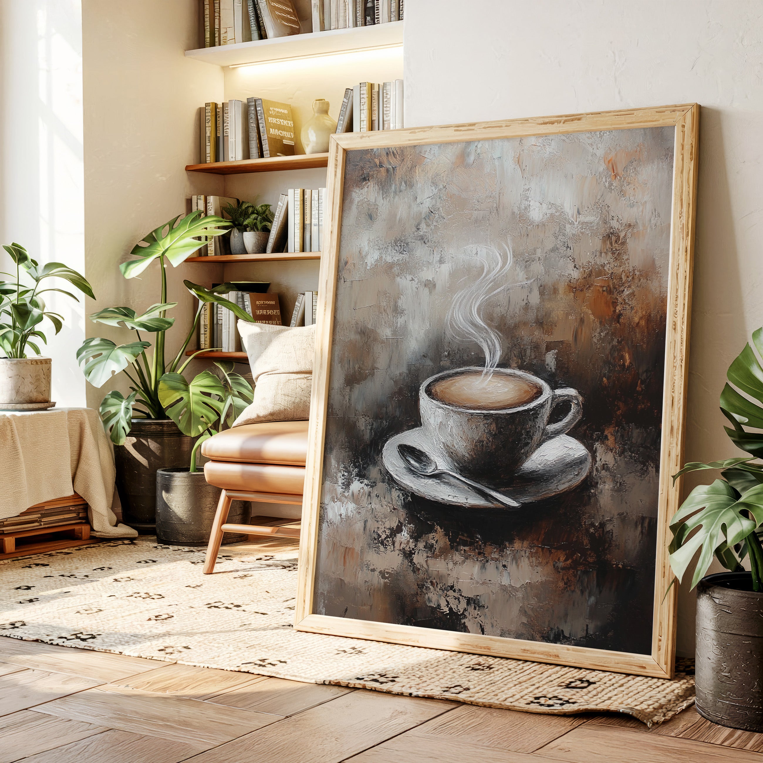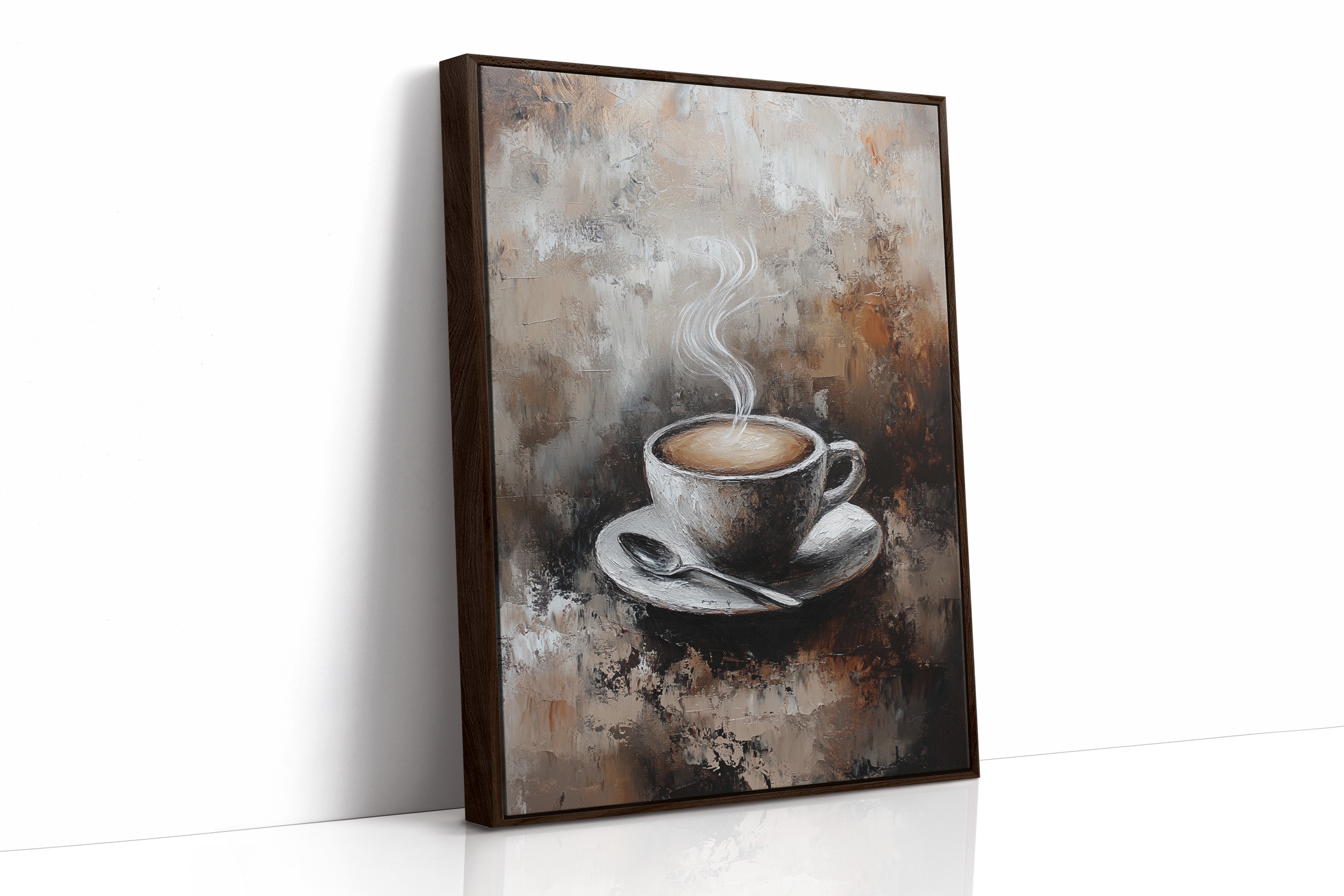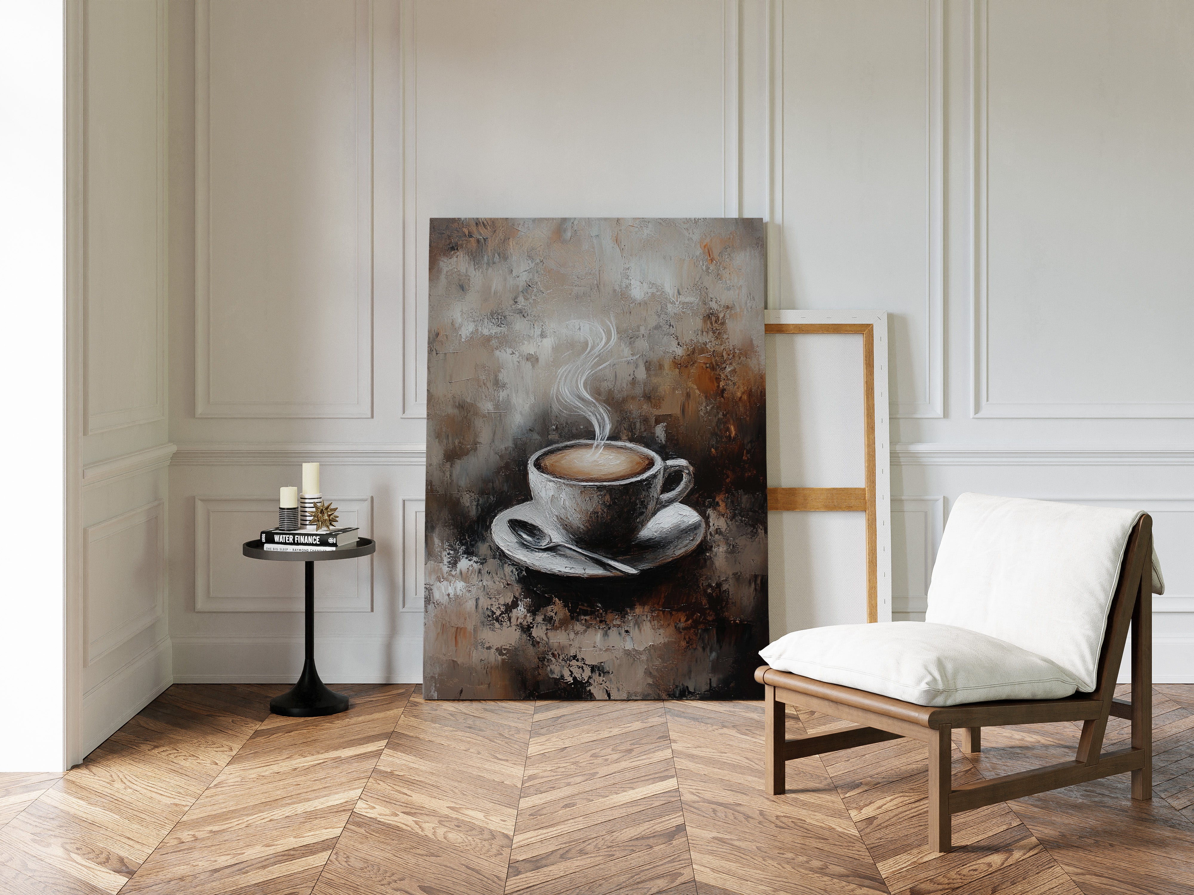Inspired by the rich textures and earthy tones of a rustic cafe, the artist employs thick brushstrokes and a muted palette to evoke the cozy ambiance of your favorite coffee nook. The steam rising from the cup is a dance of elegance and simplicity, inviting you to savor each moment.