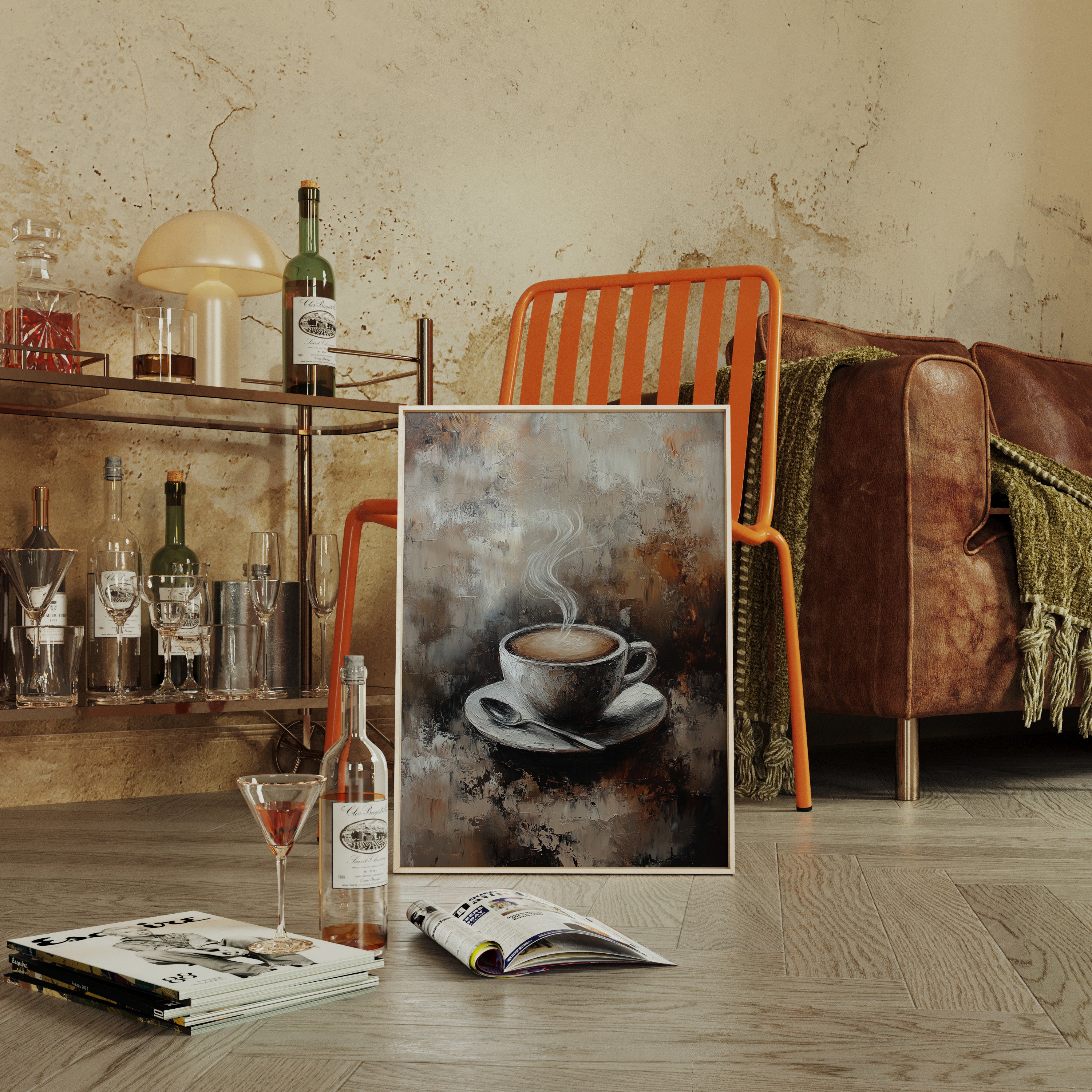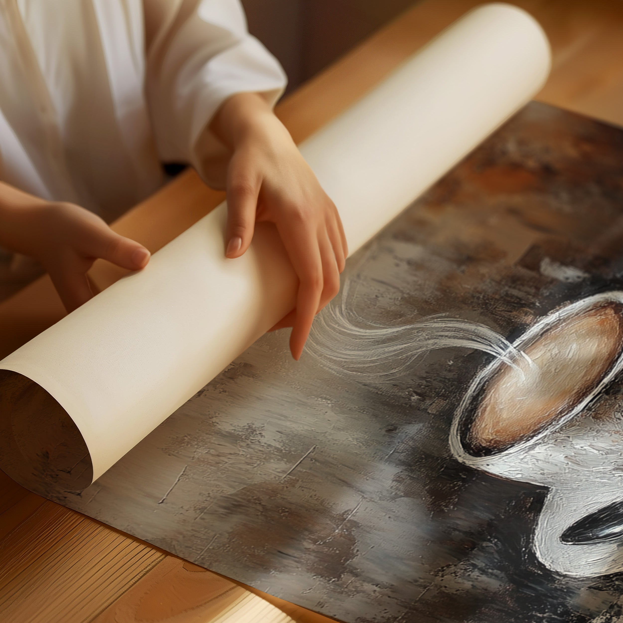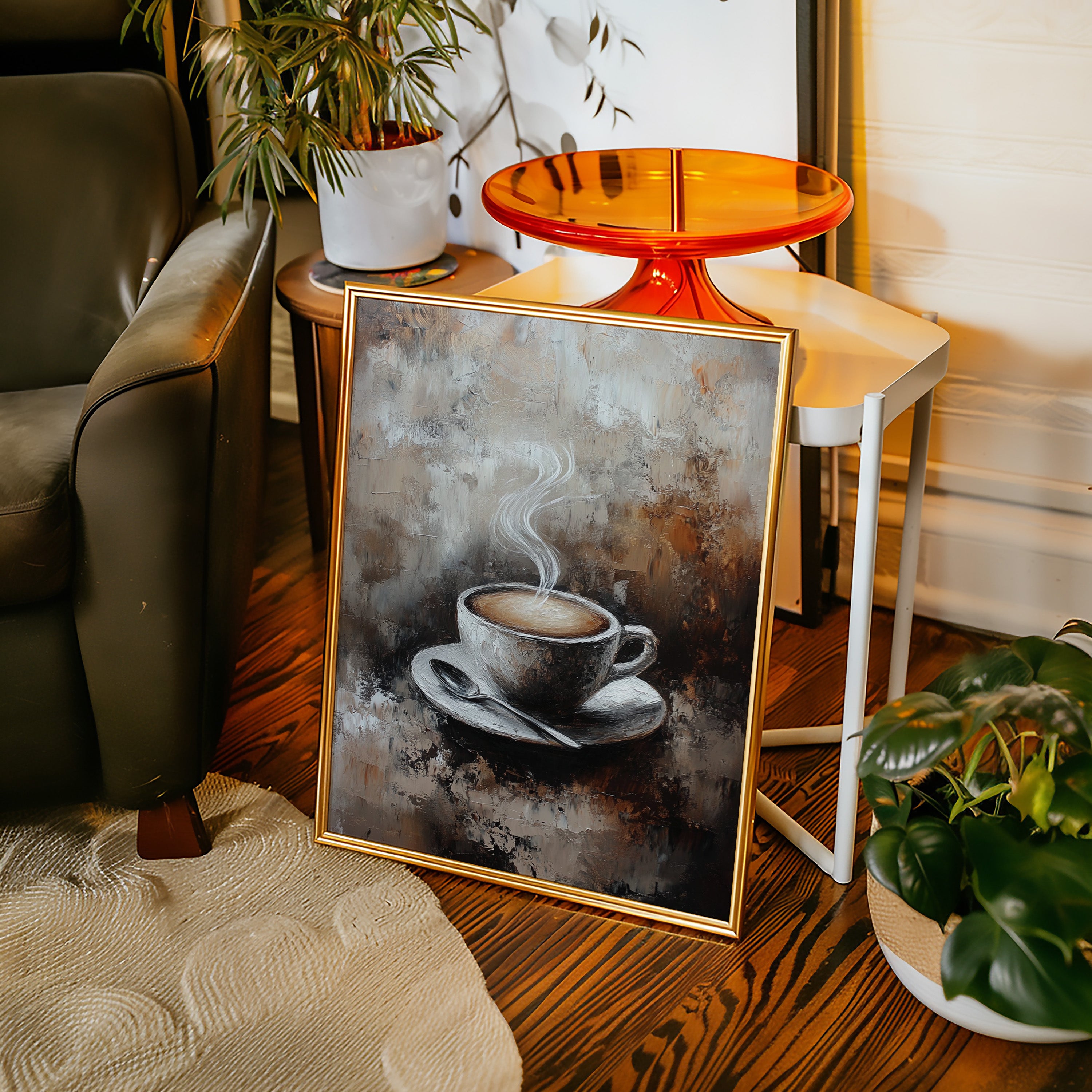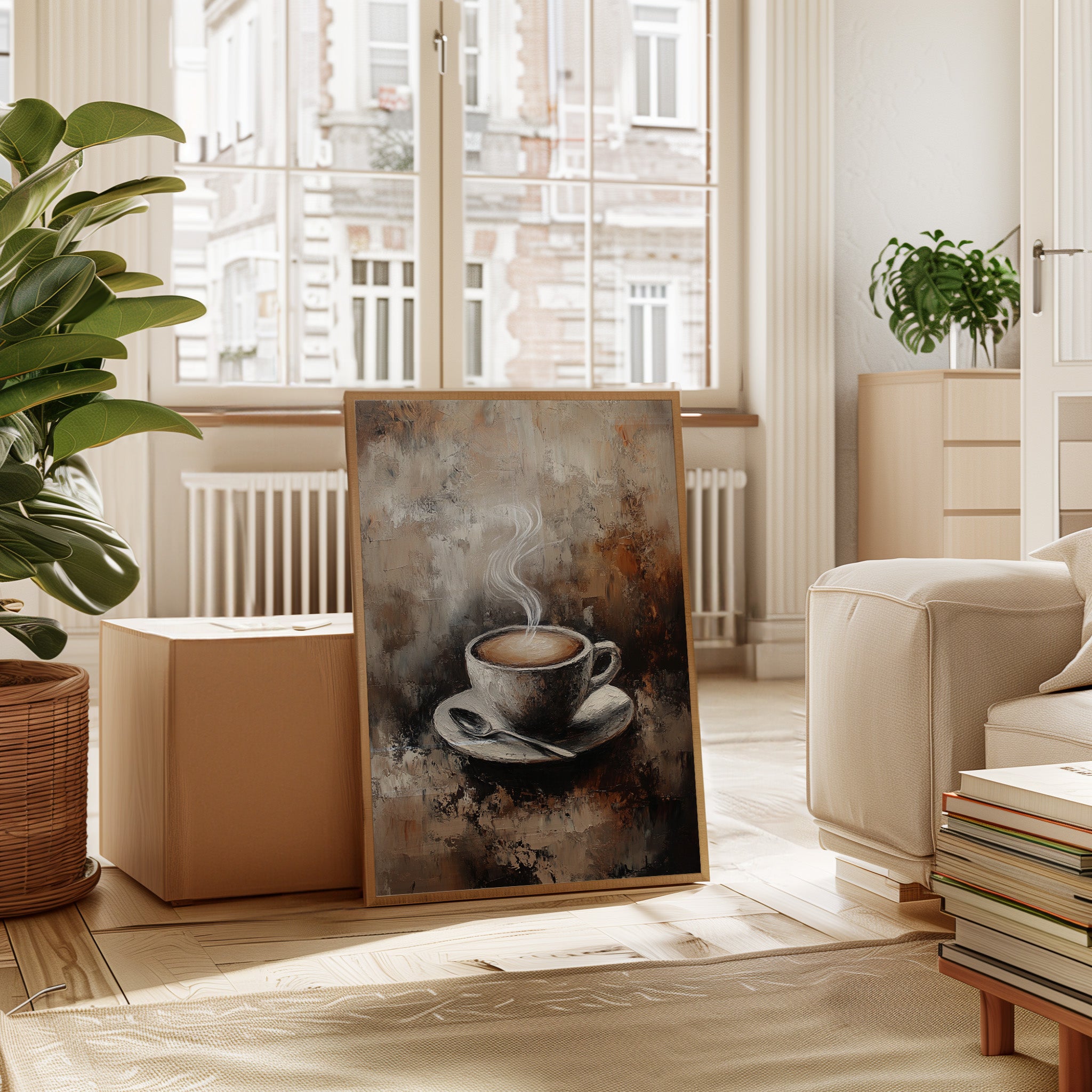 Inspired by the rich textures and earthy tones of a rustic cafe, the artist employs thick brushstrokes and a muted palette to evoke the cozy ambiance of your favorite coffee nook. The steam rising from the cup is a dance of elegance and simplicity, inviting you to savor each moment.