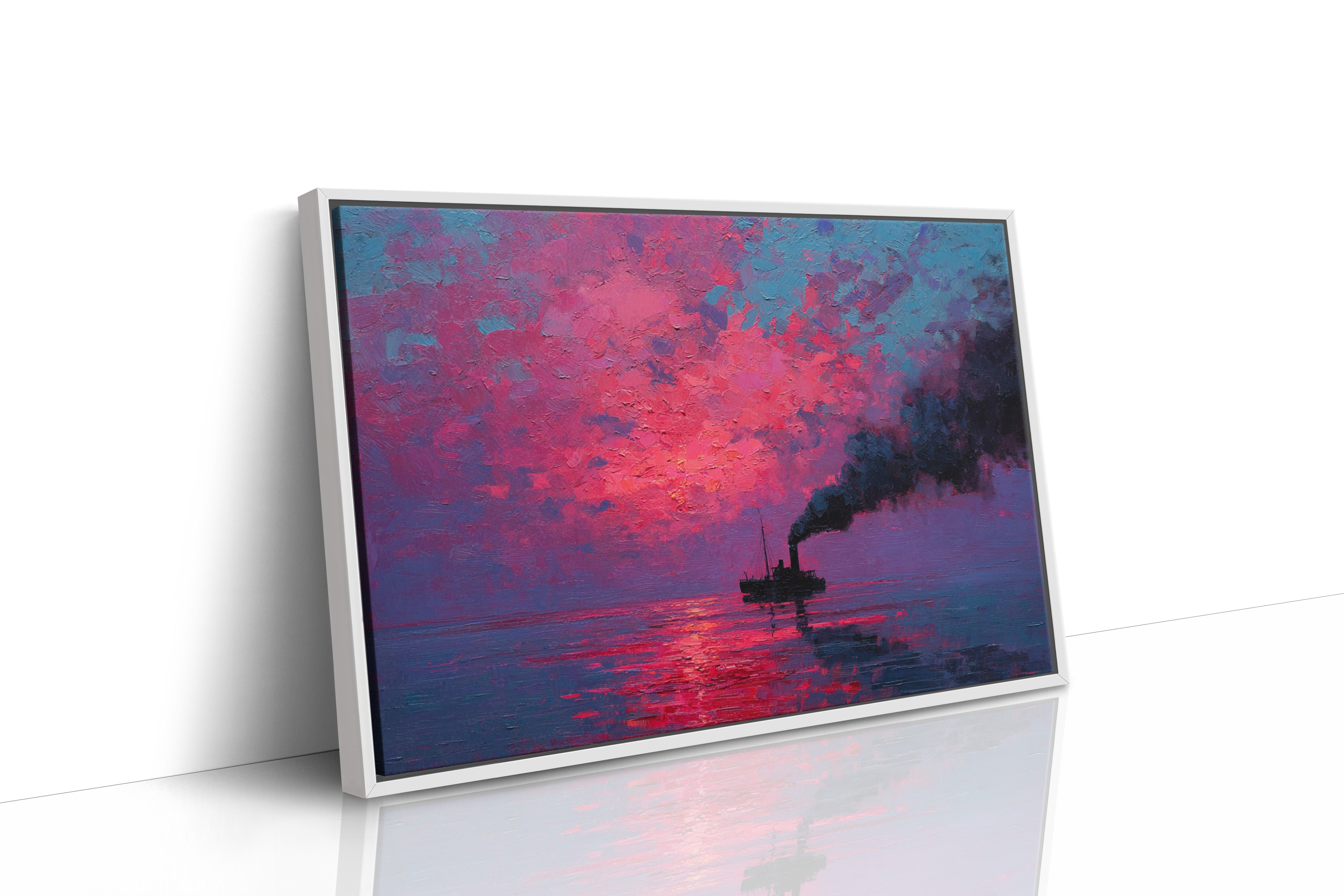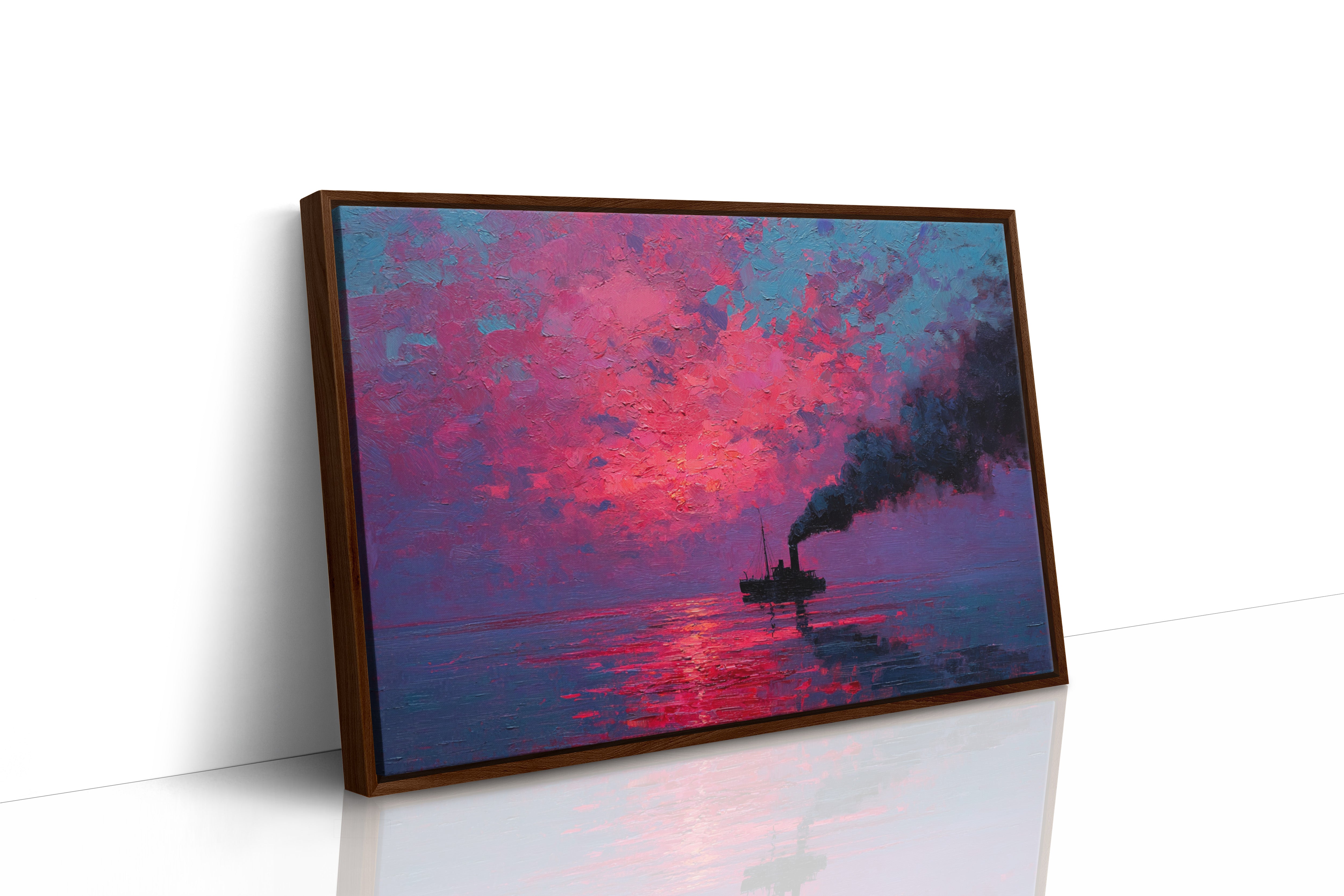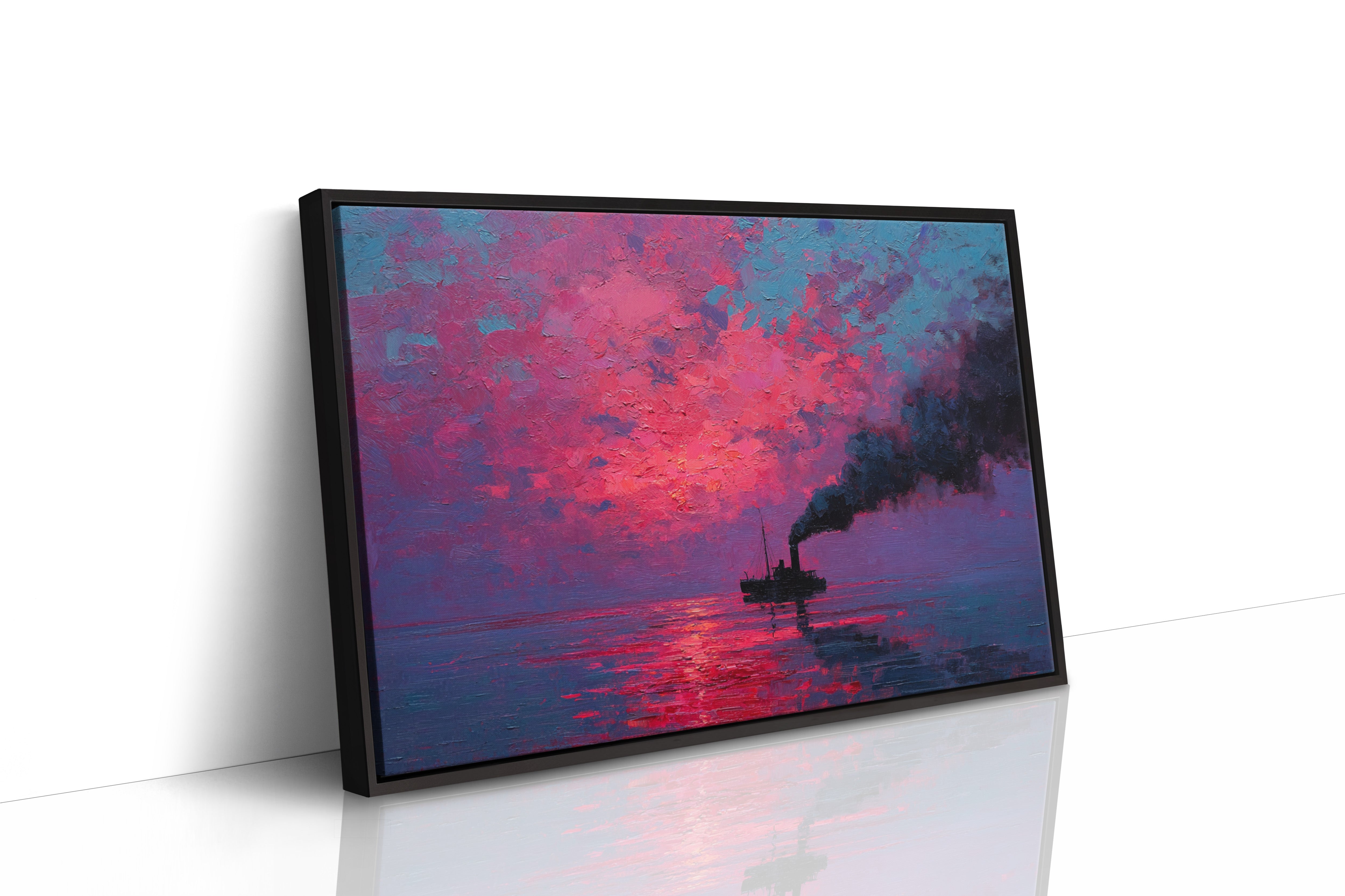 A solitary vessel cuts through still waters, its smokestack painting bold strokes of darkness against a blazing sky. The textured impasto technique creates a tangible depth in the atmospheric scene, where vibrant magentas and deep cerulean blues collide in a dramatic display. The reflection of the intense crimson sunrise fragments across the water's surface, creating a mesmerizing dance of light and shadow that mirrors the ship's steady journey. This piece would command attention as a striking focal point in a modern living room or add bold character to a maritime-themed study.