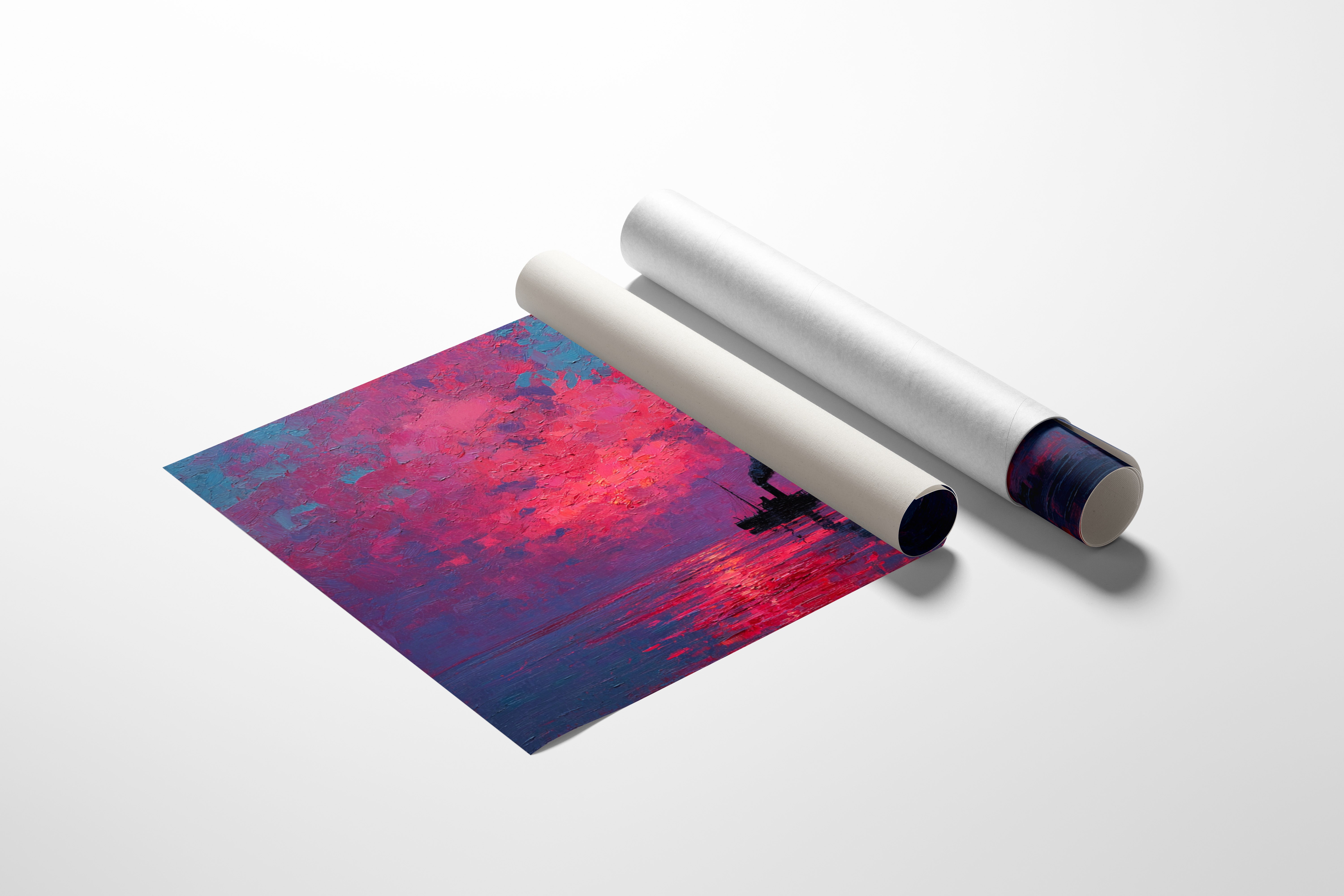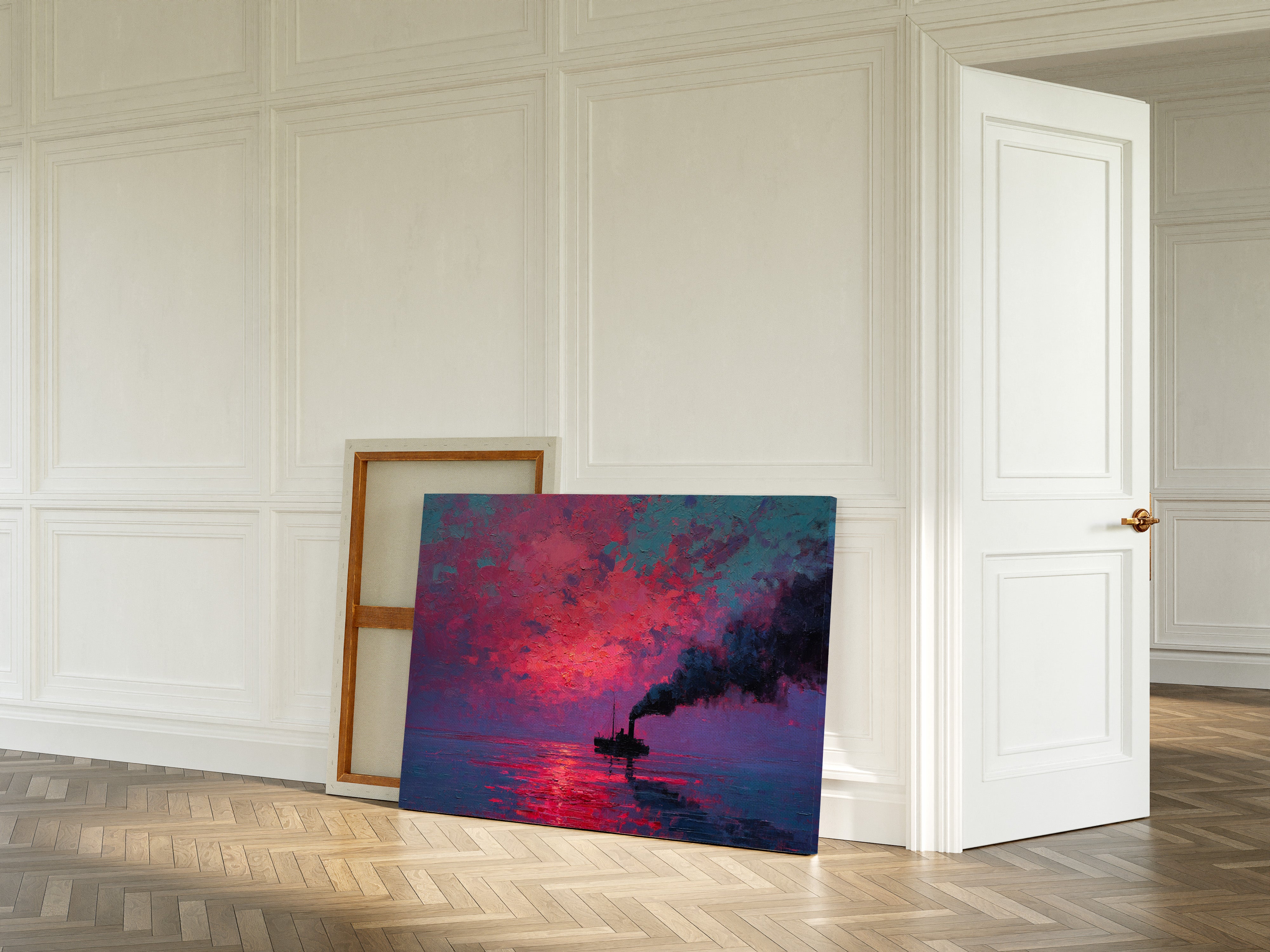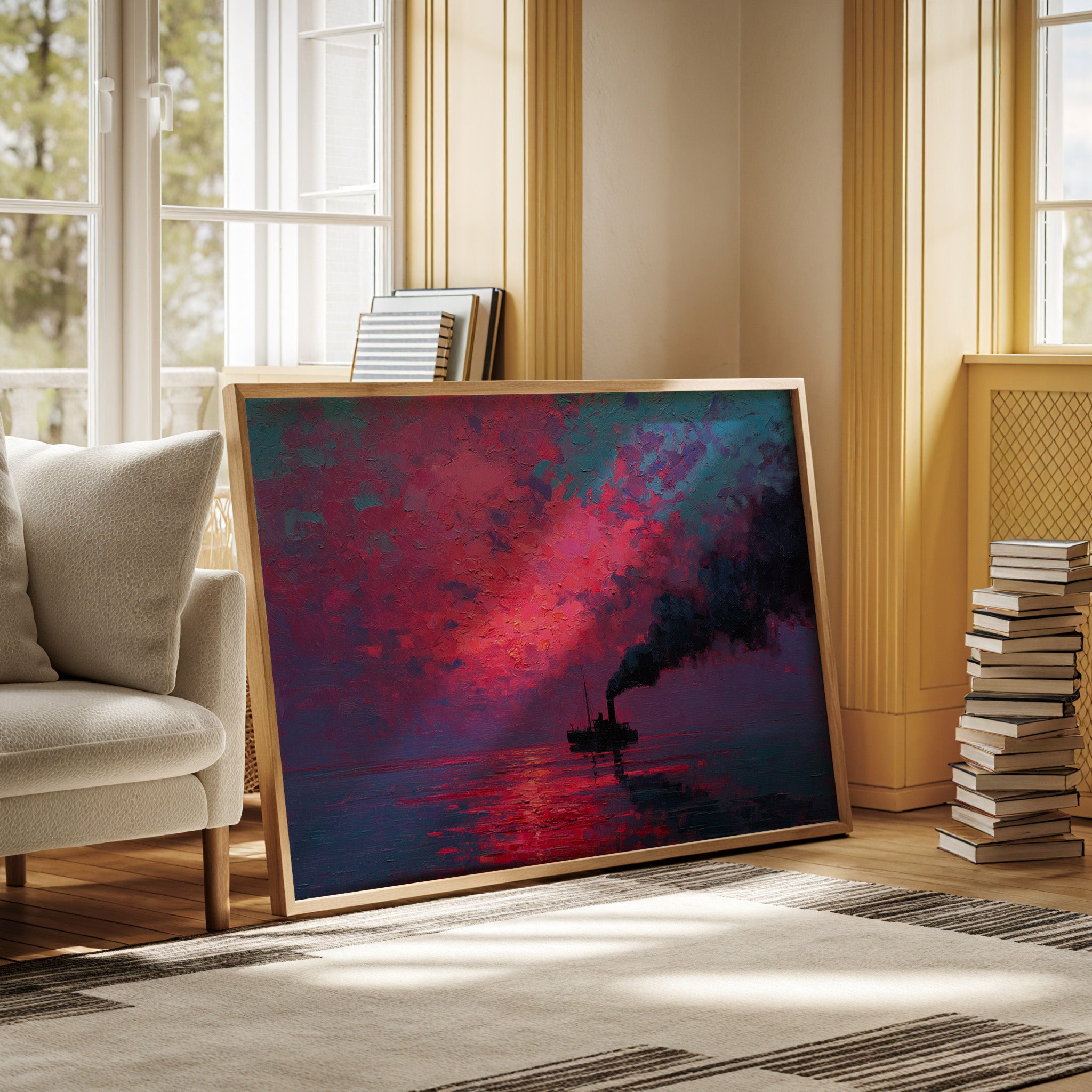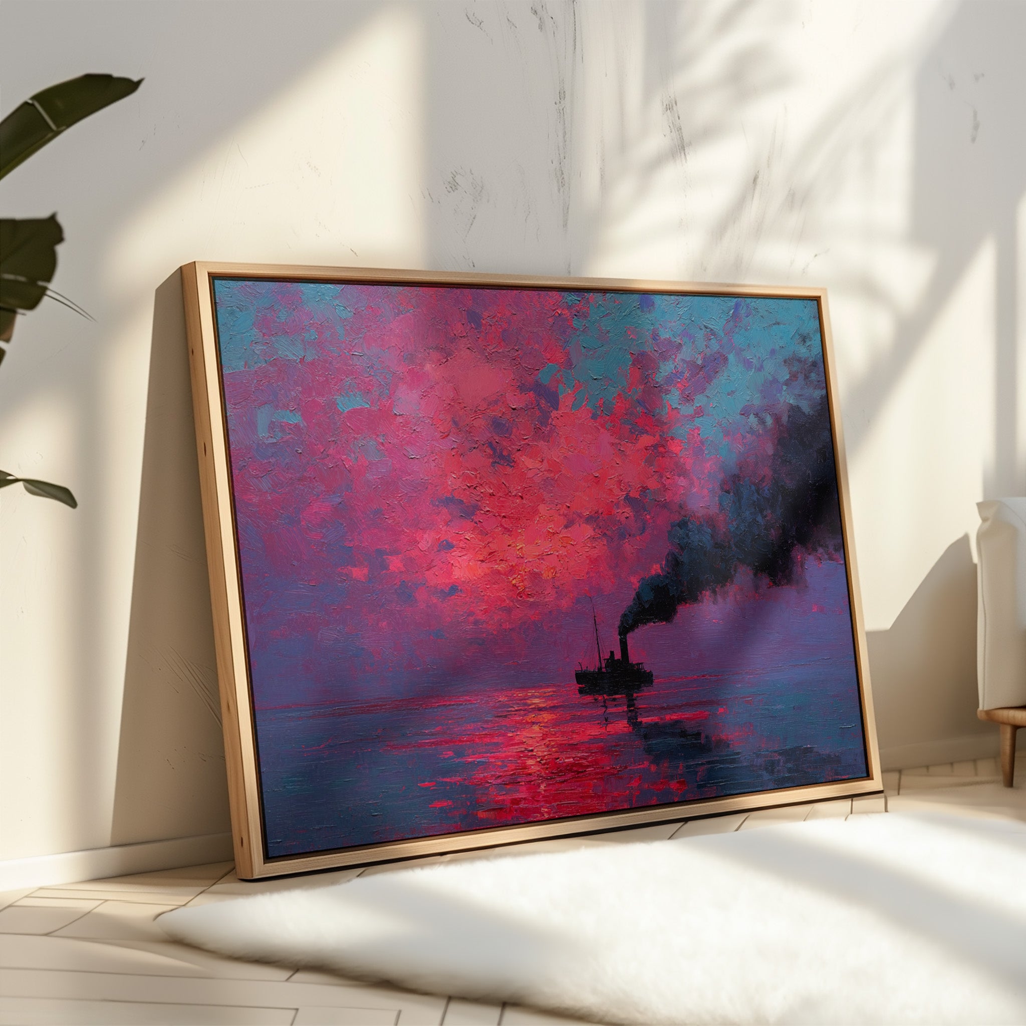 A solitary vessel cuts through still waters, its smokestack painting bold strokes of darkness against a blazing sky. The textured impasto technique creates a tangible depth in the atmospheric scene, where vibrant magentas and deep cerulean blues collide in a dramatic display. The reflection of the intense crimson sunrise fragments across the water's surface, creating a mesmerizing dance of light and shadow that mirrors the ship's steady journey. This piece would command attention as a striking focal point in a modern living room or add bold character to a maritime-themed study.