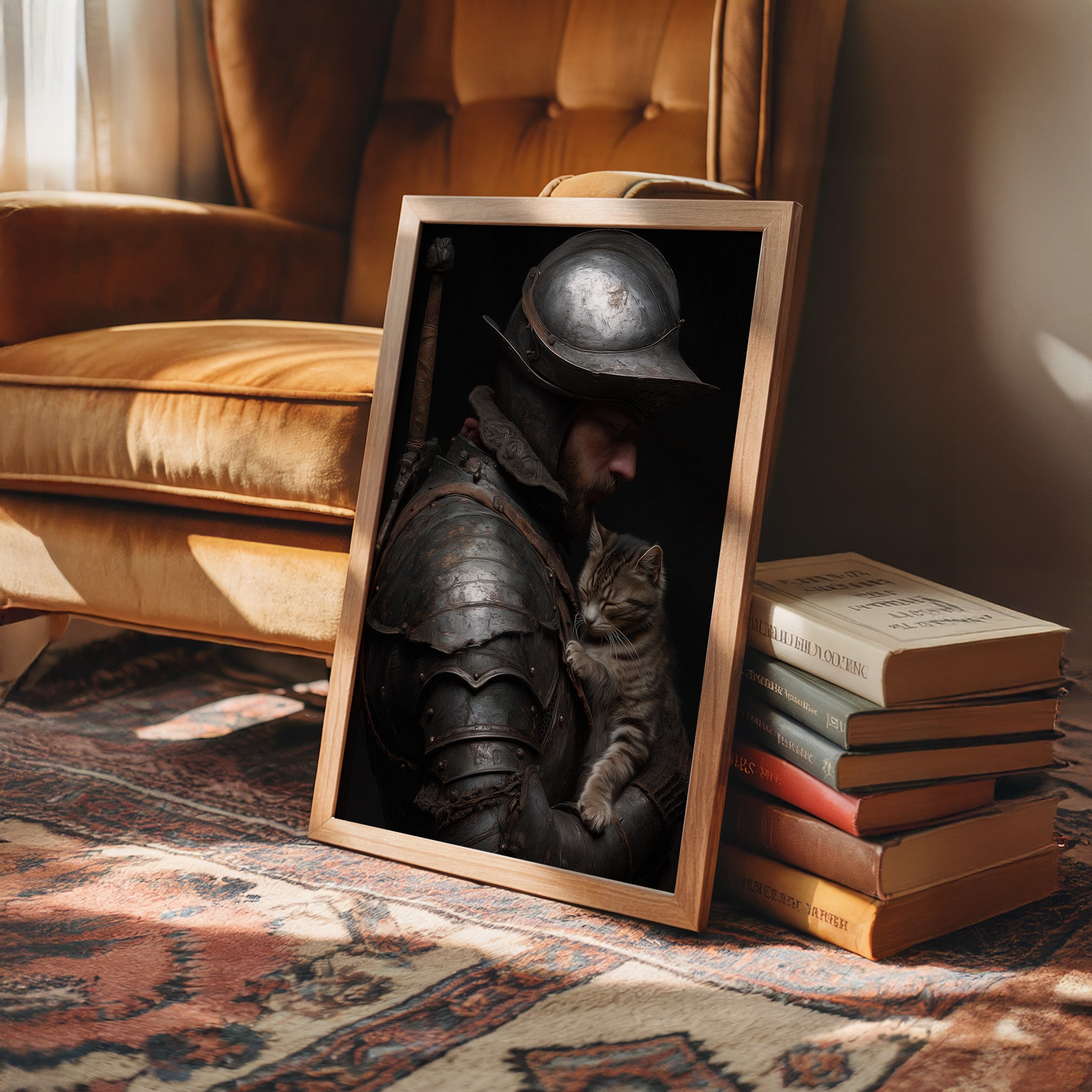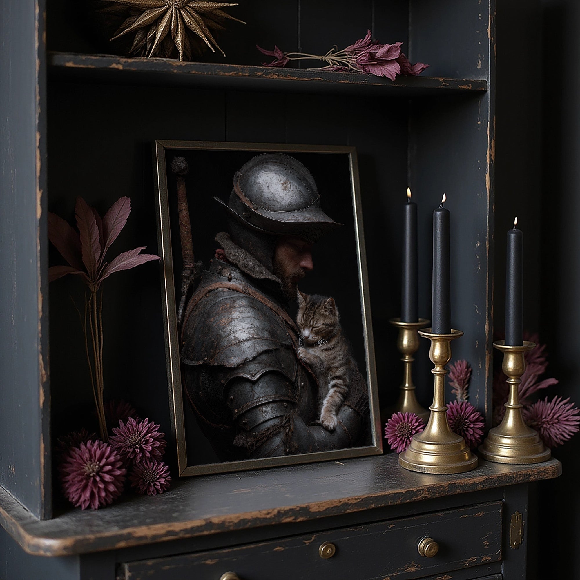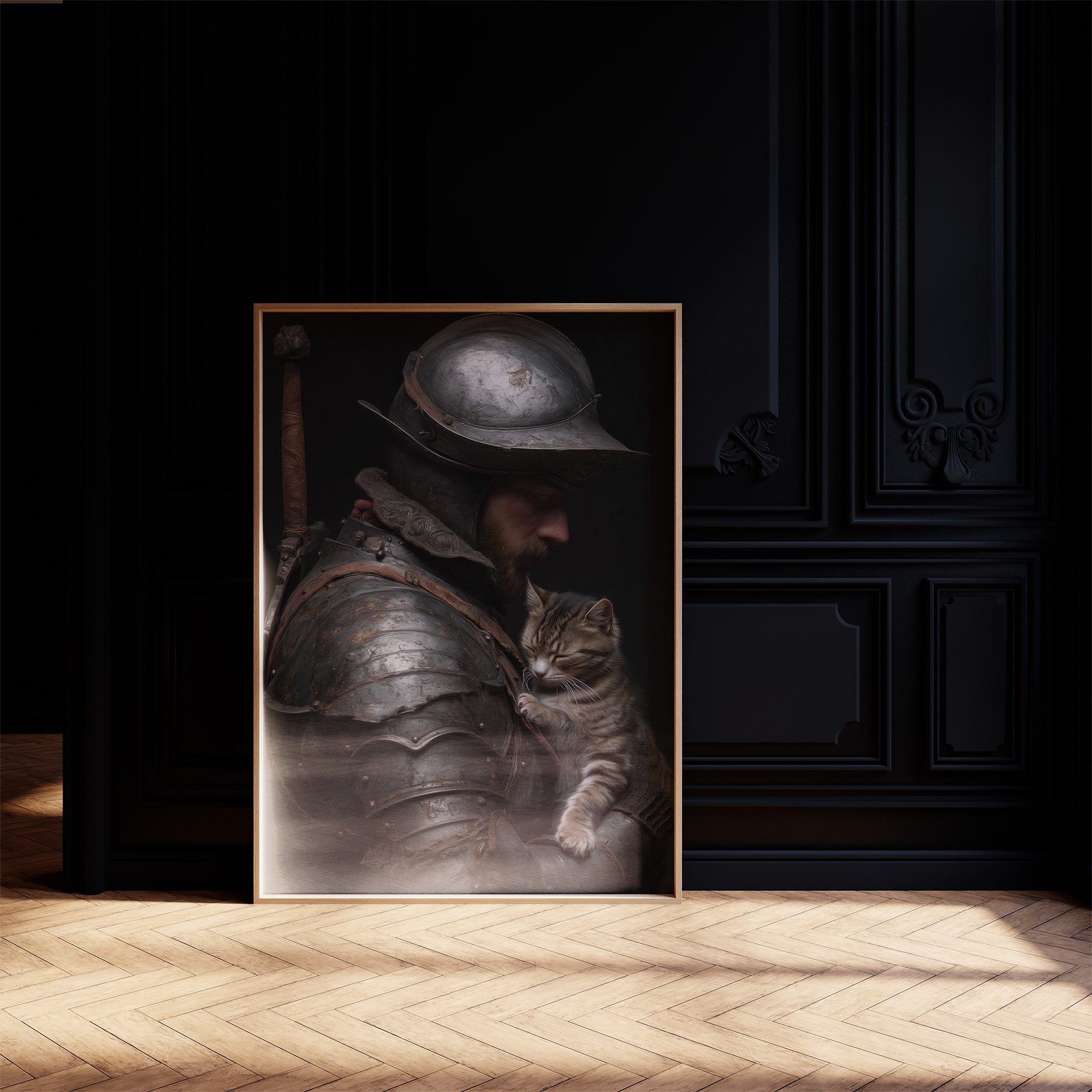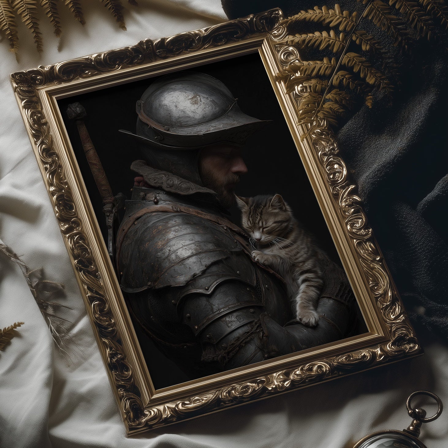 In the hush between battles, tenderness emerges unexpectedly. A weathered warrior in burnished armor cradles a tabby cat against his chest, the contrast of cold metal and warm fur creating a powerful narrative of gentleness amid strength. Dark tones dominate the composition, allowing small moments of light to catch on the helmet's curve and the cat's content expression, speaking to the universal need for connection even in the harshest circumstances. This striking portrait would command attention in a modern living space with dark walls, creating a contemplative focal point that bridges historical gravitas with emotional resonance.