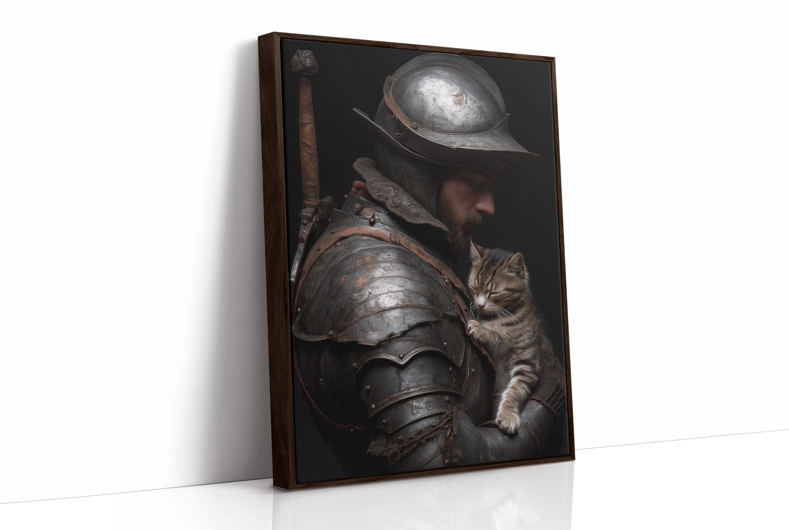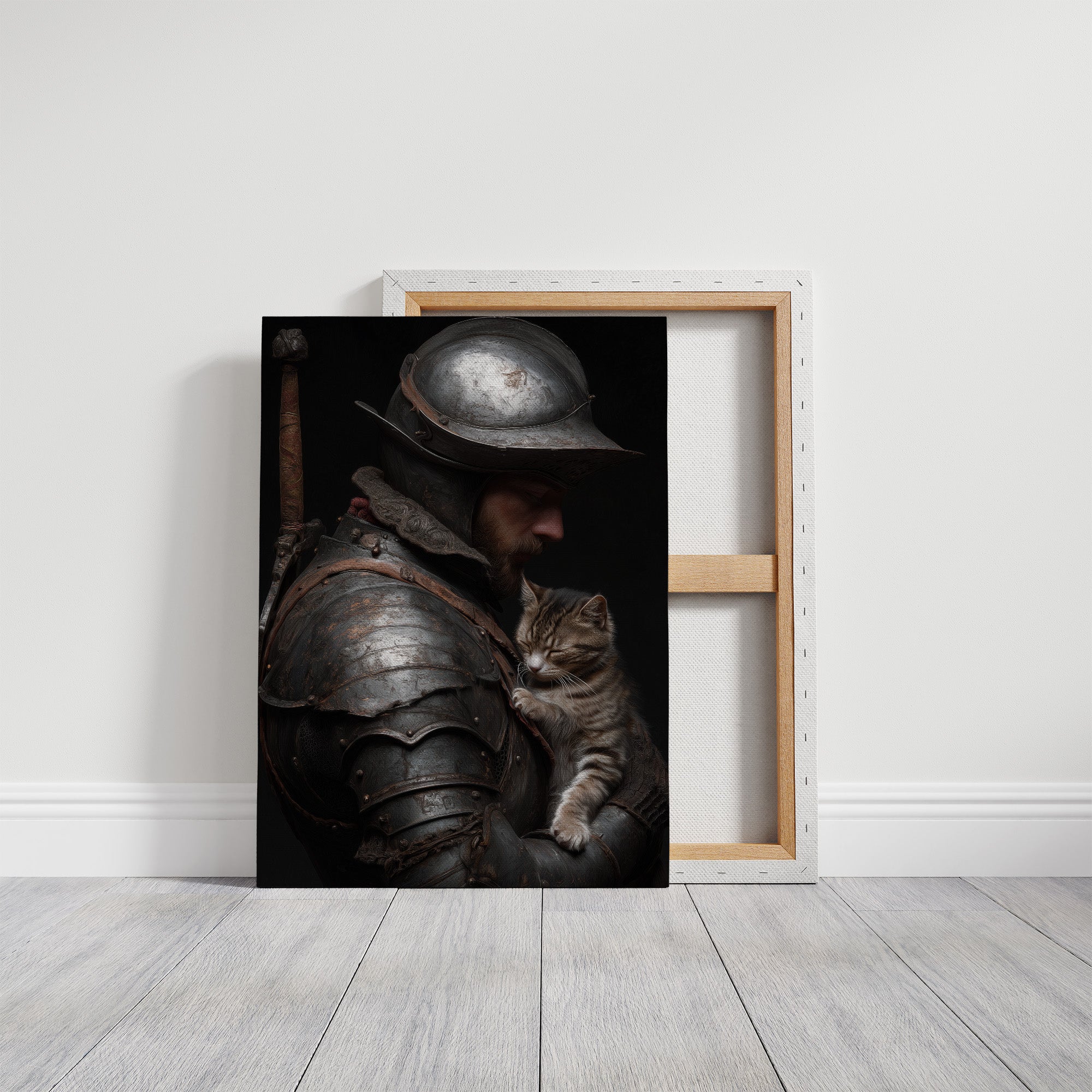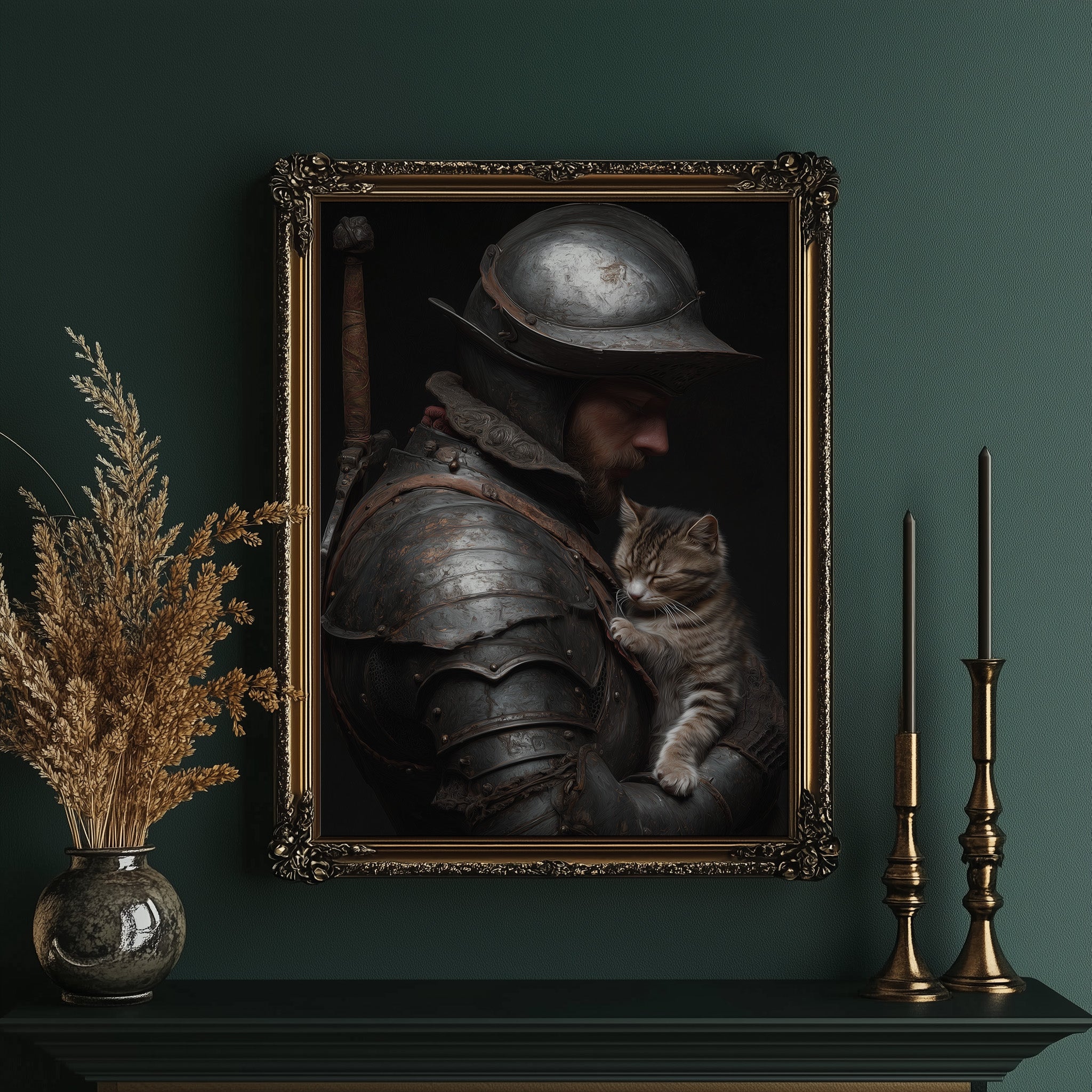 In the hush between battles, tenderness emerges unexpectedly. A weathered warrior in burnished armor cradles a tabby cat against his chest, the contrast of cold metal and warm fur creating a powerful narrative of gentleness amid strength. Dark tones dominate the composition, allowing small moments of light to catch on the helmet's curve and the cat's content expression, speaking to the universal need for connection even in the harshest circumstances. This striking portrait would command attention in a modern living space with dark walls, creating a contemplative focal point that bridges historical gravitas with emotional resonance.