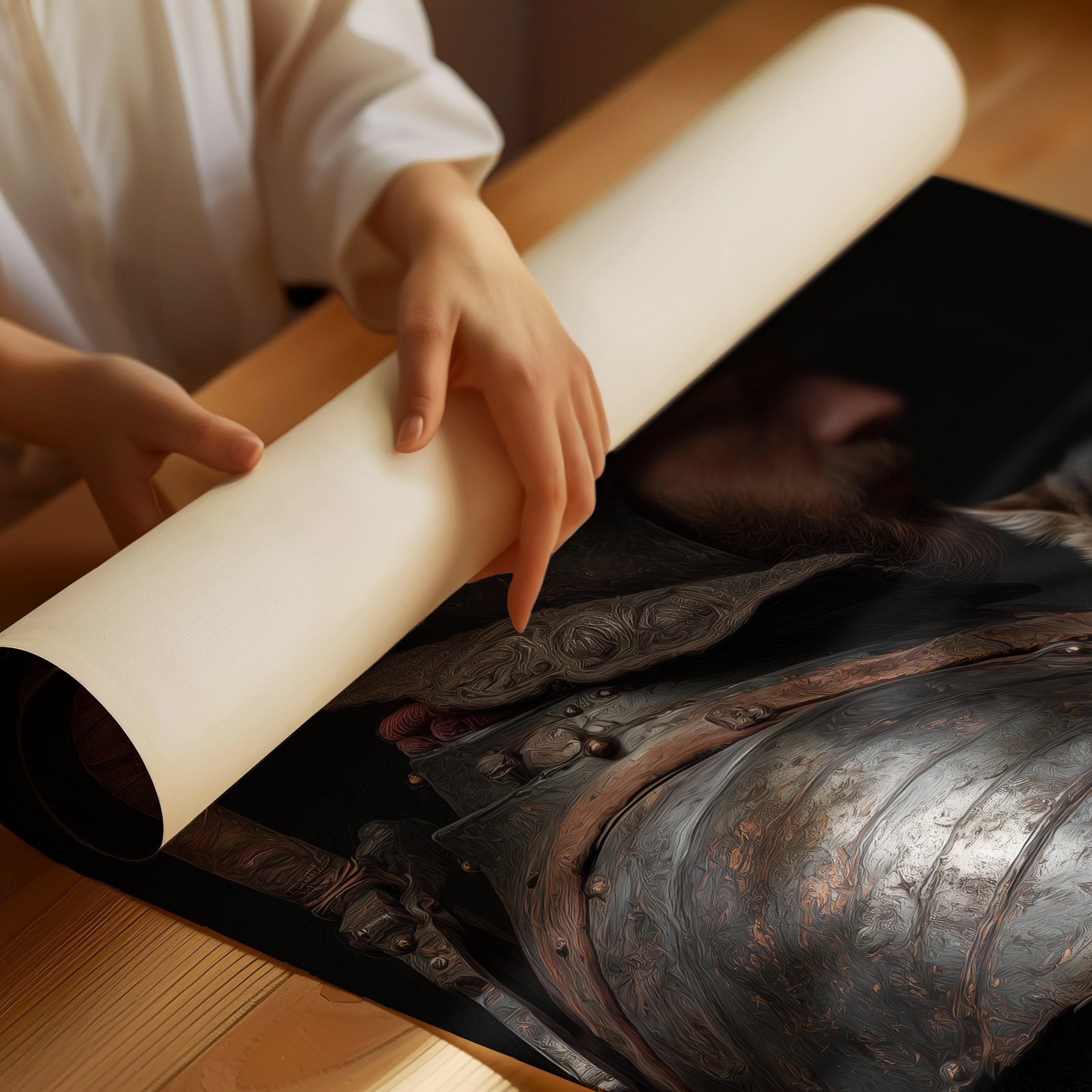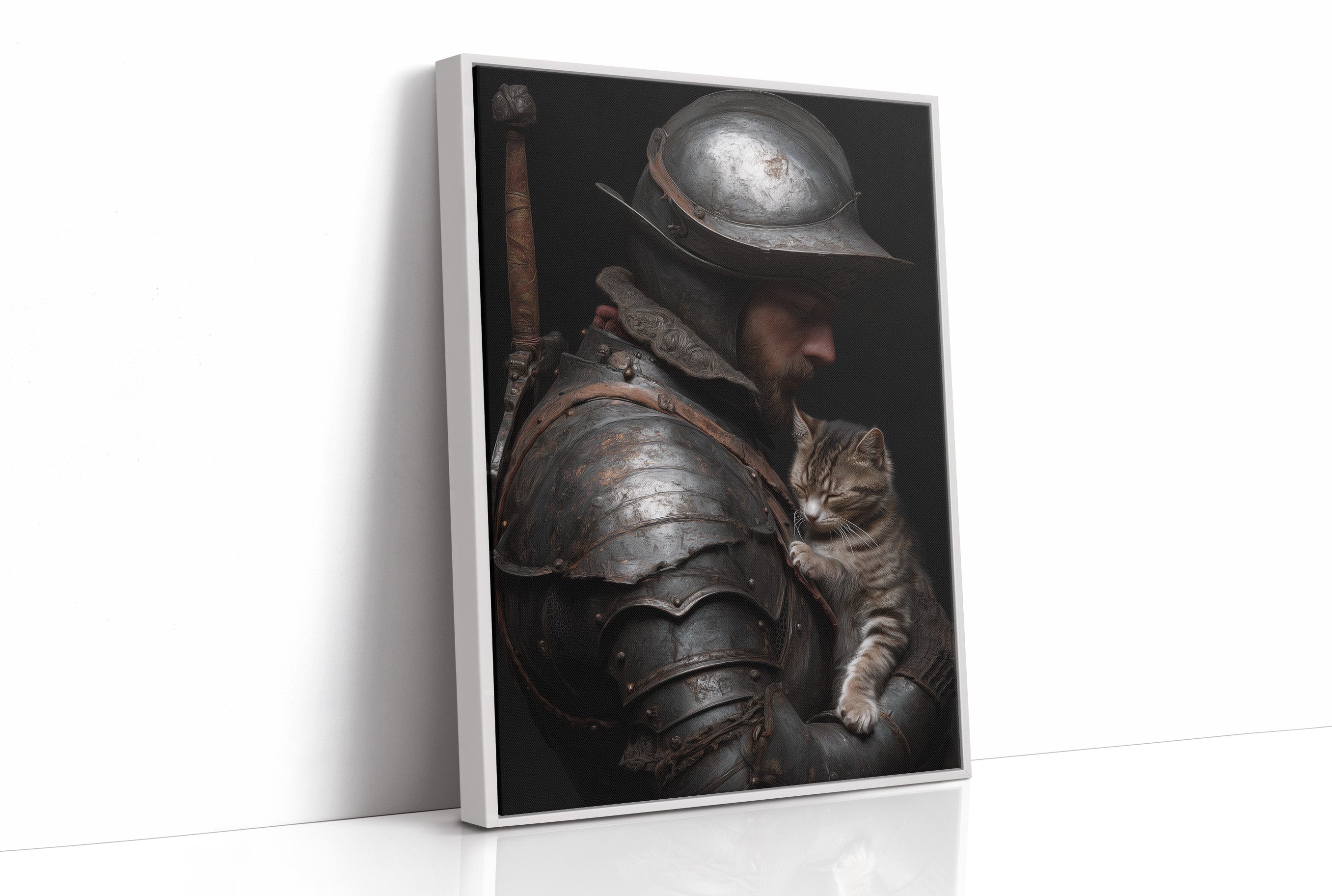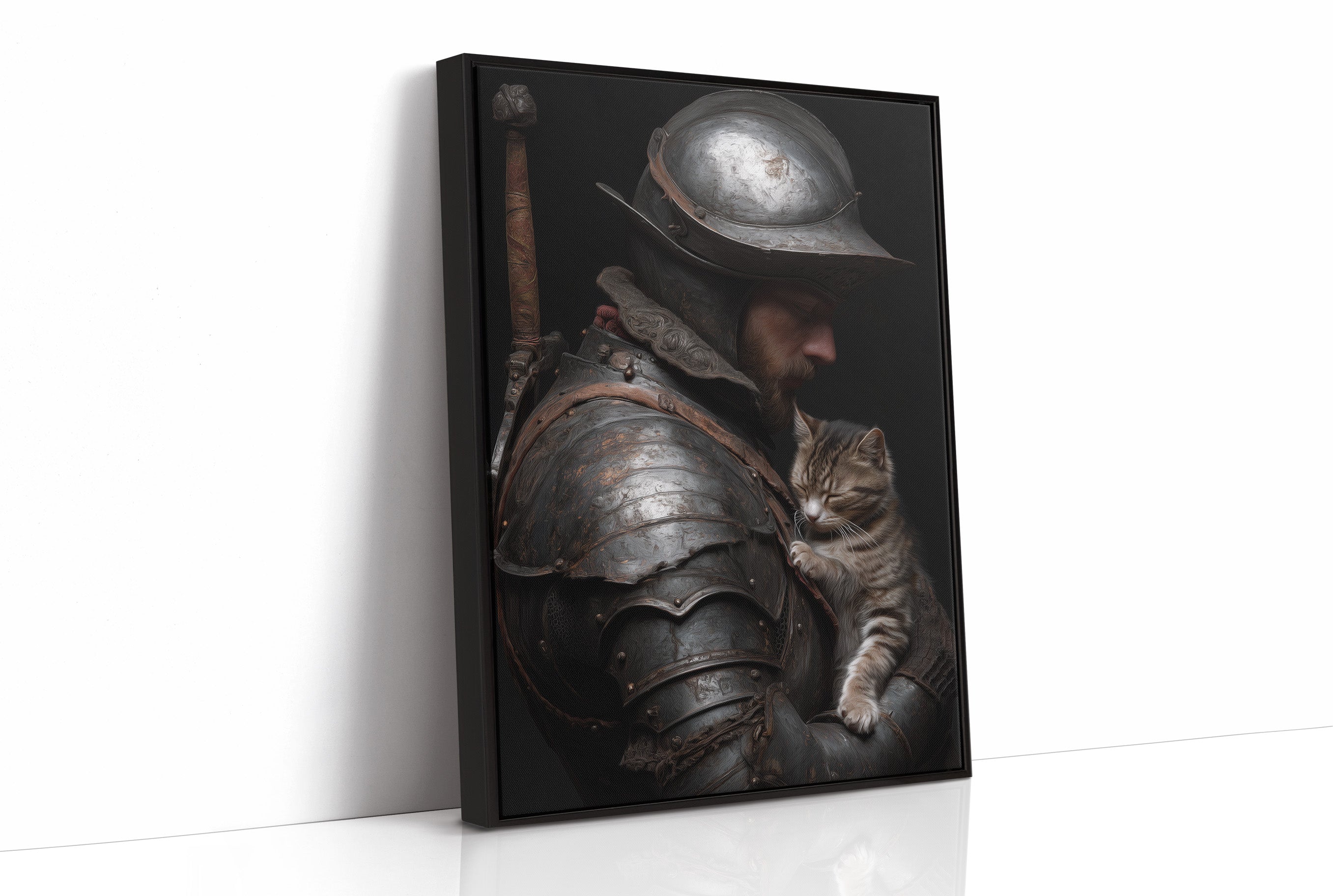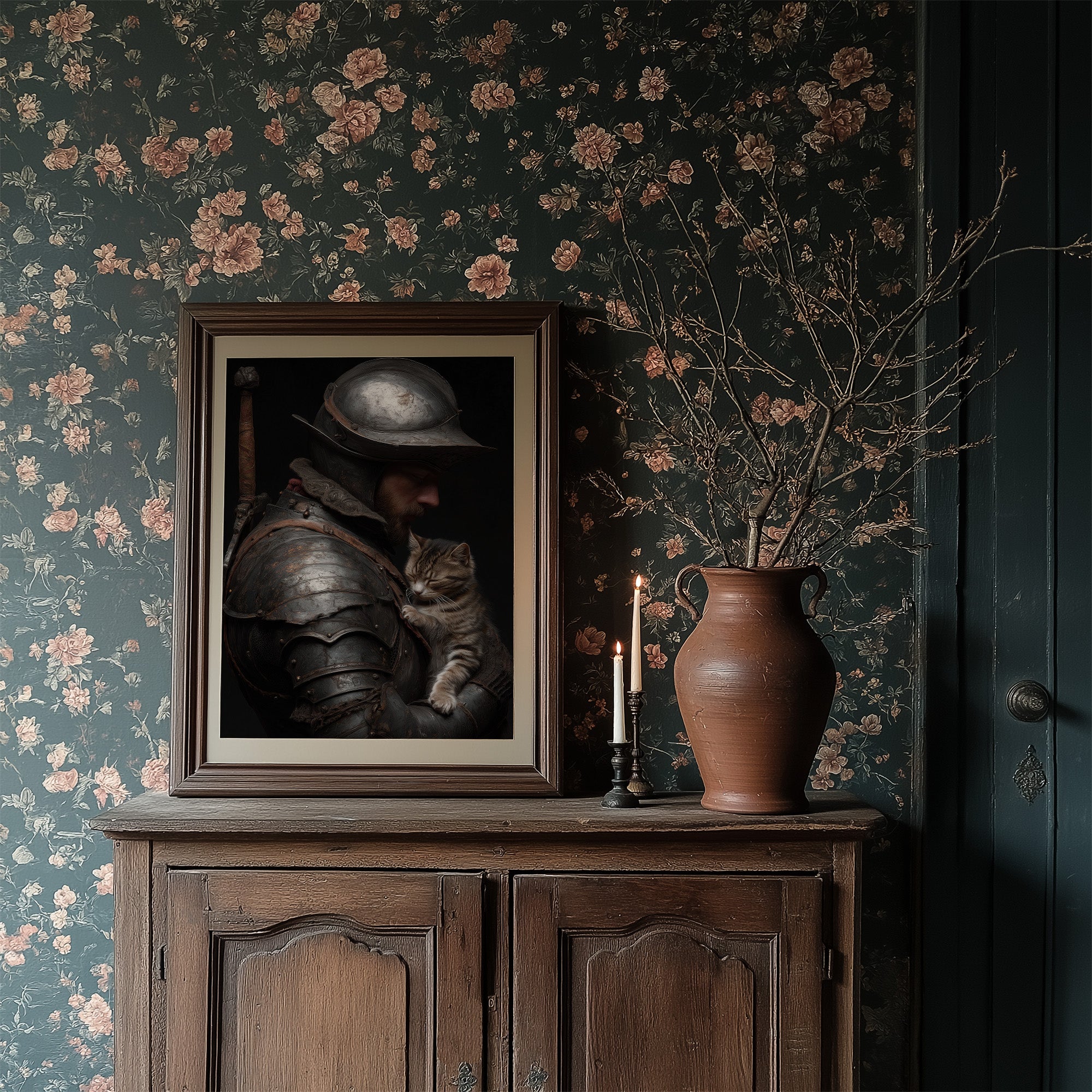 In the hush between battles, tenderness emerges unexpectedly. A weathered warrior in burnished armor cradles a tabby cat against his chest, the contrast of cold metal and warm fur creating a powerful narrative of gentleness amid strength. Dark tones dominate the composition, allowing small moments of light to catch on the helmet's curve and the cat's content expression, speaking to the universal need for connection even in the harshest circumstances. This striking portrait would command attention in a modern living space with dark walls, creating a contemplative focal point that bridges historical gravitas with emotional resonance.