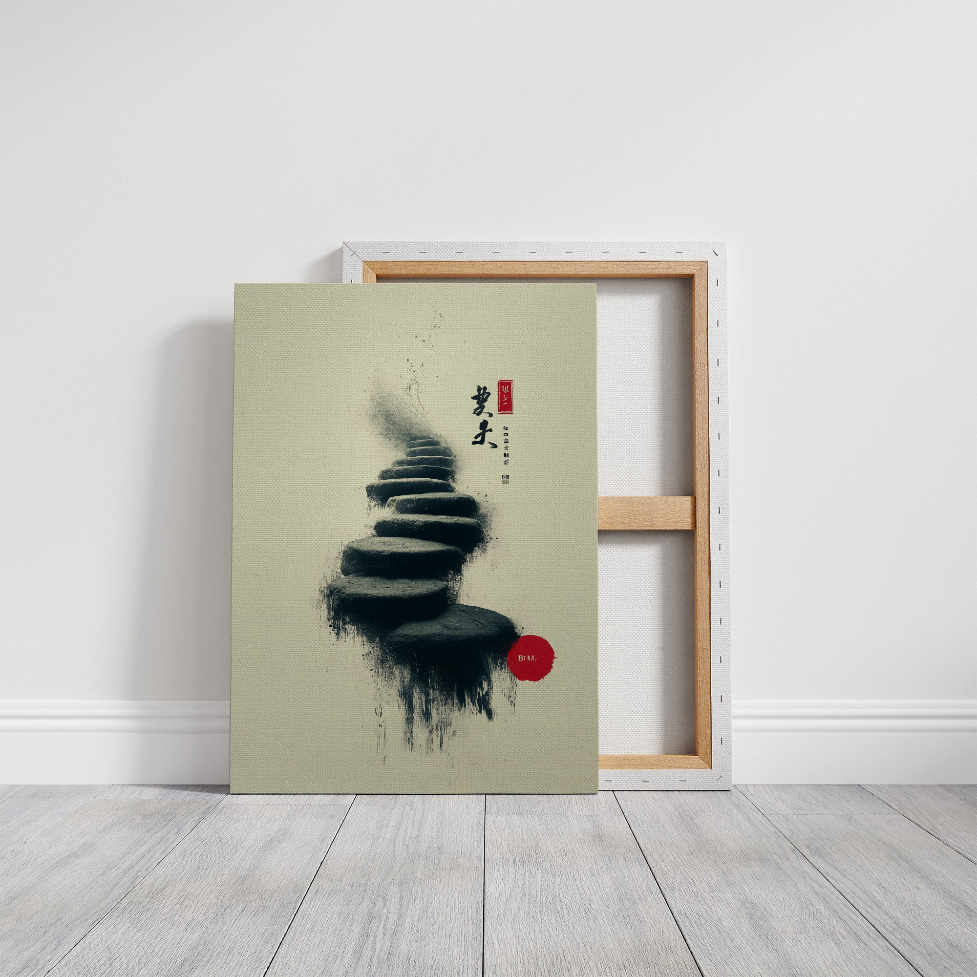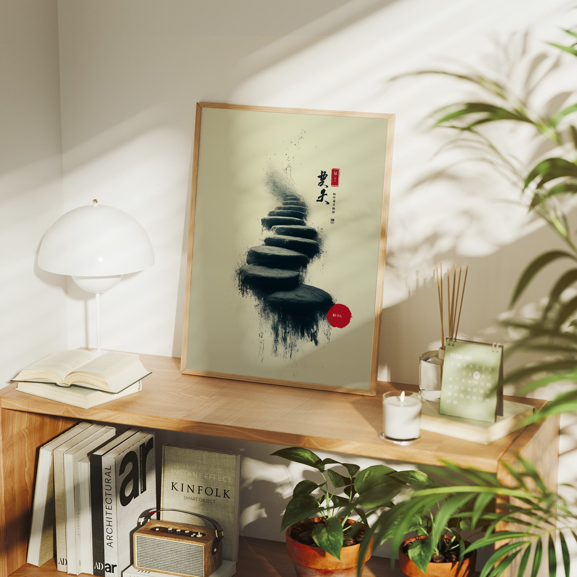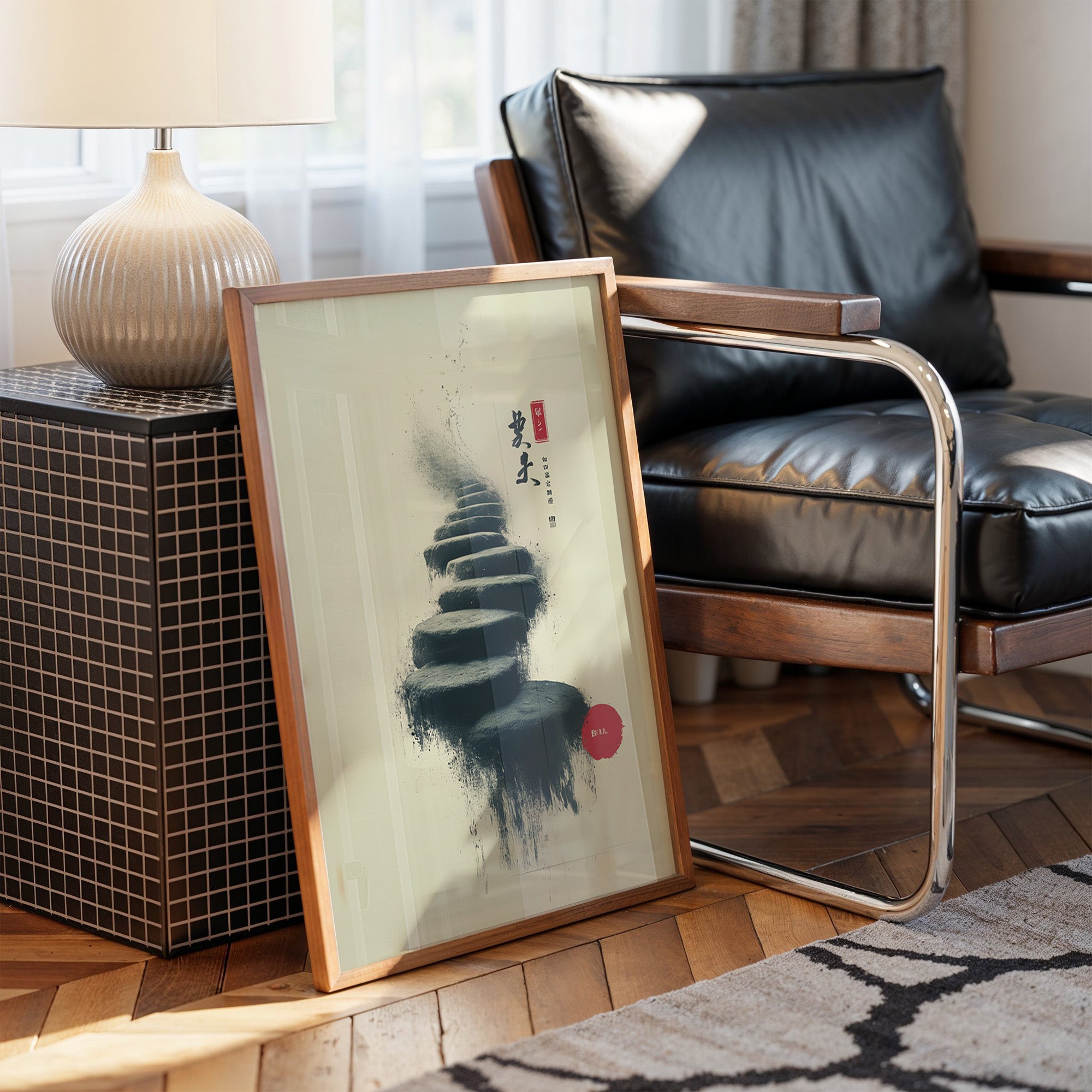 Ink-brushed stones float mysteriously upward through misty sage green, each step a meditation in balance and possibility. The minimalist Asian aesthetic creates a powerful journey through negative space, where traditional calligraphy meets contemporary design. This piece captures the essence of tranquility with its subtle gradients and bold brush strokes anchored by a striking red seal. This thoughtful piece would bring serenity to a reading nook, meditation space, or any room dedicated to peaceful contemplation.